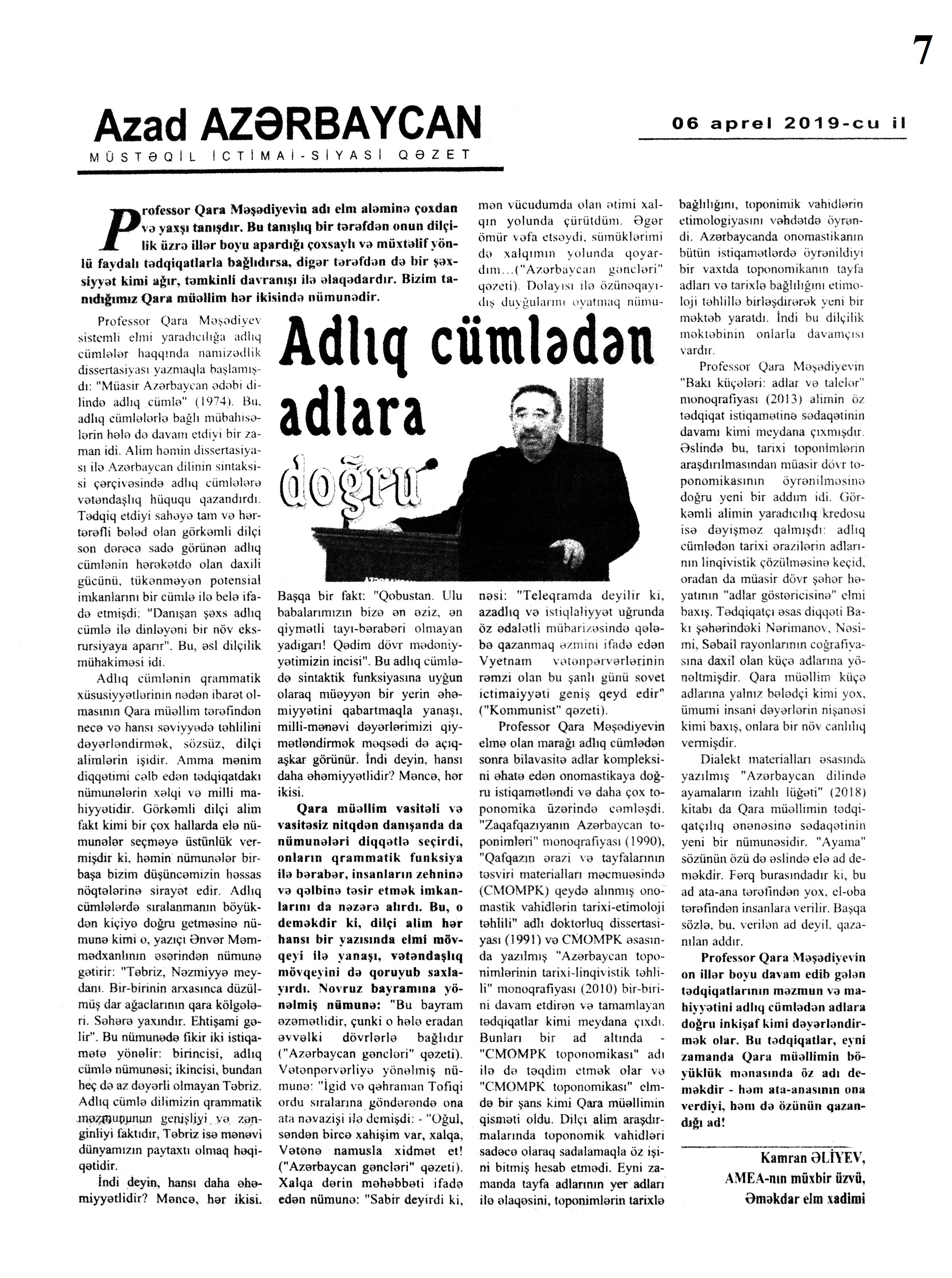 Uzaqlardan gələn gəmi; 475. Qiyaslı, Ə. Səxavət: [xanəndə Səxavət Məmmədova ithaf olunub] //Ədalət.- 2019.- 25 aprel.- S.7. 476. Qiyaslı, Ə. Ulu Tanrı yanında //Ədalət.- 2019.- 17 aprel.- S.8. 477. Quliyeva, A. Ana dilim //Həftə içi.- 2019.- 2 aprel.- S.8. 478. Quluzadə, Ə. Başımın üstündən ötən qaranquş Saçlarıma düşən dəni sayıbdı: Duzlu göl; Göy gözün əfsanəsi; Unutduğum telefon nömrəsi; Ayır görüm; Dən üstədi; Qoy gülsünlər qızlar mənə; Nə axtarır //Ədəbiyyat qəzeti.-2019.- 13 aprel.- S.24. 479. Qüdrət, T. Utanım gərək //Kredo.-2019.- 4 aprel.- S.5. 480. Məmməd, T. Akademik Ramiz Mehdiyevin “Tariximizin xanlıqlar dövrünün siyasi irsi sənədlər işığında” monoqrafiyasında ədəbiyyat və dil məsələləri //Ədəbiyyat qəzeti.-2019.- 27 aprel.- S.8. 481. Məmmədli, İ. Evə gələn və evdən gedən yol; Qəribə istək; Məhdudiyyət içində azadlıq; İlk baharın hiyləsi; Min birinci tövsiyə; Təhlükəli fikir; Son salam; Varis; Evimiz; Şəkil və s. //525-ci qəzet.- 2019.- 20 aprel.- S.19. 482. Məmmədli, İ. Ərəb baharından sonra gələn qış; Yazmıram daha; Bakıda qarsız qış; Bir baxışla məhəbbət; Gecə mənzərəsi; Bilirdi, amma və s. //Ədəbiyyat qəzeti.- 2019.- 27 aprel.- S.25. 483. Mövsüm, R. Bakını daha da gözəlləşdirək!.. //Ədalət.- 2019.- 23 aprel.- S.6. 484. Muğanlı, S. Son zəng; Ana //Azərbaycan müəllimi.- 2019.- 12 aprel.- S.14. 485. Muradoğlu, N. Azərbaycan bayrağı; Salam, Xocalı; Can Vətən; Sahildə böyüməmişdik //Ədəbiyyat qəzeti.- 2019.- 6 aprel.- S.27. 486. Mustafayeva, N. Şəhid anası; Qarabağ //Ədalət.- 2019.- 26 aprel.- S.8. 487. Müslüm, F. Doğum günümün ovqat şeirləri; Tutduq; Məni; Yaş artdıqca və s. //Ədalət.- 2019.- 13 aprel.- S.14. 488. Müzəffər M. Mən ölərkən...; Görünməyən sonsuzluğun naməlum adı...; Könlümün aynasında görünməkdəsən...; Gülün gül olmağı yalan... və s.: [özbək ədəbiyyatı] /tərc.etdi İntiqam Yaşar //Kaspi.-2019.- 13-15 aprel.- S.14. 489. Namazova, L. Gəl; Gün o gün olsunki...; Soruşmayın kiməm mən və s. //Ədalət.- 2019.- 26 aprel.- S.8. 490. Nazim, A. Şuşam //Azərbaycan müəllimi.- 2019.- 12 aprel.- S.14. 491. Nəbioğlu, N. Moskva qışı; Qürbətdə bir şair ömrü yaşadım; Sən hardan biləsən bənövşə nədir; Dolanım; Düşür və s. //525-ci qəzet.- 2019.- 10 aprel.- S.21. 492. Nəccari, Ü. Ənəl-şeir //Ədəbiyyat qəzeti.- 2019.- 27 aprel.- S.13. 493. Nəsib, V. Kəpənək ovu üstə...: Qəmli mənzərəm; İki Vaqifə bir iki kəlmə; Leysan qurbanlarına; Yanıltmac əvəzi və s. //Ədalət.-2019.- 6 aprel.- S.14. 494. Nəzər, A. Adımı şeir elədim; Ən həqiqi yalanım; Qayıt gəl, qardaş; Üzgün-üzgün; Torpaq saxlamaz məni; Mənəm kimə toxunsan; Bəsimdi; Anam, yenə...; Yolun yuxusu gəlir; Ağac olmaq istəyirəm //Ədəbiyyat qəzeti.- 2019.- 13 aprel.- S.12.