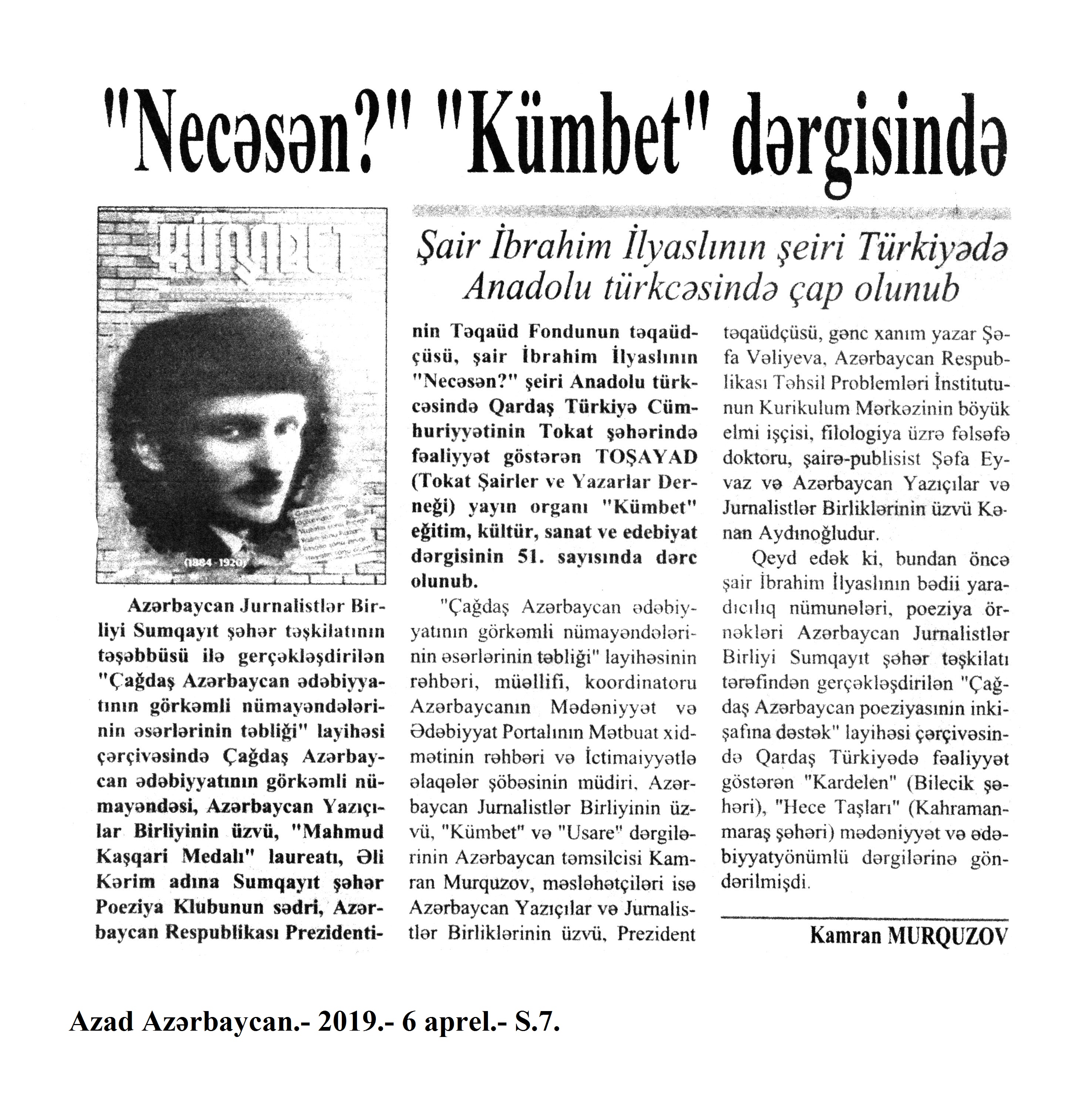 Nola...; Hardayam; Peşman olmaram 446. Əliyeva, L. Kədər; Döyüşə girirəm yenə zamanla; Məktub: [rus dilindən tərcümə] /tərc.etdi Arif Buzovnalı //Ədəbiyyat qəzeti.- 2019.- 20 aprel.- S.3. 447. Əyyuboğlu, M. Deyilsən; Anamın ruhuna salam; Aldanmağa öyrətdin; Səni axtarıram və s. //525-ci qəzet.- 2019.- 12 aprel.- S.15. 448. Əzhəri, N. Tapılmayan sərxoş; Məktub; Buyurun, gözəl düşmənlərim; Yanıq fotolar; Təbrizin yelləri //525-ci qəzet.- 2019.- 19 aprel.- S.13. 449. Əziz, V. Hər kəsin öz vaxtı olduğu üçün, heç kəs başqasının vaxtını bilmir...: Mən öz illərimi vermişdim sənə; Var olsun Tanrının rəssam dünyası; Yanmağında səadəti hər kəsin; Qorxurdum – qüdrəti yetməyə sözün; Dağlarda qonağam; Bu gün çıxmayacam hansısa yaza; Qolumda saatın əqrəbi axsaq; Qoca dünya gül becərə bilirsə; Məni; Gəmiçi, qəlbimi üfüqə apar; Sən demə; Qızarır dan yeri səhərə yaxın //Ədəbiyyat qəzeti.- 2019.- 27 aprel.- S. 14-15. 450. Əzizbəyli, F. Arama; Ömrün çatısı; Salxım söyüdün payızı; Sonuncu gəmi //Ədəbiyyat qəzeti.-2019.- 20 aprel.- S.25. 451. Fəxri, Z. Şəxsiyyət vəsiqəsi; Səs; Xoş gəldin, dərdim, xoş gəldin!; Qara torpaq, muğayat ol anamdan; Tut əlimdən, yollar mənim! və s. //Ədalət.-2019.- 3 aprel.- S.5. 452. Həsənzadə, N. Hər günü beləcə axşam elədin. Ömür dolu gəldi, boş getdi, şair. Enişli-yoxuşlu dünya; Söhrabın yerinə, mənim yerimə; Şuşa Vətəndi; Sualın olsa; Günəş əlvida deyir; İstiqlal yolu; Uşaqların söhbəti; Buzovna-Bakı yolları; Məhəbbət; İnciyir; Yaşat məni; Türk qızı; Qazax süfrəsi; Bu gündən sonra; Danışırdı; Neyləsin; Gözlər; Axtarıram; Səndən qabaq, məndən qabaq; Yaş getdi, şair //Ədəbiyyat qəzeti.- 2019.- 27 aprel.- S.2-4. 453. Hini, Ş. Şimal; Herakl və Antey: [İrlandiya ədəbiyyatı] /tərc.etdi Əyyub Qiyas //Ədəbiyyat qəzeti.- 2019.- 6 aprel.- S.32. 454. Hüseynbəyli, F. Xəncər kimi söz saplanır köksümə, Diri-diri ölmək deyil, bəs nədir?: Kədərimə lələk saldı durnalar...; Mən xəyal qurmadım bir ömür boyu...; Üzün Allah nişanıdı...; Çıxdım dinimdən-donumdan... və s. //Ədəbiyyat qəzeti.- 2019.- 6 aprel.- S. 6. 455. Hüseynzadə, M. Əlimi sən necə buraxıbsan ki, - Şeir yazdırırsan tutub əlimdən: Nəvələr; Atamız şeir yazsın; Zarafatsız; Düşdü; Bəyaz ölkəyə məktub; Şeir qürurumuz; Elegiya //Ədəbiyyat qəzeti.-2019.- 20 aprel.- S.22. 456. Xanlar, A. Tanrıya şikayət; Yollar da dar ağacıdır; Xatirələrin; Boğaza yığarlar səni; Hərə bir ömürün oyuncağıdır; Ömür; Qoyma çıxım yadından; Bu ömrün düzü də yalanı kimi; Əllər qucağın üstə...; Səni qısqanmaq; Xəstən olmaq mənə xoşdur; Ağrılar; Üşüyərsən; Səndən qazandığım //Ədəbiyyat qəzeti.- 2019.- 27 aprel.- S.28. 457. Xanlar, İ. Qaşla göz arasında; Teatr; And olsun atların ayağınnan qalxan torpağa... //Ədalət.-2019.- 6 aprel.- S.14. 458. İbrahim, Q. İllərlə itirib, anla gəzdiyim, Qarabağ həsrətim göyərmir, Allah: Köçkün qardaşım; Köçkün sayıldım; Əsir düşmüş Vətənim //Ədalət.-2019.- 25 aprel.- S.7. 459. İbrahimi, F.(Afaq) Ana dilim; Sənlə yaşayıram, səninlə varam...; Tapdalanmış fikirəm mən...; Məndən doğur həyat, əmək...; Zaman darısqaldır və s. //525-ci qəzet.-2019.- 12 aprel.- S.14. 460. İlhamoğlu, Z. Çatmır; Külümün altında; Adam; Yaşamaq //Kaspi.- 2019.- 27-29 aprel.- S.21. 461. İlkin, N. Ağlama şəhid balası; Vətən; Olaydı //Ədalət.-2019.- 10 aprel.- S.6. 462. İmani, B. Ay dəli ceyran; Yaz nəfəsi; Sorğu; Dəyməz; Bənzətmə; Üşüyür; Çillə axşamı //525-ci qəzet.- 2019.- 5 aprel.- S.13. 463. İmanzadə, İ. Dünyadı da...; Gecənin bu vaxtı; Gözlə, şəklini çəkim; Yalandanmı deyim... və s. //Ədalət.- 2019.- 24 aprel.- S.6. 464. İsmayılqızı, X. Qapıları döyən əlin sahibi, Bizim küçəmizdən keçəndə, yatıb: Saralmış dəftər...; Bir küçə, bir adam, bir də yalqızlıq...; Qollarını aç...; Dedilər ki, sevinc kədəri boğar... və s. //Ədalət.- 2019.- 11 aprel.- S.7. 465. Kamiloğlu. İnsan ol //Azad Azərbaycan.- 2019.- 13 aprel.- S.7. 466. Kəsəmənli, H. Varlıq Rəmzidir; Əvəz verir; Ona borcludur //Ədalət.-2019.- 5 aprel.- S.8. 467. Kəsəmənli, N. Getmək istəyirsən bəhanəsiz get; Etiraf; Sən demə təzədən sevmək olarmış; Biri vardı, biri yox; Dünən toyun idi; Gecikdi bu yağış; Əllərin nə yaman soyuqdur, gülüm //Ədalət.- 2019.- 20 aprel.- S.14. 468. Qacari, D. Əziz müəllim //Azərbaycan müəllimi.- 2019.- 12 aprel.- S.14. 469. Qaraişıq, R. Bir sarı yarpaq gördüm Bildim ki, payız gəlib...: Hadiyə bir heykəl qoyun, noolar?!; Ay Hələb...; İzmirdə kasım və s. //Ədəbiyyat qəzeti.- 2019.- 27 aprel.- S.31. 470. Qardaşxan. Mənsur ballada //Ədəbiyyat qəzeti.- 2019.- 27 aprel.- S.24. 471. Qədim, K. Hələ bir duanın üstdəyəm; Biz hazır nağılıq; Mən sənin yanına qayıdacağam; Barı, bu oxunan “Quran” olaydı və s. //Ədəbiyyat qəzeti.- 2019.- 6 aprel.- S.21. 472. Qədim, K. Nədən yetişməz ki duam Tanrıya...; Gülüm, dur yola sal, ötür gecəni; Özümü gözümün altda tuturam...; Dur ayağa, qonaqları qarşıla... və s. //Kaspi.- 2019.- 6-8 aprel.- S.11. 473. Qəhrəman, İ. Sevgi; Mərmiyəcən yaşamaq; Təkcə o qadının şairiyəm mən və s. //Ədalət.- 2019.- 27 aprel.- S.14.