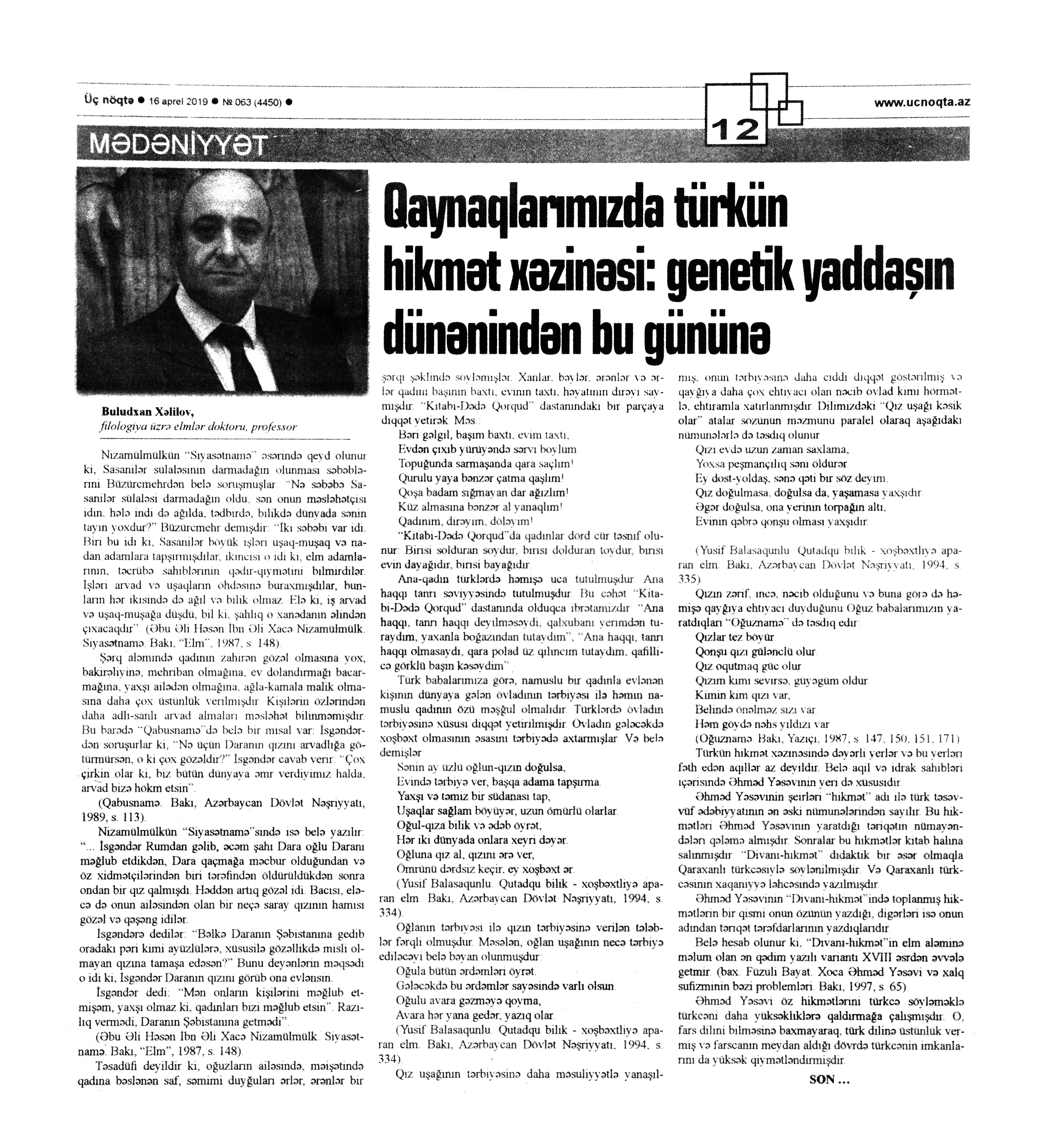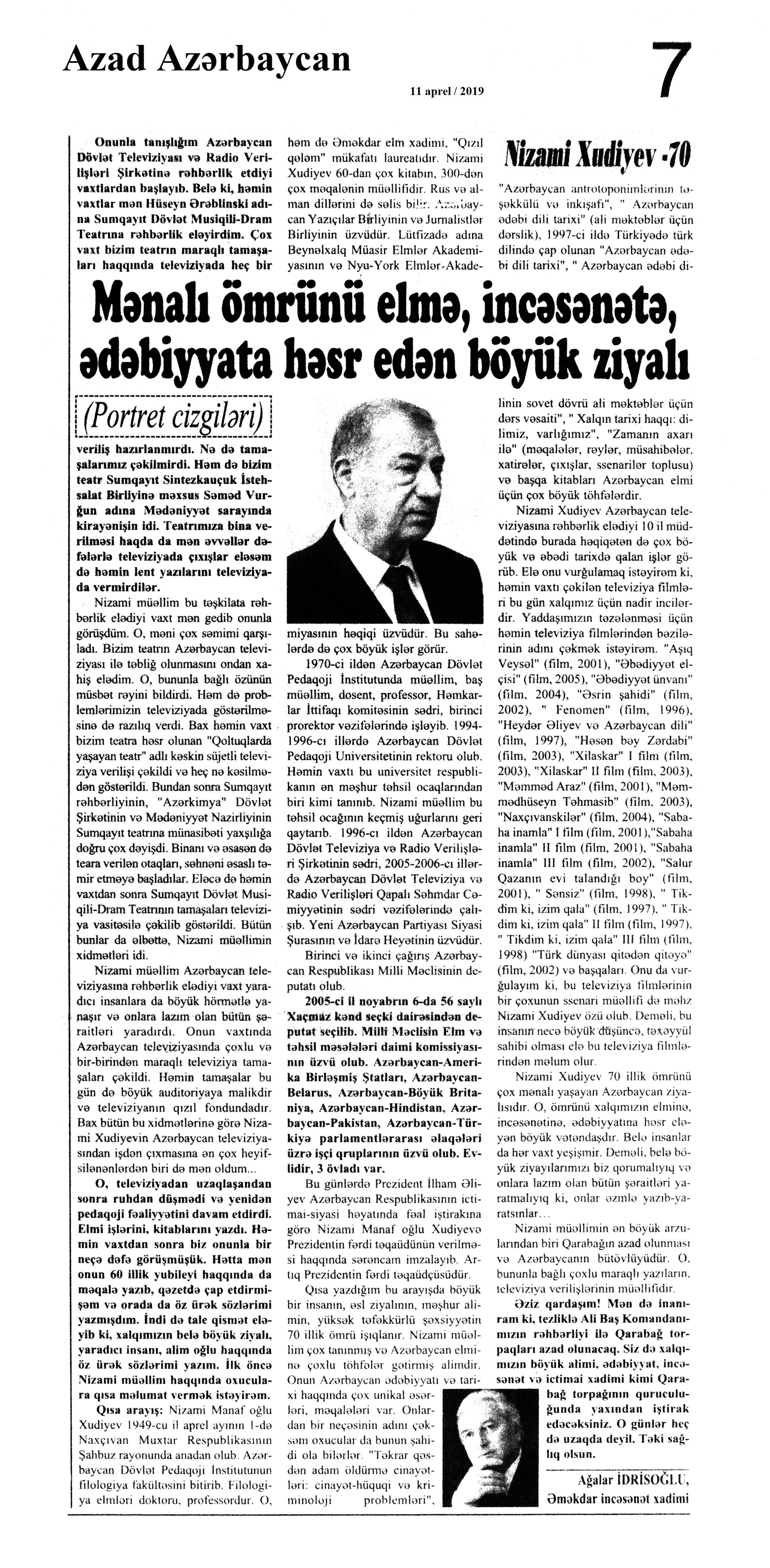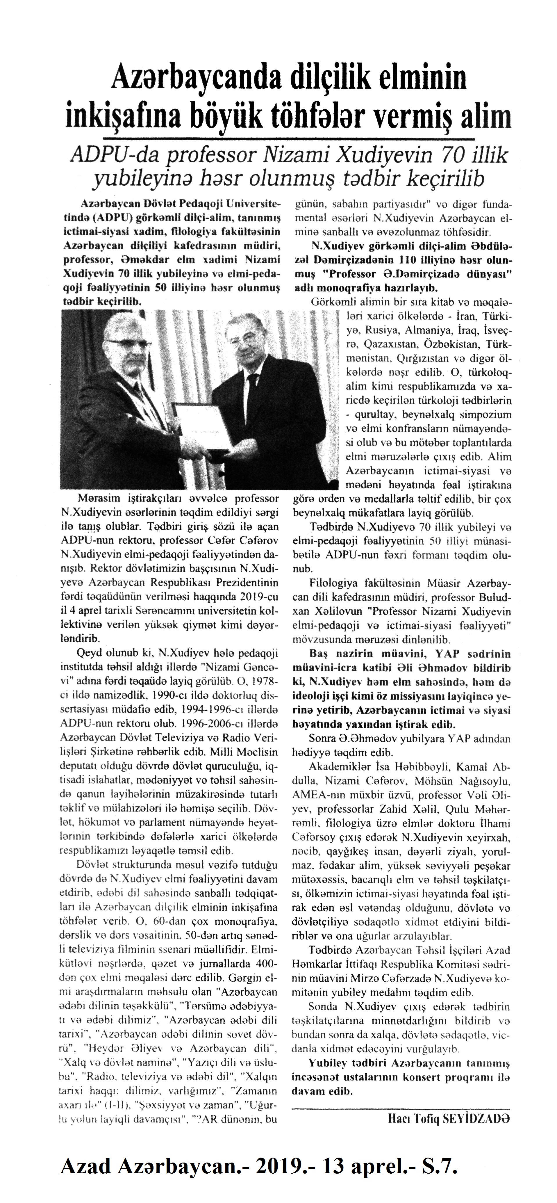 Nizami Xudiyev – 70 1016. Adil, N. Nizami Xudiyev – 70: [ADPU-də keçirilən tədbir haqqında] //Olaylar.- 2019.- 11-12 aprel.- S.10. 1017. Bayramov, H. Bacarıqlı pedaqoq, fəal vətəndaş, yorulmaz tədqiqatçı: Professor Nizami Xudiyev //Yeni Azərbaycan.-2019.- 6 aprel.- S.7. 1018. Elcanlı, S. İntellekt və istedad: [Əməkdar elm xadiminin yaradıcılığı haqqında] //Kredo.- 2019.- 8 aprel.- S.11. 1019. Əlizadə, T. H. Nizami Xudiyev İran mətbuatında //Kredo.- 2019.- 8 aprel.- S.14-15. 1020. Əsgərov, N. Azərbaycan ədəbi dil tarixinin yorulmaz tədqiqatçısı: [professor Nizami Xudiyevin yaradıcılığı haqqında] //Kredo.- 2019.- 11 aprel.- S.6. 1021. Xələfli, Ə.R. Hər işığın öz yazısı: Nizami Xudiyev – 70 //Kredo.- 2019.- 11 aprel.- S.1. 1022. Xələfli, Ə. R. Vətənə sevgi – dilə sevgi: [Əməkdar elm xadiminin yaradıcılığı haqqında] //Kredo. - 2019.- 8 aprel.- S.2;8. 1023. Xəlilov, B. Həyatı bir mükafat olaraq qəbul etdi: Həyat mükafatının vəkili oldu //Kaspi.- 2019.- 17 aprel.- S.15. 1024. Xəlilov, B. Nizami Xudiyev ömrü: N. Xudiyevin həyat və yaradıcılıq yolu //Ədəbiyyat qəzeti.- 2019.- 6 aprel.- S.12-13. 1025. Xudiyev, N. Həyatımdan yazılanlar //Kredo.- 2019.- 11 aprel.- S.5. 1026. Xudiyev, N. İstedadlı alim, böyük müəllim, xeyirxah insan: Ə. Dəmirçizadə - 110 //Xalq qəzeti.- 2019.- 7 aprel.- S.8. 1027. İdrisoğlu, A. Mənalı ömrünü elmə, incəsənətə, ədəbiyyata həsr edən böyük ziyalı //Azad Azərbaycan.- 2019.- 11 aprel.- S. 7. 1028. İsrafilov, V. Azərbaycan ədəbi dili tarixinin tədqiqində professor Nizami Xudiyevin rolu //Kredo.- 2019.- 11 aprel.- S.3. 1029. Kazımov, İ. Yaradıcılıq kredosu, yaxud özünüifadənin təsdiqi: [Əməkdar elm xadimi haqqında] //Kredo.- 2019.- 8 aprel.- S. 1; 12; 15. 1030. Məmmədli, İ. Tanıdığım Nizami Xudiyev: Nizami Xudiyev – 70 //Kredo.- 2019.- 8 aprel.- S. 7. 1031. Muradxanlı, M. Fəal həyat mövqeyi: Nizami Xudiyevin portret cizgiləri //Kredo.- 2019.- 8 aprel.- S.9. 1032. Müşfiq, Ş. Azərbaycan ədəbi dili tarixini öyrənən dərslik: [Əməkdar elm xadiminin “Azərbaycan ədəbi dili tarixi” kitabı haqqında] //525-ci qəzet.- 2019.- 10 aprel.- S.13. 1033. Müşfiq, Ş. Nizami Xudiyevin “Ömürdən səhifələr”i: [Əməkdar elm xadiminin eyniadlı kitabı haqqında] //525-ci qəzet.-2019.- 12 aprel.- S.13. 1034. Nağıyeva, T. Tanınmış alim... //Kredo.- 2019.- 11 aprel.- S. 3; 5. 1035. Piriyev, C. DPU-da professor Nizami Xudiyevin 70 illik yubileyi qeyd edilib //İki sahil.- 2019.- 11 aprel.- S. 6. 1036. Sadıqova, S. Nizami Xudiyevin şərəfli ömür yolu... //Bakı Xəbər.- 2019.- 11 aprel.- S.6. 1037. Seyidzadə, T. Azərbaycanda dilçilik elminin inkişafına böyük töhfələr vermiş alim: ADPU-da professor Nizami Xudiyevin 70 illik yubileyinə həsr olunmuş tədbir keçirilib //Azad Azərbaycan.- 2019.- 13 aprel.- S.7. 1038. Soytürk, H. Nizami Xudiyev və “Azərbaycan ədəbi dili tarixi” əsəri //Kredo.- 2019.- 8 aprel.- S.13. 1039. Yusifoğlu, R. Ömrün müdriklik zirvəsi: Nizami Xudiyev – 70 //Kredo.- 2019.- 8 aprel.- S.3;5. 1040. Yusifov, Y. Görkəmli dilçi alim: Böyük Azərbaycan dilçisi Ə.Ə.Dəmirçizadə elmi ənənələrinin sadiq davamçısı inkişafedicisi, dünya şöhrətli alim, Əməkdar elm xadimi, prof. Nizami Manaf oğlu Xudiyev barədə düşüncələrim //Kredo.- 2019.- 8 aprel.- S. 10; 16.