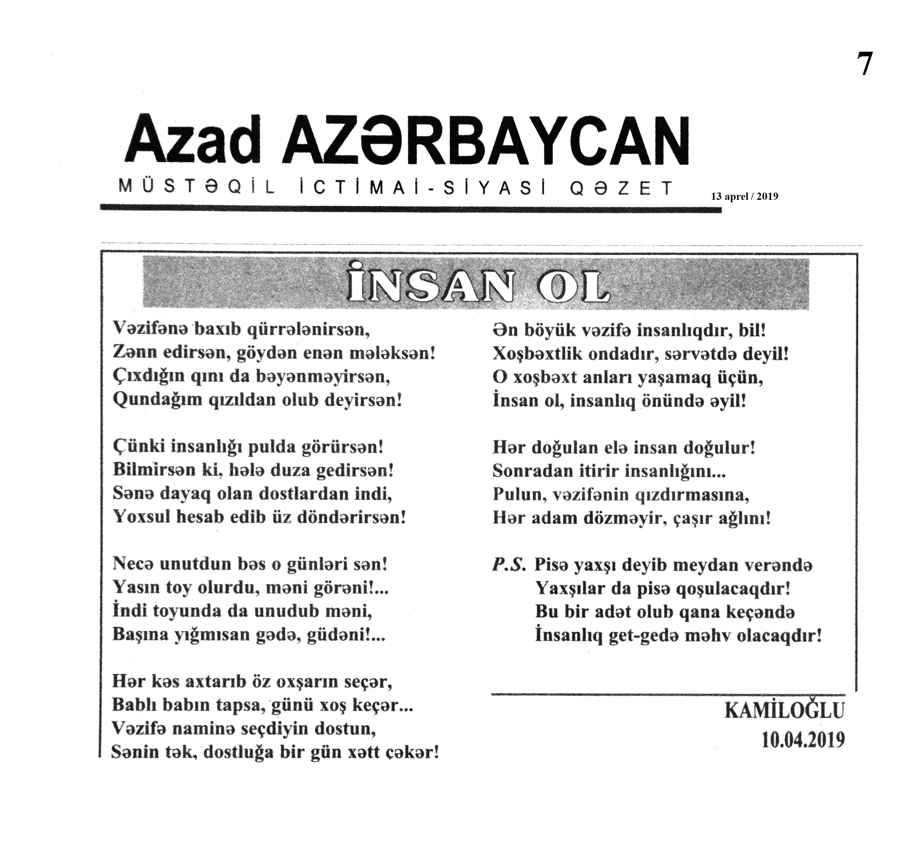 Haqqa qul olmaqdan heç vaxt doymadım...: 438. Əhməd, Ə. Sinif “o”: Gözlərini qapıdan...; Rebekka; Sıradan “bir gün”; Güllələr günəşi qan damarına çevirdi //525-ci qəzet.- 2019.- 13 aprel.- S.23. 439. Əhmədova, A. Utopik düşüncələr; Bir yol gedir bizim kəndə... //525-ci qəzet.-2019.- 27 aprel .- S.23. 440. Əhmədova, N. Vətən yarasına məlhəm ol, əsgər; Allah adamıdı bu yer üzündə; Əsmə, külək; Dəymə, könlümə dəymə //Ədalət.- 2019.- 26 aprel.- S.8. 441. Əlifoğlu, Ş. Birisi; Göyə çıxma, ay gözəl; Poçtalyon //Kredo.- 2019.- 18 aprel.- S.7. 442. Əlifoğlu, V. Nə getməyə, nə qalmağa üzüm var; Fələstin uşaqları; Karvan getdi, dalınca bax...; Xoşbəxt günlərimiz harda qurtarır... və s. //Ədalət.-2019.- 3 aprel.- S.7. 443. Əlihüseyn, V. Səni bu şəhərdə tapmaq çətindi; Yaxşı ki, sən getdin... //Ədəbiyyat qəzeti.- 2019.- 27 aprel.- S.30. 444. Əlioğlu, Ə. Yazda ayı oyandı bal qoxusuna...: Tərsinə əssin...; Budaqda...; Dənizdə çimən torpaq; Rəssam Günəş; Carçı qırov; Torpağın darağı; Qaçmağın sirri; Dəcəl cığır; Buzov; Üç xoruz yemişəm...; Yazda sayaram; Günəbaxan; Güclənən çay; Bal qoxusuna...; Qanadsız ley; Yumurta şəkli //Ədəbiyyat qəzeti.- 2019.- 13 aprel.- S.19.