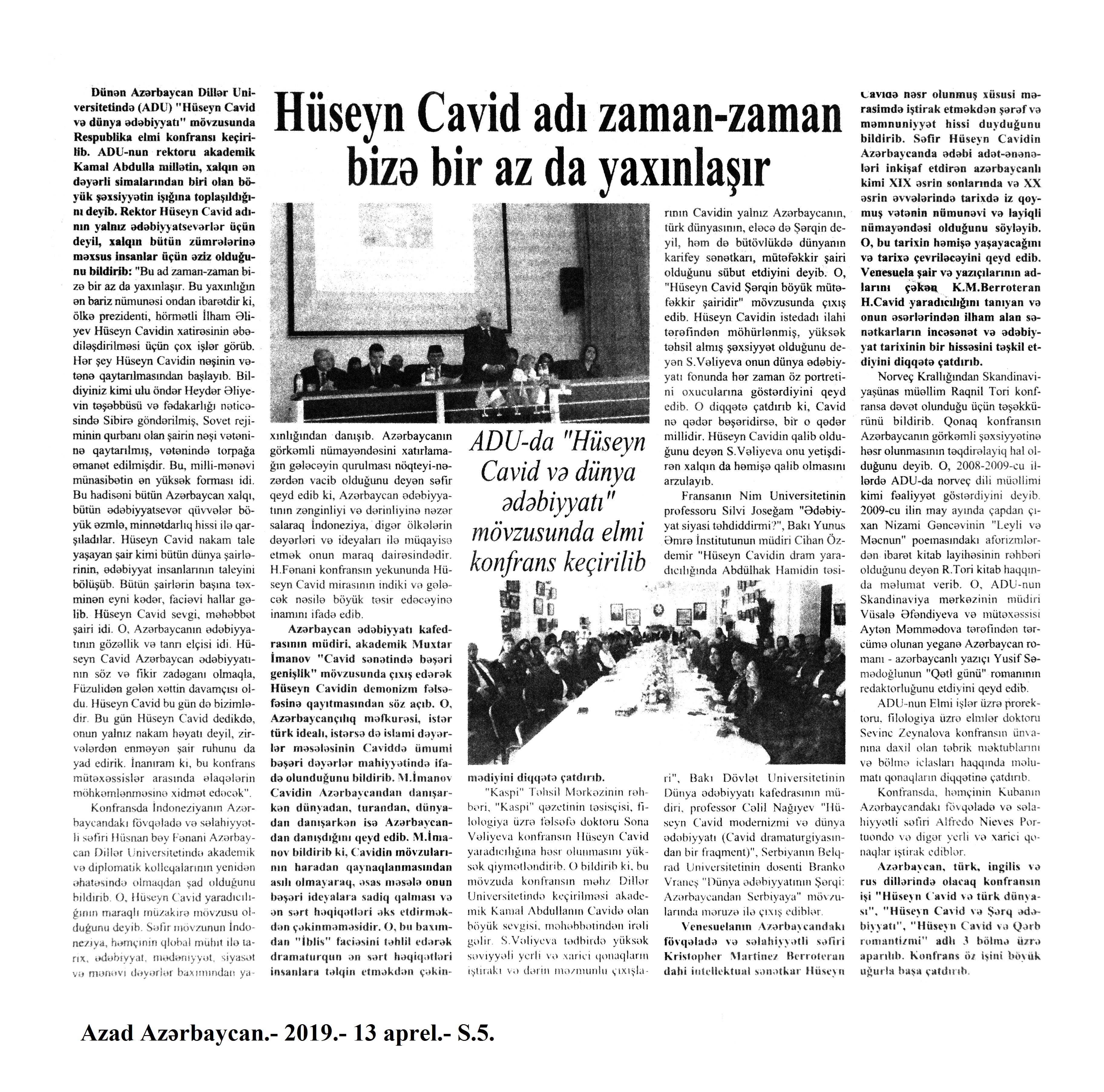 Hüseyn Cavid – 135 957. Hüseyn Cavid adı zaman-zaman bizə bir az da yaxınlaşır: ADU-da “Hüseyn Cavid və dünya ədəbiyyatı” mövzusunda elmi konfrans keçirilib //Azad Azərbaycan.- 2019.- 13 aprel.- S.5. 958. İstanbulda Hüseyn Cavidin “İblis” əsəri tamaşaya qoyulub: [İstanbulun Harbiyə-Muhsin Ərtuğrul səhnəsində görkəmli dramaturqun eyniadlı əsəri Azərbaycanın Əməkdar incəsənət xadimi Məlahət Abbasovanın quruluşunda] //Azərbaycan.-2019.- 19 ap-rel.- S. 4; Xalq qəzeti.- 2019.- 19 aprel.- S.9. 959. İstanbulda Hüseyn Cavidin “İblis” faciəsinin premyerası: Böyük ədibin yüz yaşlı əsəri ilk dəfə Türkiyə səhnəsində tamaşaya qoyulub: [Məlahət Abbasovanın hazırladığı eyniadlı ta-maşa haqqında] //Mədəniyyət.- 2019.- 19 aprel .- S.1;3. 960. Qarayeva, S. Hüseyn Cavid və dünya ədəbiyyatı: Dünən Azərbaycan Dillər Universitetində bu mövzuda Respublika elmi konfransı keçirilib //525-ci qəzet.- 2019.- 13 aprel.- S.14. 961. Məhərrəmova, N. İstanbulda Hüseyn Cavidin “İblis” əsəri tamaşaya qoyulub: [Azərbaycanın Əməkdar incəsənət xadimi, İstanbul Şəhər Teatrlarının direktor müavini Məlahət Ab-basovanın quruluşunda] /Səs.-2019.- 19 aprel.- S. 5; Yeni Azərbaycan.- 2019.- 19 aprel.- S. 5.