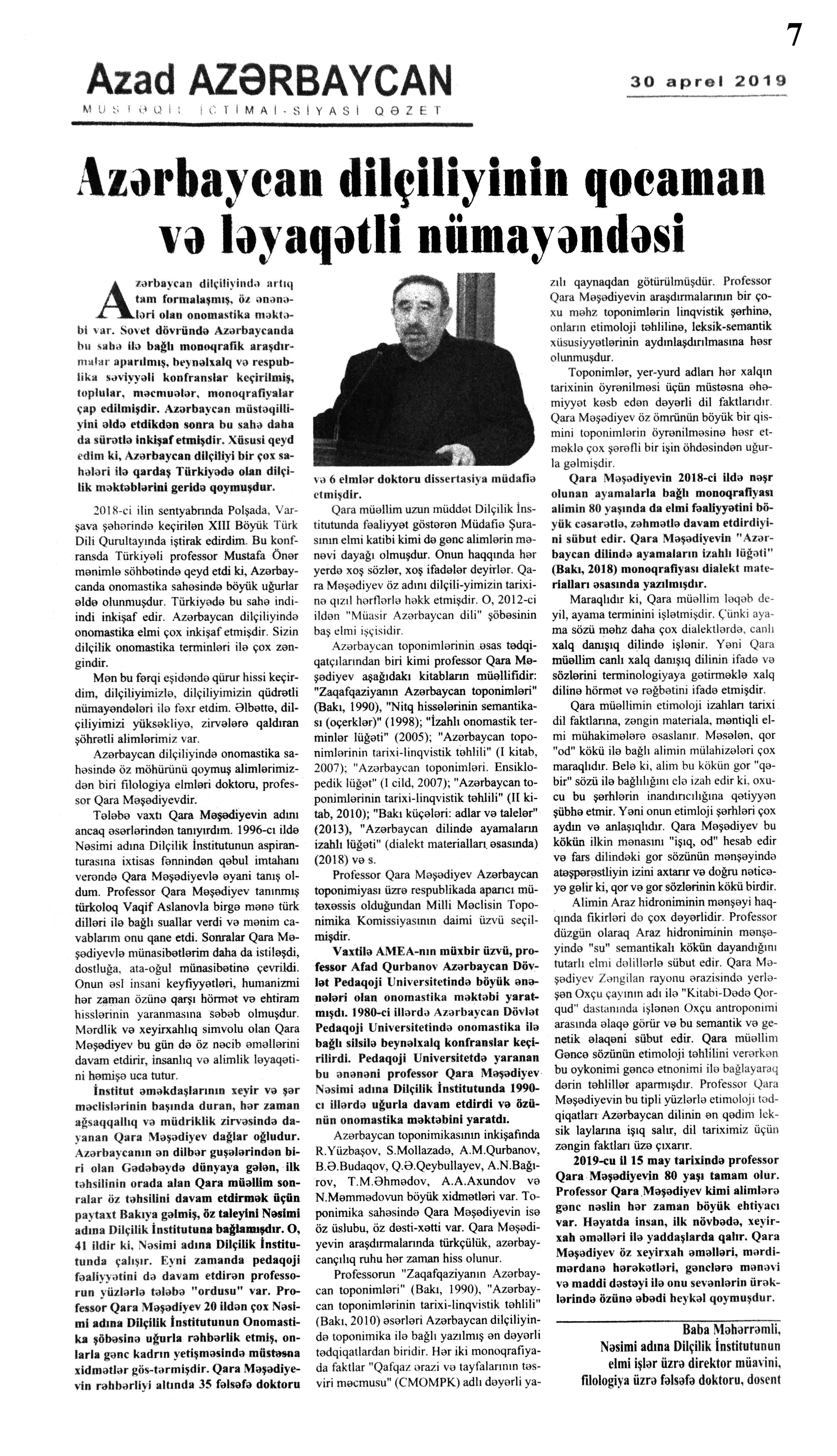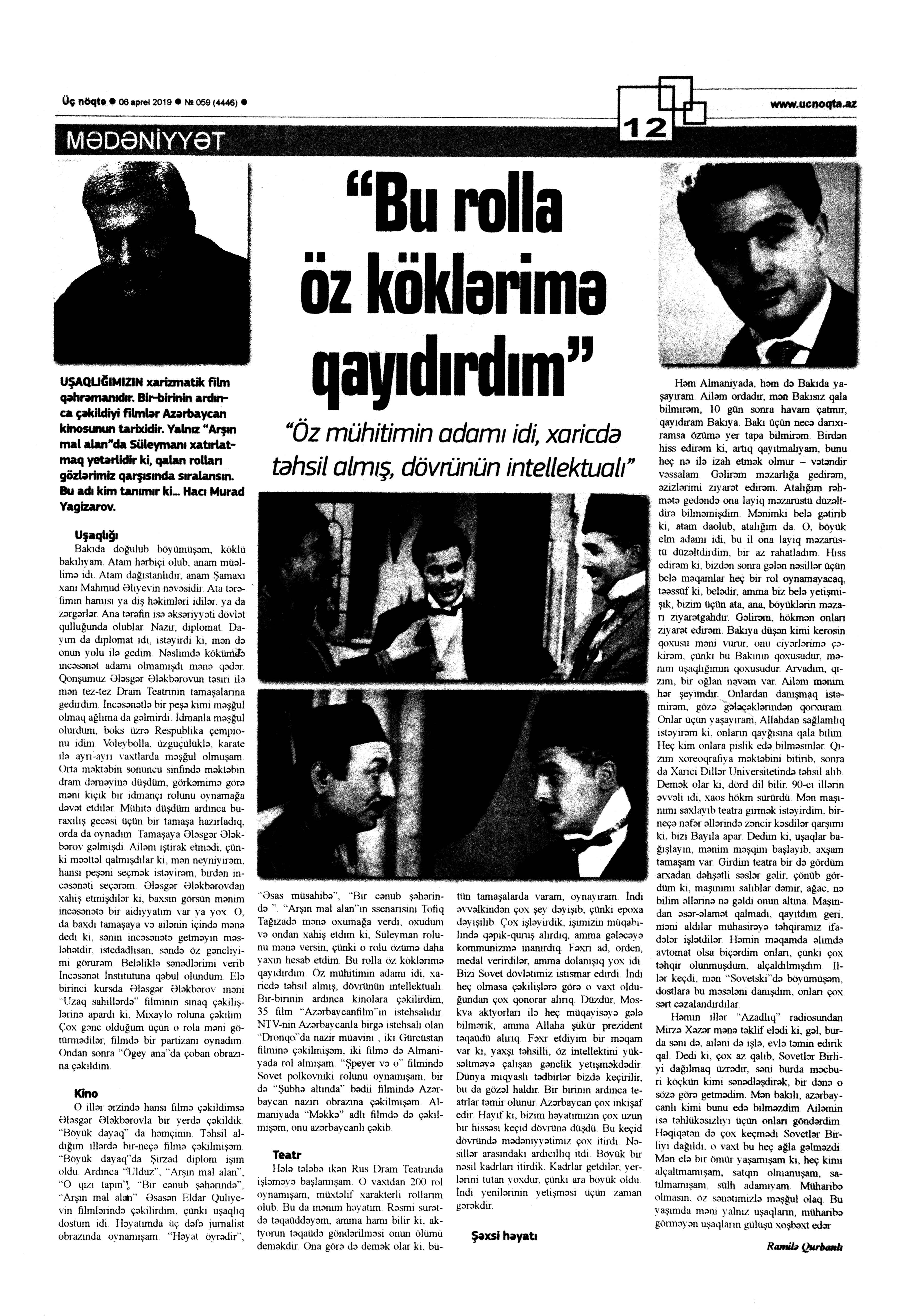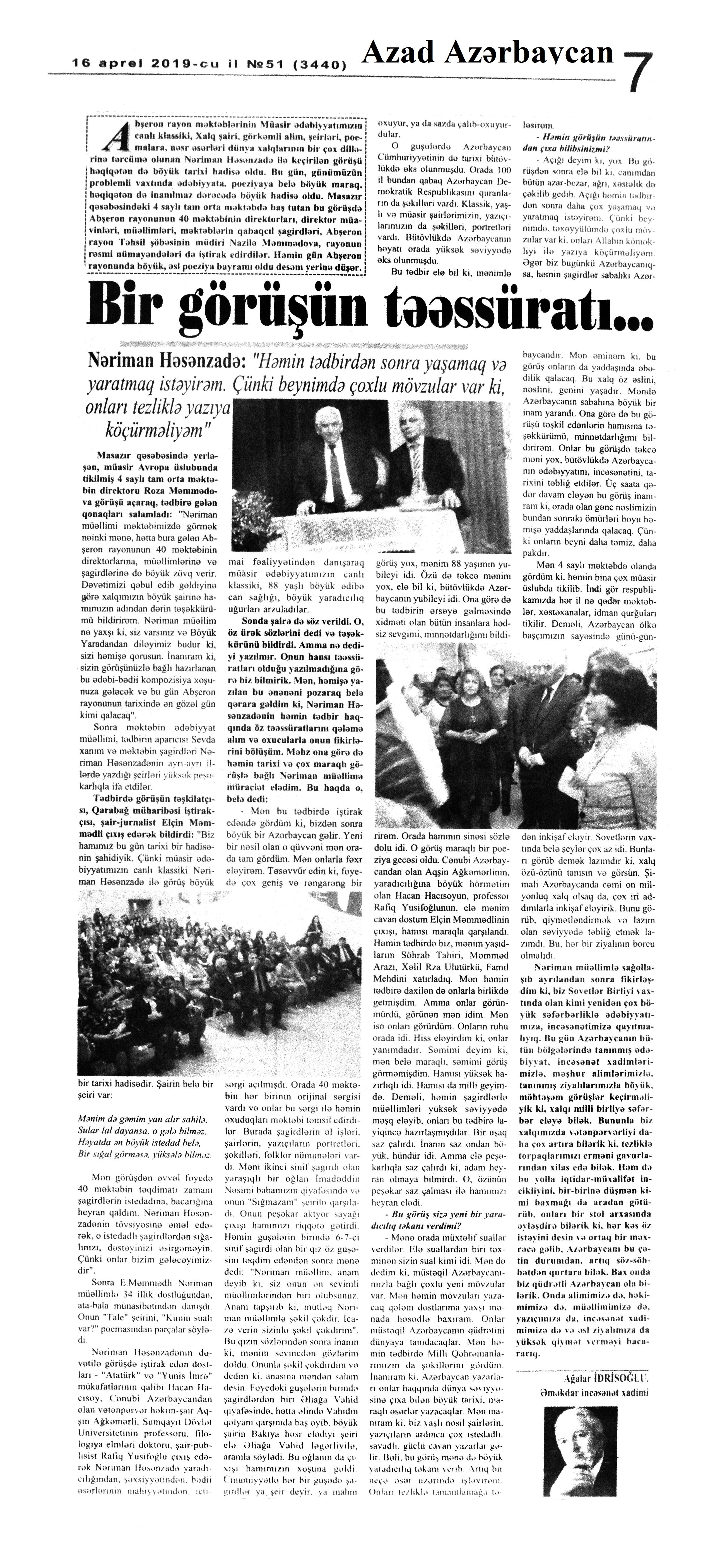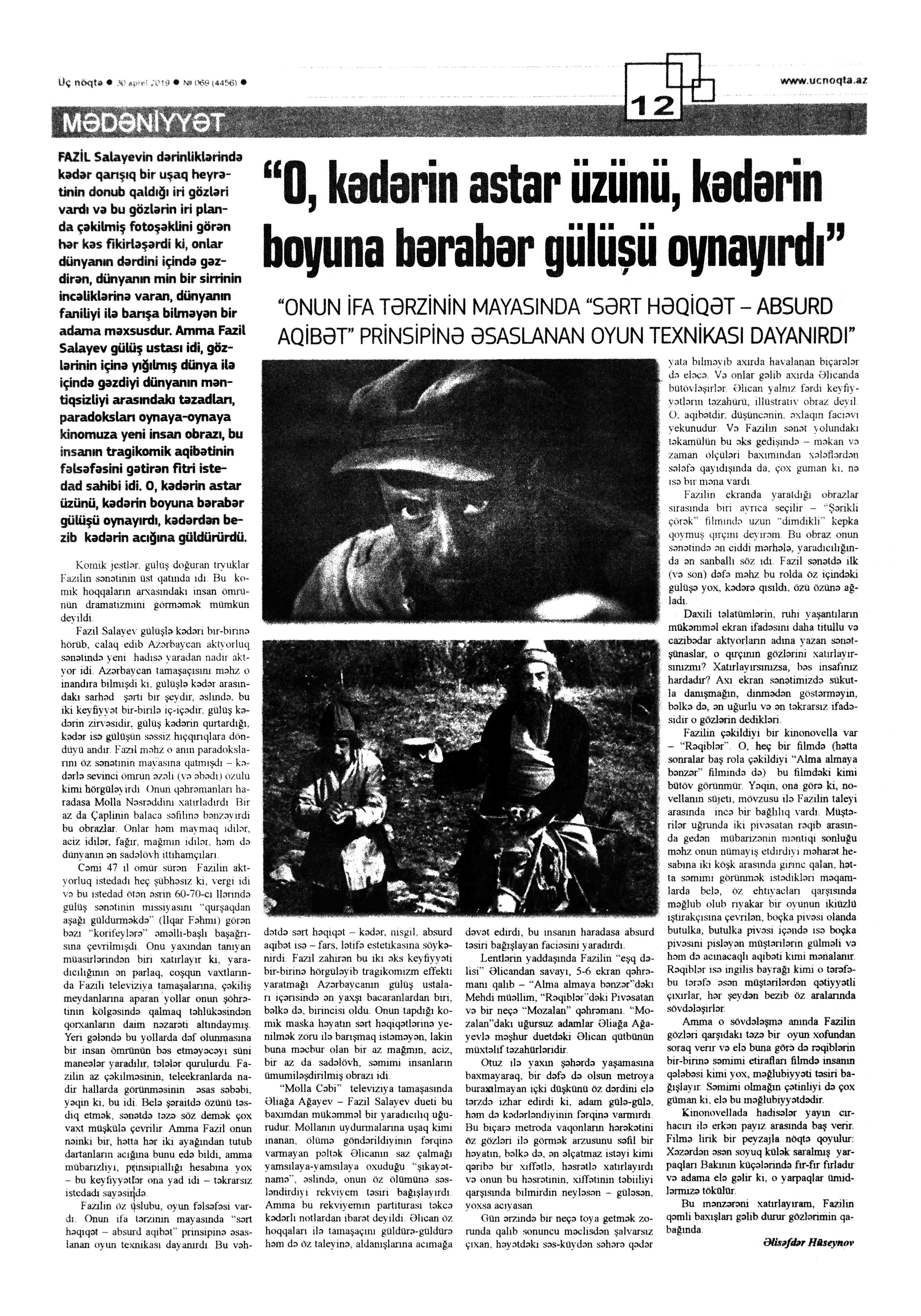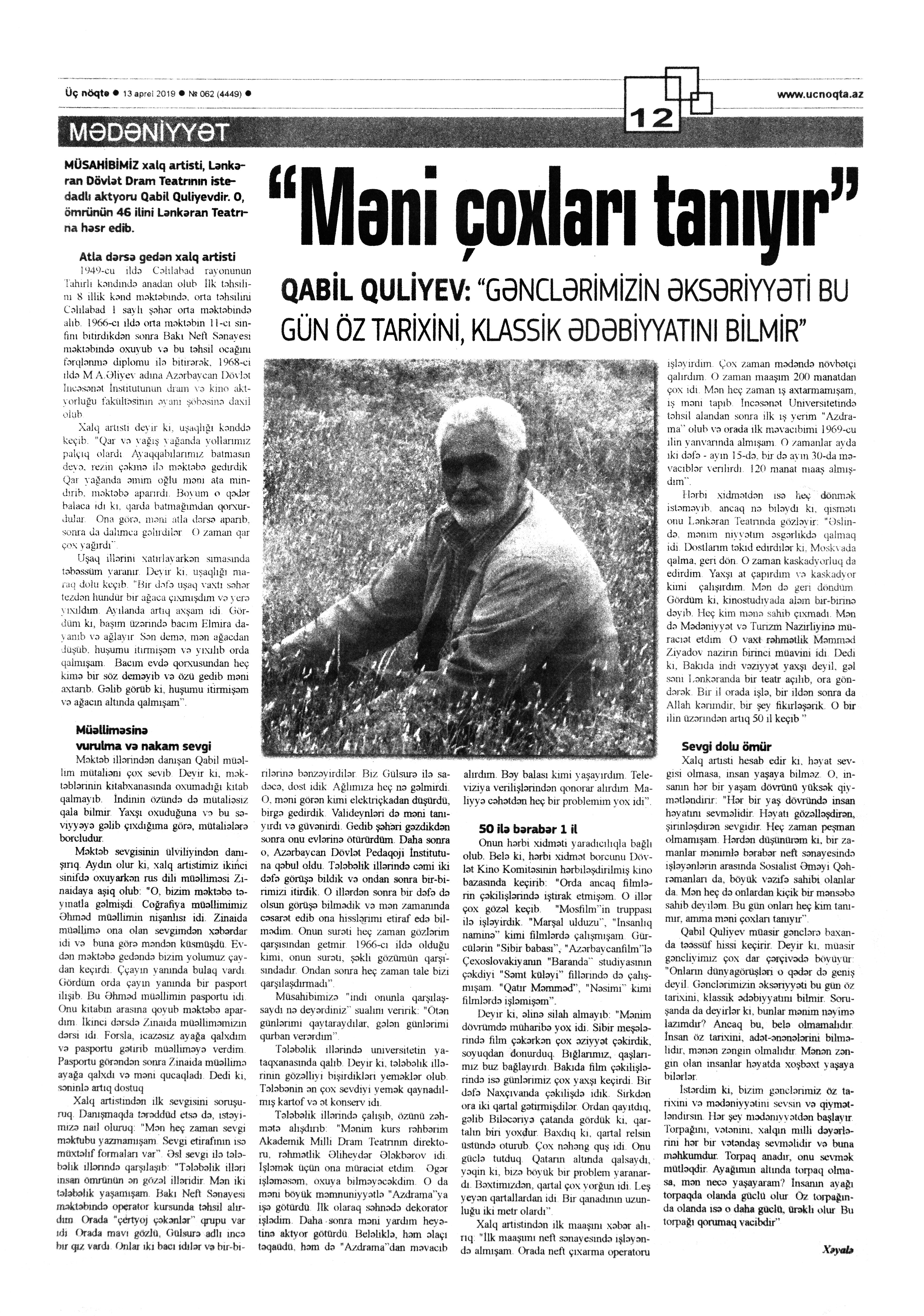 Qabil Quliyev – 70 412. Xəyalə. Məni çoxları tanıyır: Qabil Quliyev: Gənclərimizin əksəriyyəti bu gün öz tarixini, klassik ədəbiyyatını bilmir: [Xalq artisti haqqında] //Üç nöqtə.-2019.- 13 aprel.- S.12. 413. Quliyev, Q. “Sənətimi heç nəyə dəyişmədim”: Lənkəran Dövlət Dram Teatrının aparıcı səhnə ustası, Xalq artisti Qabil Quliyevin 70 yaşı tamam olur: [aktyorla müsahibə] /müsahibəni apardı Ağaddin Babayev //525-ci qəzet.- 2019.- 19 aprel.- S.8. 414. Lerikdə Xalq artisti Qabil Quliyevin 70 illiyi qeyd olunub //Mədəniyyət.-2017.- 24 aprel.- S.4. Akademik Milli Dram Teatrı 415. “Qətibə İnanc” yenidən səhnədə...: [Mərahim Fərzəlibəyovun hazırladığı eyniadlı tamaşanın təqdimatı haqqında] //Azad Azərbaycan.-2019.- 18 aprel.- S.7. 416. Quliyev, A. “Bugünkü filmlərdə yumor inkişaf edib”: [Xalq artisti Arif Quliyevlə müsahibə] /müsahibəni apardı N. Orucova //Olaylar.-2019.- 27-29 aprel.- S.12. 417. Məhərrəmova, T. O, niyə və nəyə güldürürdü?: Ağahüseyn Cavadovun epizodik rolları da yaddaqalan olub, hətta bəzən baş rolları kölgədə qoyub: [Xalq artisti haqqında] //Kaspi.-2019.- 30 aprel.- S.9. 418. Mirməmməd, G. Qəhrəman müəllifə qarşı: və ya Evripid elə bir qəhrəman yaratdı ki...: [teatrın səhnəsində Mesxeti Peşəkar Dövlət Dram Teatrının “Medeya Evripidə qarşı” tamaşasının yer alması haqqında] //Mədəniyyət.-2019.- 10 aprel.- S.5. 419. Mükərrəmoğlu, M. Milli teatr sənətimizin inkişafına dövlət dəstəyi artmaqdadır: [Xalq artisti Hacı İsmayılovun fikirləri] //Xalq qəzeti.-2019.- 19 aprel.- S.6.