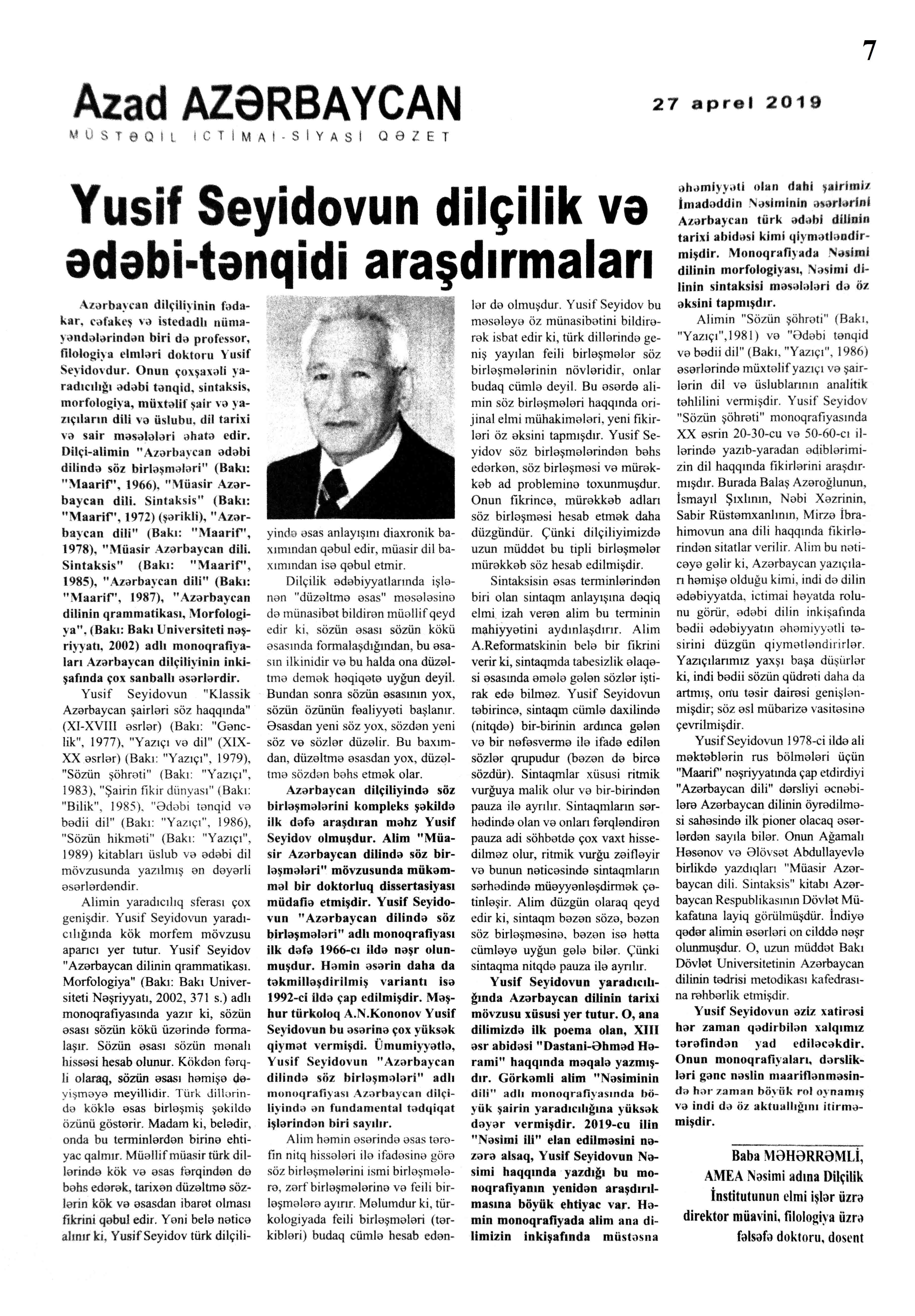 Yusif Seyidov – 90 1011. Məhərrəmli, B. Yusif Seyidovun dilçilik və ədəbi-tənqidi araşdırmaları: [dilçi-alimin əziz xatirəsinə] //Azad Azərbaycan.- 2019.- 27 aprel.- S.7. 1012. Məşədiyeva, A. Dilimizin fəal təəssübkeşi və fədakar tədqiqatçısı //525-ci qəzet. - 2019.-26 aprel.- S.15. 1013. Professor Yusif Seyidovun 90 illiyi elmi konfransla qeyd edildi: [AMEA Naxçıvan Bölməsinin İncəsənət, Dil və Ədəbiyyat İnstitutunda] //525-ci qəzet.- 2019.-26 aprel.- S.15. 1014. Seyidov, T. Yusif Seyidov və Azərbaycan dilçiliyi: AMEA-nın Nəsimi adına Dilçilk İnstitutunda görkəmli alim Yusif Seyidovun 90 illik yubileyi qeyd olunub //Azad Azərbaycan.- 2019.- 30 aprel.- S.5. 1015. Şükürlü, T. Yusif Seyidov təkrarsızlığı: Görkəmli dilçi alimimizini 90 illiyinə ///525-ci qəzet.- 2019.-19 aprel.- S.10.