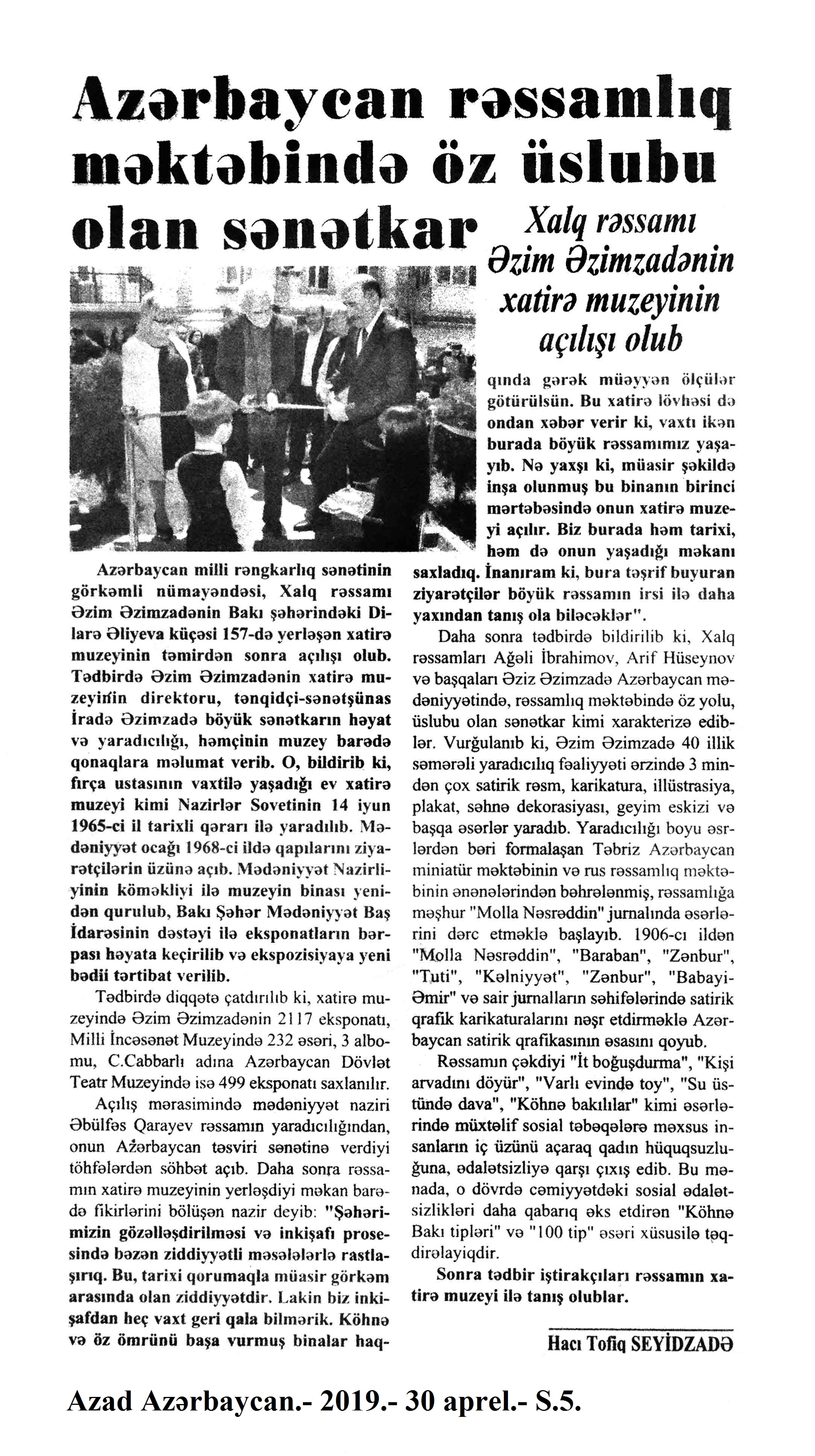HEYKƏLTƏRAŞLIQ 241. Fərəcov, S. Psixoloji portretlər ustası: Monumentalçı heykəltəraş Münəvvər Rzayevanın 90 illiyi qeyd olundu: [Muzey Mərkəzində] //Mədəniyyət.-2019.- 17 aprel.- S.3. 242. Fərəcova, Z. Üçlüyün şah əsəri: Tarixləşən heykəllər: [heykəltəraşlar Qorxmaz Sücəddinov, Albert Mustafayev və Aslan Rüstəmov tərəfindən hazırlanmış “Bəhram Gur”un heykəli haqqında] //Azərbaycan.-2019.- 21 aprel.- S.5. 243. Hacı Zeynalabdin Tağıyevin heykəlinin hazırlanması ilə bağlı açıq heykəltəraşlıq müsabiqəsi elan olunub //Yeni Azərbaycan.-2019.- 26 aprel.- S.7. 244. Krakov Dağ-Mədən Akademiyasında Yusuf Məmmədəliyevin xatirəsi əbədiləşdirilib: [görkəmli alimin xatirəsinin əbədiləşdirilməsi məqsədilə barelyefin quraşdırılması haqqında] //Mədəniyyət.-2019.- 26 aprel.- S.2. 245. Mükərrəmoğlu, M. Polşanın Krakov şəhərində akademik Yusif Məmmədəliyevin yubileyi qeyd olunmuşdur: [akademikin barelyefinin açılışı haqqında] //Xalq qəzeti.-2019.- 26 aprel.- S.10. 246. Səmədzadə, Z.Ə. “Hacı Zeynalabdin Tağıyevin qəlblərdə ucalan heykəlinə daha bir heykəl əlavə olunacaq”: [akademik Ziyad Səmədzadə ilə müsahibə] /müsahibəni apardı Kamil //İqtisadiyyat.-2019.- 11-17 aprel.- S.6-7.
