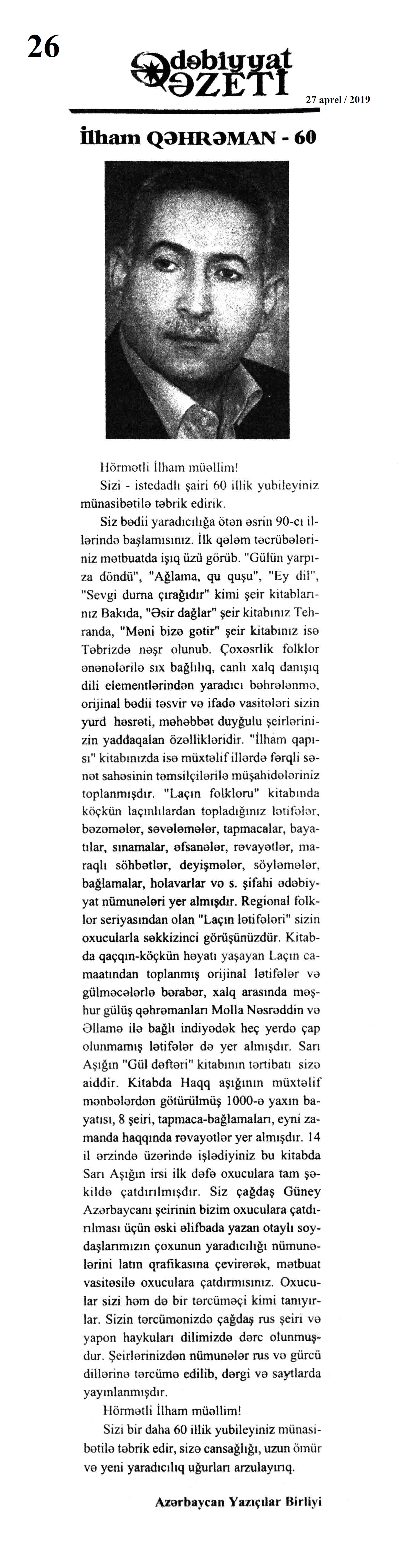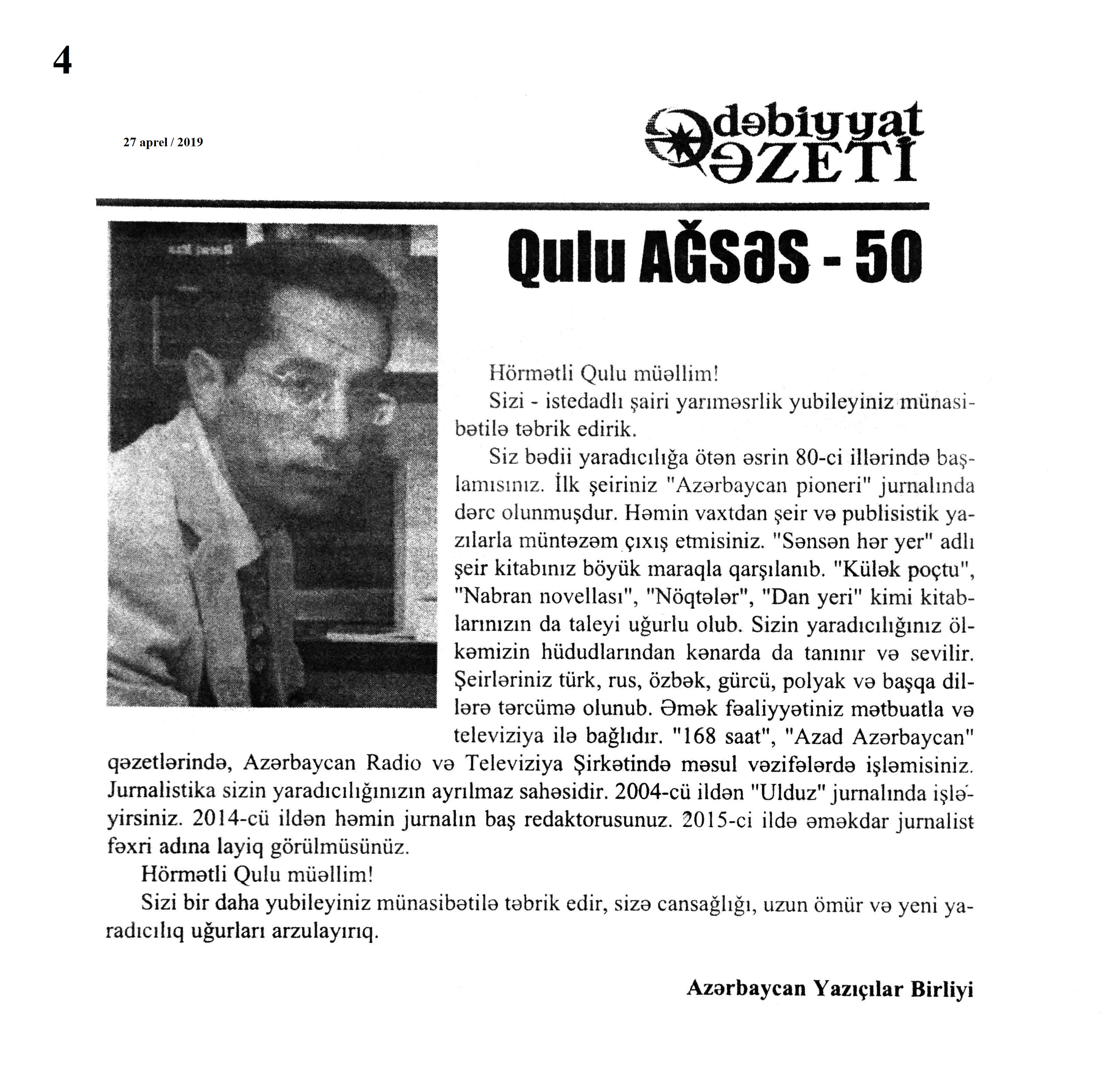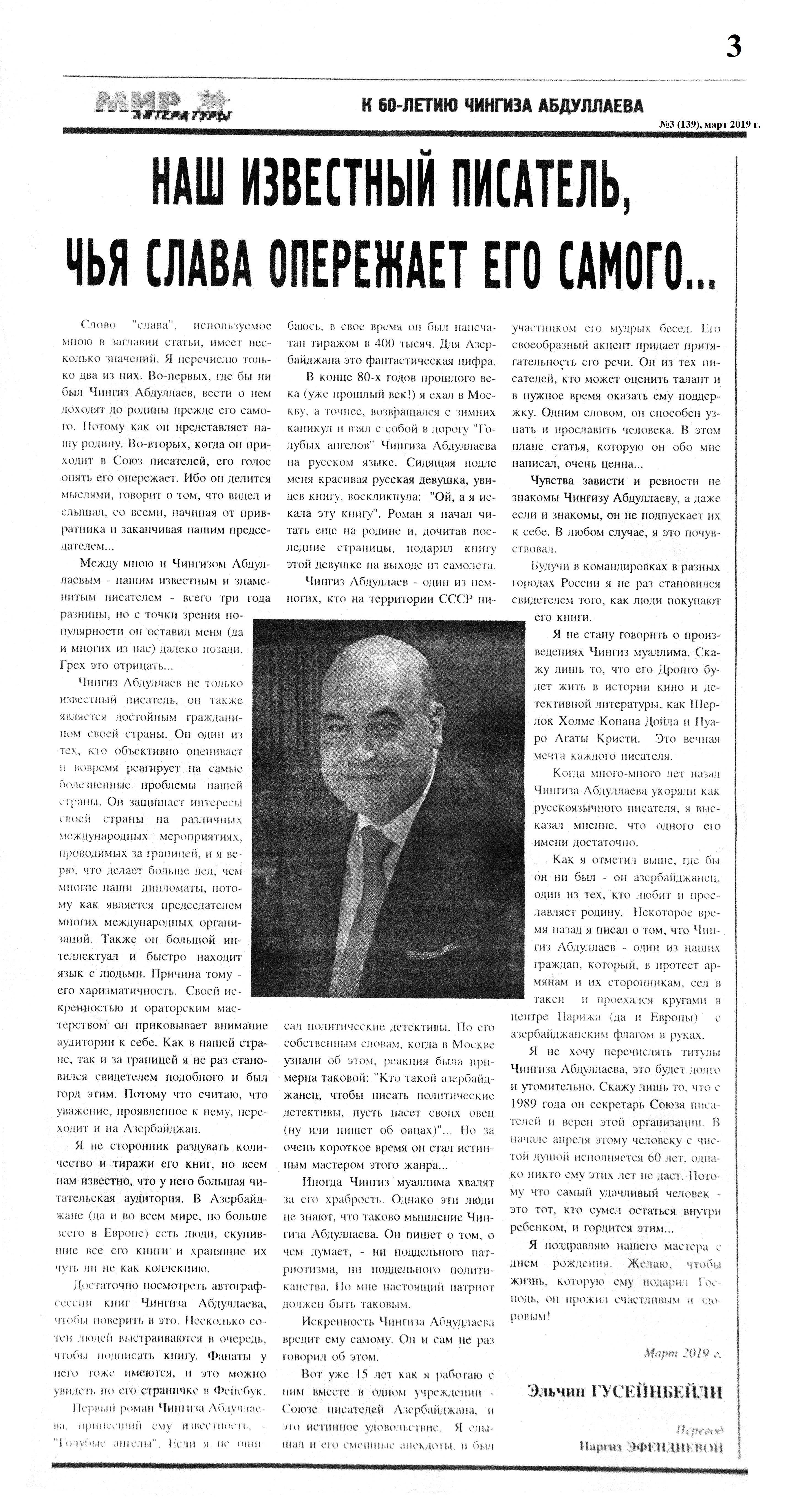 Çingiz Abdullayev – 60 1051. Abdullayev, Ç. Azərbaycan Respublikasının Prezidenti Cənab İlham Əliyevə: [Xalq yazıçısının “Şərəf” ordeni ilə təltif olunması münasibətilə təşəkkür məktubu] //Ədəbiyyat qəzeti.-2019.- 13 aprel.- S.2. 1052. Azəri, L. Milli Kitabxanada yubilyar yazıçı ilə görüş //Mədəniyyət.- 2019.- 12 aprel.- S.1-2. 1053. Çingiz Abdullayev: İstəyirəm ki, Bakı daha da gözəlləşsin və dünyada birinci şəhər olsun: [Trend-ə açıqlamasında Xalq yazıçısının fikri] //Kaspi.-2019.- 16 aprel.- S.10. 1054. Çingiz Abdullayev – 60: [Xalq yazıçısının yubileyi münasibətilə AYB-nin təbriki] //Ədəbiyyat qəzeti.- 2019.- 6 aprel.- S. 18.