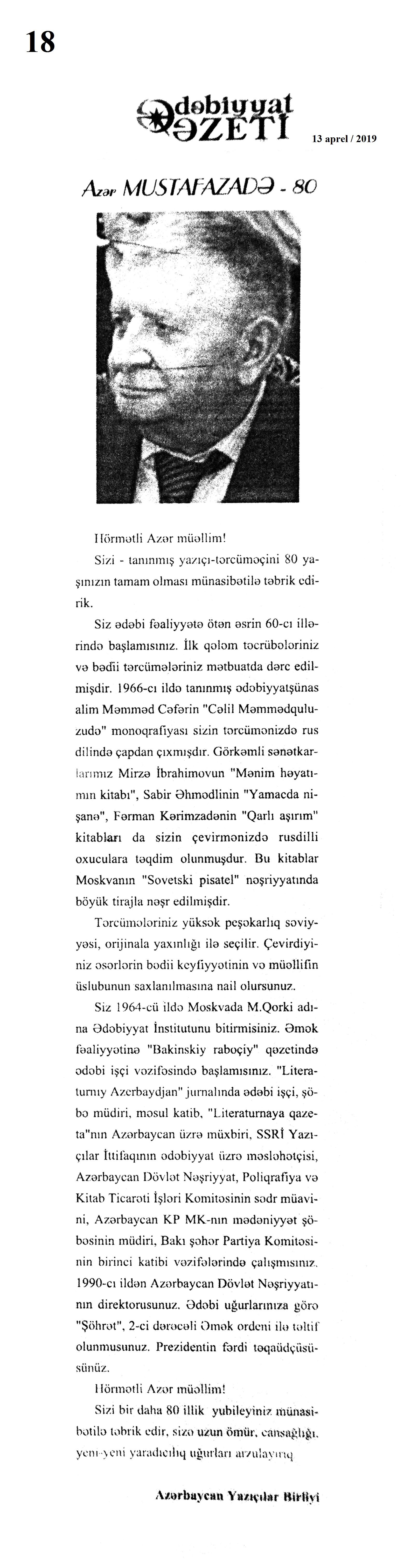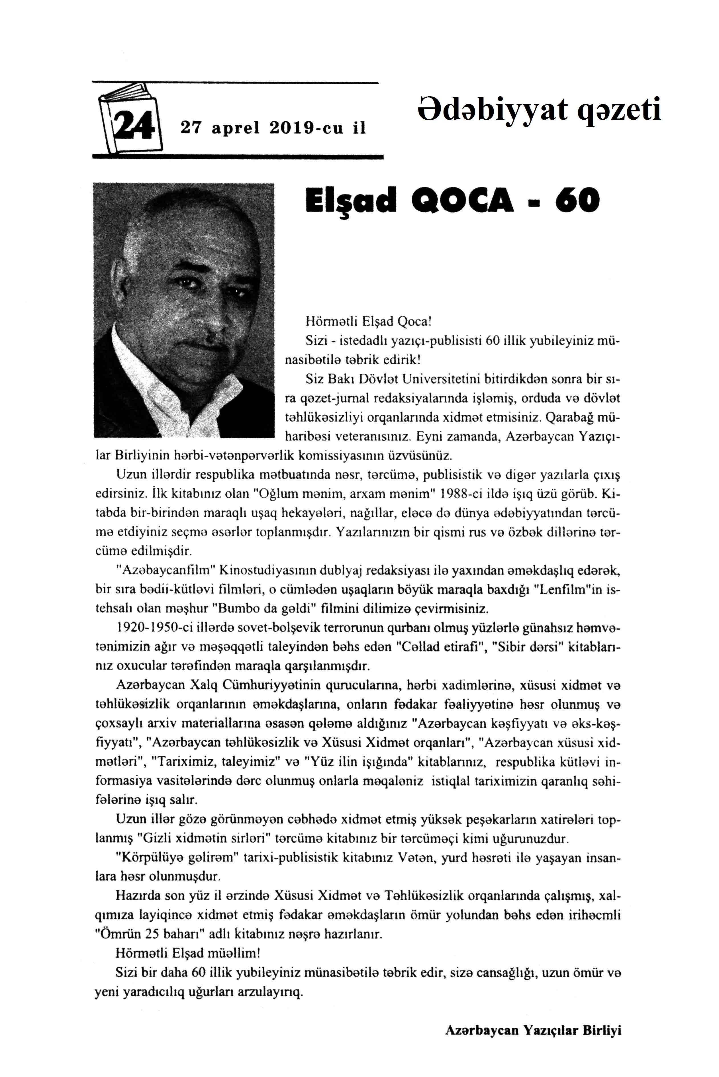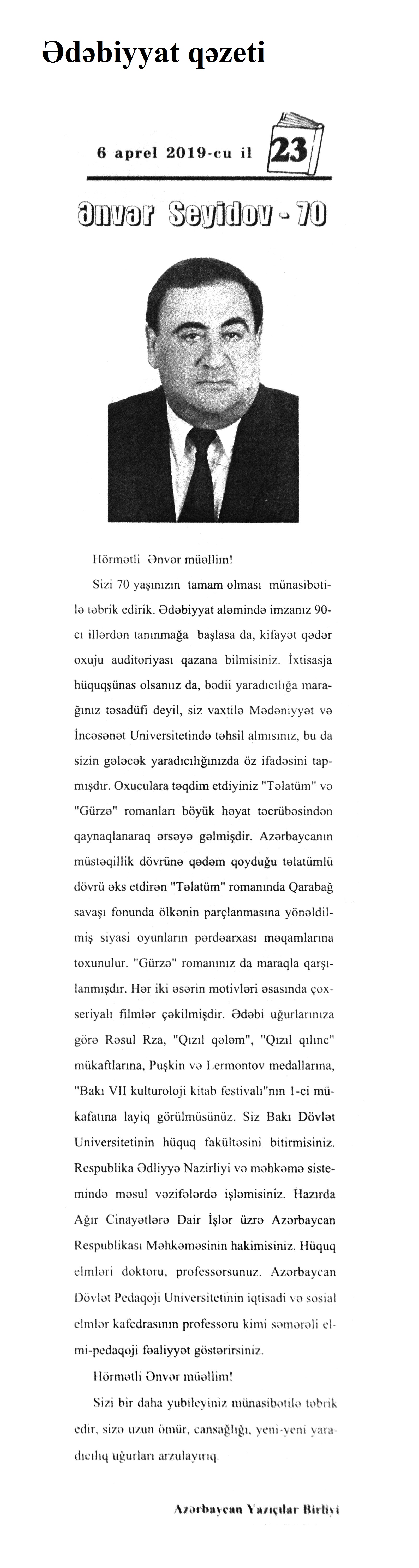 Çingiz Abdullayev – 60 1051. Abdullayev, Ç. Azərbaycan Respublikasının Prezidenti Cənab İlham Əliyevə: [Xalq yazıçısının “Şərəf” ordeni ilə təltif olunması münasibətilə təşəkkür məktubu] //Ədəbiyyat qəzeti.-2019.- 13 aprel.- S.2. 1052. Azəri, L. Milli Kitabxanada yubilyar yazıçı ilə görüş //Mədəniyyət.- 2019.- 12 aprel.- S.1-2. 1053. Çingiz Abdullayev: İstəyirəm ki, Bakı daha da gözəlləşsin və dünyada birinci şəhər olsun: [Trend-ə açıqlamasında Xalq yazıçısının fikri] //Kaspi.-2019.- 16 aprel.- S.10. 1054. Çingiz Abdullayev – 60: [Xalq yazıçısının yubileyi münasibətilə AYB-nin təbriki] //Ədəbiyyat qəzeti.- 2019.- 6 aprel.- S. 18.