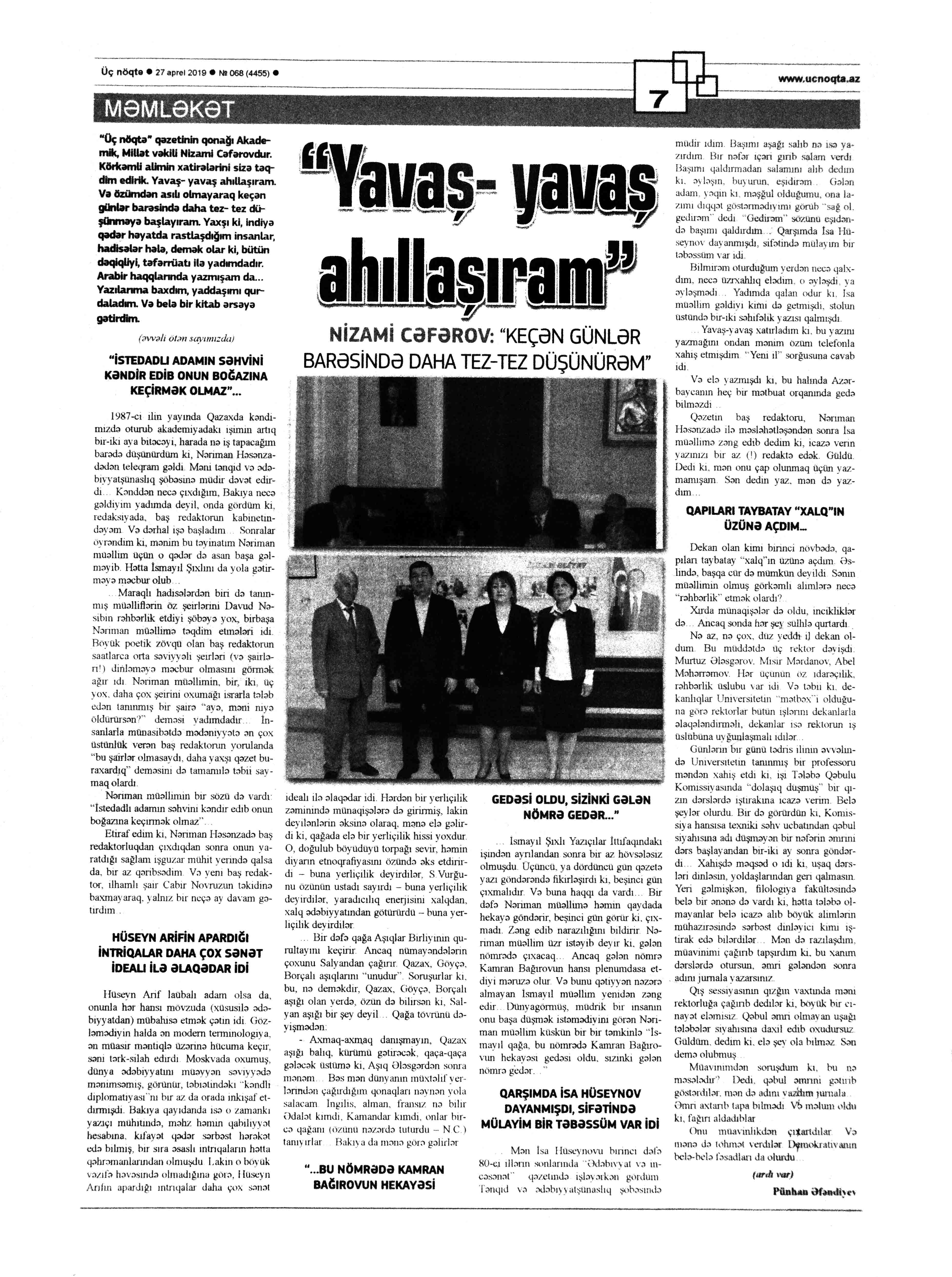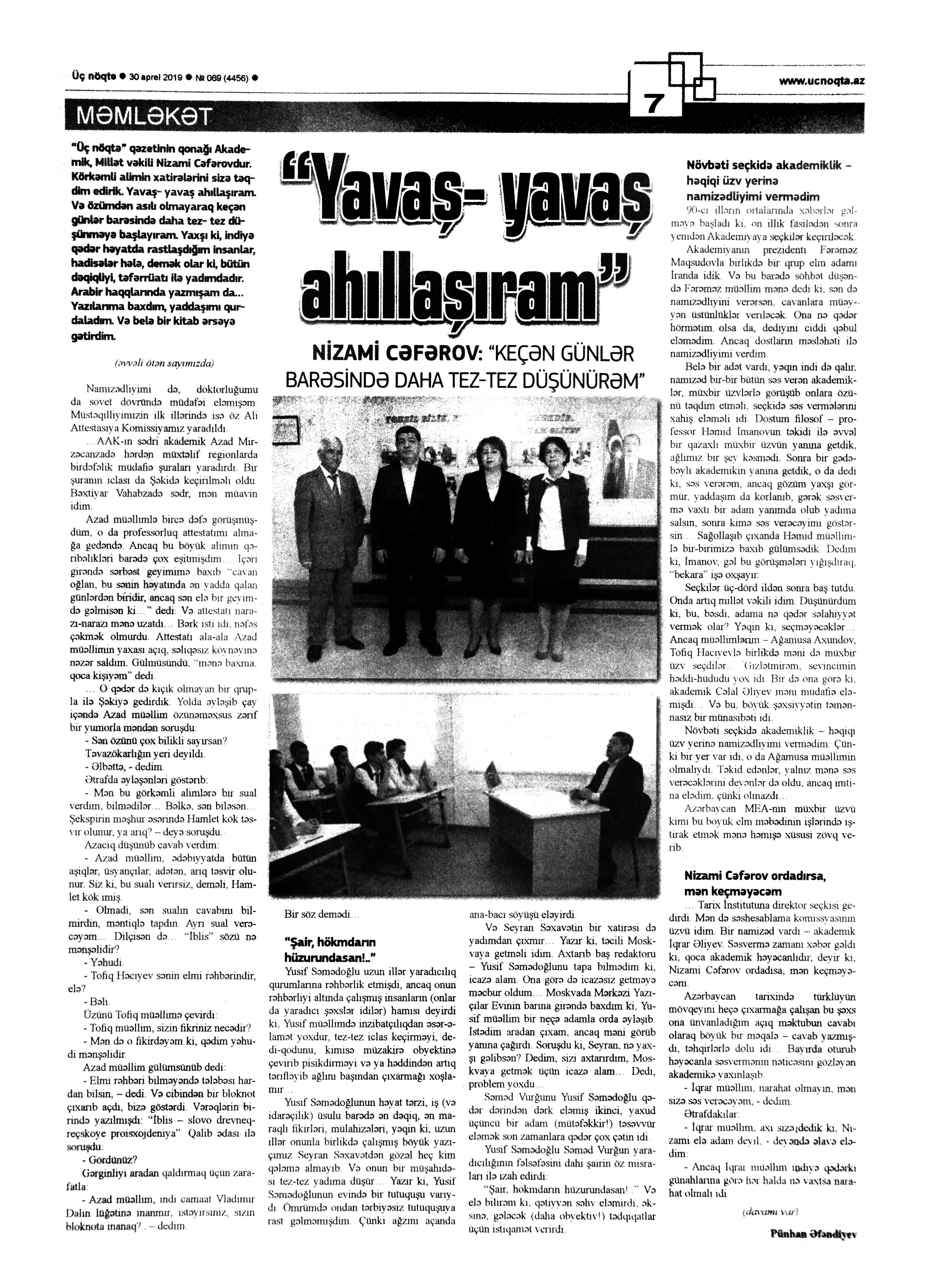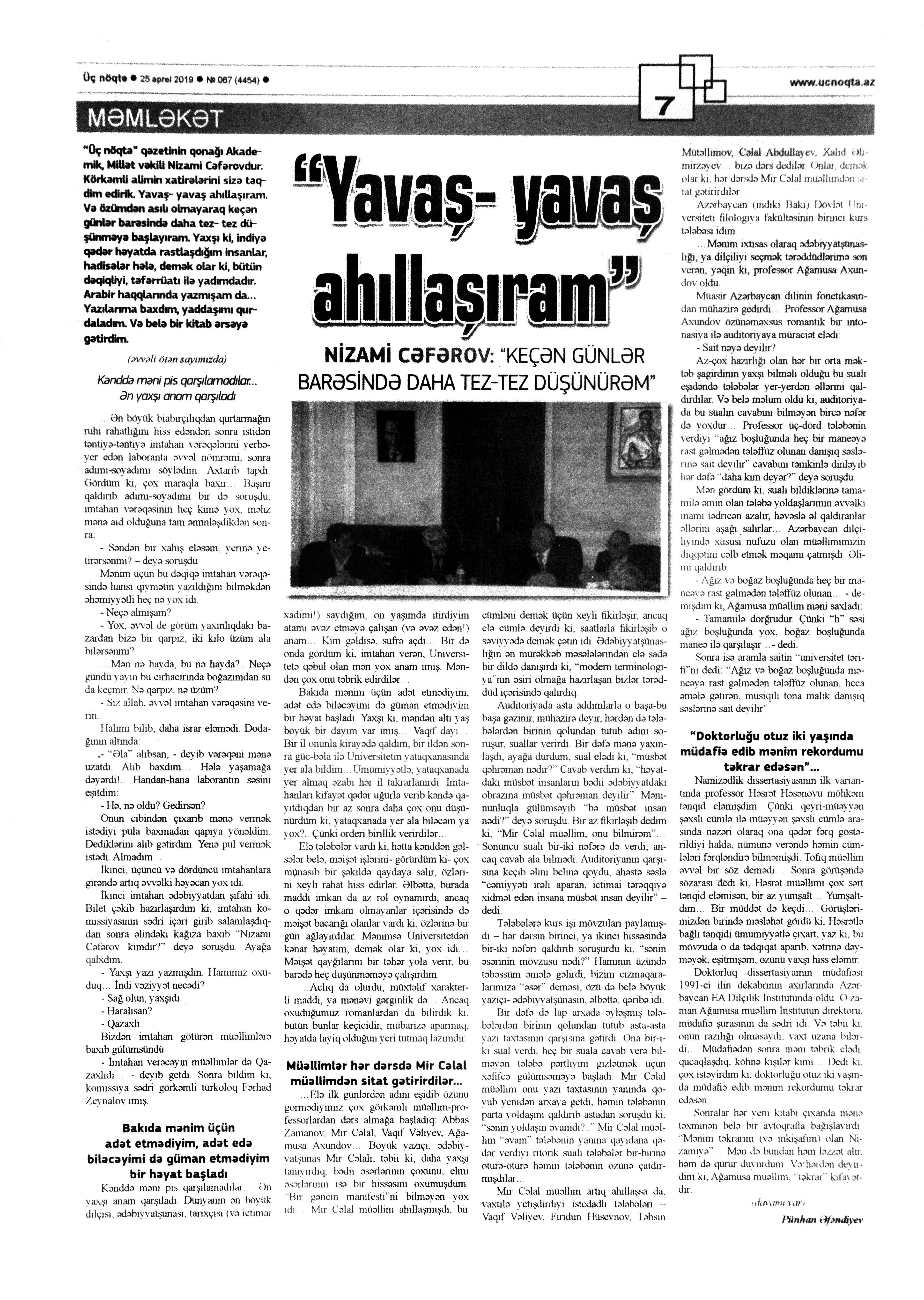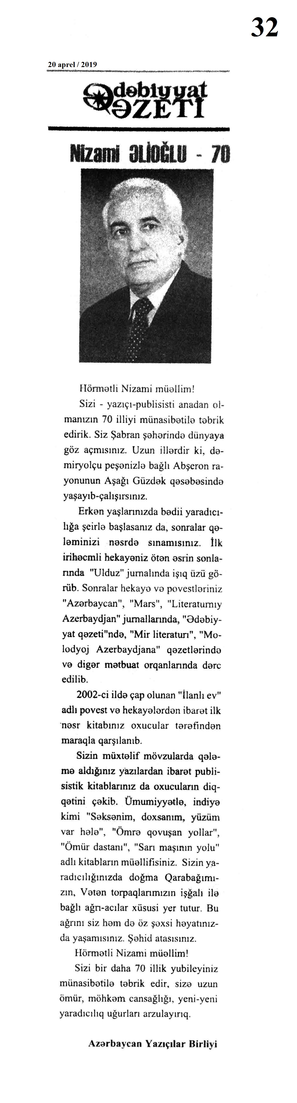 Nizami Cəfərov – 60 1041. Aran, S. Allah tərəfindən sevilən bəndə //Ədəbiyyat qəzeti.-2019.- 27 aprel.- S.21. 1042. Babanlı, V. Ağır çəkili alim: [akademik haqqında] //Ədəbiyyat qəzeti.- 2019.- 13 aprel.- S.13. 1043. Elçin. Nizami – 60: gənclik və müdriklik: Yaxud, Nizami, bəs roman nə oldu? //525-ci qəzet.-2019.- 20 aprel.- S.12. 1044. Əfəndiyev, P. “Yavaş-yavaş ahıllaşıram”: Nizami Cəfərov: Keçən günlər barəsində daha tez-tez düşünürəm //Üç nöqtə.- 2019.- 23 aprel.- S.6. 1045. Əfəndiyev, P. “Yavaş-yavaş ahıllaşıram”: Nizami Cəfərov: “Keçən günlər barəsində daha tez-tez düşünürəm” //Üç nöqtə.- 2019.- 25 aprel.- S.7. 1046. Əfəndiyev, P. “Yavaş-yavaş ahıllaşıram”: Nizami Cəfərov: “Keçən günlər barəsində daha tez-tez düşünürəm” //Üç nöqtə.- 2019.- 27 aprel.- S. 7. 1047. Əfəndiyev, P. “Yavaş-yavaş ahıllaşıram”: Nizami Cəfərov: Keçən günlər barəsində daha tez-tez düşünürəm //Üç nöqtə.- 2019.- 30 aprel.- S.7. 1048. Məmmədəliyev, V. Nizami Cəfərov fenomeni //525-ci qəzet.- 2019.- 27 aprel.- S.11. 1049. Rüstəmxanlı, S. Yüksəliş yolu //Ədəbiyyat qəzeti.-2019.- 27 aprel.- S.21. 1050. Şəmsizadə, N. Sərhədsiz düşüncə sahibi //Ədəbiyyat qəzeti.- 2019.- 27 aprel.- S.20.