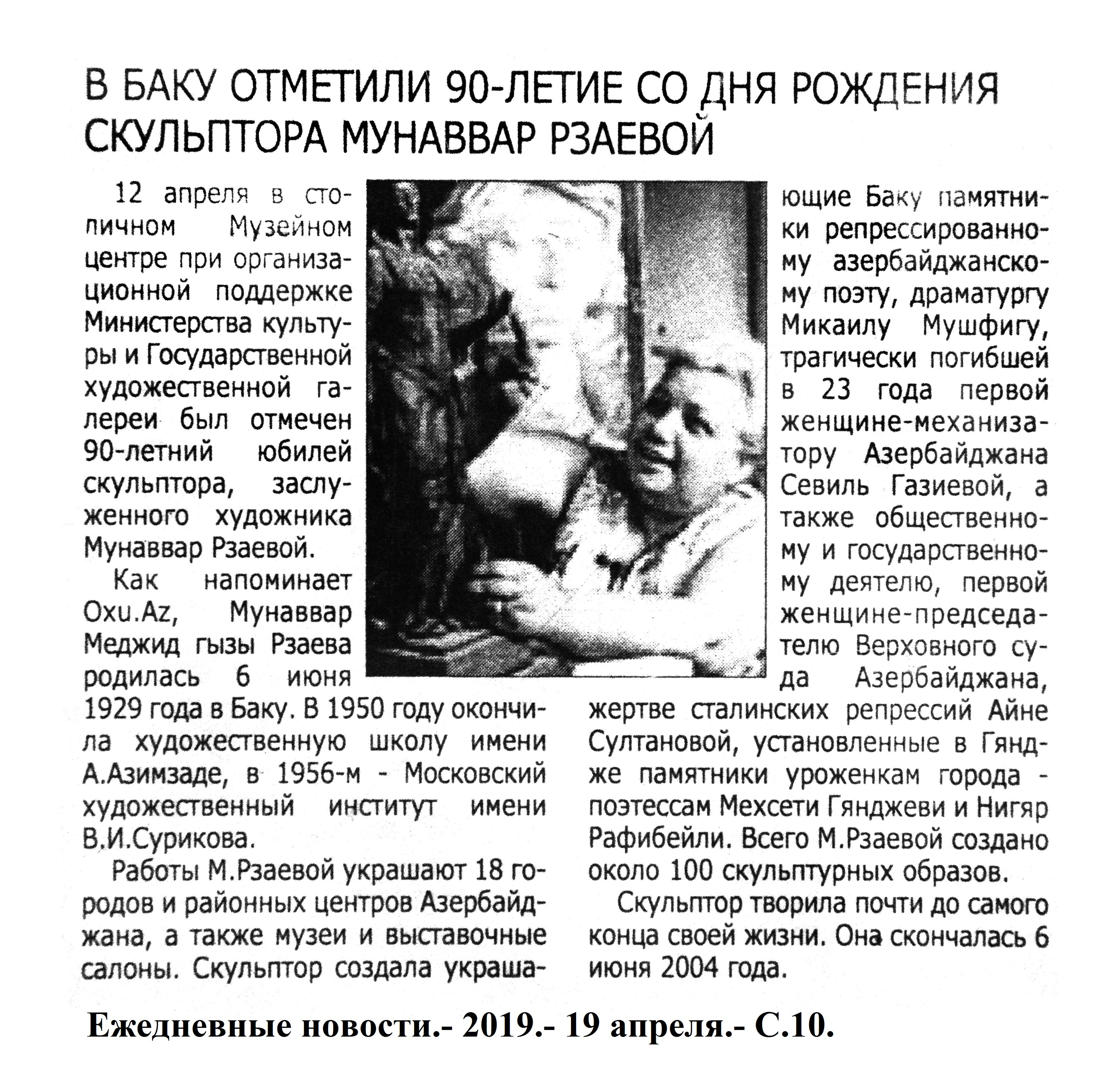 СКУЛЬПТУРА 1203. Ахвердиев, Г. Мастерство, оживляющее камень: Гусейн Ахвердиев: Мне нравится преодолевать проблемы, и это отражено в моих работах: [беседа со скульптором] /провела Р.Аббасова //Каспiй. - 2019.- 13 апреля.- С.16-17. 1204. В Баку отметили 90-летие со дня рождения скульптора Муннавар Рзаевой //Ежедневные новости.- 2019.- 19 апреля.- С.10.