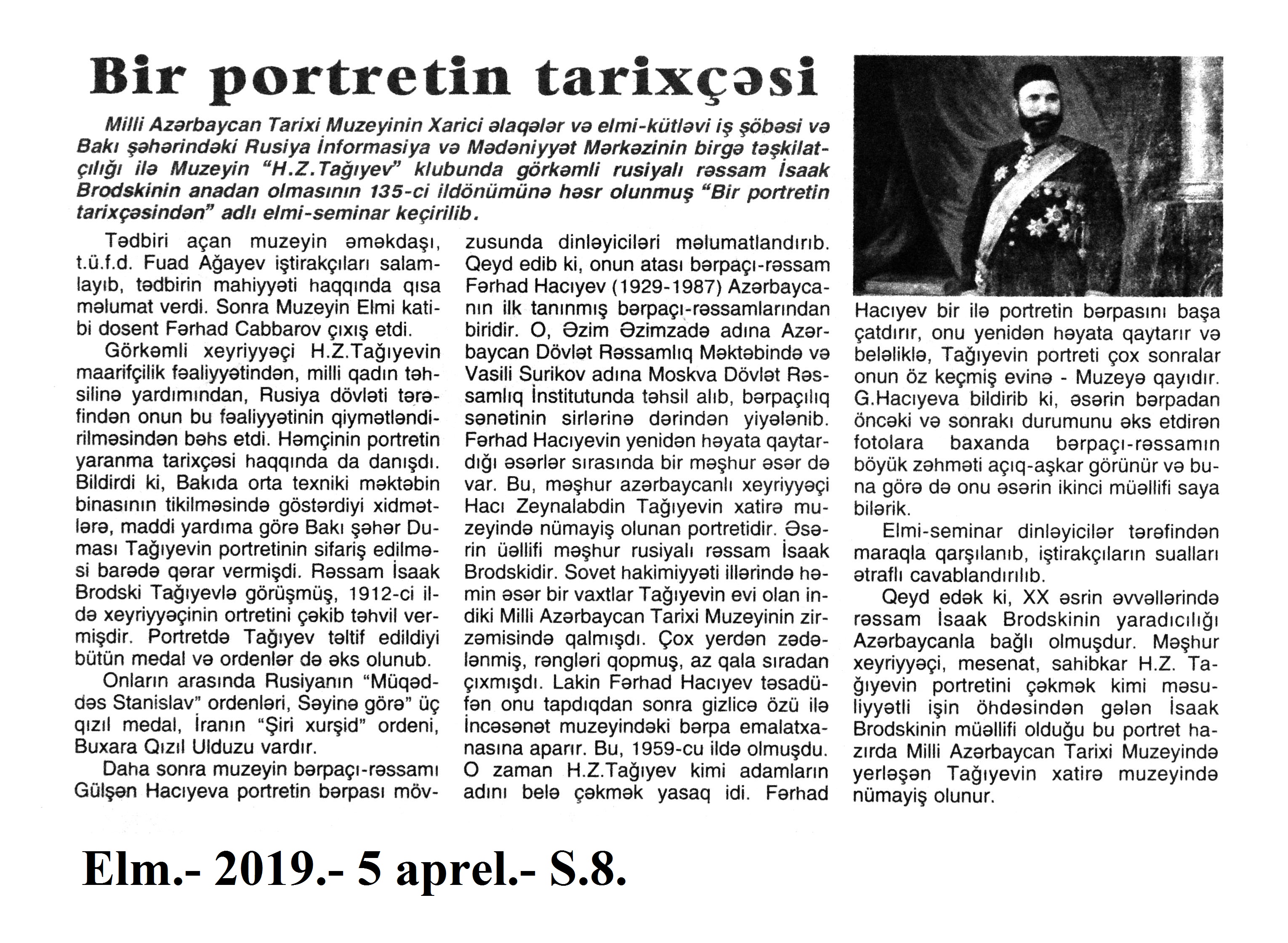 MUZEY İŞİ 170. Tariyel Eybatov: Mingəçevir su ambarının ətrafı “təbiət abidəsi” statusuna layiqdir: [AMEA-nın Təbiət Tarixi Muzeyinin direktoru ilə müsahibə] //Kredo.-2019.- 18 aprel.- S.6;16. 171. Təbiət Tarixi Muzeyi: [Həsən bəy Zərdabi adına muzeyin fəaliyyəti haqqında] //Elm.-2019.- 5 aprel.- S.6.