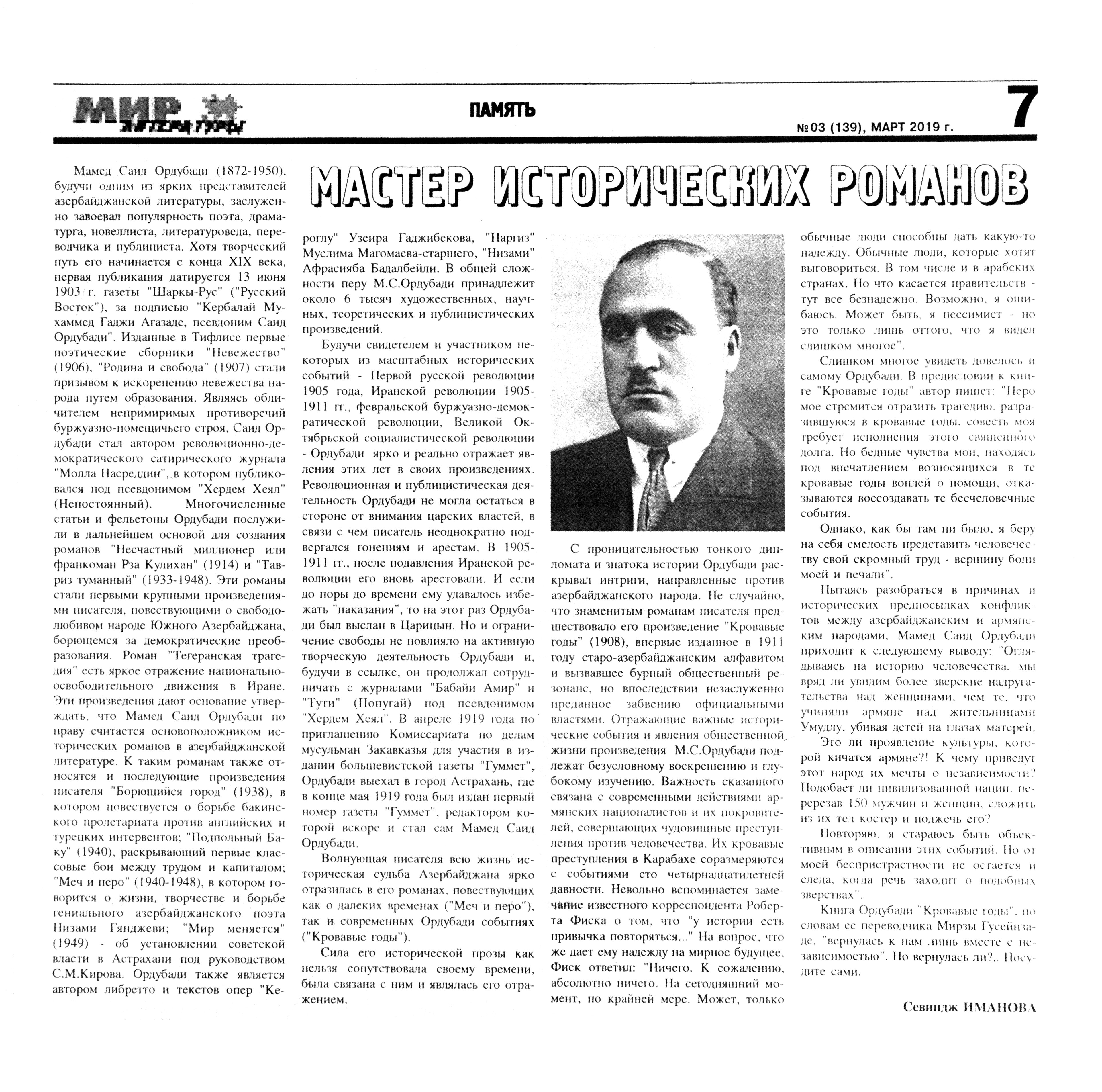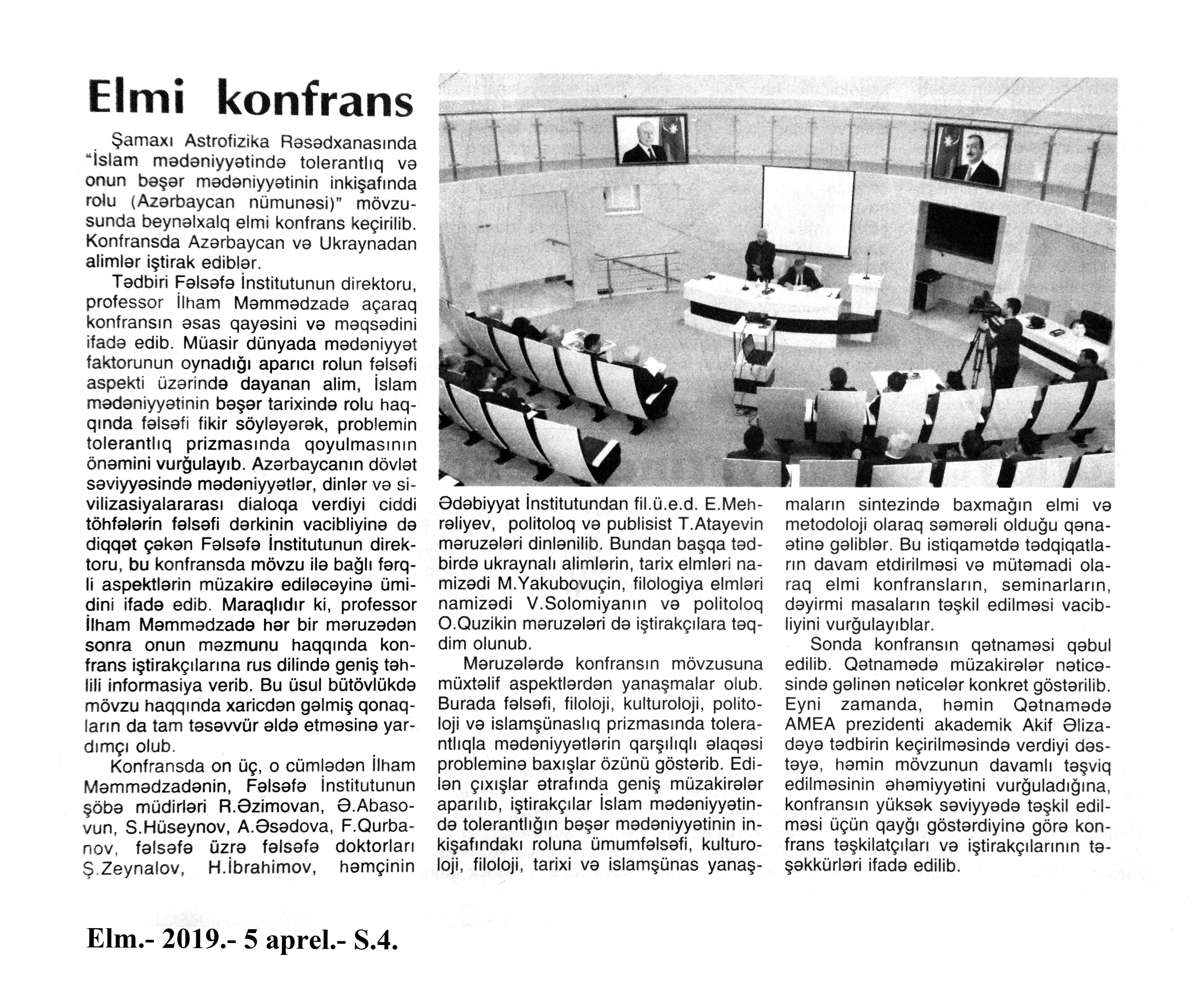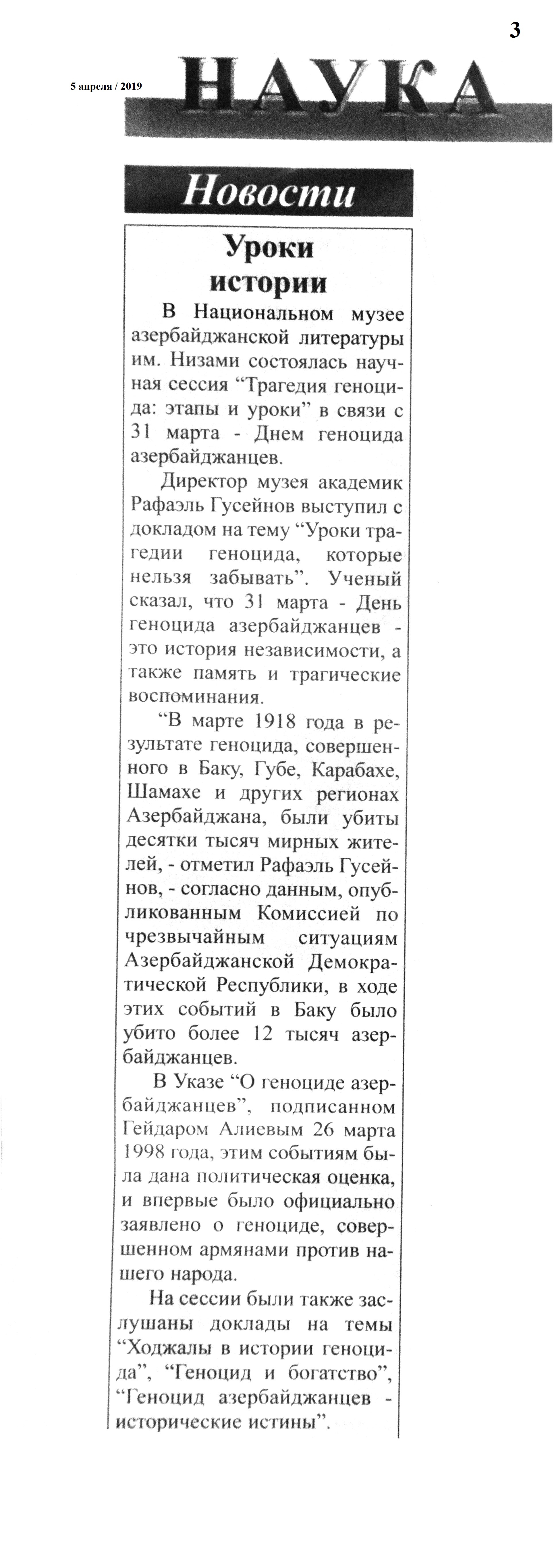 31 mart – Azərbaycanlıların Soyqırımı Günü 73. Azərbaycanlıların soyqırımının 101-ci ildönümü ilə bağlı Quba Soyqırımı Memorial Kompleksində konfrans keçirilib: [Mədəniyyət Nazirliyi, AMEA-nın A.Bakıxanov adına Tarix İnstitutu, Mədəniyyət Nazirliyi yanında Mədəni İrsin Qorunması, İnkişafı və Bərpası üzrə Dövlət Xidməti və Quba Rayon İcra Hakimiyyətinin birgə təşkilatçılığı ilə] //Azərbaycan.- 2019.- 2 aprel.- S.6. 74. Dədə Şəmşiri saz, Kəlbəcəri söz ağladı…: [Sumqayıt Regional Mədəniyyət İdarəsində azərbaycanlıların soyqırımının 101-ci və Kəlbəcərin işğalının 26-cı ildönümünə həsr edilən anım tədbirinin keçirilməsi haqqında] //Mədəniyyət.-2019.- 5 aprel.- S.6.; Ədalət.-2019.- 3 aprel.- S.4. 75. Fərəcov, S. Qan yaddaşımızın musiqi təcəssümü: [Bəstəkarlar İttifaqında keçirilən tədbir haqqında] //Mədəniyyət.-2019.- 3 aprel.- S.4. 76. Gənclər tarixi unutmur: Daş Salnamə Muzeyində maarifləndirici aksiya: [“31 mart 1918-ci il. Tarixi həqiqətlər, gənclər unutmur” adlı maarifləndirici aksiya və anım mərasiminin keçirilməsi haqqında] //Mədəniyyət.-2019.- 10 aprel.- S.7. 77. Hüseynov, F. Qan yaddaşımızın unudulmayacaq səhifəsi: 1918-ci il soyqırımının ildönümü ilə bağlı Quba Soyqırımı Memorial Kompleksində konfrans: [Mədəniyyət naziri Əbülfəs Qarayevin konfransdakı çıxışı haqqında] //Mədəniyyət.-2019.-3 aprel.- S.1;3. 78. “Qanlı dərə” xalqların qanlarının bir-birinə qarışdığı məkandır: [Qusar Dövlət Rəsm Qalereyasında Soyqırımı Gününə həsr edilən rəsm işlərindən ibarət sərgiyə baxış keçirilib] //Mədəniyyət.-2019.- 3 aprel.- S.3. 79. “Qarabağın gözü yolda”: [Beynəlxalq Mətbuat Mərkəzində 31 mart – Azərbaycanlıların Soyqırımı Günü ilə əlaqədar Ümid Aminin hazırladığı eyniadlı filmin təqdimatı haqqında] //Mədəniyyət.- 2019.- 3 aprel.- S.6. 80. Soyqırımının dəhşətləri rəsmlərdə: [Şirvan Dövlət Rəsm Qalereyasında] //Mədəniyyət.-2019.- 3 aprel.- S.4. 81. Sultanova, M. Tarixi həqiqətləri dünyaya çatdırmaq təkcə peşə deyil, həm də vətəndaşlıq borcudur: [Sabir Şahtaxtının bu mövzuya aid fikir və düşüncələri haqqında] //Mədəniyyət.- 2019.- 3 aprel.- S.6. 82. “Vətən harayı” mövzusunda dəyirmi masa: [Məmməd Səid Ordubadinin xatirə muzeyində soyqırımla bağlı keçirilən tədbir haqqında] //Mədəniyyət.- 2019.- 3 aprel.- S.6. 83. Yurdoğlu, E. 1918-ci ilin Mart soyqırımı... Nuru Paşa və Bakı...: Güllü Məmmədovanın “Qan içində işıq” romanı haqqında düşüncələr //525-ci qəzet.-2019.- 5 aprel.- S.11.