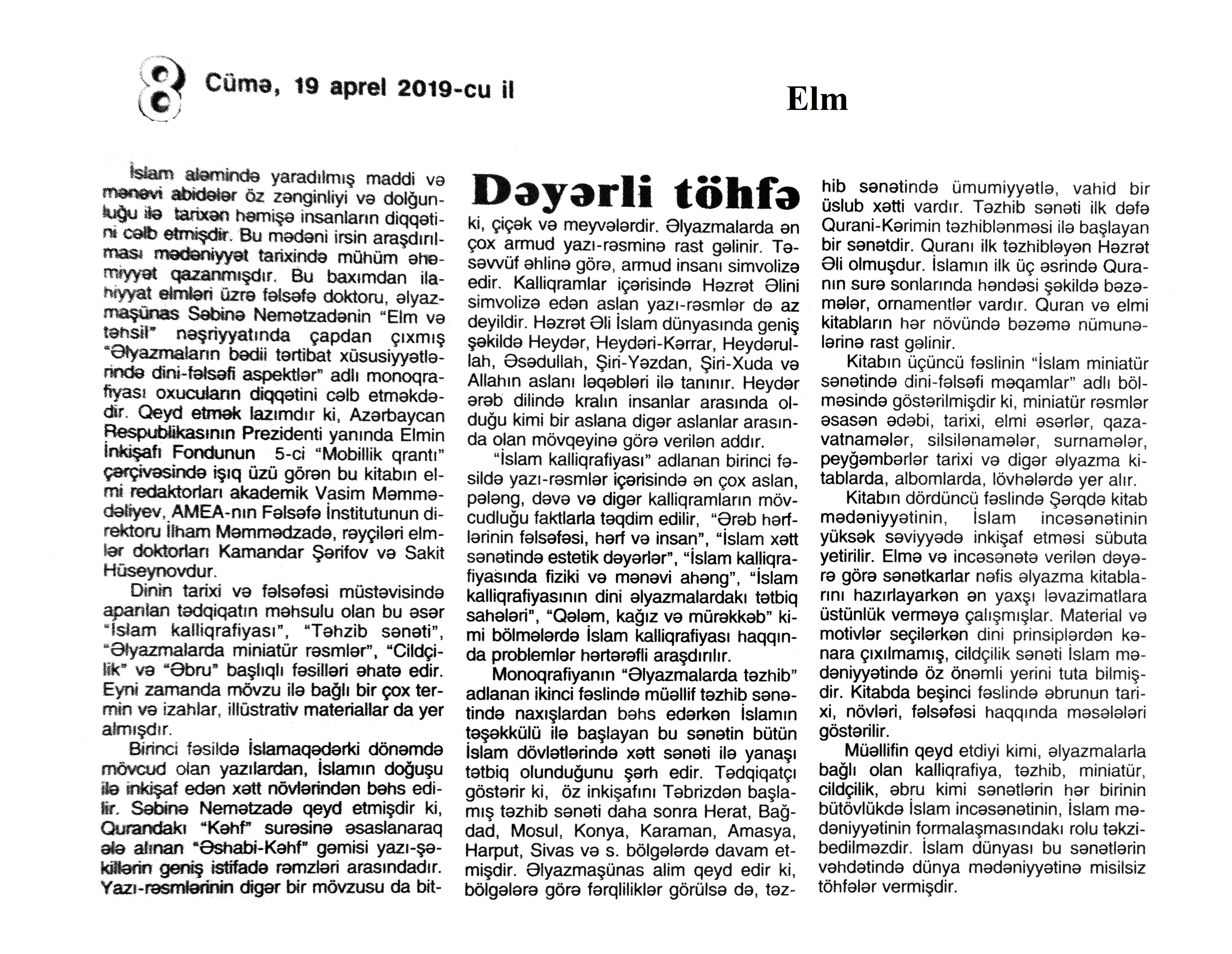 DEKORATİV-TƏTBİQİ İNCƏSƏNƏT 229. Azərbaycan xalçası haqqında kitab ispan dilində nəşr olunub //Mədəniyyət.-2019.- 12 aprel.- S.7. 230. Ələddinqızı, N. Xalçaçılıq sənətinə dövlət dəstəyi gücləndirilir //Səs.-2019.- 5 aprel.- S.-10. 231. Əliyev, S. Qazax xalçasının şöhrətini qaytaranlar: [“Azərxalça” ASC-nin Qazax Rayon filialının fəaliyyəti haqqında] //Azərbaycan.-2019.-11 aprel.- S.11. 232. Əliyev, Z.A. Nadir xalça: [xalçaçı-rəssam Eldar Mikayılzadənin yaradıcılığı haqqında] //Mədəniyyət.-2019.- 26 aprel.- S.7. 233. Xalçaşünaslığa dair məruzə dinlənilib: [AMEA -nın Rəyasət Heyətinin iclasında professor Vidadi Muradovun “Müasir Azərbaycan xalçaşünaslığı: nailiyyətlər və perspektivlər” mövzusunda elmi məruzə ilə çıxış etməsi haqqında] //Mədəniyyət.-2019.- 5 aprel.- S.3. 234. MDU-da Azərbaycan xalçası haqqında mühazirə: [Moskvada “Məkanın harmoniyası: Azərbaycanın ənənəvi incəsənəti” adlı sərginin açılışı çərçivəsində] //Mədəniyyət.-2019.- 17 aprel.- S.8. 235. Misgərlik: Qədim xalq sənəti: [misgərlik sənəti haqqında] //Azərbaycan.-2019.- 7 aprel.- S. 7. 236. Salamzadə, Ə. Cənub bölgəsinin əlvan rəngləri: Tarix elmləri doktoru, professor Vidadi Muradovun yeni kitabı barədə düşüncələr: [“Lənkəran-Astara bölgəsi: tarixi və xalçaçılığı” adlı kitabında Azərbaycan xalça sənətinin, milli tarixin və xalq məişətinin dərindən öyrənilməsi haqqında] //Mədəniyyət.-2019.- 24 aprel.- S.6. 237. Turan, T. “İndi milli papaqlarımızı daha çox turistlər alır”: [papaqçı Şamil kişi haqqında] //Həftə içi.-2019.- 24 aprel- S.7. 238. Turan, T. Prezident onun ailəsi üçün hazırladığım sərnici çox bəyəndi: [misgər Kərbalayı İlham Əliyev haqqında] //Həftə içi.-2019.- 23 aprel- S.7.