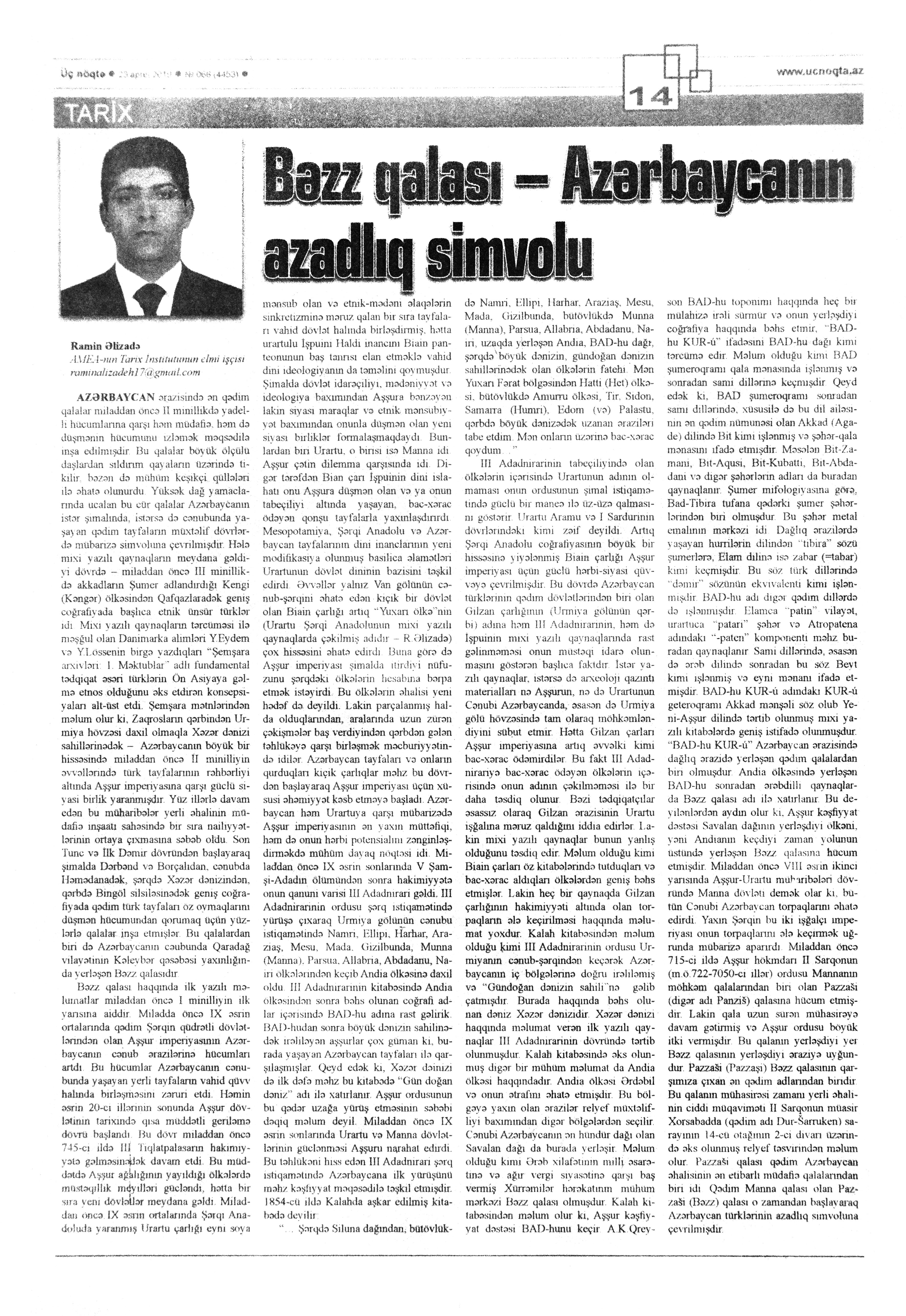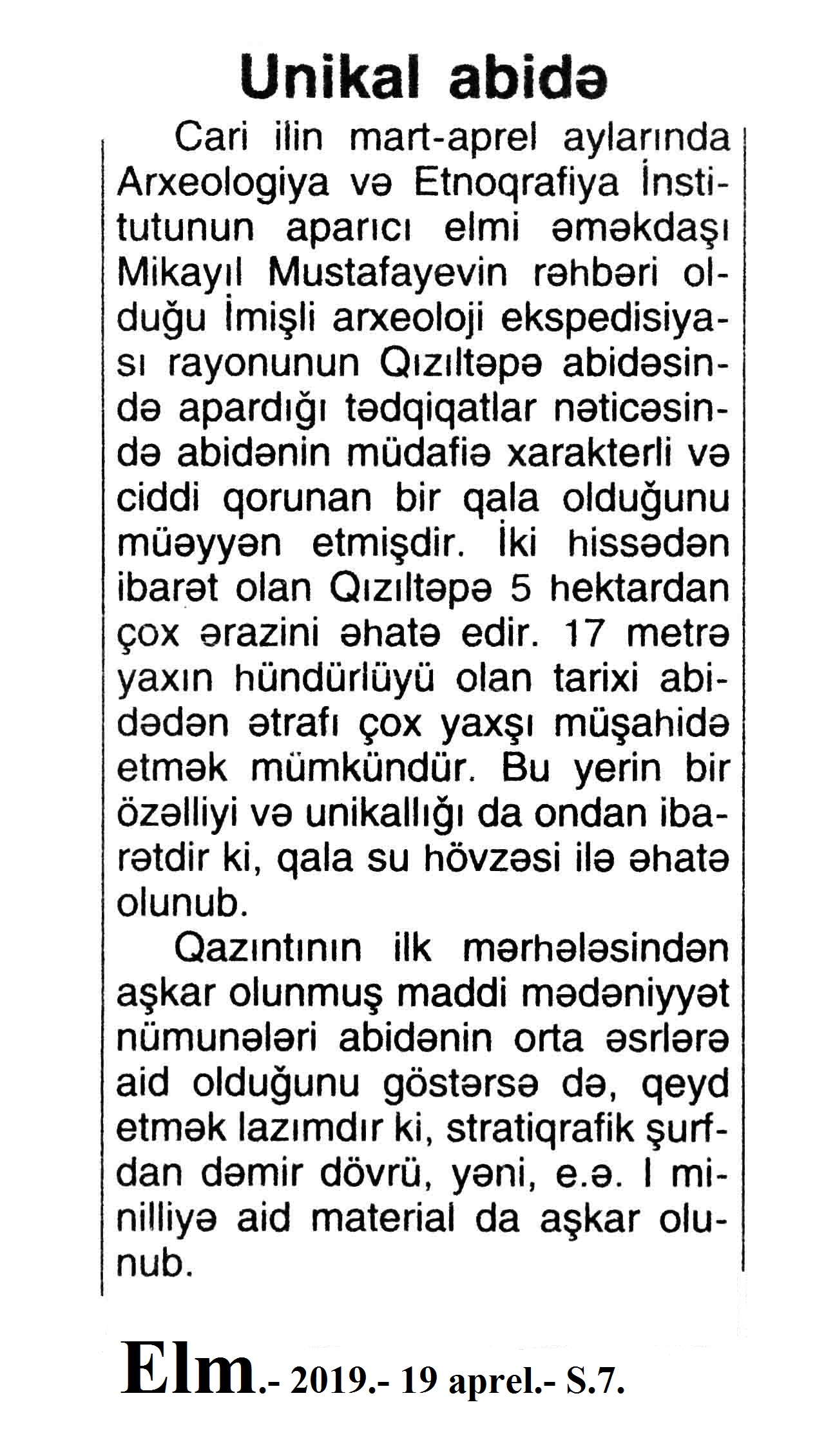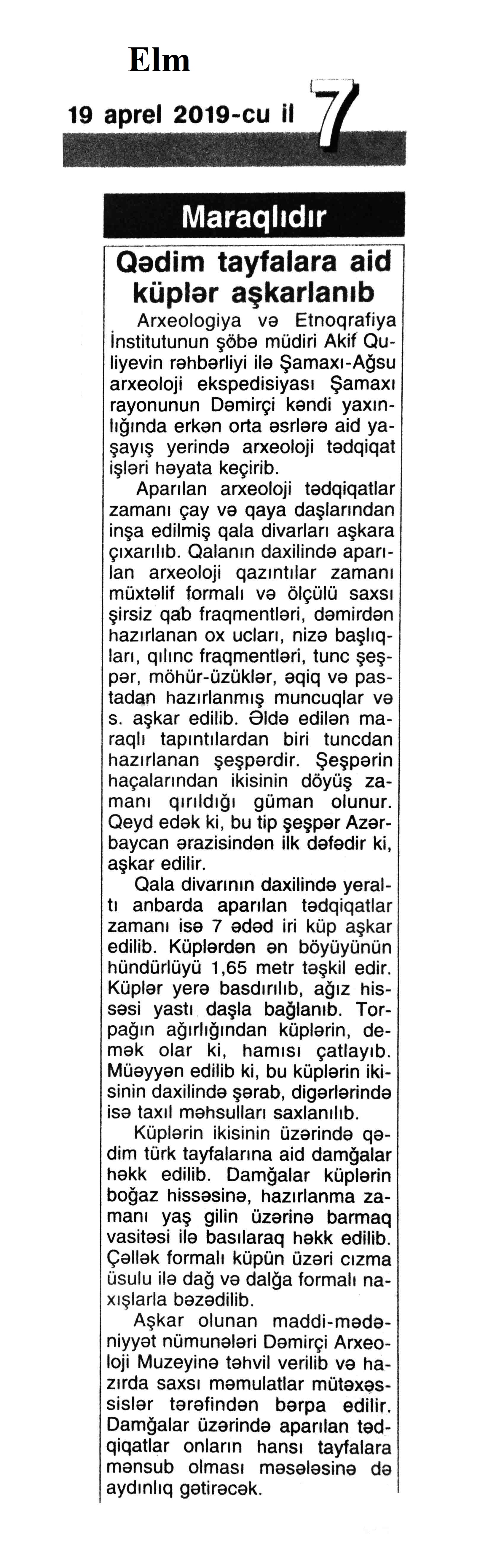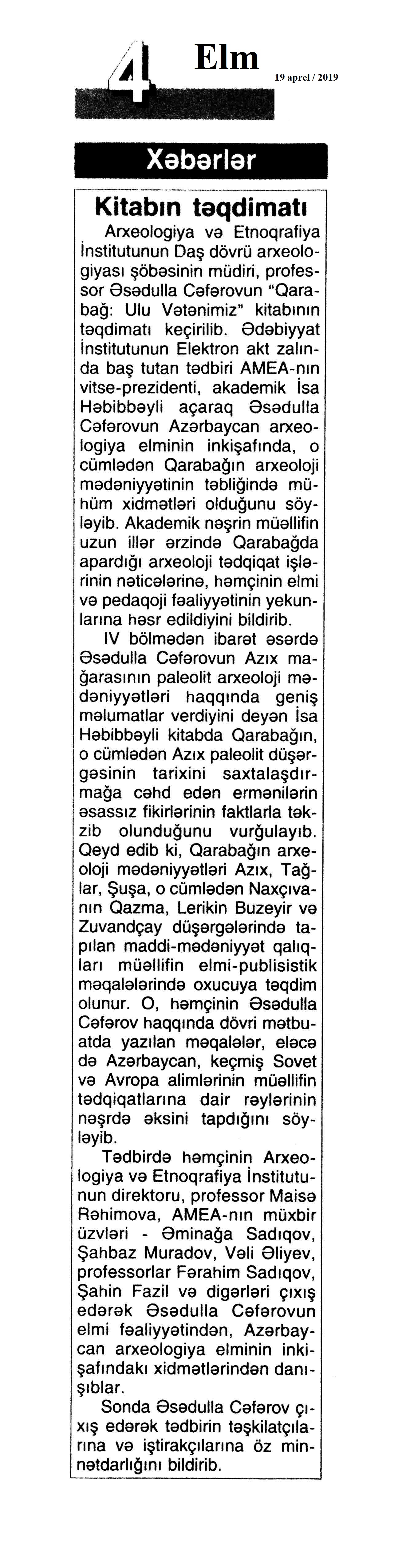 TARİX VƏ MƏDƏNİYYƏT ABİDƏLƏRİ 172. Azadi, S. Minlərlə tarix və arxeoloji abidələrimiz erməni vandalizminin qurbanıdır //İki sahil.-2019.- 18 aprel.- S.17. 173. Birinci vitse-prezident: Bir daşa da ziyan dəyməməlidir: [Mehriban Əliyeva “İçərişəhər” Dövlət Tarix-Memarlıq Qoruğunda görülən işlərlə tanış olub] //Azərbaycan.-2019.-27 aprel.- S.1; 3. 174. Danışan tarix: [ölkəmizin memarlıq abidələri haqqında] //Azərbaycan.-2019.- 18 aprel.- S. 7. 175. Əfəndiyev, P. Bəzz qalası-Azərbaycanın azadlıq simvolu: [AMEA -nın Tarix İnstitutunun elmi işçisi Ramin Əlizadənin söylədiklər] //Üç nöqtə.-2019.- 23 aprel.- S.14. 176. Əliyeva, M. Tarixi abidələr əcdadlarımızın nəsillərə əmanətidir //Respublika.-2019.- 18 aprel.- S.7. 177. Fətəliyev, R. Çıraqqala qala biləcəkmi?: [Şabran rayonunda yerləşən eyniadlı tarixi abidənin mühafizəsi haqqında] //Elm.-2019.- 5 aprel.- S.7. 178. Həmidov, H. Azərbaycanın milli ədəbi-mədəni abidələrinə erməni təcavüzü //Xalq qəzeti.-2019.- 24 aprel.- S.6. 179. Hüseynov, F. “Bu yaz özün bir təbiət yarat”: Qobustan Milli Tarix-Bədii Qoruğunda ağacəkmə aksiyası //Mədəniyyət.- 2019.- 17 aprel.- S.4. 180. İbrahimov, K. Multan karvansarası: Bura Azərbaycan-Hindistan mədəni-iqtisadi əlaqələrində mühüm rol oynamışdır: [İçərişəhərdə yerləşən XIV əsrə aid tarixi memarlıq abidəsi haqqında] //Azərbaycan.-2019.- 18 aprel.- S. 7. 181. Kitabın təqdimatı: [Əsədulla Cəfərovun “Qarabağ. Ulu vətənimiz” kitabının təqdimatı haqqında] //Elm.- 2019.- 19 aprel.- S.4. 182. Qədim tayfalara aid küplər aşkarlanıb: [Şamaxı rayonun Dəmirçi kəndi yaxınlığında yerləşən arxeoloji abidədə aparılan tədqiqatlar haqqında] //Elm.- 2019.- 19 aprel.- S.7. 183. Lələdağ, Ə.M. Yalan ayaq tutsa da...: [erməni vəhşilikləri haqqında ziyalıların söylədikləri] //Ədalət.- 2019.- 20 aprel.- S.5. 184. Mədətoğlu, Ə. Qaraköpəktəpə: [Füzuli rayonu ərazisində yerləşən eyniadlı abidə haqqında] //Ədalət.-2019.- 24 aprel.- S.7. 185. Mədətoğlu, Ə. Qaraköpəktəpə: [Füzuli rayonu ərazisində yerləşən eyniadlı abidə haqqında] //Ədalət.-2019.- 25 aprel.- S.7. 186. Mərdəkan qalası və Tuba Şah məscidinin bərpasına başlanılacaq //Xalq qəzeti.- 2019.- 25 aprel.- S.6. 187. Nərimanoğlu, M. Daşlaşmış yadigarlar: İşğal altında qalan Azərbaycanın maddi mədəniyyət nümunələri də erməni vandalizmi siyasətinin qurbanlarına çevrilib //Azərbaycan.-2019.- 18 aprel.- S. 7. 188. Nərimanoğlu, M. Tarix və mədəniyyətin qovuşduğu məkan: İçərişəhər: [İçərişəhərdə yerləşən tarixi -mədəni abidələr haqqında] //Azərbaycan.-2019.- 3 aprel.- S.10. 189. Salmanlı, R. İçərişəhər dövlət səviyyəsində qorunur və lazımi qayğı göstərilir: Mehriban Əliyeva: İçərişəhər bütün Azərbaycan üçün, bizim bütün vətəndaşlarımız üçün çox doğma və əziz yerdir: [Birinci vitse-prezident Mehriban Əliyeva “İçərişəhər” Dövlət Tarix-Memarlıq Qoruğunda görülən işlərlə tanış olub] //Azərbaycan.-2019.-30 aprel.- S.1; 4. 190. Sarıyeva, İ. Qarabağda ermənilərin “mədəniyyət vandalizmi”nə amerikalı ekspertdən sərrast zərbə-Bakının ortasında 5 min kitabı olan erməni kilsəsi..: [beynəlxalq jurnalist, politoloq Piter Teysin söylədikləri] //Bakı Xəbər.-2019.- 5 aprel.- S.10. 191. Seyidov, T. Şamaxıda qədim dövrə aid tuncdan hazırlanan şeşpər tapılıb //Azad Azərbaycan.-2019.- 13 aprel.- S.5. 192. Səlimov, Ə. Kiş Alban məbədi: Bu abidə indi əcnəbi turistlərin daha çox ziyarət etdikləri məkana çevrilib //Azərbaycan.-2019.-7 aprel.- S.8. 193. Unikal abidə: [İmişli rayonundakı Qızıltəpə abidəsində aparılan tədqiqatlar haqqında] //Elm.- 2019.- 19 aprel.- S.7. 194. Zaman, E. İçərişəhər xalqımızın müqəddəs tarixi kimi qorunur //İki sahil.-2019.- 26 aprel.- S.11.