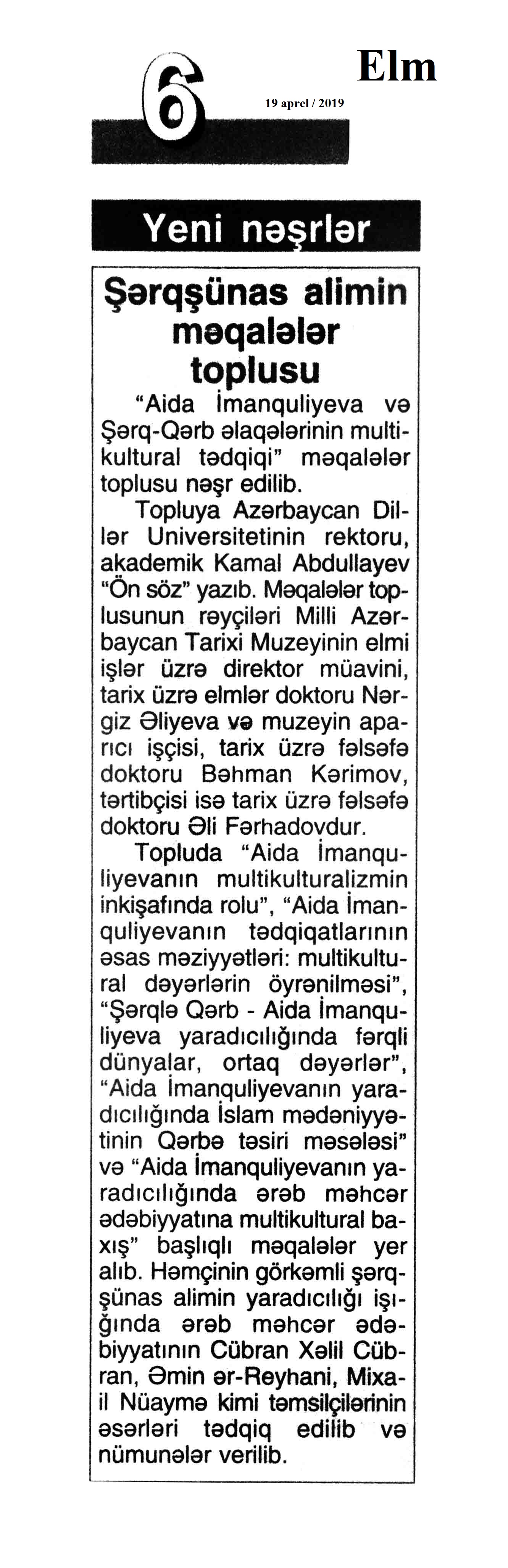 Multikulturalizm 89. Axundova, S. Azərbaycan multikulturalizm və tolerantlığın mərkəzidir //Azərbaycan müəllimi.- 2019.- 19 aprel.- S.12. 90. Etibar Nəcəfov: ATƏT Avropada multikulturalizmi təşviq etmək üçün əlindən gələni etməlidir: [Vyanada “Tolerantlıq və qeyri-ayrı-seçkilik prinsiplərinin qorunması, o cümlədən din və ya etiqad azadlığının təşviqi və müdafiəsi” mövzusunda insan ölçüsü üzrə birinci əlavə görüşdə Azərbaycanı Prezidenti Administrasiyasının millətlərarası münasibətlər, multikulturalizm və dini məsələlər şöbəsinin müdiri Etibar Nəcəfov təmsil edib] //Azərbaycan.-2019.- 3 aprel.- S.7. 91. Əliyev, İ.H. Azərbaycanın pravoslav xristian icmasına: [müqəddəs Pasxa bayramı münasibətilə təbrik məktubu] //Azərbaycan.-2019. -27 aprel.- S.4. 92. Qubada yaşayan dağ yəhudilərinin Pesax bayramı //Mədəniyyət.-2019.- 26 aprel.- S.3. 93. Şərqşünas alimin məqalələr toplusu: [“Aida İmanquliyeva və Şərq-Qərb əlaqələrinin multikultural tədqiqi” toplusu haqqında] //Elm.- 2019.- 19 aprel.- S.6.