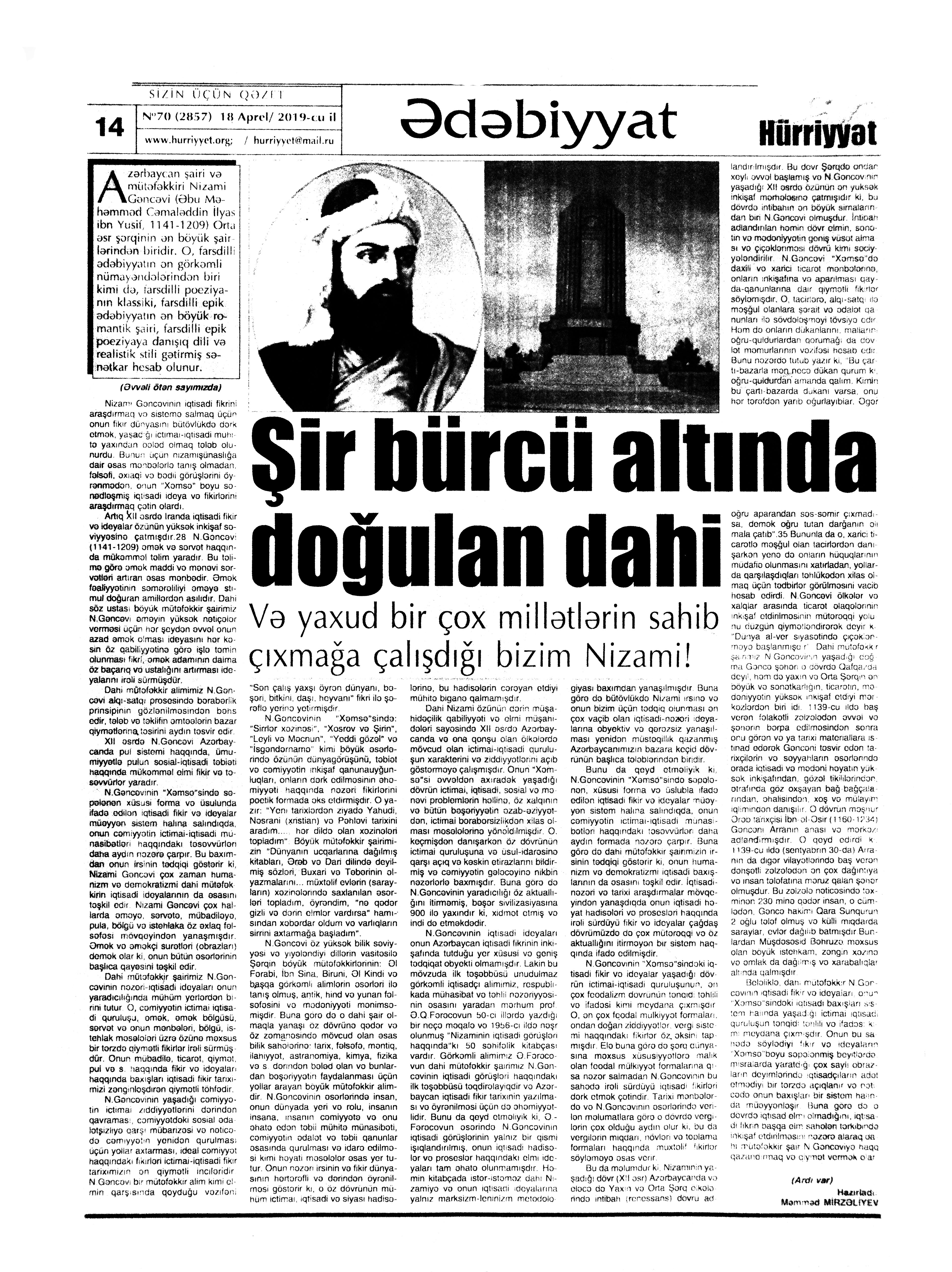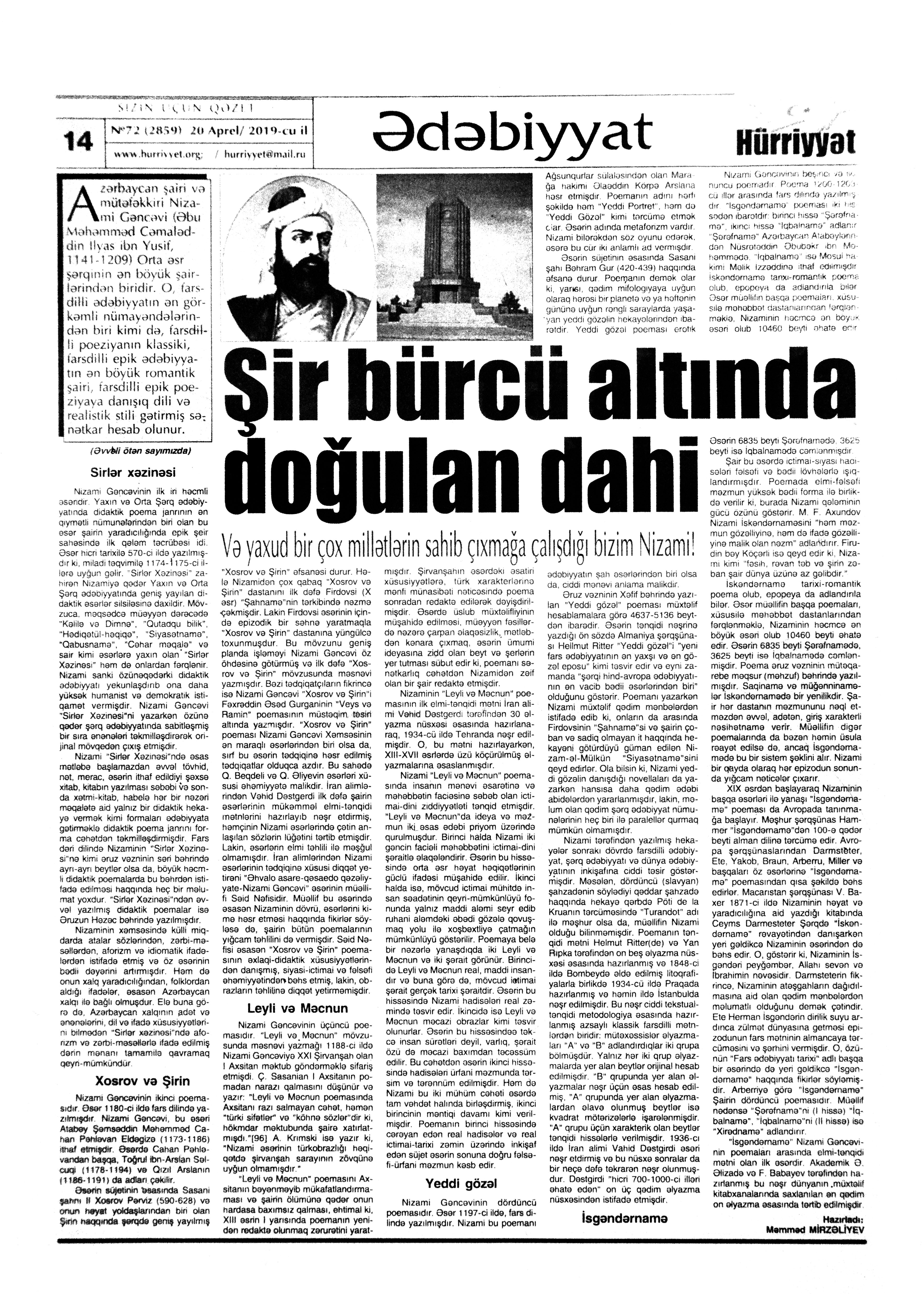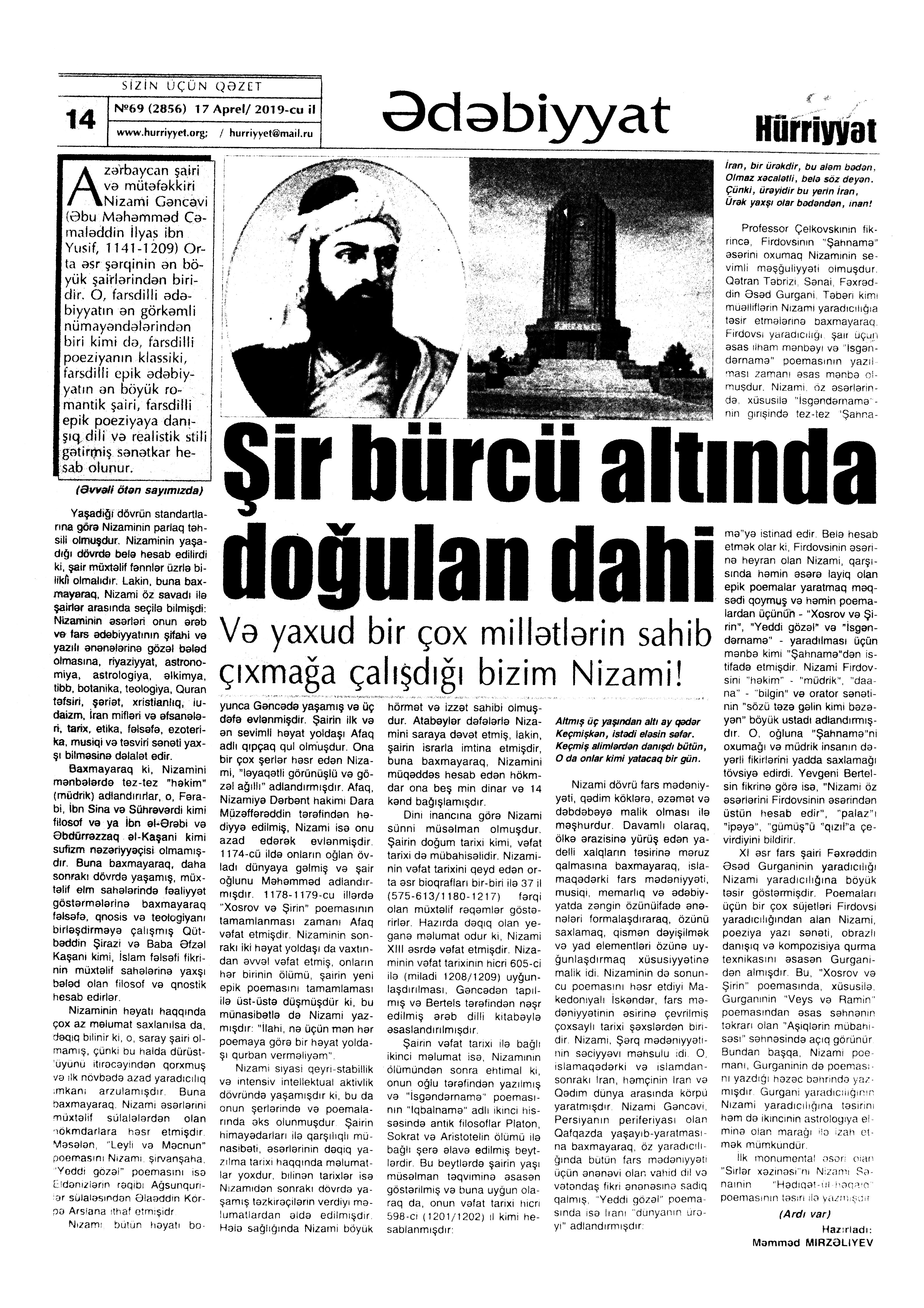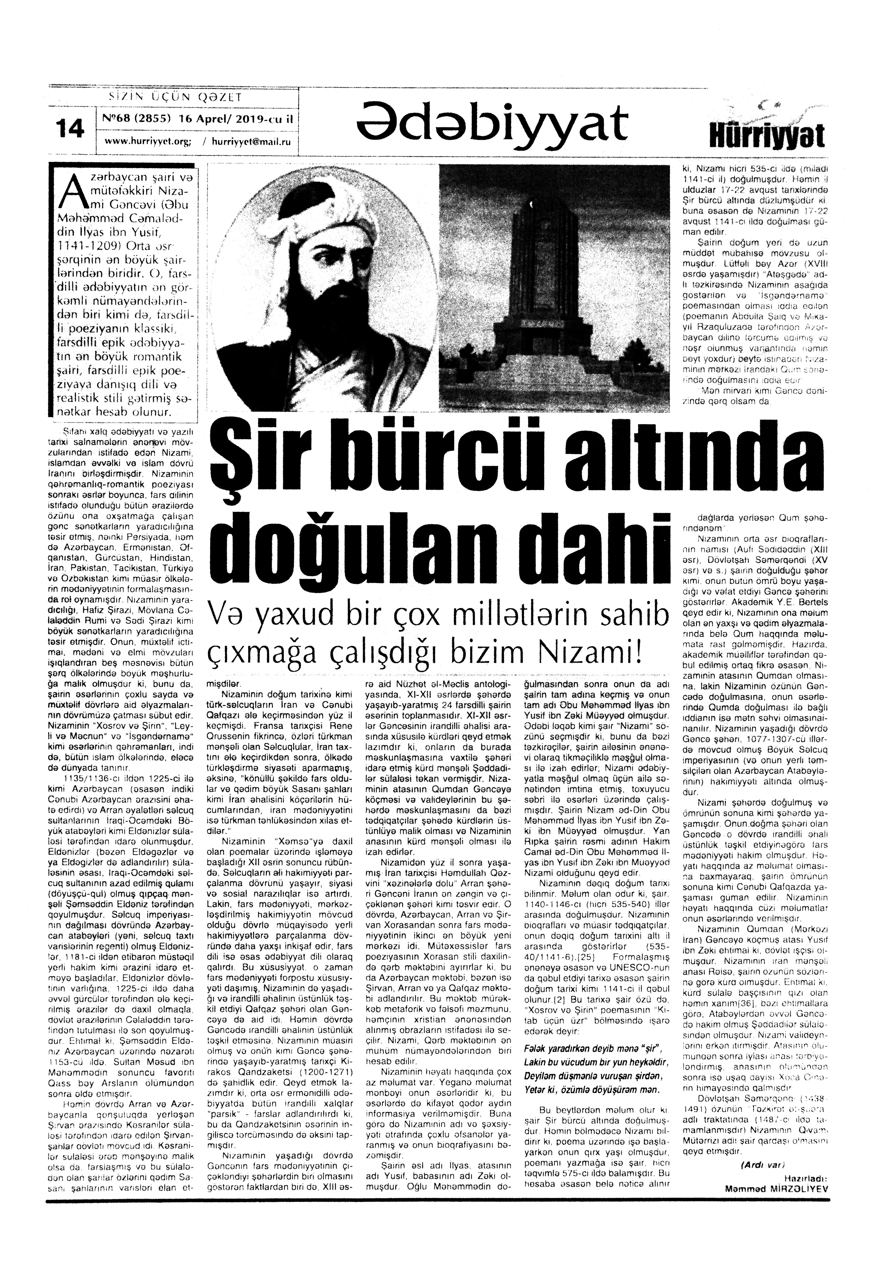 Nizami Gəncəvi – vəfatının 810 illiyi 847. Quluzadə, M. Nizaminin yubileyi: (Boyük azərbaycanlı Heydər Əliyevə ithaf): sənədli hekayə //İki sahil.-2019.- 26 aprel.- S. 12. 848. Quluzadə, M. Nizaminin yubileyi: (Boyük azərbaycanlı Heydər Əliyevə ithaf): sənədli hekayə //İki sahil.- 2019.- 27 aprel.- S.15. 849. Mirzəliyev, M. Şir bürcü altında doğulan dahi: Və yaxud bir çox millətlərin sahib çıxmağa çalışdığı bizim Nizami!: [dahi şairimiz haqqında] //Hürriyyət.- 2019.- 16 aprel.- S.14. 850. Mirzəliyev, M. Şir bürcü altında doğulan dahi: Və yaxud bir çox millətlərin sahib çıxmağa çalışdığı bizim Nizami! //Hürriyyət.- 2019.- 17 aprel.- S.14. 851. Mirzəliyev, M. Şir bürcü altında doğulan dahi: Və yaxud bir çox millətlərin sahib çıxmağa çalışdığı bizim Nizami! //Hürriyyət.- 2019.- 18 aprel.- S.14. 852. Mirzəliyev, M. Şir bürcü altında doğulan dahi: Və yaxud bir çox millətlərin sahib çıxmağa çalışdığı bizim Nizami! //Hürriyyət.- 2019.- 20 aprel.- S.14. 853. Nizami Gəncəvi yaradıcılığına ilk elmi münasibət //525-ci qəzet.- 2019.- 26 aprel.- S.12-13. 854. Nizami Gəncəvinin “Sirlər xəzinəsi” poemasına həsr olunan 10 cildlik Siracəddin Hacının təqdimatında //Ədəbiyyat qəzeti.- 2019.- 13 aprel.- S.32. 855. Ülvi, A. Şeyx Nizami Gəncəvinin hikmətləri sehrində: [Siracəddin Hacının “Həzrət Nizami Gəncəvinin yaradıcılığında peyğəmbərlik anlayışı və həzrət Məhəmməd” kitabı haqqında] //525-ci qəzet.- 2019.- 17 aprel.- S.18.