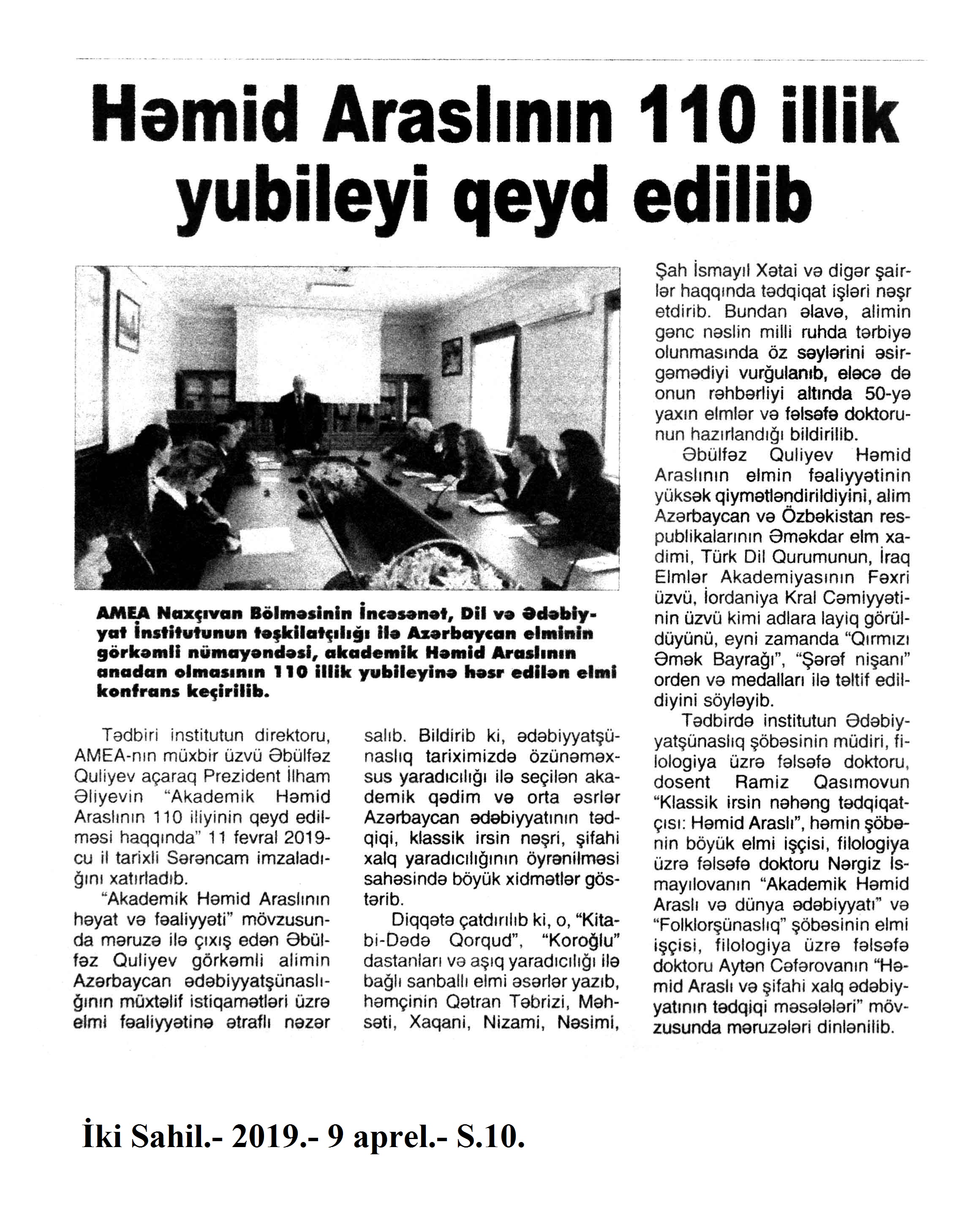 Həmid Araslı – 110 972. Alışanlı, Ş. Klassikləri oxumağın Həmid Araslı dərsləri: Elm xadimləri //Azərbaycan.- 2019.- 21 aprel.- S.6. 973. Əsgərli, Ə. Həmid Araslı və türk-müsəlman xalqları ədəbiyyatı //Respublika.- 2019.- 21 aprel.- S.5. 974. Həmid Araslının 110 illik yubileyi qeyd edilib: [AMEA-nın Naxcıvan Bölməsində] //İki sahil.- 2019.- 9 aprel.- S. 10. 975. Müşfiq, Ş. “Azərbaycan və Şərq ədəbiyyatlarının yorulmaz tədqiqatçısı”: Akademik Həmid Araslı Şərqşünaslıq İnstitutunda elmi konfransla yad edildi //525-ci qəzet.- 2019.- 20 aprel.- S. 13. 976. Şahanə. Həmid Araslının 110 illiyi ilə bağlı sərgi: [Mərkəzi Elmi Kitabxanada] //525-ci qəzet.-2019.- 5 aprel.- S.8.