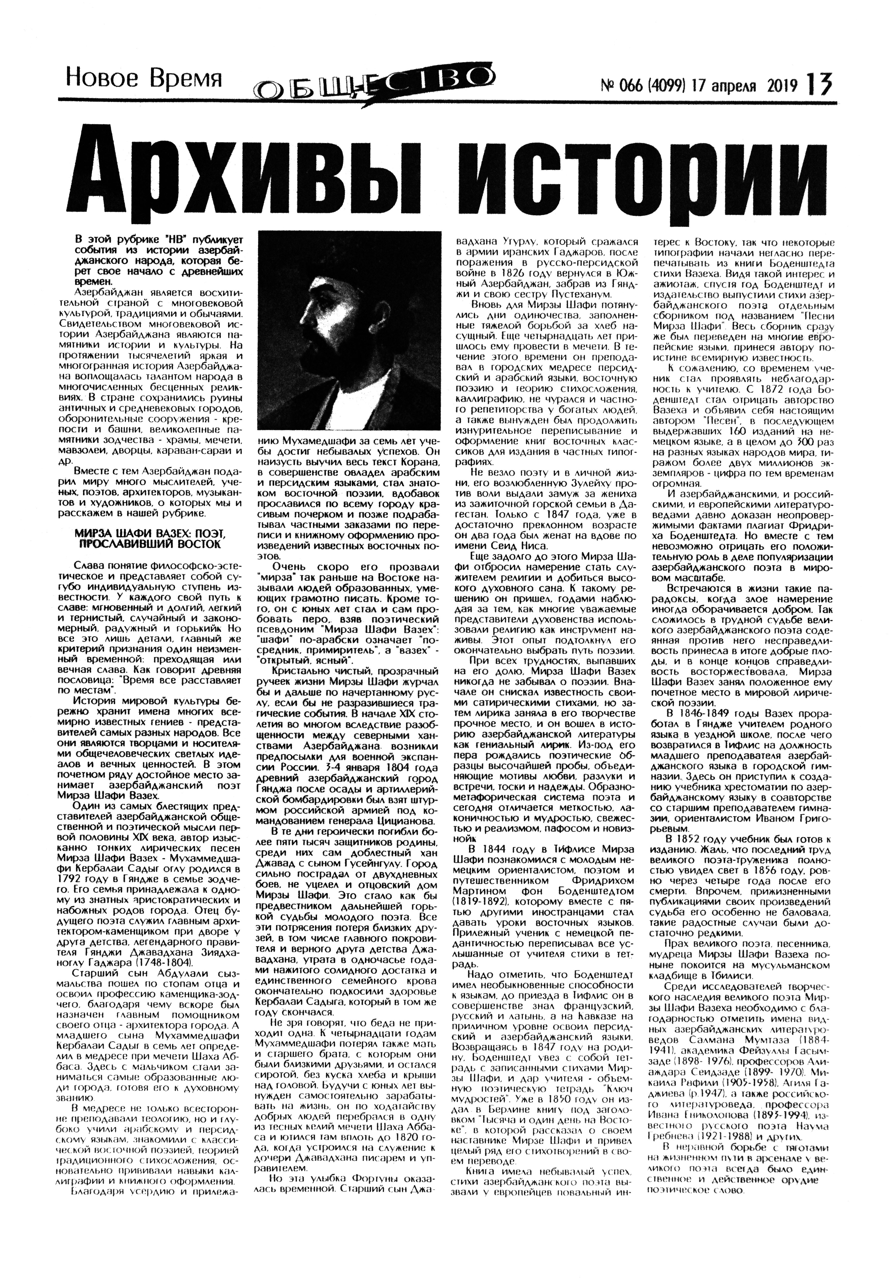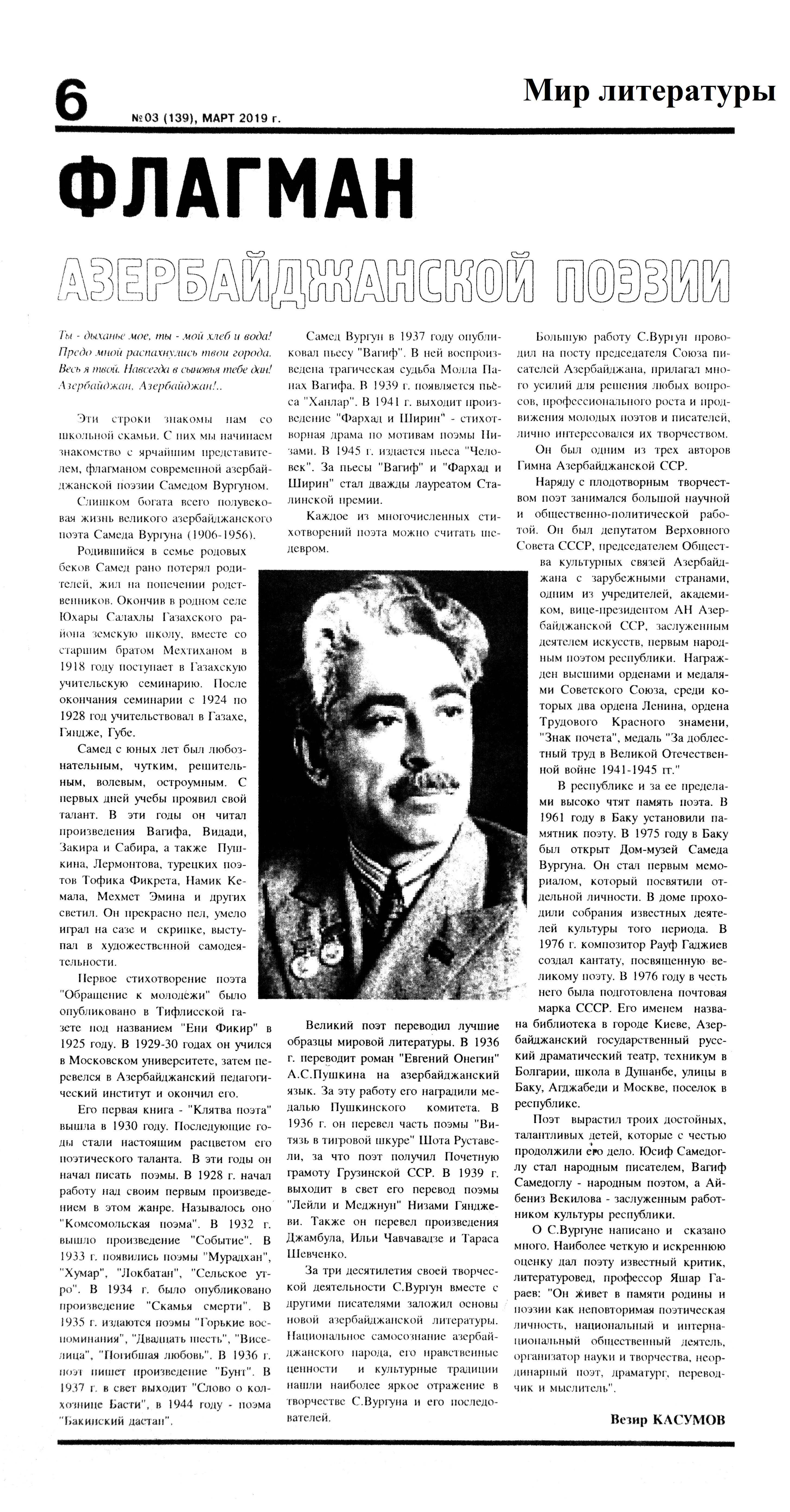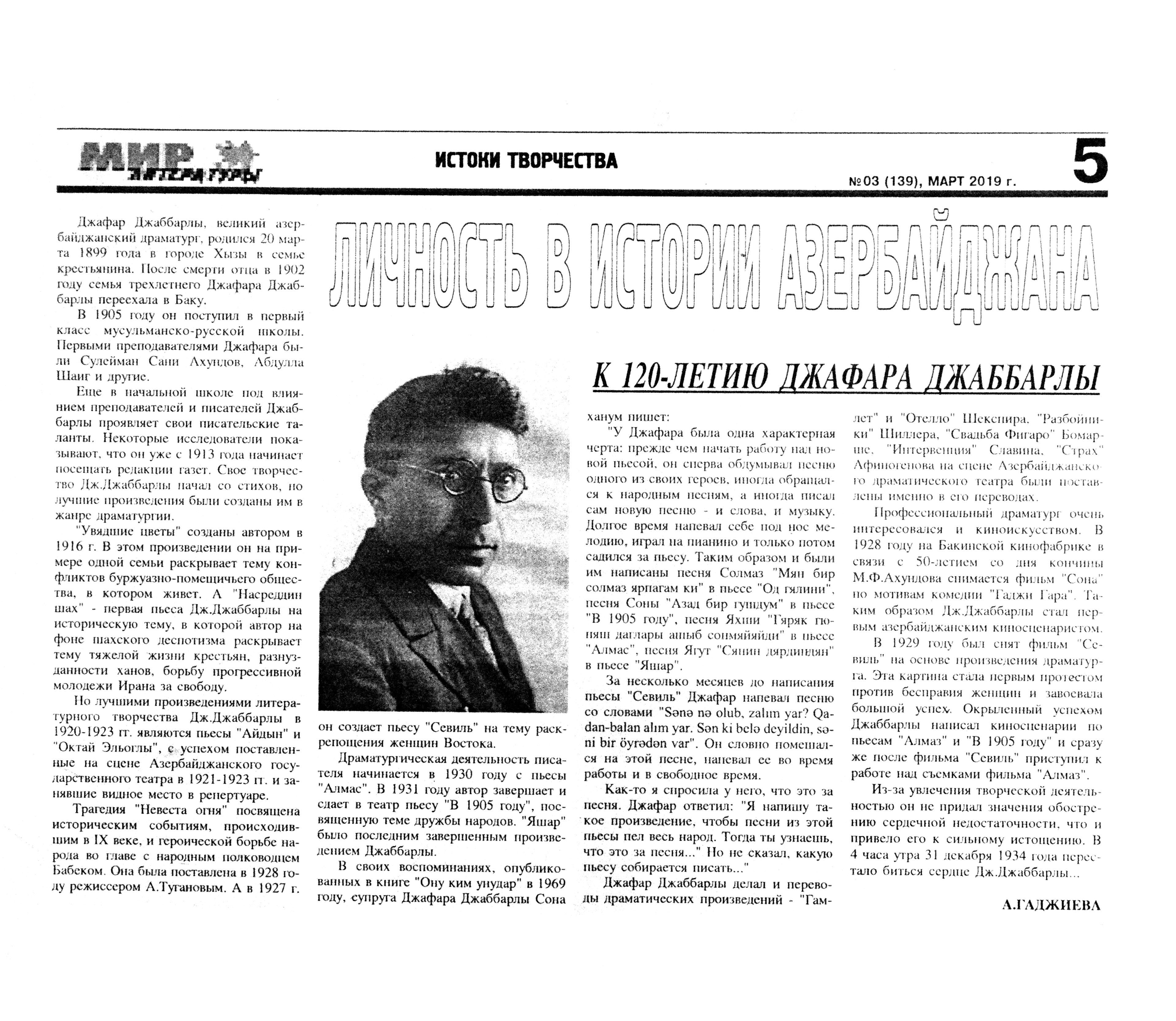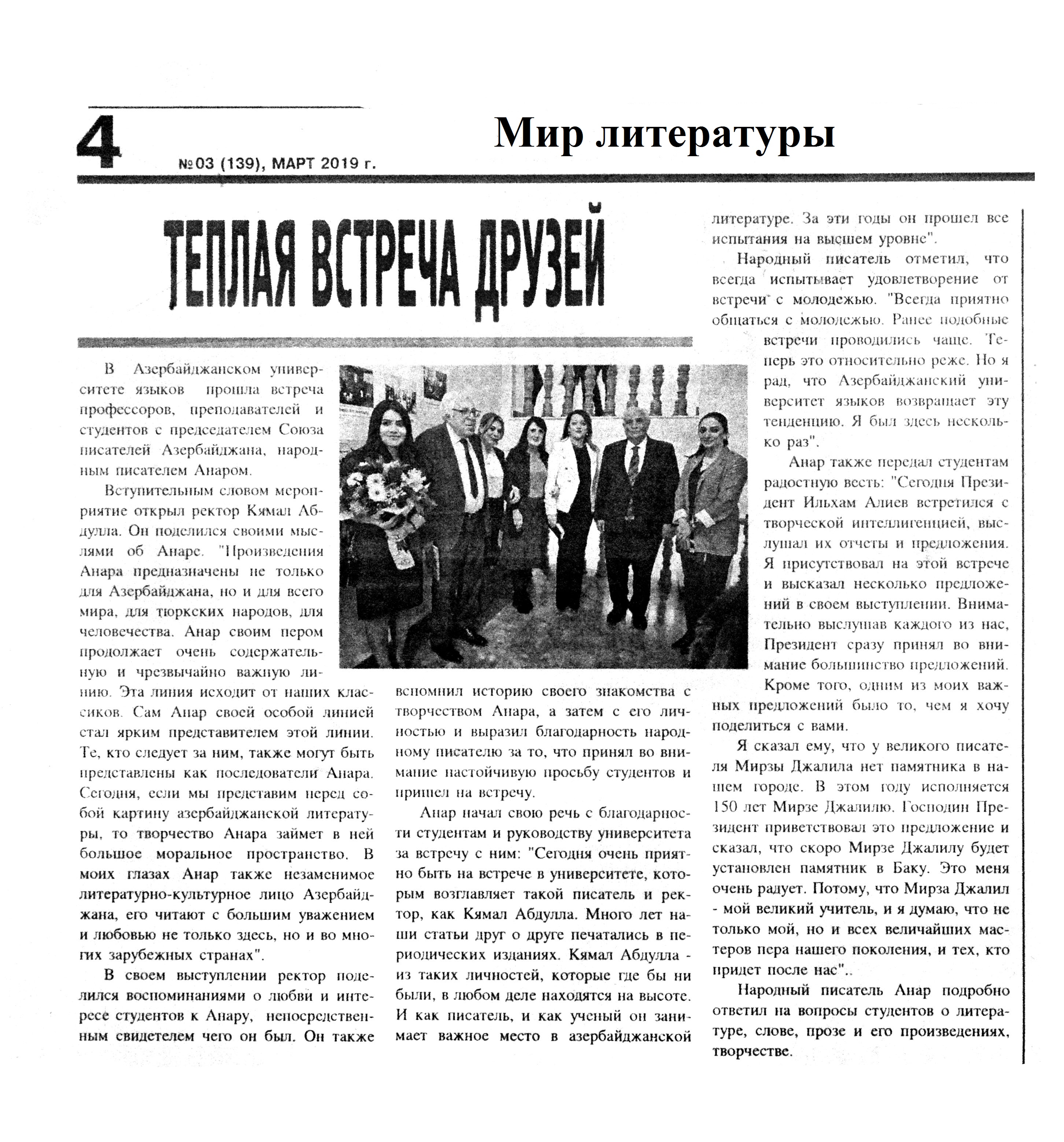ЛИТЕРАТУРОВЕДЕНИЕ И ЛИТЕРАТУРНАЯ КРИТИКА 1256. Абаскулиева, Э. Такая короткая долгая жизнь: Увидела свет вторая книга из серии «Шехиды не умирают, Родина неделима»: [о презентации книги Фариды Рагимли в Национальной Библиотеке] //Азербайджанские известия.- 2019.-25 апреля.- С.3. 1257. Алиева, С. Изучая наследие великих: Академик Араслы систематизировал и создал полную картину истории азербайджанской литературы //Каспiй.- 2019.- 5 апреля.- С.12. 1258. Архивы истории: Мирза Шафи Вазех: Поэт, прославивший восток //Новое время. - 2019.- 17 апреля.- С.13. 1259. Ахундова, Э. Переводчик со Знаком Качества: К юбилею Азера Мустафазаде //Каспiй. - 2019.- 6 апреля.- С.12. 1260. Бахшалиева, Г. Мы азербайджанцы, и этим все сказано: Гевхар Бахшалиева: Война - кровь, горе и слезы матерей, но уступить свои территории мы не можем…: [беседа с доктором филологии] /провел С.Баят //Каспiй. - 2019.- 6 апреля.- С.9. 1261. В Анкаре состоялась презентация трехтомника народного писателя Эльмиры Ахундовой о великом лидере Гейдаре Алиеве //Бакинский рабочий. - 2019.- 17 апреля.- С. 2. 1262. В Тбилиси грузинским читателям представлена книга «Манифест молодого человека» Мир Джалала Пашаева //Бакинский рабочий. - 2019.- 24 апреля.- С. 3. 1263. Великое наследие: Гусейн Джавид и мировая литература: [одноименная конференция в Университете Языков] //Каспiй. - 2019.- 13 апреля.- С.11. 1264. Вклад в языкознание: Абдулазал Демирчизаде - 110 //Каспiй. - 2019.- 6 апреля.- С.12. 1265. Гаджиева, Л. Бакинские известия: Первая официальная газета столицы //Каспiй. - 2019.- 6 апреля.- С.18-19. 1266. Гаджиева, А. Личность в истории Азербайджана: К 120-летию Джафара Джаббарлы //Мир литературы. - 2019.- №03(139), март.- С.5. 1267. Гаджиева, А. Русскоязычный азербайджанец: Газета «Каспiй» играла видную роль в общественной жизни Баку, Закавказья и России: [о публицисте Ахмед беке Агаеве] //Каспiй. - 2019.- 13 апреля.- С.10-11. 1268. Иманова, С. Мастер исторических романов: [о творчестве Мамеда Саида Ордубади] //Мир литературы. - 2019.- №03(139), март.- С.7. 1269. Ислам, А. С благодарностью к коллегам…: Эльмира Ахундова: Я всегда открыта для журналистов: [презентация двух сборников «Эльмира, которую мы знаем…» и «Лицом к лицу с коллегами» в Международном пресс-центре] //Каспiй. - 2019.- 13 апреля.- С.8. 1270. Касумов, В. Флагман азербайджанской поэзии: [памяти Самеда Вургуна] //Мир литературы. - 2019.- №03(139), март.- С.6. 1271. Касумова, Т. По следам памяти: Во Франции издана книга воспоминаний Тимучина Гаджибейли Lavied’e`migrеs («Из жизни эмигрантов») //Азербайджанские известия. - 2019.- 4 апреля.- С.3. 1272. Мамедзаде, И. Философия азербайджанства - это единство ценностей: Ильxaм Мамедзаде: Наша властная элита не боится новых идей: [интервью доктора философских наук] /провела Г.Алиева //Каспiй. - 2019.- 13 апреля.- С.12-13. 1273. Мустафаев, Ш. Сквозь призму взаимовлияния: Шаин Мустафаев: Особая культурная специфика Кавказа всегда привлекала международных экспертов: [беседа с академиком] /провела Г.Алиева //Каспiй.- 2019.- 23 апреля.- С.10. 1274. Образец письменной литературы Азербайджана: [о презентации книги Еганы Исмайловой «Творчество Деде Горгуд Анара» в Научной Библиотеке НАНА] //Мир литературы. - 2019.- №03(139), март.- С.4. 1275. Орхан, Р. Верность «Клятве»: Российское турне сумгайытских литераторов: [Ибрагима Ильяслы и Сулеймана Гусейнова] //Каспiй. - 2019.- 23 апреля.- С.12. 1276. «От печали к радости»: Сулейман Рустам - 113 //Мир литературы. - 2019.- №03(139), март.- С.5. 1277. Презентация в клубе «Натаван»: [антология «Женщина - Мать