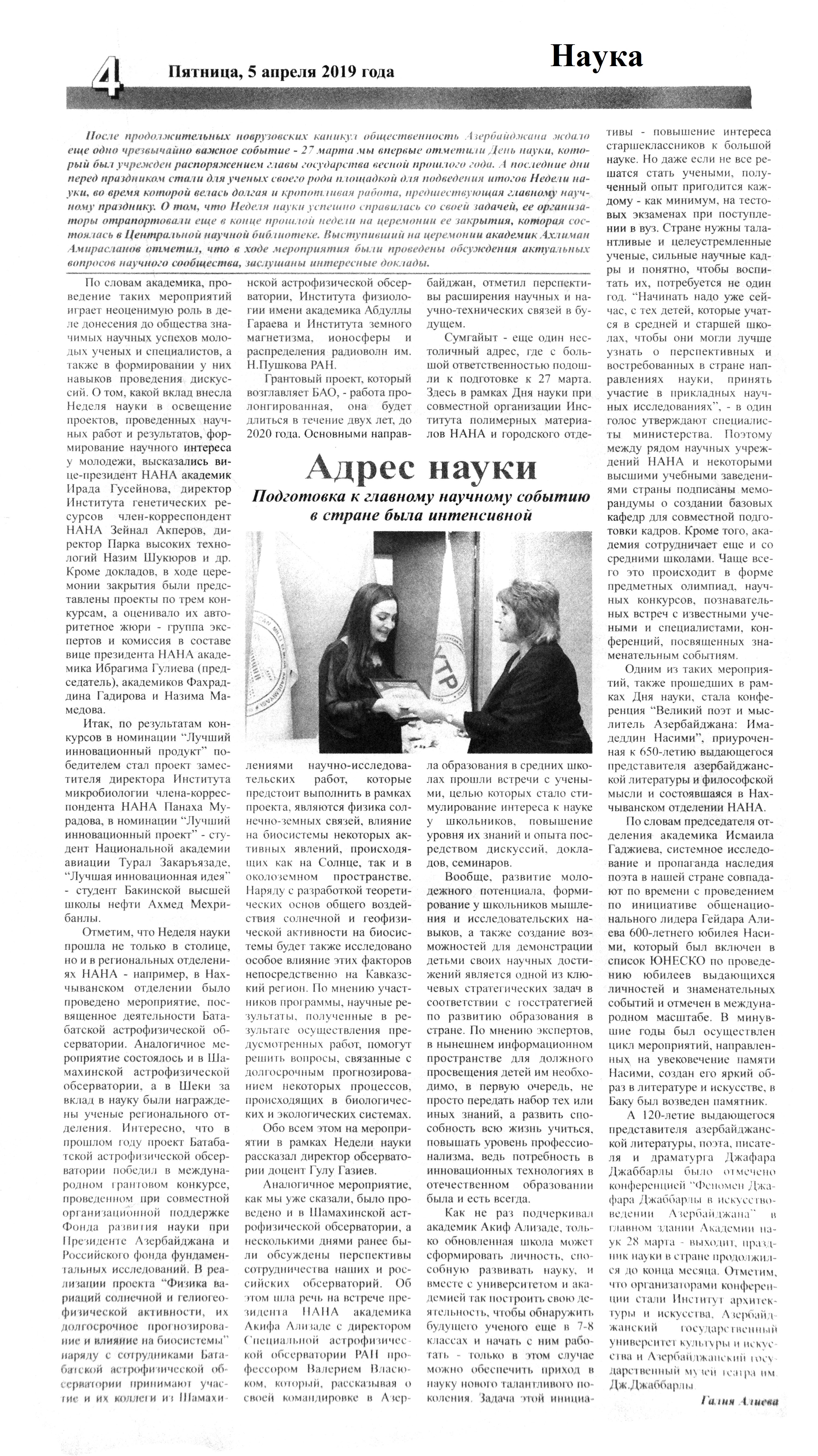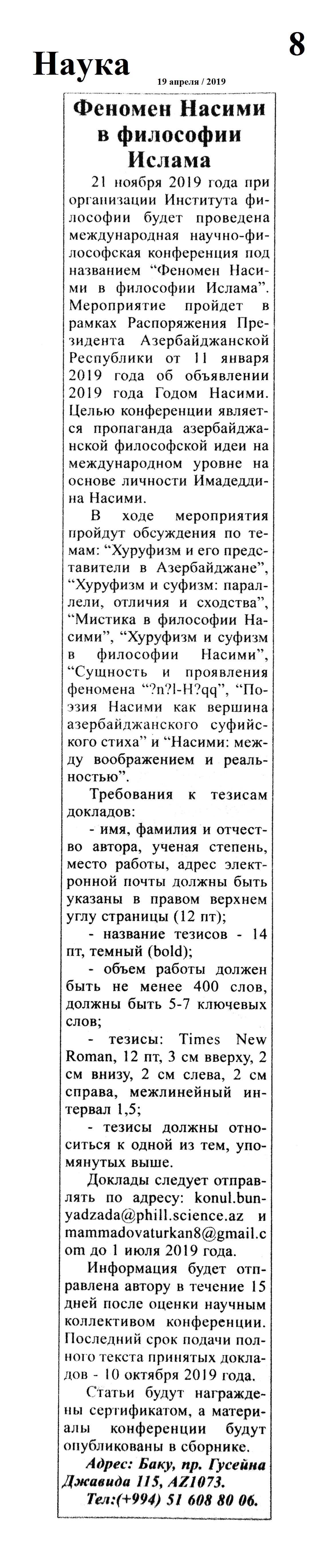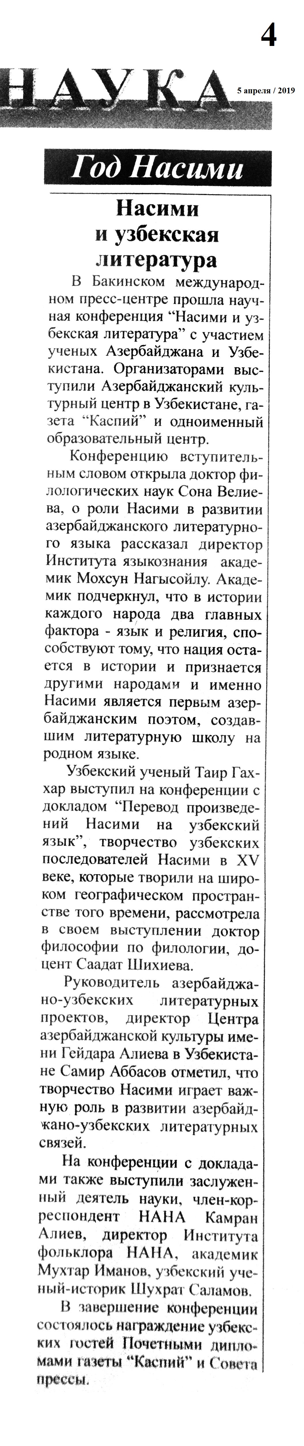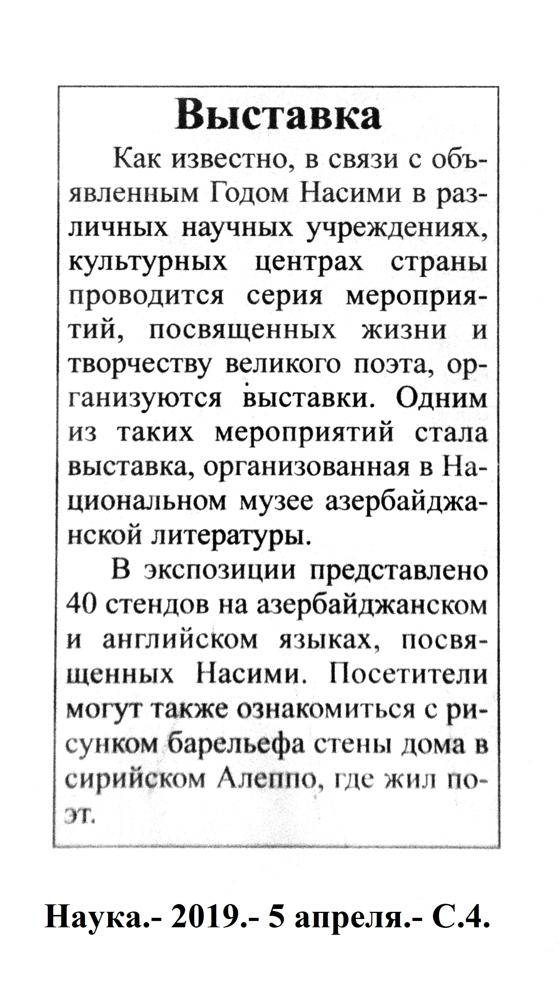 Год Насими – 2019 1291. Абаскулиева, Э. Вселенная Насими: [мероприятие в Центре Мугама] //Азербайджанские известия.- 2019.- 27 апреля.- С. 1. 1292. Алиева Г. Адрес науки: [конференция «Великий поэт и мыслитель Азербайджана» в рамках Дня Науки] //Мир литературы. - 2019.- №03(139), март.- С.3. 1293. Великому Насими посвящается: [музыковедческая конференция в Союзе Композиторов] //Вышка.- 2019.- 19 апреля.- С.6. 1294. Выставка: [в Музее Литературы] //Наука. - 2019.- 5 апреля.- С.4. 1295. Гусейнзаде, Р. Наш театр: В Баку пройдет театральный фестиваль, посвященный Насими //Каспiй.- 2019.- 10 апреля.- С.13. 1296. Касумова, Т. Под знаком Насими: Великий азербайджанский поэт в полной мере соответствует главенствующей в европейских пассионах идее «страдательного мужества» //Азербайджанские известия.- 2019.- 20 апреля.- С. 3. 1297. Насими и узбекская литература //Наука. - 2019.- 5 апреля.- С.4. 1298. Насими на Святой Земле: «АзИз» организует фестиваль в честь великого поэта: [в ряде городов Израиля] //Каспiй.- 2019.- 13 апреля.- С.11. 1299. Объявлен конкурс на создание эскиза ковра, посвященного Насими //Ежедневные новости.- 2019.- 12 апреля.- С.10. 1300. Феномен Насими в философии Ислама: [о конференции в Институте Философии] //Наука.- 2019.- 19 апреля.- С.8.