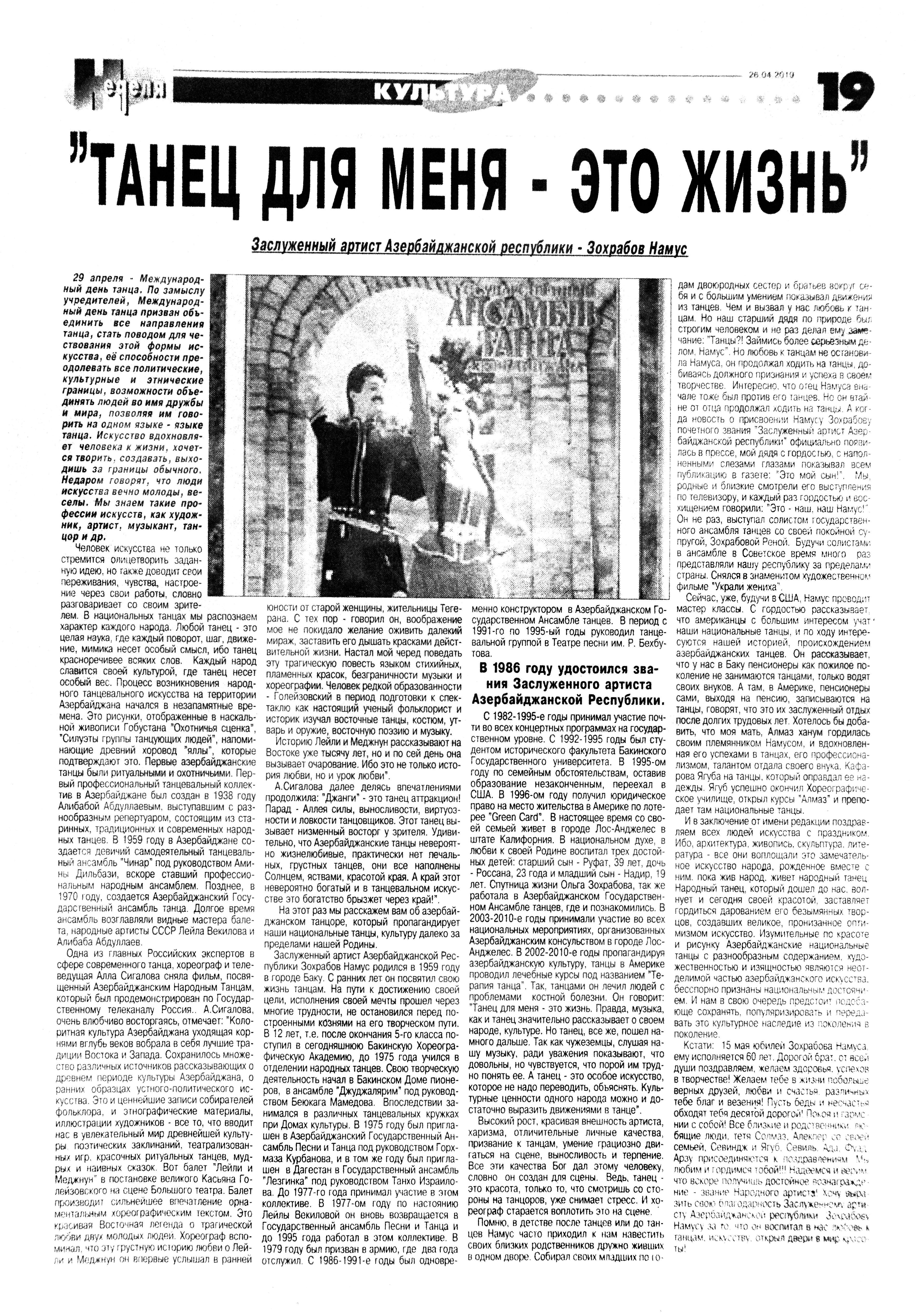 ТАНЦЫ.БАЛЕТ 1241. Аббасова, Р. Классический балет есть замок красоты: Высокие регалии Лейла Векилова принимала с благодарностью, но не более того... //Каспiй.- 2019.-27 апреля.- С.14-15. 1242. Азербайджанский танцор стал победителем международного конкурса в Москве: [Фарид Казаков на фестивале «Кремлевские звезды»] //Бакинский рабочий.- 2019.- 17 апреля.- С.3 1243. «Танец для меня - это жизнь»: Заслуженный артист Азербайджанской Республики - Зохрабов Намус //Неделя. - 2019.- 26 апреля.- С.19.