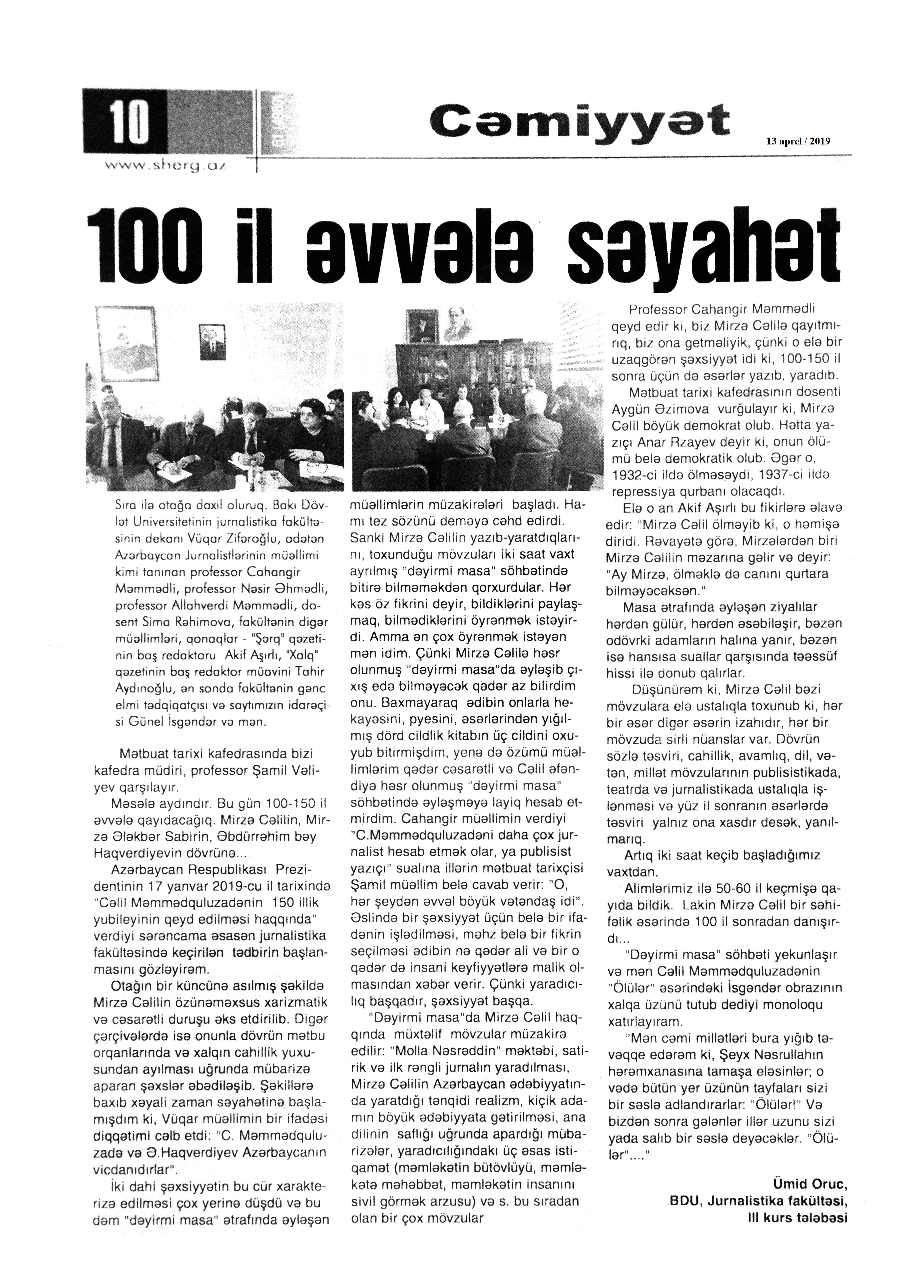 Cəlil Məmmədquluzadə – 150 932. Azadi, S. Müsəlman qardaşlarını deyib gələn “Molla Nəsrəddin”in tarixi missiyası: [“Molla Nəsrəddin” jurnalı haqqında] //İki sahil.- 2019.- 6 aprel.- S.14. 933. Bizi deyib gələn və bizimlə qalan yazıçı: Cəlil Məmmədquluzadə – 150 //Azərbaycan.- 2019.- 4 aprel.- S.7. 934. Cəlil Məmmədquluzadə və “Molla Nəsrəddin” ədəbi məktəbi: [Bakı Xareoqrafiya Akademiyasında eyniadlı movzuda keçirilən konfrans haqqında] //Mədəniyyət.- 2019.- 3 aprel.- S.6. 935. Cəlil Məmmədquluzadənin 150 illiyi ilə bağlı geniş tədbirlər planı hazırlanıb //Ədalət.-2019.- 2 aprel.- S.8. 936. Həbibbəyli, İ. Azərbaycançılığın manifesti: Anamın kitabı: İsa Həbibbəyli: Bu əsər bütün dövrlər üçün aktual ola biləcək Azərbaycannamədir: [akademikin “Sevdiyim əsər” layihəsində yazıçının eyniadlı dramı haqqında müsahibəsi] /müsahibəni apardı Fərid Hüseyn //Kaspi.- 2019.- 13-15 aprel.- S.12-13. 937. Həbibbəyli, İ. Azərbaycançılığın manifesti: Anamın kitabı: İsa Həbibbəyli: Bu əsər bütün dövrlər üçün aktual ola biləcək Azərbaycannamədir: [akademikin “Sevdiyim əsər” layihəsində yazıçının eyniadlı dramı haqqında müsahibəsi] /müsahibəni apardı Fərid Hüseyn //Kaspi.- 2019.- 20-22 aprel.- S.12-13. 938. Həbibbəyli, İ. Cəlil Məmmədquluzadəyə yenidən qayıdış: imtina, yoxsa zərurət //Ədəbiyyat qəzeti.- 2019.- 13 aprel.- S. 10-11; 525-ci qəzet.- 2019.- 13 aprel.- S.10-11. 939. Həşimzadə, N. “Poçt qutusu”ndan “Qəm pəncərəsi”nə: [ssenari müəllifi və rejissoru Anarın “Qəm pəncərəsi" filmi haqqında] //Ədəbiyyat qəzeti.- 2019.- 13 aprel.- S.9. 940. İbrahimov, E. Cəlil Məmmədquluzadə və milli dil məsələsi //Ədəbiyyat qəzeti.- 2019.- 6 aprel.- S.22-23. 941. Qasımov, R. Molla Nəsrəddin və mollanəsrəddinçilik: Və ya iki aqili bir-birinə doğmalaşdıran motivlər //Kaspi.- 2019.- 30 aprel.- S. 15. 942. Qurbanqızı, Z. Böyük ədibin ev-muzeyində: tarix nədən danışır?! //Respublika.- 2019.- 28 aprel.- S. 5. 943. Məhərrəmova, T. Təbiətin özünün yaratdığı jurnal: Və ya sadəlikdə dahiliyin nümunəsi: [“Molla Nəsrəddin” jurnalı haqqında yazıçı Nəriman Əbdülrəhmanlının, ədəbiyyatşünas Bədirxan Əhmədovun və tənqidçi Əsəd Cahangirin fikirləri] //Kaspi.- 2019.- 6-8 aprel.- S.10. 944. Məmmədli, A.F. Cəlil Məmmədquluzadənin publisistikası: Və ya mollanəsrəddinçilərin yaradıcılığı azərbaycançılıq kontekstində: Mirzə Cəlil – 150 //Kaspi.-2019.- 4 aprel.- S.15. 945. Məmmədli, C. “Anlamaq dərdi”ni anlamaq dərdi: [yazıçının yaradıcılığı haqqında] //525-ci qəzet.- 2019.- 17 aprel.- S. 14-15. 946. Mirzə Cəlilin 150 illiyi ilə bağlı tədbirlər planı hazırlanıb //Mədəniyyət.-2019.- 3 aprel.- S.1-2. 947. Mustafa, F. Mirzə Cəlili kimlər və nə üçün sevmirlər? //Ədalət.- 2019.- 2 aprel.- S.5. 948. Mükərrəmoğlu, M. Mirzə Cəlilin 150 illik yubileyi ilə bağlı tədbirlər planı: [Prezidentin Sərəncamına əsasən keçirilən tədbirlər haqqında] //Xalq qəzeti.- 2019.- 11 aprel.- S.9. 949. Müşfiq, Ş. “Molla Nəsrəddin” jurnalının 113 illiyi qeyd olunub: [AMEA-nın Naxçıvan Bölməsinin İncəsənət, Dil və Ədəbiyyat İnstitutunun təşkilatçılığı ilə] //525-ci qəzet.- 2019.- 19 ap-rel.- S.9. 950. Oruc, Ü. 100 il əvvələ səyahət: [yazıçı, dramaturq haq-qında] //Şərq.- 2019.- 13 aprel.- S.10. 951. Rüstəmov, T. Demokratik jurnalistikamızın böyük “Molla Nəsrəddin”i: Cəlil Məmmədquluzadə – 150: [BDU-nun Jurnalistika fakültəsində keçirilən dəyirmi masa haqqında] //Xalq qəzeti.- 2019.- 7 aprel.- S.8.