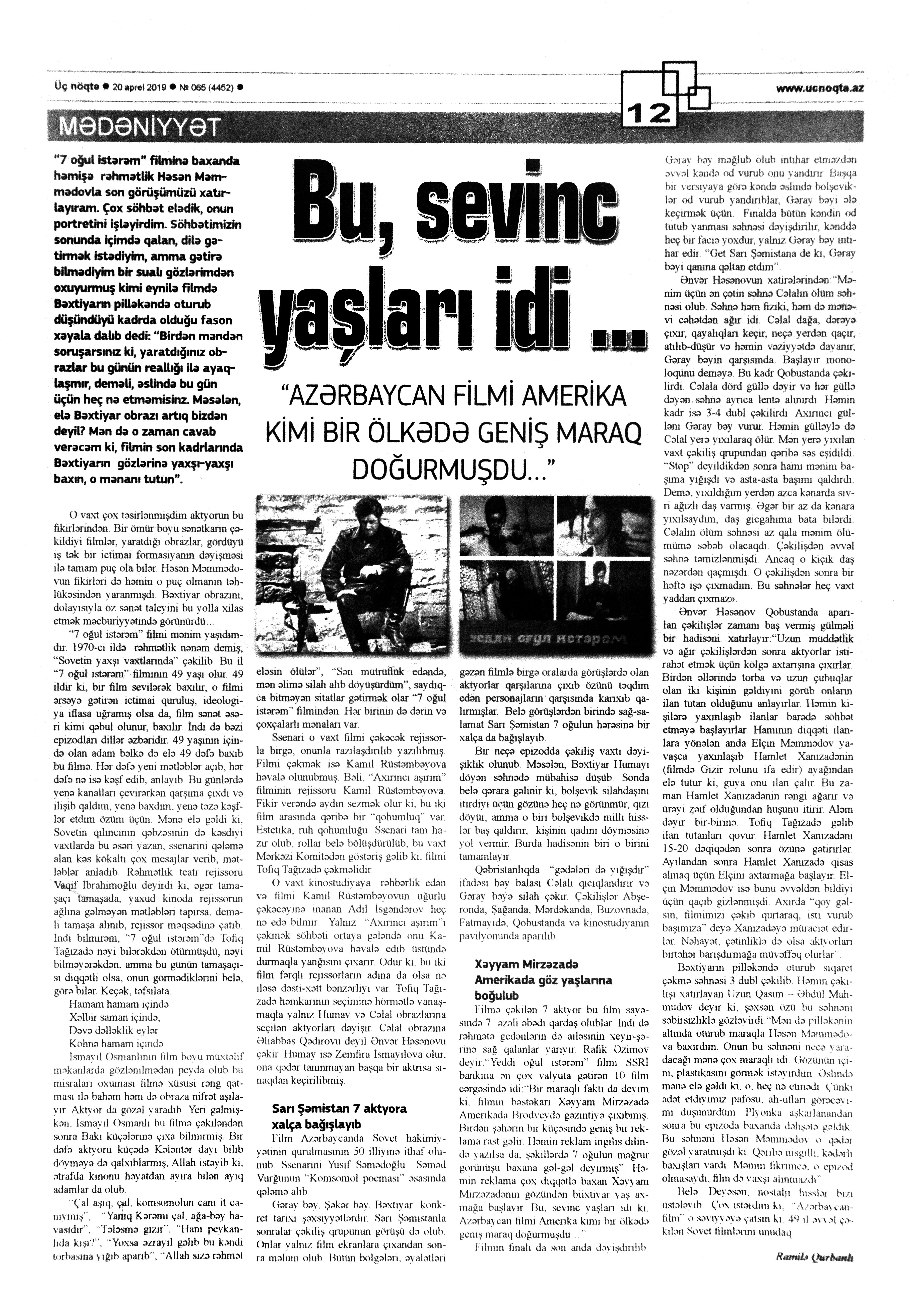 KİNO 338. “Azərbaycan kinematoqrafiyasının inkişaf Konsepsiyası”nın layihəsi hazırlanır: İşçi qrupu beynəlxalq təcrübənin öyrənilməsi məqsədilə Litva və Macarıstanda səfərdə olub //Mədəniyyət.-2019.-10 aprel.- S.3. 339. Azəri, L. “Əlvida, Şmidt” – kinomuzun yeni yol əhvalatı: Ekran əsəri almanların ölkəmizdə məskunlaşmasının 200 illiyinə həsr olunub: [Nizami Kino Mərkəzində Azərbaycanda doğulan Emil Smidtin başına gələn hadisələrdən bəhs edən eyniadlı film Əli-Səttar Quliyevin quruluşunda] //Mədəniyyət.-2019.-24 aprel.- S.1;5. 340. Azəri, L. Köhnə Poçt küçəsində kinolentlərə nələr yazılıb?: [kino tarixi haqqında] //Mədəniyyət.-2019.- 26 aprel.- S.1;5. 341. Azəri, L. Onun nənə obrazları bu gün də sevilir...: [kino aktyoru Törəxanım Zeynalova haqqında] //Mədəniyyət.- 2019.- 17 aprel.- S.1;6. 342. Bazel şəhərində Azərbaycan filmi nümayiş olunub: [İsveçrənin eyniadlı şəhərində Elmar İmanovun hazırladığı “Tabutçunun yelləncəyi” qısametrajlı bədii filmin nümayişi haqqında] //Mədəniyyət.-2019.- 3 aprel.- S. 8. 343. Doğum və ölüm günləri bir yerdə qeyd olunan aktrisa: Məşhur cütlüyün ailə faciəsi haqda: [Xalq artisti Ənvər Həsənovun həyat yoldaşı kinoaktrisa Möminat Qurbanova haqqında] //Yeni Müsavat.-2019.- 22 aprel.- S.13. 344. Əliyeva, İ. Həyatın kölgəsi: Kino //Azərbaycan.-2019.- 14 aprel.- S.5. 345. Əmirli, Ş.Y. 50 yaşlı “Şərikli çörək”: [Şamil Mahmudbəyovun filmi haqqında] //Mədəniyyət.-2019.- 24 aprel.- S.6. 346. Hüseynov, Ə.M. Eldəniz Zeynalov paradoksu: [Xalq artisti haqqında] //525-ci qəzet.-2019.- 17 aprel.- S.22. 347. Xaçmazda Tofiq Tağızadənin 100 illiyinə həsr olunmuş tədbir: [Xaçmazdakı Heydər Əliyev Mərkəzində kinorejissorun yubileyi ilə əlaqədar] //Mədəniyyət.-2019.- 19 aprel.- S.4. 348. Kinematoqrafiyanın inkişaf konsepsiyası ilə bağlı müzakirələr davam edir //Mədəniyyət.-2019.-19 aprel.- S.3. 349. Quliyeva, Z. Özəl sektor kino və serialları bataqlıqdan xilas edə bilər, amma...: [Xalq artisti Rasim Balayev və rejissor Əlisa Cabbarovun Azərbaycan teleserialları haqqında fikirləri] //Mövqe.-2019.- 20 aprel.- S.6. 350. Qurbanlı, R. “Bu rolla öz köklərimə qayıdırdım”: [Xalq artisti Hacı Murad Yagizarov haqqında] //Üç nöqtə.-2019.- 6 aprel.- S.12. 351. Qurbanlı, R. “Mən hər gün Şuşadayam, ruhum ordadır”: [Xalq artisti, aktrisa Firəngiz Mütəllimovanın müsahibəsi] //Üç nöqtə.-2019.- 18 aprel.- S.12. 352. Qurbanlı, R. Bu, sevinc yaşları idi...: “Azərbaycan filmi Amerika kimi bir ölkədə geniş maraq doğurmuşdu...” //Üç nöqtə.-2019.- 20 aprel.- S.12. 353. Lalə. “Əlvida, Smidt” filminin premyerası olacaq: [Nizami Kino Mərkəzində Əli-Səttar Quliyevin Azərbaycanda almanların məskunlaşmasının 200 illiyi münasibətilə ölkəmizdə doğulan Emil Smidtin başına gələn hadisələrdən bəhs edən eyniadlı filminin nümayişi haqqında] //Mədəniyyət.-2019.-17 aprel.- S.2. 354. Moskvada kinorejissor Əjdər İbrahimovun yubiley gecəsi: [100 illiyi ilə əlaqədar] //Mədəniyyət.-2019.- 3 aprel.- S.2. 355. Mükərrəmoğlu, M. Kinoda əbədiləşən ömür: Əjdər İbrahimov – 100 //Xalq qəzeti.-2019.- 21 aprel.- S.7. 356. Müşfiq, Ş. Bakının ecazkar tablosu: “İşıqlı şəhər”: [Lalə Axundovanın çəkdiyi eyniadlı film haqqında] //525-ci qəzet.-2019.- 26 aprel.- S.8. 357. “O, 20 illik yaradıcılıq fəaliyyətini tarixə çevirməyi bacardı”: [Əməkdar artist, aktyor Səməndər Rzayev haqqında] //Üç nöqtə.-2019.- 9 aprel.- S.12. 358. “O, kədərin astar üzünü, kədərin boyuna bərabər gülüşü oynayırdı”: [aktyor Fazil Salayev haqqında] //Üç nöqtə.-2019.- 30 aprel.- S.12. 359. “Şahdağ. Dağların şahı”: Sənədli filmin təqdimatı olub: [Bakı Konqres Mərkəzində] //Azərbaycan.-2019.- 18 aprel.- S. 6.; İki sahil.-2019.- 18 aprel.- S.3.