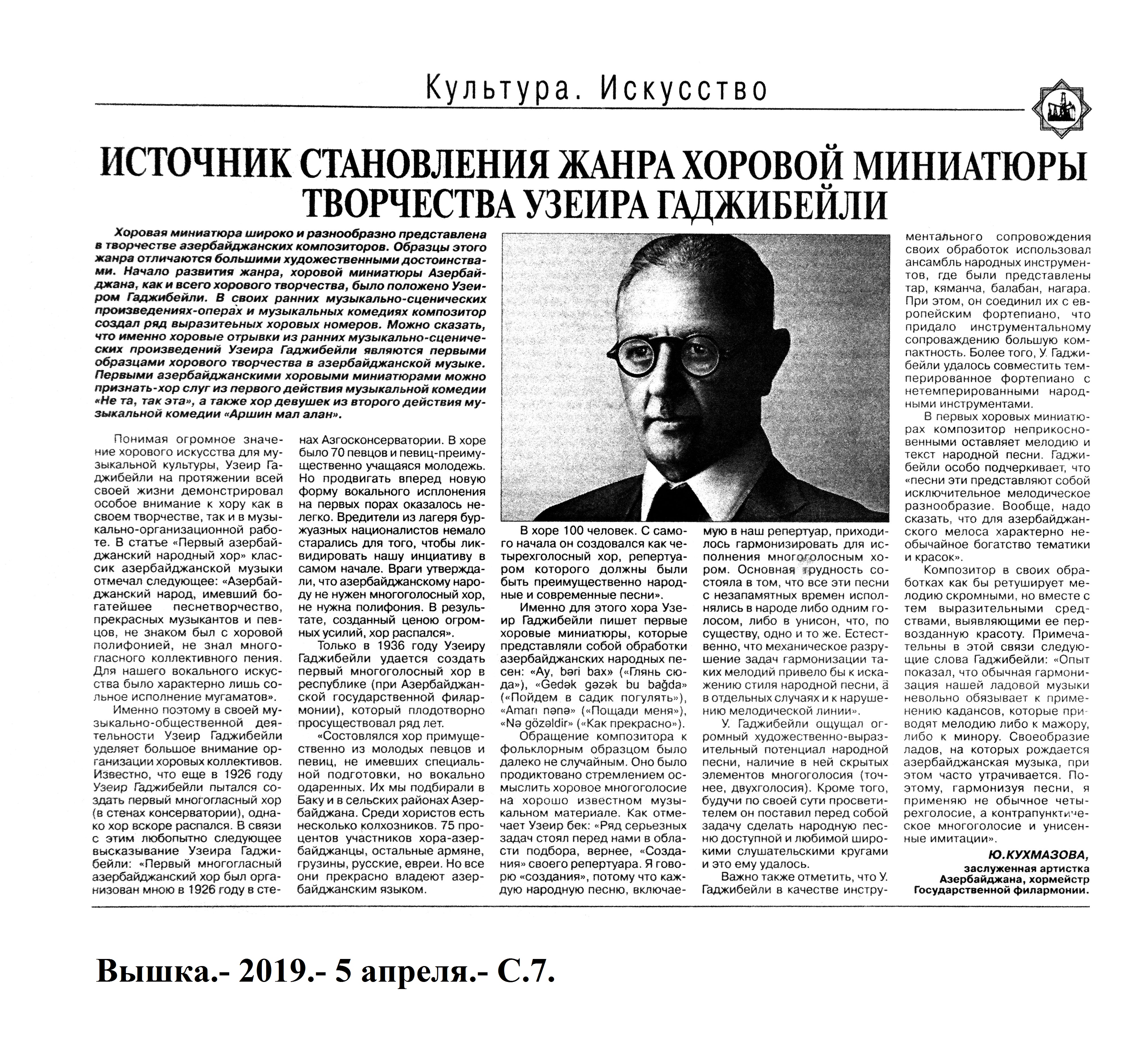 МУЗЫКА 1210. Багиров, Э. Не ждать, а надеяться…: Эльшад Багиров: Общение с Гара Абульфасовичем для меня - огромный подарок свыше и на всю жизнь: [беседа со скрипачем, заслуженным деятелем искусств] /провела Р.Аббасова //Каспiй.- 2019.- 20 апреля.- С. 14-15. 1211. Бадалбейли, Ф. Славный юбилей: Школа-студия БМА отметит свое 40-летие //Каспiй.- 2019.- 4 апреля.- С. 12-13. 1212. В Баку пройдет Х Международный фестиваль Мстислава Ростроповича //Бакинский рабочий.- 2019.- 4 апреля.- С.6. 1213. В Германии увидели свет избранные произведения Кара Караева //Бакинский рабочий. - 2019.- 12 апреля.- С.6. 1214. Гаджиева, Л. Заслуженное признание: Франгиз Ализаде удостоена международной премии за выдающийся вклад в сохранение и развитие исламского музыкального наследия //Азербайджанские известия.- 2019.- 6 апреля.- С.3. 1215. Гаджиева, Л. «Я родилась с любовью»: Книга профессора Зумруд Дадашзаде посвящена первой азербайджанской женщине-композитору Адиле Гусейнзаде //Азербайджанские известия. - 2019.- 27 апреля.- С.3. 1216. Гараюсифли, А. Впервые в Баку пройдет конкурс World harmony: [беседа с заслуженным артистом об одноименном конкурсе классической музыки] /провела Ф.Ханджанбекова //Бакинский рабочий. - 2019.- 5 апреля.- С.5. 1217. Динара Алиева: Я мечтаю привезти фестиваль к себе на Родину: [народная артистка о фестивале «Opera Art» ] //Бакинский рабочий. - 2019.- 30 апреля.- С.7. 1218. Известный азербайджанский композитор Ариф Мирзоев отмечает юбилей: [к 75-летию заслуженного артиста] //Бакинский рабочий. - 2019.- 11 апреля.- С.6. 1219. Ислам, А. Весна скрипки: Во Франции прошел концерт с участием азербайджанской пианистки: [Саиды Зульфугаровой] //Каспiй. - 2019.- 10 апреля.- С.13. 1220. Ислам, А. На рубеже двух веков: Ансамблю «Гейгель» исполняется 50 лет //Каспiй.- 2019.- 20 апреля.- С.16-17. 1221. Ислам, А. Надо победить смерть: Азербайджанские музыканты покажут оперу «Трубадур» в Якутске: [об участии народного артиста Фахраддина Керимова и концертмейстера Юлии Керимовой в постановке одноименной оперы на сцене Государственного Театра Оперы и Балета Республики Саха] //Каспiй.- 2019.- 18 апреля.- С.13. 1222. Ислам, А. Сказание о Прометее: Фантастический вечер в филармонии и триумфальная премьера азербайджанских музыкантов: [о концерте Симфонического Оркестра имени Узеира Гаджибейли] //Каспiй.- 2019.- 2 апреля.- С.13. 1223. Ислам, А. Триумф вокального искусства: В Баку прошел вечер оперной музыки с участием Азера Рзазаде: [в БМА] //Каспiй.- 2019.- 9 апреля.- С.13. 1224. Ислам, А. Ханенде, нанизавший на мугам драгоценные камни…: Вспоминая великого Устада Гаджибаба Гусейнова //Каспiй.- 2019.- 16 апреля.- С.12. 1225. Кухмазова, Ю. Источник становления жанра хоровой миниатюры творчества Узеира Гаджибейли //Вышка. - 2019.- 5 апреля.- С.7. 1226. Кязимова, С. Будущие звезды: Конкурс World Harmony завершился гала-концертом юных талантов из десяти стран: [в Филармонии] //Азербайджанские известия.- 2019.- 9 апреля.- С.4. 1227. Кязимова, С. Классика на все времена: Третий международный музыкальный фестиваль Динары Aлиeвой собрал выдающихся вокалистов: [в Московской Консерватории] //Азербайджанские известия.- 2019.- 20 апреля.- С.3. 1228. Мирзоев, С. Семейный вечер: Необычный концерт в Доме-музее М.Булгакова в Киеве: [беседа с участником концерта, пианистом Самиром Мирзоевым] /провела А.Ислам //Каспiй.- 2019.- 24 апреля.- С.13. 1229. П.Бюльбюльоглу: «Баку является Городом-героем по сути»: [о заявлении посла на IX Международном форуме Победителей ] //Бакинский рабочий.- 2019.- 26 апреля.- С.
