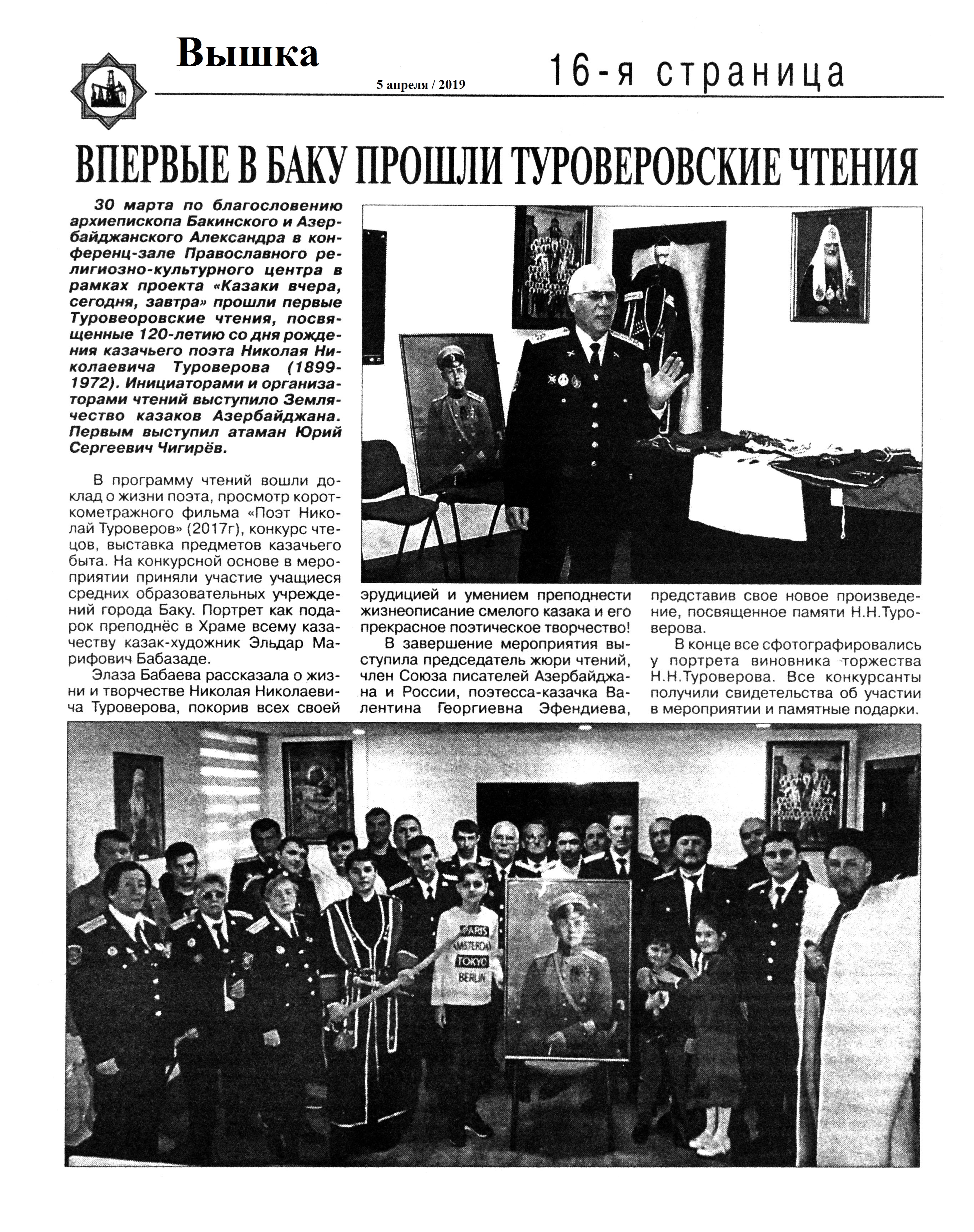 КУЛЬТУРНЫЕ СВЯЗИ 1141. Азербайджанский государственный университет культуры и искусств и ВГИК подписали Соглашение о сотрудничестве //Бакинский рабочий.- 2019.- 10 апреля.- С. 5. 1142. В Баку прошла лекция-диспут на тему «Парадокс Раскольникова»: [к 200-летию писателя Федора Достоевского в БСУ] //Бакинский рабочий.- 2019.- 10 апреля.- С. 4. 1143. В Варшаве открылась памятная доска, посвященная признанию Польшей независимости Азербайджанской Демократической Республики //Бакинский рабочий.- 2019.- 18 апреля.- С. 2. 1144. В Киноцентре «Низами» прошла встреча с Владимиром Меньшовым: [народным артистом России] //Ежедневные новости.- 2019.- 12 апреля.- С.10. 1145. В Кракове открылся барельеф академика Юсуфа Мамедалиева //Бакинский рабочий.- 2019.- 27 апреля.- С.7. 1146. В Публичную библиотеку имени Самеда Вургуна города Киева отправлены книги об Азербайджане //Вышка.- 2019.- 12 апреля.- С.16. 1147. В Центре Гейдара Алиева состоялся показ моноспектакля «Пиковая дама»: [народного артиста России Евгения Князева] //Бакинский рабочий.- 2019.- 18 апреля.- С.5. 1148. Великолепное перевоплощение Евгения Князева в «Пиковой даме» на сцене Центра Гейдара Алиева //Вышка.- 2019.- 19 апреля.- С. 6. 1149. Во Дворце Гейдара Алиева состоялся концерт известного пианиста Дениса Мацуева //Бакинский рабочий.- 2019.- 10 апреля.- С.2. 1150. Впервые в Баку прошли туроверовские чтения: [к 120-летию казачьего поэта Николая Туроверова в Православном религиозно-культурном центре] //Вышка.- 2019.- 5 апреля.- С.16. 1151. Ислам, А. Обогащение Запада и Востока: Венеция и Страна огней пересеклись на концерте Water and Fire: [о концерте музыкантов Азербайджана и Италии в ТОиБ] //Каспiй. - 2019.- 23 апреля.- С. 13. 1152. Князев, Е. Евгений Князев, народный артист России: «У нас учатся талантливые студенты из Азербайджана. Надеюсь, что из них получатся замечательные артисты»: [беседа с ректором Театрального Института имени Б.Щукина] /провела С.Кязимова //Азербайджанские известия.- 2019.- 20 апреля.- С.3. 1153. Кязимова, С. Кузница талантов: 100-летие ВГИК отметили в Баку Днями первой в мире киношколы //Азербайджанские известия.- 2019.- 11 апреля.- С.4. 1154. Марченко, М. Мира Марченко, заведующая отделением специального фортепиано ЦМШ при Московской госконсерватории: «Работать в таком проекте, как фестиваль «Симург», мне легко и радостно»: [интервью] /провела С.Кязимова //Азербайджанские известия.- 2019.- 6 апреля.- С.1, 3. 1155. Меньшов, В. Владимир Меньшов, народный артист России: «Я родился и вырос в Ичери шэхэр - это волшебное место со своими традициями и атмосферой»: [интервью] /провела С.Кязимова //Азербайджанские известия.- 2019.- 13 апреля.- С. 3. 1156. Президент России наградил нашего соотечественника: [президента международного фонда «Диалог культур – единый мир» Руслана Байрамова медалью ордена «За заслуги перед отечеством»] //Бакинский рабочий.- 2019.- 11 апреля.- С.6. 1157. Расширяются культурные связи между Азербайджаном и Монтенегро: [договор о сотрудничестве Культурно-экономического центра Азербайджан-Черногория и Культурного центра Биело-Полe] //Бакинский рабочий.- 2019.- 30 апреля.- С.7. 1158. Россия была представлена на VIII Международном фестивале Азербайджанской дипломатической академии: [РИКЦ представил изделия народных промыслов] //Бакинский рабочий. - 2019.- 20 апреля.- С.3. 1159. Состоялась презентация документального фильма «Шахдаг. Царь-гора»: [режиссер-Игорь Бышнев] //Бакинский рабочий. - 2019.- 18 апреля.- С.4. 1160. Состоялась презентац