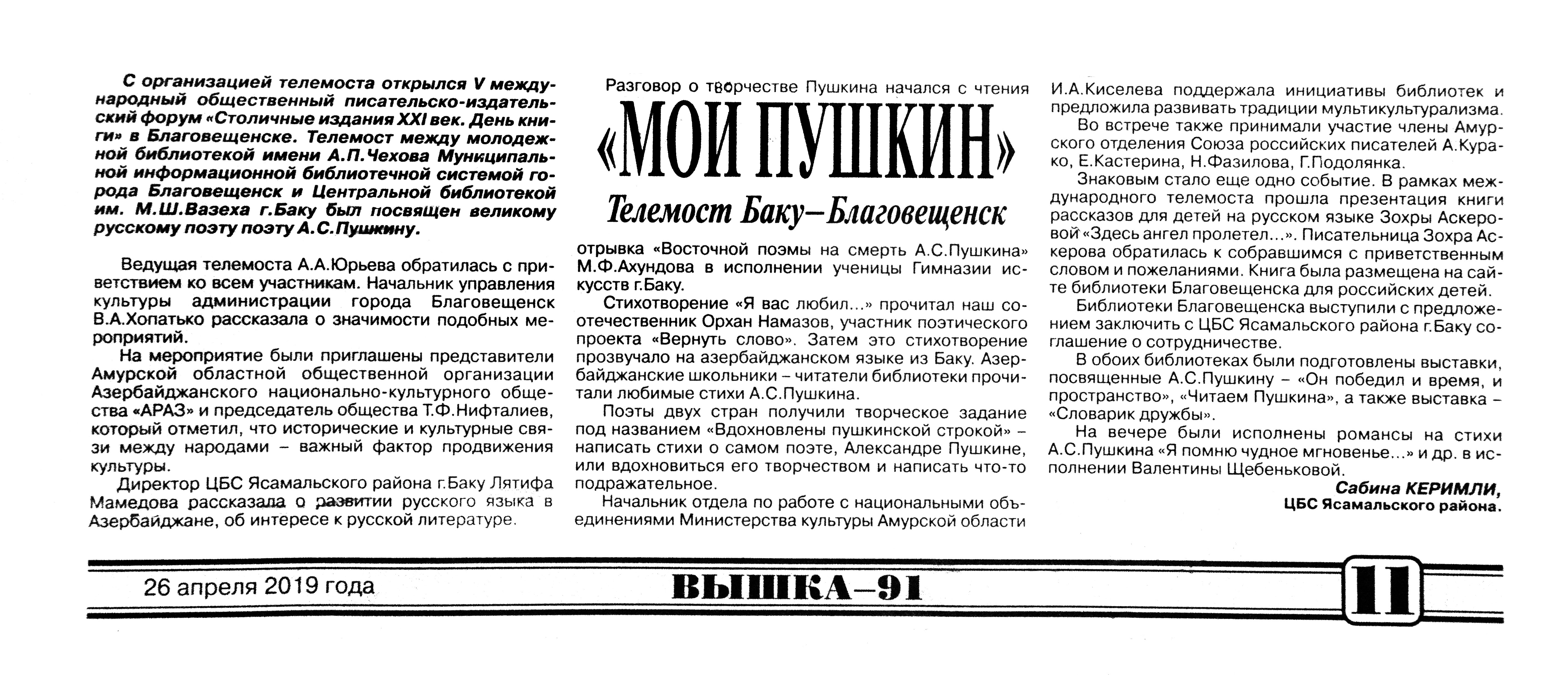 Aleksandr Sergeyeviç Puşkin – 220 1112. Heydər Əliyev Mərkəzində “Qaratoxmaq qadın” monotamaşası nümayiş etdirilib: [dahi rus şairi Aleksandr Puşkinin eyniadlı mistik povestinin motivləri əsasında Rusiyanın Xalq artisti Yevgeni Knyazevin eyniadlı monotamaşasının təqdimatı haqqında] //Yeni Azərbaycan.- 2019.- 18 aprel.- S.7. 1113. Puşkinin 220 illiyinə həsr olunmuş müsabiqə davam edir: [Niyazinin mənzil-muzeyində rus şairinin yubileyinə həsr olunmuş konsertin keçirilməsi haqqında] //Mədəniyyət.- 2019.- 3 aprel.- S. 2. 1114. Puşkinin 220 illiyi ilə bağlı müsabiqənin növbəti mərhələsi: [Q. Qarayevin ev-muzeyində şairin yubileyinə həsr olunmuş konsert və müsabiqənin keçirilməsi haqqında] //Mədəniyyət.- 2019.- 12 aprel.- S.3.