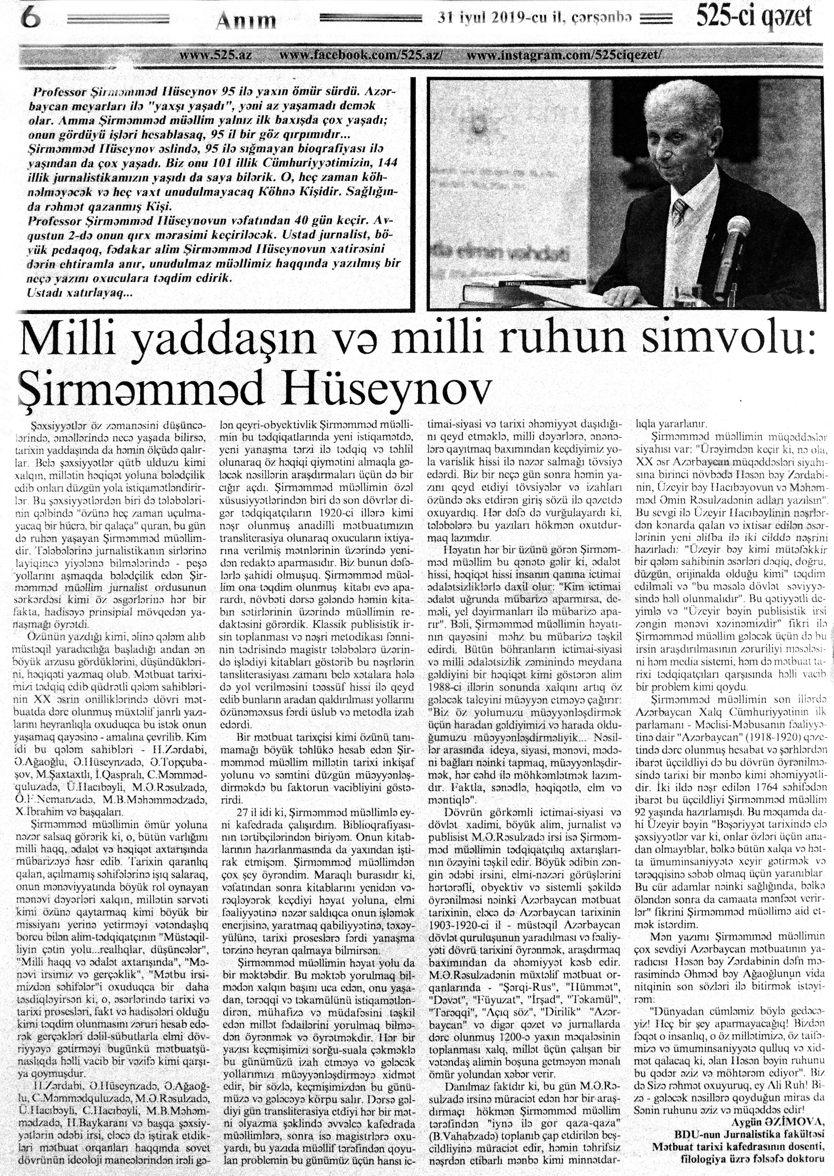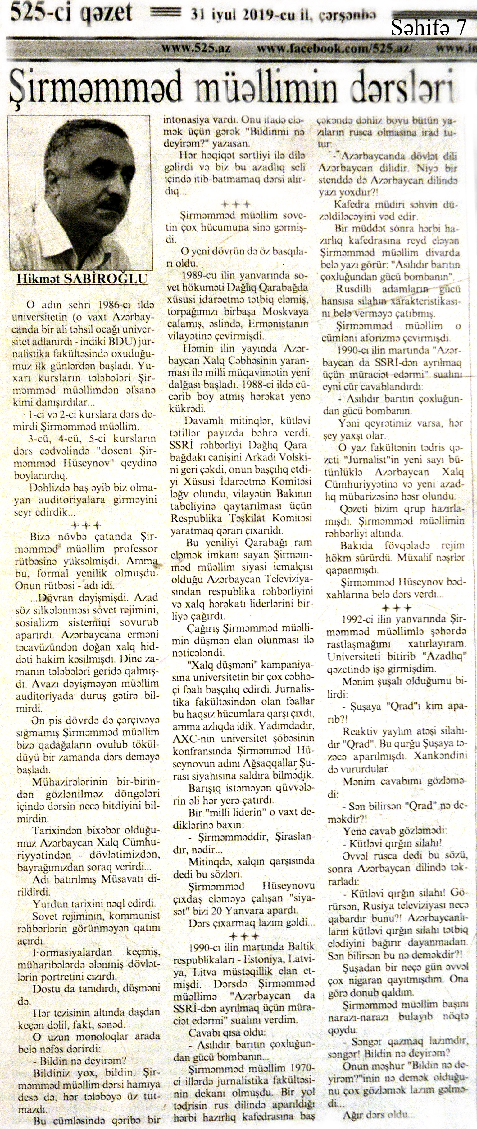 Hacı Rafiq – 80 1206. Xələfli, Ə. R. Səksən ilin hünəri, yaxud insanlığın yaddaş daşı: Müdriklər insanlığın tarazlıq mərkəzidir: Hacı Rafiq-80 //Kredo.- 2019.- 25 iyul.- S.1. 1207. Xələfli, Ə. R. Siyasətin və idmanın jurnalist düşüncəsində əqidə birliyi: [“Say” qəzetinintəsisçisi və baş redaktoru Hacı Rafiq haqqında] //Kredo. - 2019.- 25 iyul.- S.8. 1208. Xələfli, Ə. R. Yetmiş ilin məntiqi: Düz söz qılıncdan kəsərlidir: [“Say” qəzetinin təsisçisi və baş redaktoru Hacı Rafiq haqqında] //Kredo.- 2019.- 25 iyul.- S.4. Nəsib Nəbioğlu – 65 1209. Müşfiq, Ş. Nəsib Nəbioğlunun yubileyi: söz sənətinin təntənəsi //525-ci qəzet.- 2019.- 3 iyul.- S.17. 1210. Sizə sözüm var: Nəsib Nəbioğlu – 65: [AYB-nin və “Aşıq Şəmşir” Mədəniyyət Ocağı İctimai Birliyinin təşkilatçılığı ilə keçirilən tədbir haqqında] //Kredo.-2019.- 4 iyul.- S.5. 1211. Şair Nəsib Nəbioğlunun 65 illiyi qeyd edilib: [Rəşid Behbudov adına Mahnı Teatrında] //Mədəniyyət.- 2019.- 3 iyul.- S.6. 1212. Tanınmış şair Nəsib Nəbioğlunun 65 illiyi qeyd edilib: [Rəşid Behbudov adına Mahnı Teatrında] //Ədalət.-2019.- 2 iyul.- S.8.