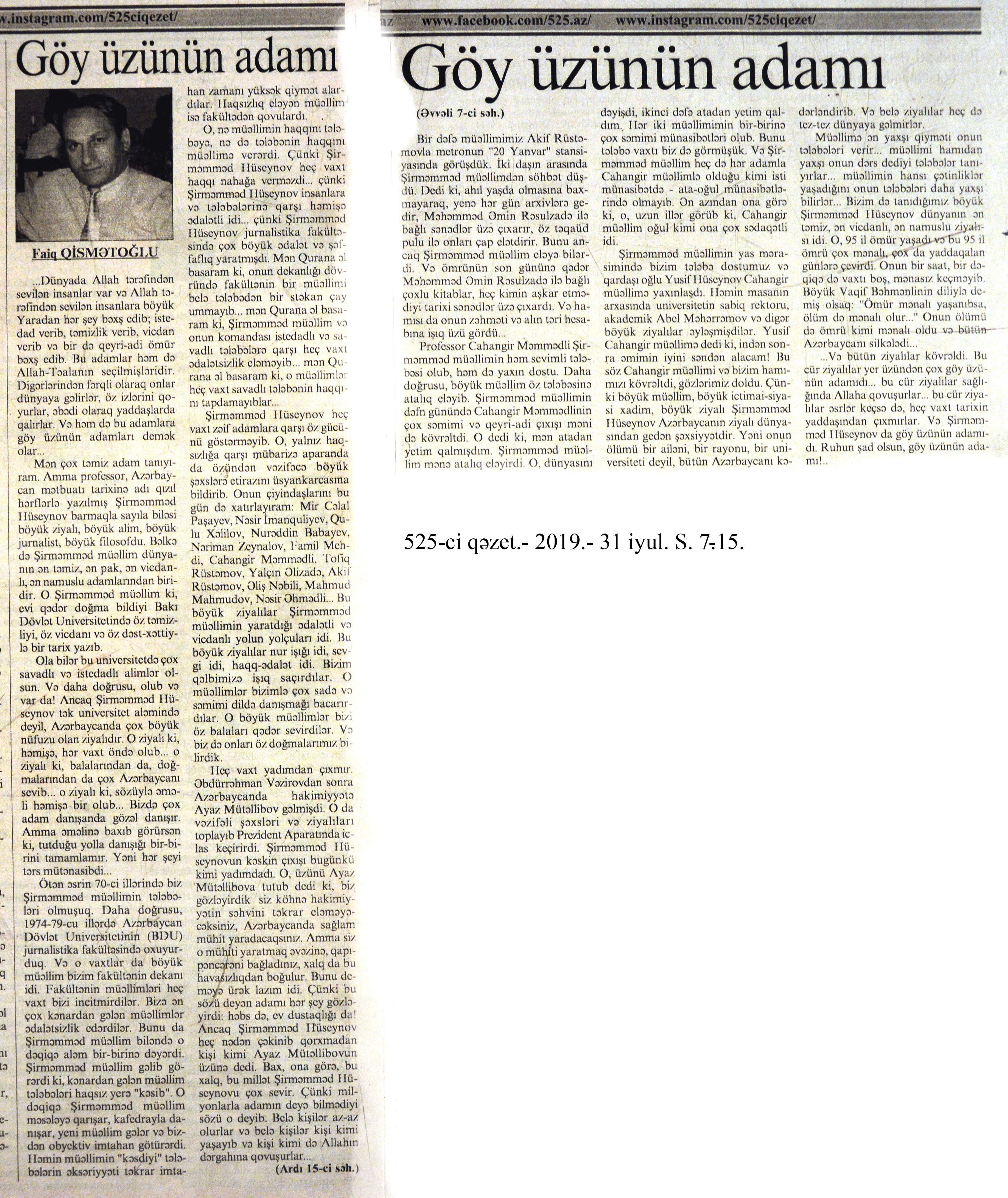 ESSELƏR 799. Ağazadə, M. Fövqəlinsan: [müəllif Ağazadə Mirçingizin düşündükləri] //525-ci qəzet. - 2019.- 13 iyul.- S.23. 800. Aslan, Ş. Eynşteyn və nağıllar: [müəllifin uşaqlıq xatirələri] //525-ci qəzet. - 2019.- 10 iyul.- S.12. 801. Ələkbərli, T. Dostum Əlimusa //Azad Azərbaycan.- 2019.- 4 iyul.- S.5. 802. Malik, F. Həyat üçün mübarizə //525-ci qəzet.- 2019.- 5 iyul.- S.16. 803. Məcid, R. Qələmsiz yazılanlar: Status-esselər //525-ci qəzet. - 2019.- 17 iyul.- S.11. 804. Nazim, G. Eşq //Türküstan.- 2019.- 16-22 iyul.- S.14. 805. Rəşidzadə, L. Fobiya //Kredo.- 2019.- 11 iyul.- S.5;7. 806. Rəşidzadə, L.Fobiya //Kredo.- 2019.- 18 iyul.- S.15. 807. Şahin, Ş. Özündən qaçış //Ədalət.-2019.- 18 iyul.- S.8. 808. Turan, T. Hilallı yaylıq //Ədəbiyyat qəzeti.- 2019.- 13 iyul.- S.21. 809. Tağıyeva, N. Duyğuların qoxusu //525-ci qəzet.- 2019.- 5 iyul.- S.15.