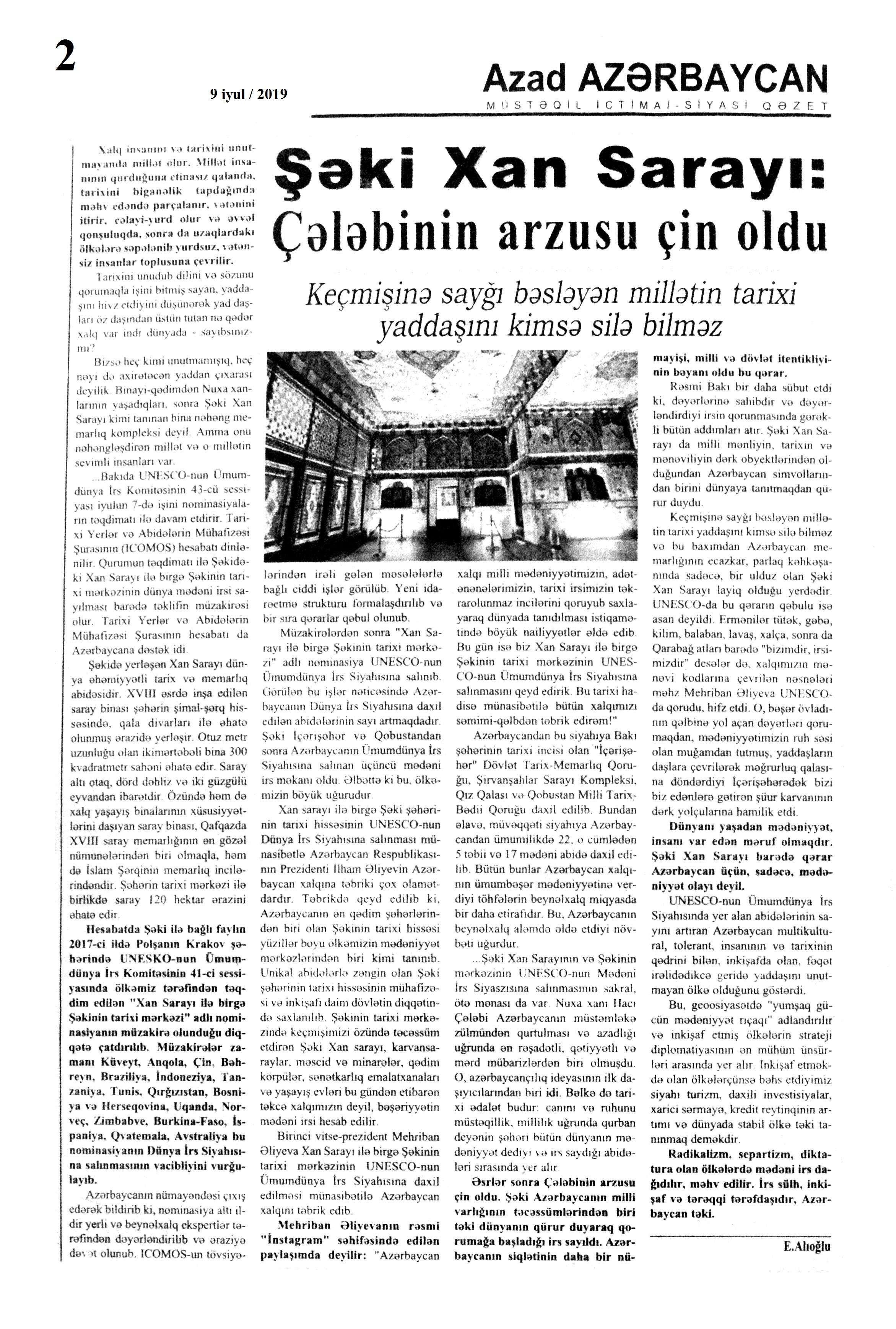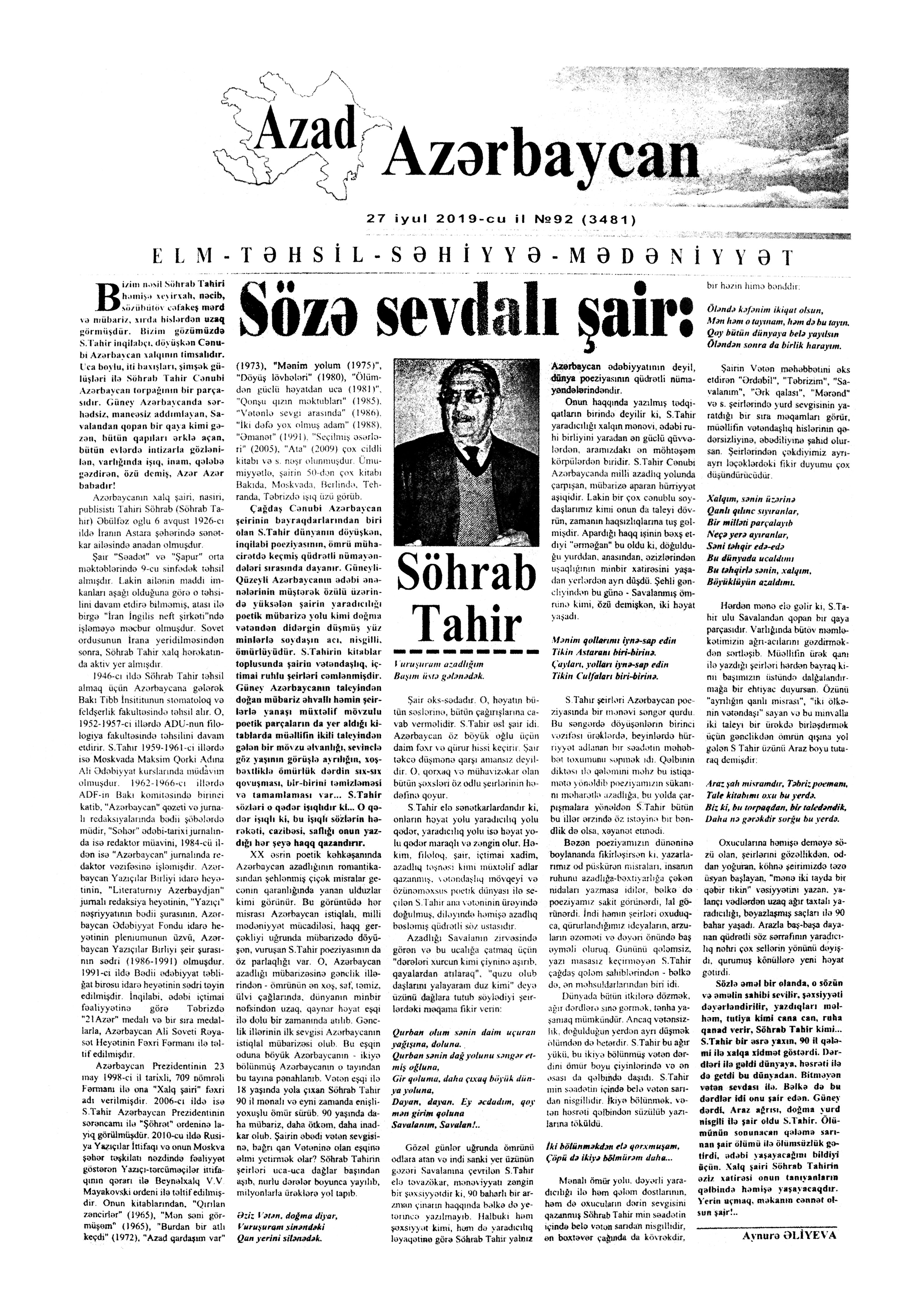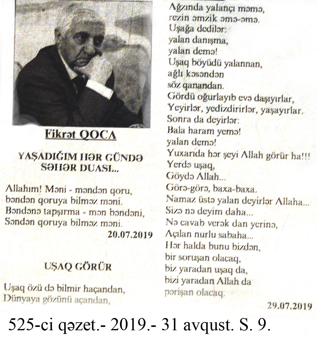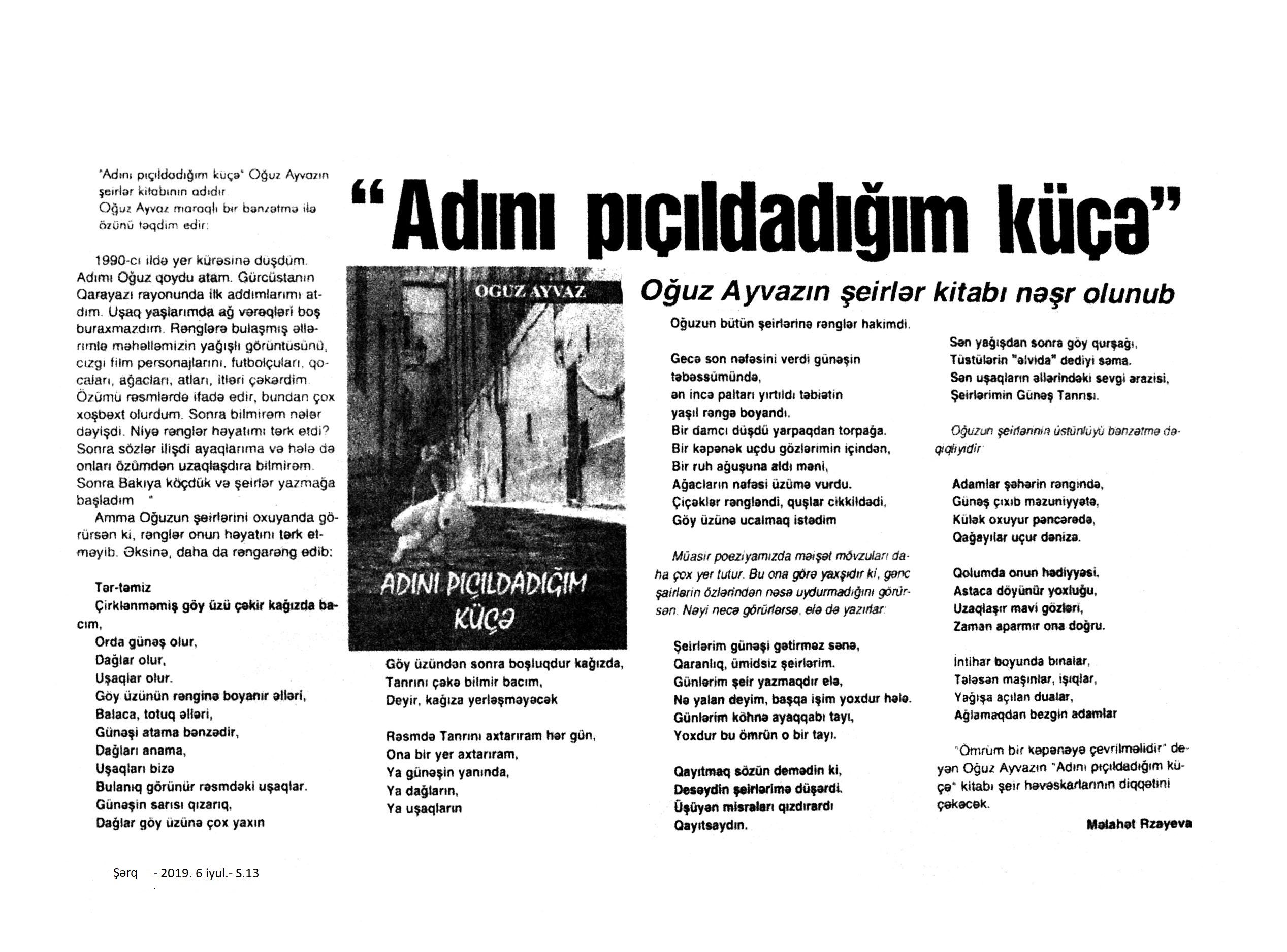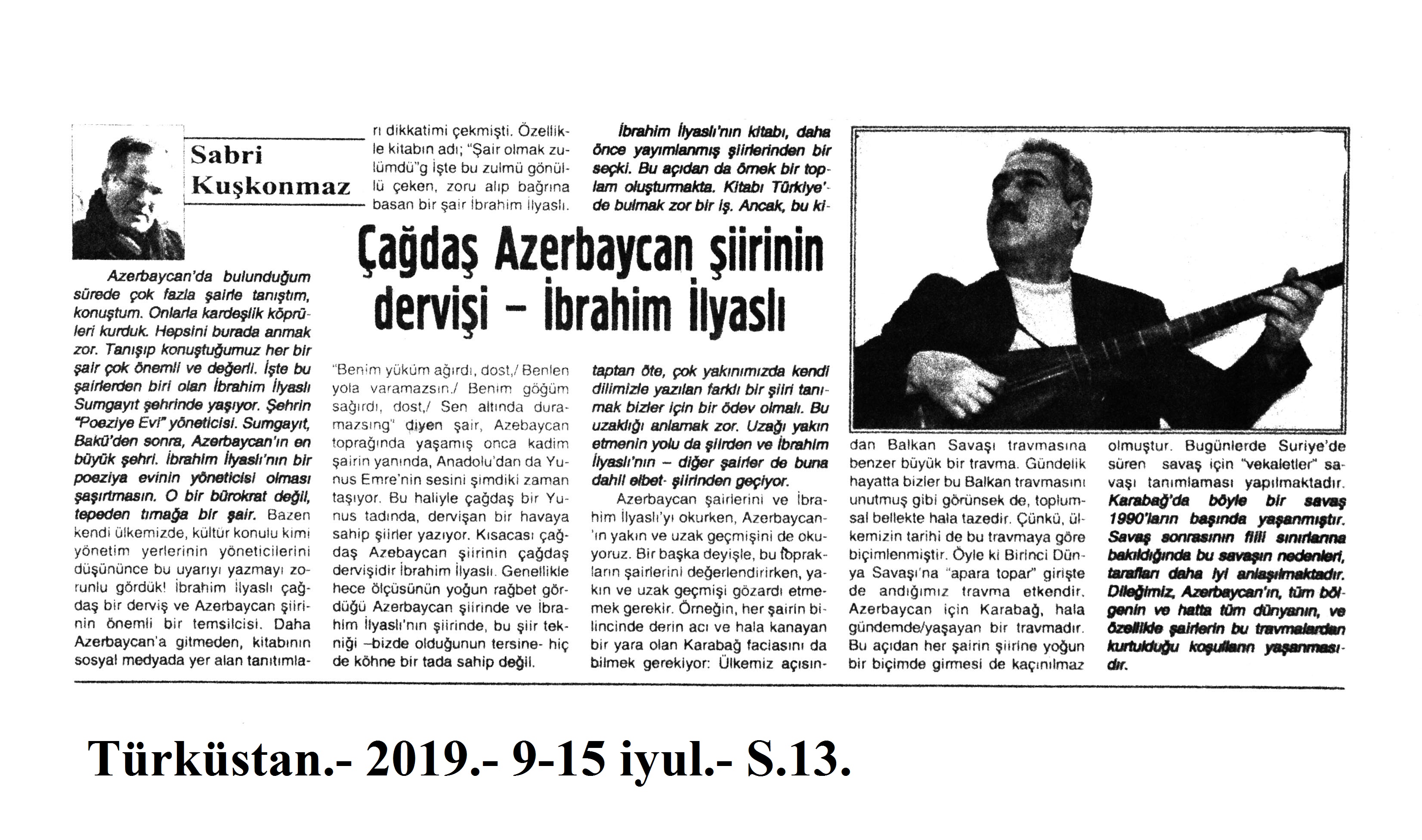 Yenə nə dolmusan bulud gözlərim...; 752. Seyidməmmədov, Ş. Gülüstan //Ədalət.- 2019.- 18 iyul.- S.6. 753. Səməd, A. A bəxtəvər...; Sən kövrəlmə...; Elə açır qucağını...; Ölmək də olmur...; Adətə bax...; Nə ağlarsan...; Könlümə baxdım...; Gəl gedək; Üzümə qəzalar gülür...; Qurban yazıma...; Sən dediyin...; Verirsən yelə...; Salam, dar ağacı //Ədalət.- 2019.- 9 iyul.- S.6. 754. Sərxanlı, S. Sənsiz soyuq dəyir gecələrimə: Qayıt ömrümə sən; Dünya haqqında qoşma; Bu gələn qatar; Pəncərə önünə həmişə sən gəl; Eh, yenə həsrətin gözümə dəydi /təqdim etdi Tural Adışirin //Ədəbiyyat qəzeti.- 2019.- 6 iyul.- S.25. 755. Sultanlı, B. Vətənim //Hürriyyət.- 2019.- 9-10 iyul.- S.10. 756. Süleyman, Q. “Gülüstan”dadır //Ədalət.- 2019.- 18 iyul.- S.6. 757. Şahin, Ş. Tut ağacı //525-ci qəzet.- 2019.- 17 iyul.- S.17. 758. Şəhriyar, M. Can Rüstəm! //525-ci qəzet.- 2019.- 3 iyul.- S.11. 759. Şükürlü, Y. Səni görəndə; Məni istədi; Ay bənövşə! //Ədalət.- 2019.- 4 iyul.- S.7. 760. Tağızadə, R. İçimin sükutuna ayrılıq yağır sənsizlik havasından...: Bu ilin yazı da mənə qış kimi...; Tənhalığım; Sükut məqamı; Sükut; Sən hardasan, görəsən; Səhərin müjdəsi gecədən qara; Addımlar; Atama; Qaralan yollar; Buludlar qaralar göy üzündə...; Aysız, ulduzsuz gecələrdə...; Parıldayan yollar; Baxışlar; Sənsizlik havası //Ədəbiyyat qəzeti.- 2019.- 27 iyul.- S.20. 761. Ulucay, A. Dələ //Ədalət. -2019.- 18 iyul.- S.8. 762. Unqaretti, C. Çaylar; Can vermə; Səfər; San Marino del Carso: [italyan ədəbiyyatı] /tərc.etdi Cavanşir Yusifli //Ədəbiyyat qəzeti. - 2019.-20 iyul.- S.7. 763. 764. Ümid, T. Düşdü göz yaşlarım; Oxşarlıq; Mənim Ağdamım; Şeirim //Ədalət.- 2019.- 6 iyul.- S.11. 765. Veysəlli, Ə. Təzədən; Mən sənə nə kömək edim, İlahi; Kazımın qızı; Olsa; Gedirəm; Var olmaqdı mənimki; Xaqani poeziya evində; Tutun məni; Gedir; Harama yazmısan //Ədalət.- 2019.- 6 iyul.- S.14. 766. Yeganə. Olmur; Yerə en...; Bir yandan da...; Dənizə daş atmayın; Bu ağacı haçan kəsiblər?; Ürəyimi alan adam; Daha o küçədən keçməyəcəm; Bu şəhər nə yaman yadlaşıb mənə //Kaspi.- 2019.- 27-29 iyul.- S.22. 767. Yesdaulet, U. Elazığ. Xəzər Gölü; Naz-qəmzə; Salavat; Diş sıxmaq; Sadəcə...; Türküstan marşı: [qazax ədəbiyyatı] /tərc.etdi Akif Əhmədgil //Ədəbiyyat qəzeti.- 2019.- 27 iyul.- S.24. 768. Yusifli, R. Mesaj //Ədalət.- 2019.- 19-20 iyul.- S.10.