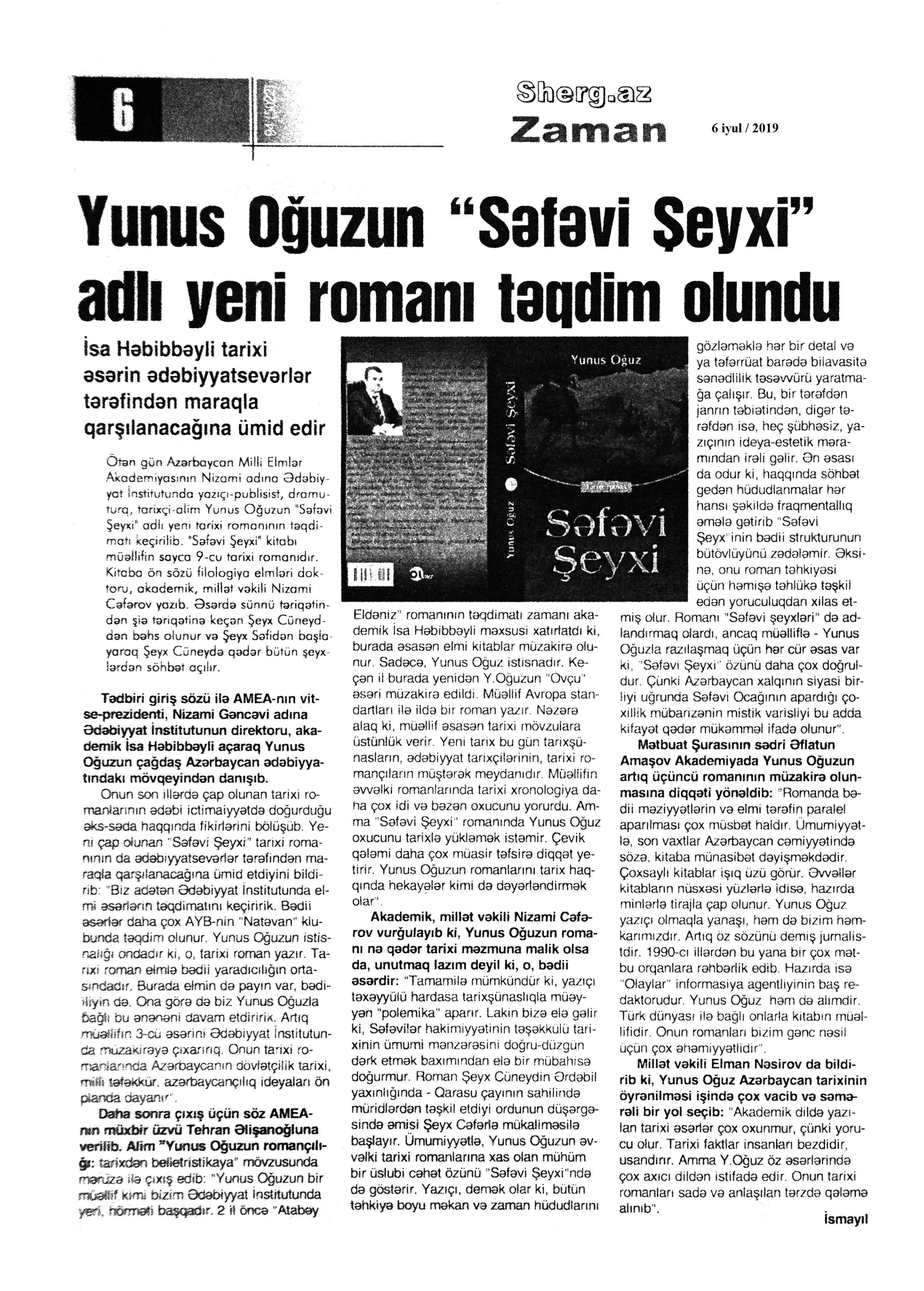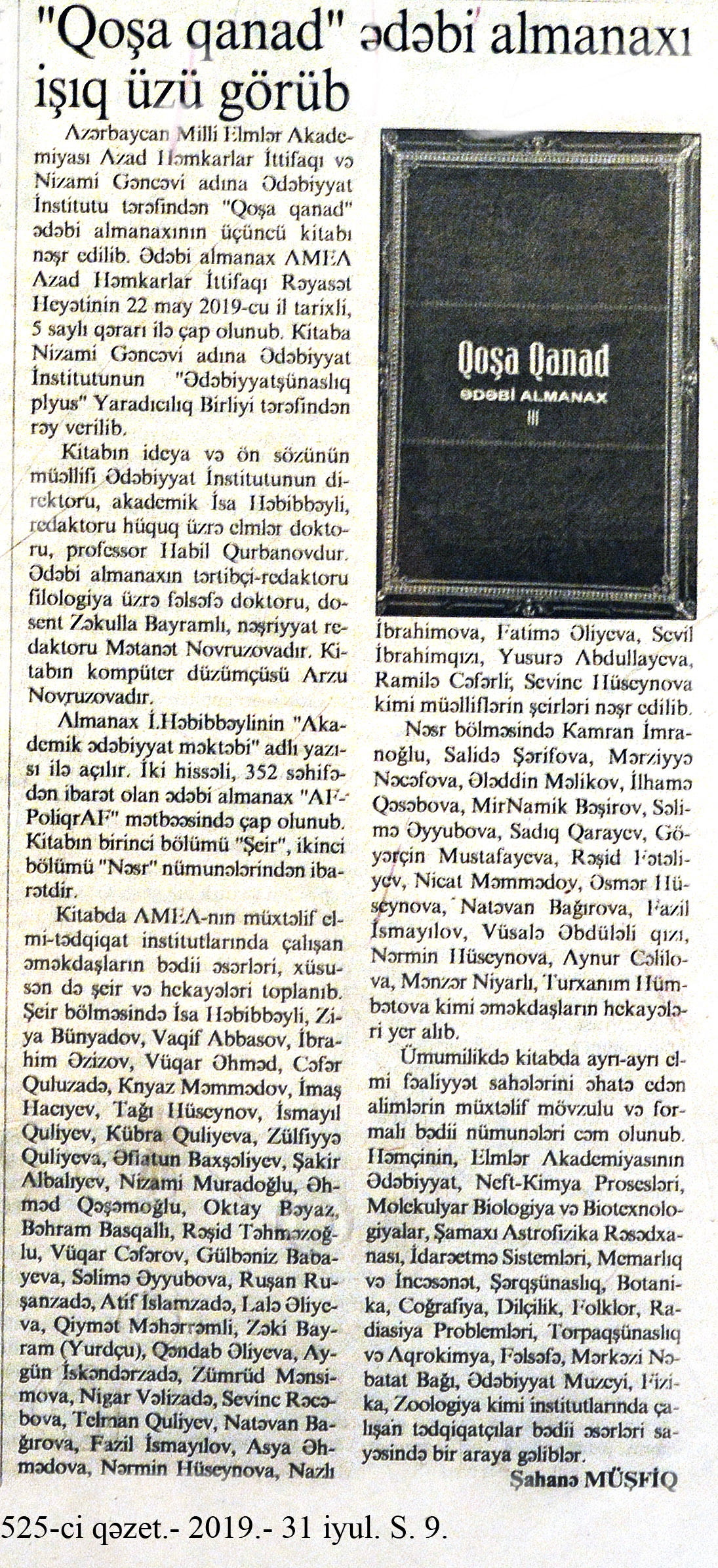 ƏDƏBİYYATŞÜNASLIQ VƏ ƏDƏBİ TƏNQİD 827. Abbas, A. Ədəbiyyatın mizanı pozulub: Aqil Abbas: “Bədii dil mənə Allah tərəfindən verilib, ictimai dili sonra öyrənmişəm”: [yazıçı ilə söhbət] /söhbətləşdi Rəvan Cavid; Fərid Hüseyn //Kaspi.- 2019.- 6-8 iyul.- S.17.; Ədalət. -2019.-9 iyul.- S.4. 828. Abbas, O. Tofiq Nurəli: Ən qəmli şairi mənəm bu yurdun: Görəsən, dünyanın kədəri çoxdur, yoxsa sevinci?: [şairin yaradıcılığı haqqında] //Ədalət. - 2019.- 4 iyul.- S.6. 829. Abbaslı, T. ANA DİLİmizin – ATA isim-sifətlərindən, “əzəl mübtəda”larından Əbdüləzəl Dəmirçizadə... //Mədəniyyət.- 2019.- 10 iyul.- S.6. 830. Abbasova, S. Ölüm sevinməsin qoy: [filologiya elmləri doktoru, professor, mərhum Əzizxan Tanrıverdiyev haqqında] //Palitra.- 2019.- 17 iyul.- S.7. 831. Abdulla, A. Tofiq Abdin xatirələrdə //Ədalət.- 2019.- 30 iyul.- S.7. 832. Abiyeva, K. Aristokratlığı ilə seçilən fərqli xanım: [şairə Kəmalə Abiyeva ilə müsahibə] //Ədalət.- 2019.- 13 iyul.- S.9. 833. Adıgözəl, H. Atatürk, Nərimanov və Türk Qurtuluş Savaşı //Respublika.- 2019.- 19 iyul.- S.6. 834. Adıgözəl, X. “Ən güclü şeirlər bəstəboy olur” //525-ci qəzet.- 2019.- 10 iyul.- S.21. 835. Ağayev, E. “Dağdan ağır kişilər” kitabı haqqında bir neçə söz: [jurnalist Həmzə Vəliməmmədovun eyniadlı kitabı haqqında] //Ədalət.- 2019.- 26-27 iyul.- S.13. 836. Ağayeva, A. “Məşhur adamın məşuqəsi” – Xanım yazardan ilginc etiraflar: Aygül Ağayeva: Kişilər ehtirası, qadınlar hissləri sevirlər...: [eyniadlı kitabın müəllifi ilə müsahibə] /müsahibəni apardı Leyla Əsədullayeva //525-ci qəzet.- 2019.- 17 iyul.- S.24. 837. Ağayeva Kəmalə [AYB-nin və NMR Yazıçılar Birliyinin başsağlığı məktubu] //Ədəbiyyat qəzeti.- 2019.-20 iyul.- S.25. 838. Axundov, B. Hüseyn Cavidin ev-muzeyində Ərtoğrul Cavidə aid eksponatlar //Səs.- 2019.- 19 iyul.- S.11. 839. Akademik Məmmədağa Şirəliyevin 110 illiyi qeyd olunacaq //Mədəniyyət - 2019.- 24 iyul.- S.1-2. 840. Akimova, E. Günəşi içənlərin türküsü: [milli poeziya haqqında] //Ədəbiyyat qəzeti.- 2019.- 20 iyul.- S.6-7. 841. Alim.; Nigar. Azərbaycan ədəbiyyatı tarixində Yunus Oğuz missiyası: İsa Həbibbəyli: Onun tarixi romanlarında Azərbaycanın dövlətçilik tarixi, milli təfəkkür, azərbaycançılıq ideyaları ön planda dayanır: Nizami Cəfərov: Yunus Oğuz Azərbaycan tarixinin epopeyasını yaradıb: [AMEA-nın Nizami Gəncəvi adına Ədəbiyyat İnstitutunda yazıçı-publisistin “Səfəvi-Şeyxi” romanının elmi müzakirəsində akademiklər İsa Həbibbəyli, Nizami Cəfərov və başqaları çıxış ediblər] //Olaylar.-2019.- 6-8 iyul.- S.8-9. 842. AMEA-da yazıçı-publisist Yunus Oğuzun “Səfəvi Şeyxi” tarixi romanının təqdimatı olub //Ədəbiyyati qəzeti.- 2019.- 6 iyul.- S. 16. 843. AMEA-nın Yüksək Texnologiyalar Parkında “Qoşa qanad: VI Fizika və lirika konfransı” keçirilib: [AMEA-nın Azad Həmkarlar İttifaqı və Nizami Gəncəvi adına Ədəbiyyat İnstitutunun birgə təşkilatçılığı ilə] //Ədəbiyyat qəzeti.- 2019.-20 iyul.- S.2. 844. Aras, O. Bir kitab, bir dövr...: [tatar ədəbiyyatının banisi Fatih Kərimi haqqında] //Ədəbiyyat qəzeti.- 2019.- 6 iyul.- S.11. 845. Arif Əmrahoğlusuz beş il: sosial şəbəkə qeydləri [filoloq Arif Əmrahoğlu haqqında] //525-ci qəzet.- 2019.- 19 iyul.- S.10. 846. Aslan, Ş. “Hər şeydən narazı adamları ciddiyə almıram”: Gənclər nə istəyir?: [şairə-tərcüməçi Rəbiqə Nazimqızının, yazıçı-jurnalist Cavid Zeynallının, jurnalist Tural Turanın və başqalarının mövzu ətrafında fikirləri] //525-ci qəzet.- 2019.- 5 iyul.- S.13. 847. Aslan, Ş. İşıq mənbəyi olan idrakın ətri: [Paşa Qəlbinurun “İdrak ətri” kitabı haqqında] //525-ci qəzet.- 2019.- 6 iyul.- S.18. 848. Aslan, Ş. 10 misralıq şeir müsabiqəsi: [“525-ci qəzet”in baş redaktoru Rəşad Məcidin Feysbuk sosial şəbəkəsində elan etdiyi müsabiqənin qaliblərinin şeirləri] //525-ci qəzet.-2019.- 10 iyul.- S.19. 849. “Ay işığı” kitabı çapdan çıxıb: [“Ulduzlu nəşrlər” seriyasından gənc tərcüməçi-yazıçı Məmməd Məmmədlinin ispan dilindən tərcümə etdiyi eyniadlı kitabı haqqında] //Xalq cəbhəsi.- 2019.- 20-22 iyul.- S.8. 850. Aydın, Ü. Dördüncü ömrünü yaşayan Xalq yazıçısı: [İsa Muğanna haqqında] //Ədalət.- 2019.- 6 iyul.- S.9. 851. Aydınoğlu, T. “Azərbaycan ədəbiyyatı tarixi” oncildliyinin ilk kitabı çapdan çıxıb: [AMEA-nın Nizami Gəncəvi adına Ədəbiyyat İnstitutunda] //Xalq qəzeti.- 2019.-7 iyul.- S.6. 852. Aytel, İ. Dünyanın gözəlliyi ondadı ki...: [Nizaməddin Şəmsizadənin “İdrakın üfüqləri” kitabı haqqında] //Ədəbiyyat qəzeti.- 2019.-22 iyul.- S.23. 853. Azərbaycan ədəbiyyatı Fransa Milli Kitabxanasına yerləşdirilib //Türküstan.- 2019.- 16-22 iyul.- S.16. 854. Babasoy, Ü. Ədəbi mətndə mən və başqası: “Xəz paltolu Madonna” romanında “Üçbucaq arzu”: [Səbahəddin Əlinin eyniadlı əsəri haqqında] //Ədəbiyyat qəzeti.- 2019.- 27 iyul.- S.25. 855. Babasoy, Ü. Qarışqalara kim şəkər verəcək?: [İkinci Mahmudun “Tanımal Mustafa” hekayəsi haqqında] //Kaspi.- 2019.- 13-15 iyul.- S.21. 856. Babayeva, G. Mətbuat tariximizin və publisistikamızın araşdırılması yolunda: AMEA Nizami adına Ədəbiyyat İnstitutu Mətbuat tarixi və publisistika şöbəsinin yaradlmasından 5 il keçir //525-ci qəzet.- 2019.- 20 iyul.- S.21. 857. Babayeva, G. Mollanəsrəddinçi publisistikada elm və təhsil problemləri //Kredo.- 2019.- 11 iyul.- S.12. 858. Babazadə, Ə. Yaşar Bünyadın “Azan gəmilər limanı” romanı haqda //Ədəbiyyat qəzeti.- 2019.- 6 iyul.- S.31. 859. Bakirov, M.X. Mixi mətnlərin g