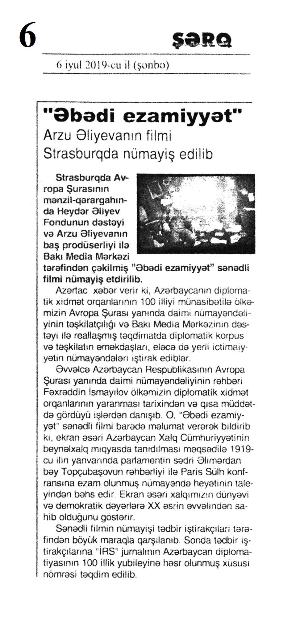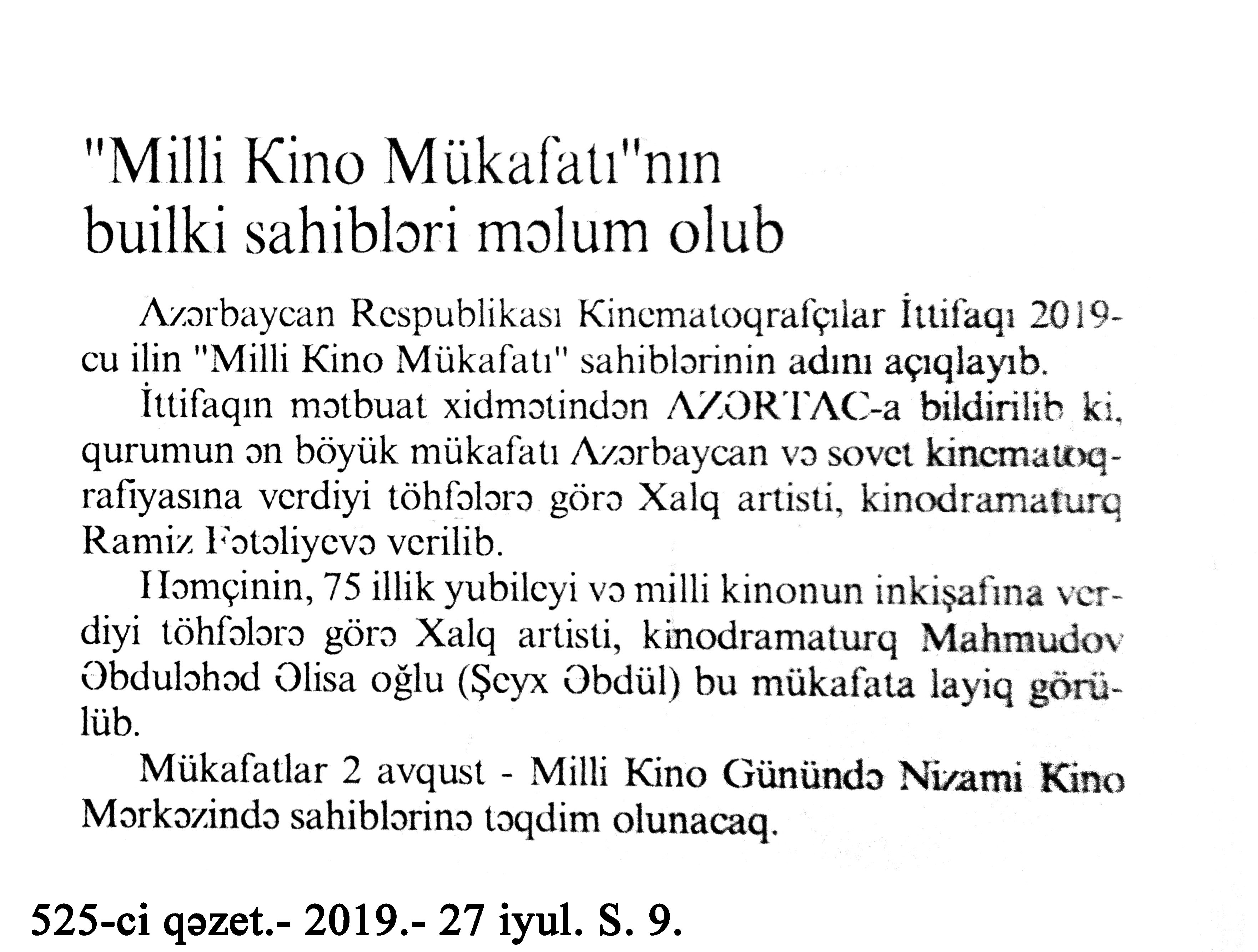 KİNO 604. Ağalarova, Ş. Avropa Şurasında “Əbədi ezamiyyət” sənədli filmi nümayiş etdirilib: [Heydər Əliyev Fondunun dəstəyi və Arzu Əliyevanın baş prodüserliyi ilə Bakı Media Mərkəzi tərəfindən çəkilmiş eyniadlı filmin nümayişi haqqında] //Xalq qəzeti.-2019.- 6 iyul.- S. 4. 605. “Cinema Radio” layihəsinə start verilir: [Mədəniyyət Nazirliyinin dəstəyi ilə yayımlanacaq verilişdə dünyada və yerli kino bazarında baş verən ən son yeniliklər təqdim ediləcək] //Mədəniyyət.-2019.- 17 iyul.- S.1. 606. “Çölçü” filmi yenə də beynəlxalq mükafatlara layiq görülüb: [ABŞ-da “Ən yaxşı xarici film” və İtaliyada keçirilən “May mövsümünün ən yaxşı bədii filmi” mükafatlarına layiq görülən Şamil Əliyevin eyniadlı filmi haqqında] //Kaspi.-2019.- 18 iyul.- S.8. 607. “Çölçü” filminin yeni mükafatları: [Şamil Əliyevin eyniadlı filmi ABŞ-da və İtaliyada mükafata layiq görülüb] //Mədəniyyət.-2019.- 19 iyul.- S.8. 608. “Əbədi ezamiyyət” Avropa Şurasında göstərilib: [Heydər Əliyev Fondunun dəstəyi və Arzu Əliyevanın baş prodüserliyi iləBakı Media Mərkəzi tərəfindən çəkilmiş eyniadlı sənədli filmin nümayişi haqqında] //525-ci qəzet.-2019.- 6 iyul.- S.12. 609. “Əbədi ezamiyyət”: Arzu Əliyevanın filmi Strasburqda nümayiş edilib //Şərq.-2019.- 6 iyul.- S.6. 610. Gənc rejissorun filmi beynəlxalq festivalda uğur qazanıb: [Ruslan Ağazadənin “İnsan” filminin Xorvatiyada keçirilən “Croatian One-Minute” festivalında ikinci yerə layiq görülməsi haqqında] //Mədəniyyət.-2019.- 17 iyul.- S.2. 611. Gözəl insan, gözəl sənətkar: [Azərbaycan kinosunda özünəməxsus dəst-xətti ilə seçilən Əməkdar incəsənət xadimi, Dövlət mükafatı laureatı, görkəmli kinooperator, kinorejissor Rasim İsmayılov haqqında] //Mədəniyyət.-2019.- 12 iyul.- S. 1;6. 612. Hacı Zeynalabdin Tağıyev haqqında film ABŞ-da: [Cəlaləddin Qasımovun “100 il şərəfli ömür” filmi haqqında] //Xalq cəbhəsi.-2019.- 16 iyul.- S.8. 613. Hüseynov, Ə.“Yoxlama”ya sözardı: [Vaqif Mustafayevin çəkdiyi eyniadlı teleserial haqqında] //525-ci qəzet.-2019.- 3 iyul.- S.18. 614. Hüseynov, Ə. M. Zirvədən baxanda: “Yeddi oğul istərəm” – 50: [Tofiq Tağızadənin eyniadlı filmi haqqında] //525-ci qəzet.-2019.- 24 iyul.- S.14. 615. İtaliyada üç Azərbaycan filmi mükafata layiq görülüb: [Cəlaləddin Qasımovun filmlərinin“Under The Stars İnernational” film festivalında mükafata layiq görülməsi haqqında] //Türküstan.-2019.- 23 iyul- 5 avqust.- S.16. 616. Qəribli, M.Rusiya yazıçısı Kəlbəcərdə alban kilsəsini erməniləşdirən film çəkdi...: [ermənipərəst şair, yazıçı Viktor Konoplyovun Xudavəng məbədini erməni monastrı kimi təqdim edən “Fəth olunmaz Artsax” adlı filmi haqqında] //Bakı Xəbər.-2019.- 1 iyul.- S.3. 617. Məhərrəmova, T. 50 yaşlı personajlar: Dovşan və Canavarın, Çeburaşkanın, Timsah Genanın yubileyidir: [“Soyuzmultfilm” animasiya studiyasının fəaliyyəti haqqında] //Kaspi.-2019.- 20 iyul.- S.6. 618. Mərkəzi Elmi Kitabxanada Zəngəzur haqqında kitab təqdim olunub: [Dövlət Dəstəyi Şurasının layihəsi çərçivəsində“Zəngəzur” Cəmiyyətləri İctimai Birliyi tərəfindən nəşr edilən “Zəngəzur: 100 sual, 100 cavab” adlı kitabın və “Zəngəzur” tarixi sənədli filminin disk-albomunun təqdimatı olub] //525-ci qəzet.-2019.- 10 iyul.- S.13. 619. “Milli Kino Mükafatı”nın builki sahibləri məlum olub: [Azərbaycan Respublikası Kinematoqrafçılar İttifaqı 2019-cu ilin eyniadlı mükafat sahiblərini açıqlayıb] //525-ci qəzet.- 2019.- 27 iyul.- S.9. 620. Prezident daha bir xalq artistinə ev bağışladı: [Xalq artisti Məmmədsəfa Qasımova] //Olaylar.-2019.- 6-8 iyul.- S.2. 621. “Salnaməfilm” studiyasında yeni film çəkilir: [Azərbaycanın Milli Qəhrəmanları silsiləsindən Emin Əfəndiyevin “Mirpaşa” adlı növbəti sənədli filmi Azərbaycanın Milli Qəhrəmanı Hidayət Rüstəmov haqqındadır] //Mədəniyyət.-2019.- 26 iyul.- S.5. 622. “Son nəfəsədək”: [“İlğım” qrupunun təşkilatçılığı ilə BGM-də Nurəddin Aslanovun eyniadlı filmini nümayişi haqqında] //Xalq cəbhəsi.-2019.- 23-24 iyul.- S.8. 623. Şahbazov, R.“Ən böyük arzum günlük deyil, həftəlikserial çəkməkdir”: Rüfət Şahbazov: Seriallarımızda insanlara mənfiləri göstərərək müsbət mesajlar verməyə çalışırıq: [rejissor Rüfət Şahbazovla müsahibə] /müsahibəni apardı Oruc Könül //Üç nöqtə.-2019.- 16 iyul.- S.7. 624. “TRT World”ün Qarabağ münaqişəsi ilə bağlı filmi mükafat qazanıb: [film ABŞ-ın Los-Anceles şəhərində keçirilən Hollivud Beynəlxalq qısametrajlı film festivalında “Ən yaxşı qısa sənədli film” mükafatına layiq görülüb] //Mədəniyyət.-2019.- 12 iyul.- S.3. Bax: 16; 41; 55; 1177; 1188; 1202 TEATR 625. Bitən mövsümdən akkordlar: [Azərbaycan teatrlarınin daha bir mövsümü başa vurmaqları haqqında] //Mədəniyyət.-2019.- 17 iyul.- S.1;5. 626. Bürcəliyev, A. M.İrəvan Teatrının “Ürəyində arzu tut” tamaşası Gəncədə: [Sevinc Elsevərin eyniadlı əsərinin tamaşası haqqında] //Cümhuriyət.-2019.-9 iyul.- S.14. 627. Bürcəliyev, A. M. Səhnə həyat nurumdur: (Respublikanın Xalq artisti Sədayə Müstafayevanın əziz xatirəsinə) //Cümhuriyət.-2019.-9 iyul.- S.14.; Ədalət.-2019.- 16 iyul.- S.8. 628. Bürcəliyev, A. M. Sənət fədailəri və ya unudulmağa məhkum olanlar: (Aktyor Zakir Şahbazovun əziz xatirəsinə): IX yazı //Ədalət.-2019.- 2 iyul.- S.6.; Hürriyyət.-2019.-4-5 iyul.- S.14.; Cümhuriyət.-2019.-2 iyul.- S.14. 629. Bürcəliyev, A. M. Sənət fədailəri və ya unudulmağa məhkum olanlar: (Gürcüstan Respublika
