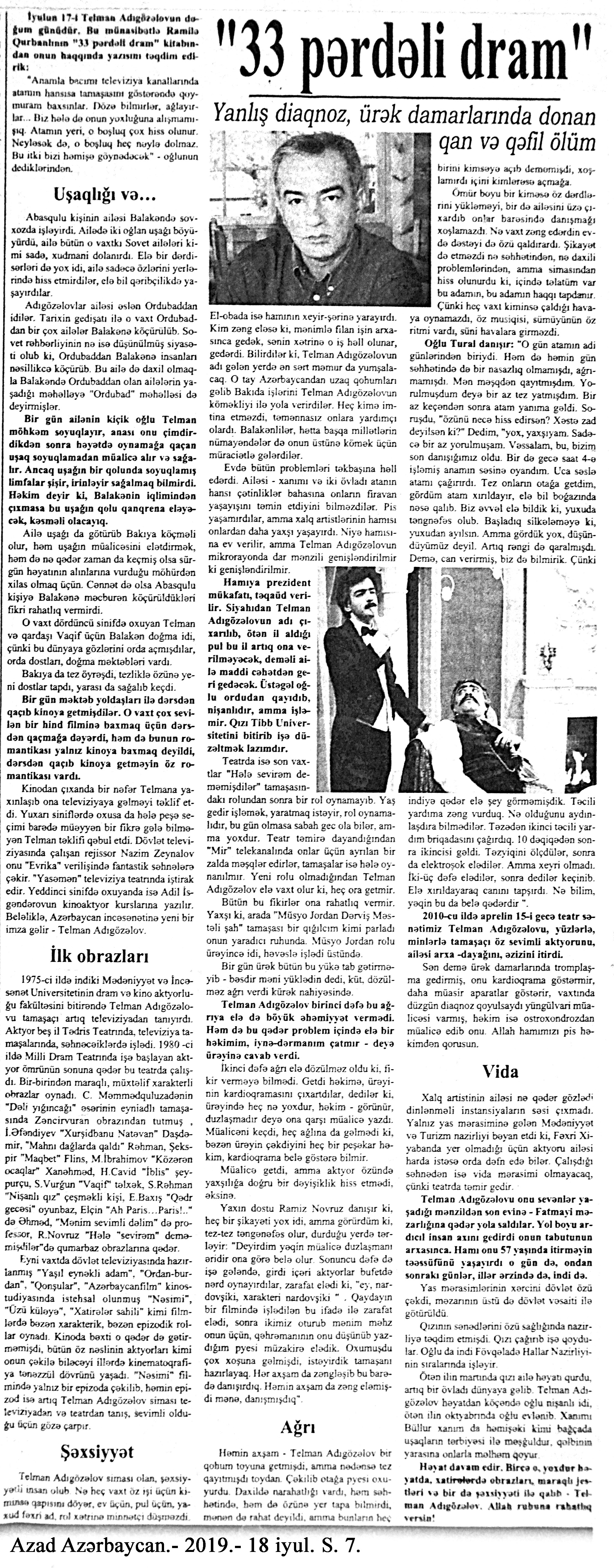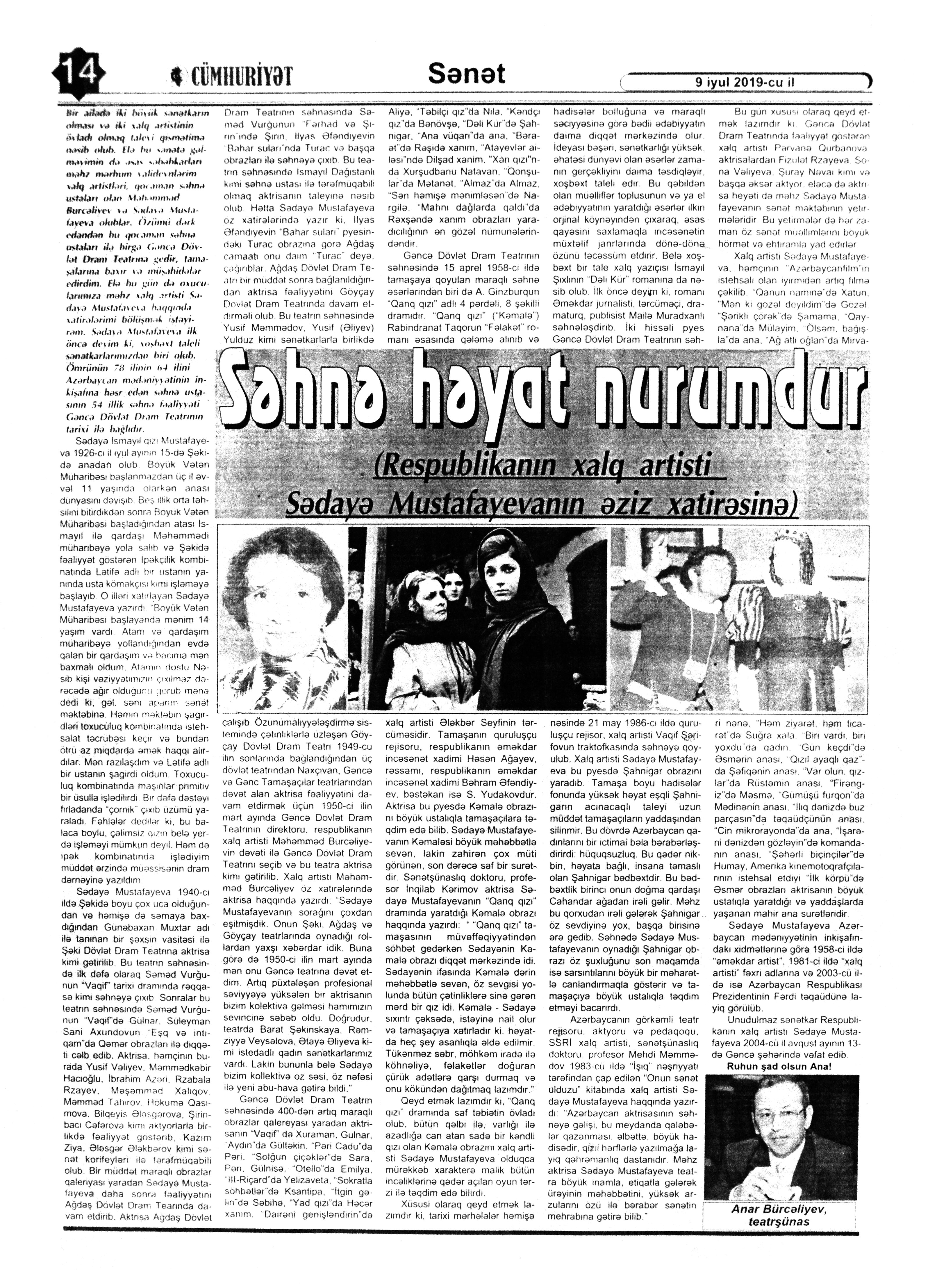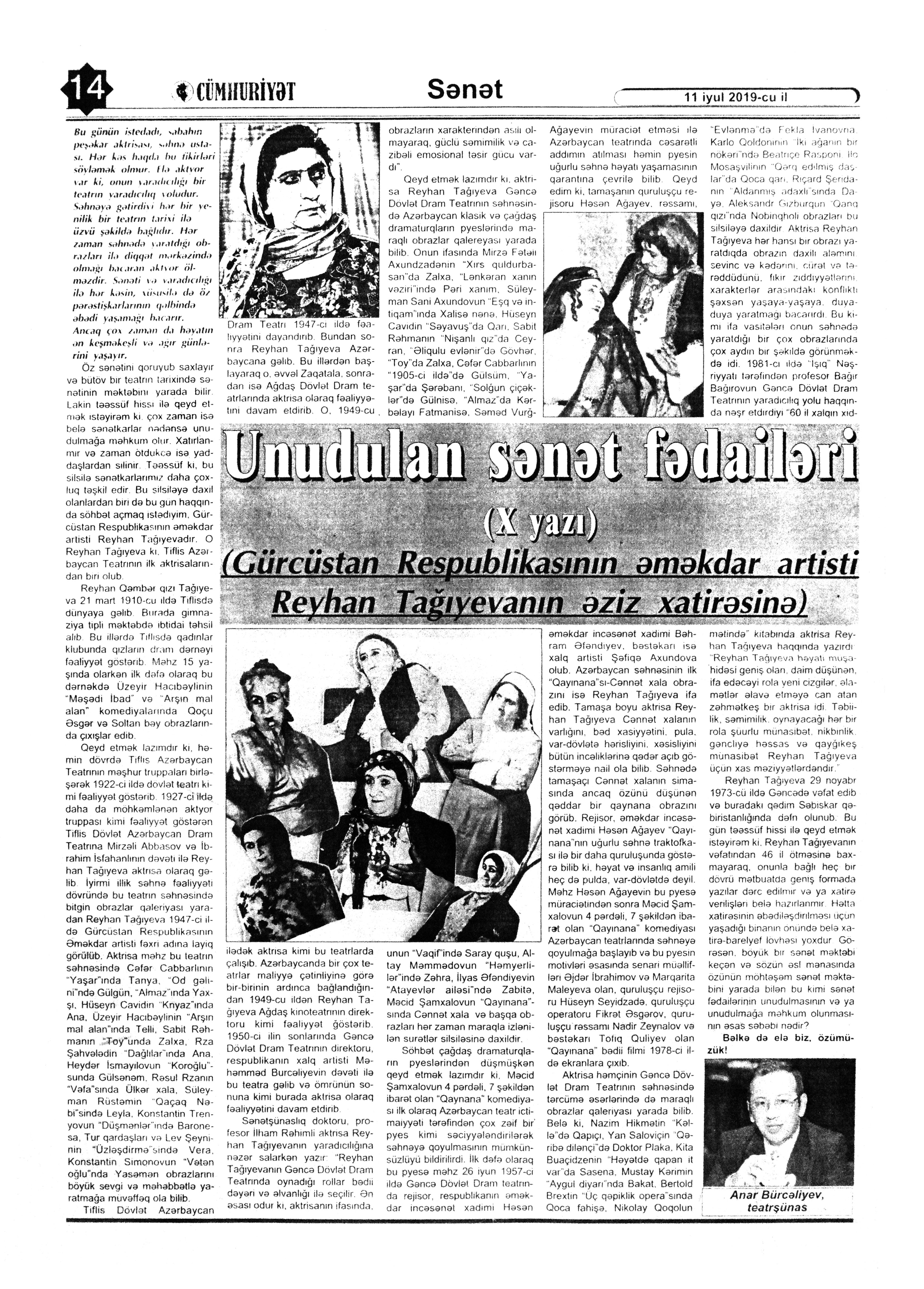 Azərbaycan Dövlət Akademik Musiqili Teatrı 677. Akademik Musiqili Teatr mövsümə yekun vurur //Palitra.-2019.- 5 iyul.- S.16. 678. Akademik Musiqili Teatrın müsabiqəsinin nəticələri məlum olub: [istedadlı gənclərin üzə çıxarılması və işə qəbulu ilə bağlı müsabiqənin ilk seçim turu haqqında] //Şərq.-2019.- 23 iyul.- S.13. 679. Həmidə. Mövsüm ərzində seçilənlər mükafatlandırıldı: [Dövlət Akademik Musiqili Teatrında] //Mədəniyyət.-2019.- 5 iyul.- S.1;4. 680. Musiqili teatrda keçirilən müsabiqənin nəticələri açıqlanıb: [istedadlı gənclərin üzə çıxarılması və işə qəbulu ilə bağlı müsabiqənin ilk seçim turu keçirilib] //Mədəniyyət.-2019.- 24 iyul.- S.5. 681. Musiqili Teatrda müsabiqə: [istedadlı gənclərin üzə çıxarılması və işə qəbulu ilə bağlı keçirilən müsabiqə haqqında] //Xalq cəbhəsi.-2019.- 23-24 iyul.- S.8. Azərbaycan Dövlət Gənc Tamaşaçılar Teatrı 682. Atakişiyeva, A. Ç.“Oynadığım hər bir roluma ayrıcasevgim var”: Asya Atakişiyeva: Uşaq tamaşalarında oynamaq uşaqlar qarşısında çıxış etmək mənim üçün həqiqətən bir zövqdür: [aktrisa ilə müsahibə] /müsahibəni apardı Oruc Könül //Üç nöqtə.-2019.- 18 iyul.- S.7. 683. Əbdülsəmədova, Z. F. Biz aktyorlar həmişə yeni obraza başlayanda daxilən sıfırlanırıq: “Dördüncü divar” layihəsinin bugünkü qonağı Zemfira Əbdülsəmədovadır /söhbətləşdi Samirə Əşrəf //Ədəbiyyat qəzeti.-2019.- 13 iyul.- S.28-29. 684. Gənc Tamaşaçılar Teatrı mövsümü “Müharibə” tamaşası ilə bağladı //525-ci qəzet.-2019.- 12 iyul.- S.9. 685. Hacıbabayev, E.“Epizodik rol baş roldan çətindir”: Elşən Hacıbabayev: Əsas baş rola qaçmaq deyil, rolu düzgün oynadıqda epizodik rol da gözəldir: [aktyor ilə müsahibə] /müsahibəni apardı Könül Oruc //Üç nöqtə.-2019.- 25 iyul.- S.7. 686. Müşfiq, Ş.“Kontrabas” növbəti dəfə Beynəlxalq Festivallara qatılacaq: [Əməkdar artist Şövqi Hüseynovun hazırladığı tamaşa haqqında] //525-ci qəzet.-2019.- 3 iyul.- S.13.