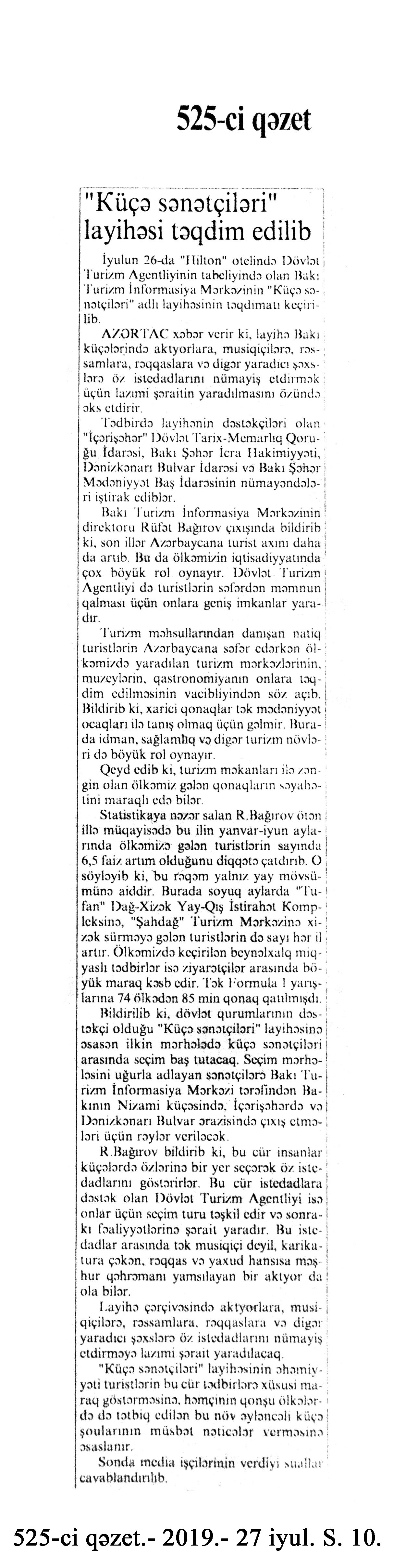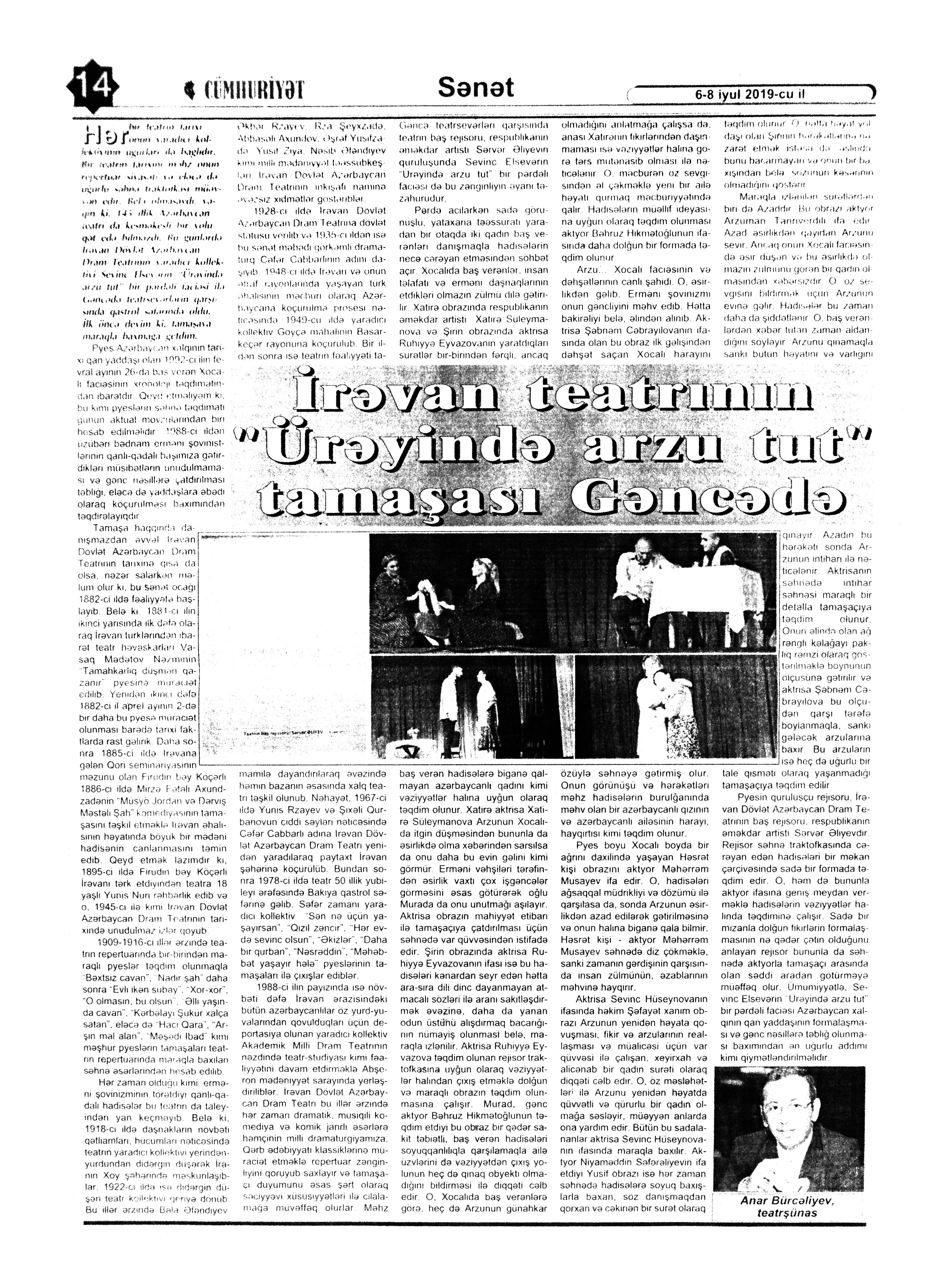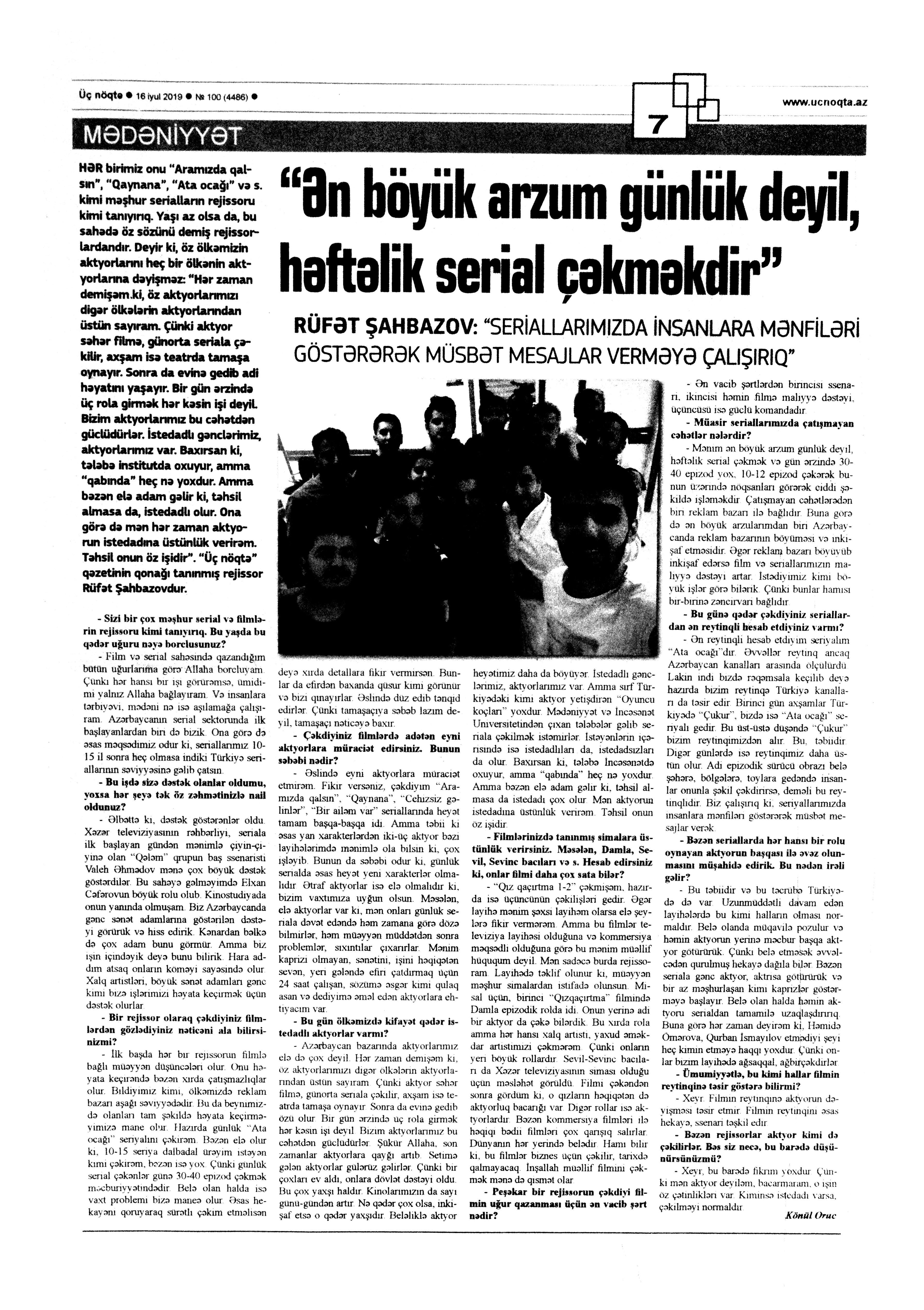 Azərbaycan Dövlət Akademik Musiqili Teatrı 677. Akademik Musiqili Teatr mövsümə yekun vurur //Palitra.-2019.- 5 iyul.- S.16. 678. Akademik Musiqili Teatrın müsabiqəsinin nəticələri məlum olub: [istedadlı gənclərin üzə çıxarılması və işə qəbulu ilə bağlı müsabiqənin ilk seçim turu haqqında] //Şərq.-2019.- 23 iyul.- S.13. 679. Həmidə. Mövsüm ərzində seçilənlər mükafatlandırıldı: [Dövlət Akademik Musiqili Teatrında] //Mədəniyyət.-2019.- 5 iyul.- S.1;4. 680. Musiqili teatrda keçirilən müsabiqənin nəticələri açıqlanıb: [istedadlı gənclərin üzə çıxarılması və işə qəbulu ilə bağlı müsabiqənin ilk seçim turu keçirilib] //Mədəniyyət.-2019.- 24 iyul.- S.5. 681. Musiqili Teatrda müsabiqə: [istedadlı gənclərin üzə çıxarılması və işə qəbulu ilə bağlı keçirilən müsabiqə haqqında] //Xalq cəbhəsi.-2019.- 23-24 iyul.- S.8. Azərbaycan Dövlət Gənc Tamaşaçılar Teatrı 682. Atakişiyeva, A. Ç.“Oynadığım hər bir roluma ayrıcasevgim var”: Asya Atakişiyeva: Uşaq tamaşalarında oynamaq uşaqlar qarşısında çıxış etmək mənim üçün həqiqətən bir zövqdür: [aktrisa ilə müsahibə] /müsahibəni apardı Oruc Könül //Üç nöqtə.-2019.- 18 iyul.- S.7. 683. Əbdülsəmədova, Z. F. Biz aktyorlar həmişə yeni obraza başlayanda daxilən sıfırlanırıq: “Dördüncü divar” layihəsinin bugünkü qonağı Zemfira Əbdülsəmədovadır /söhbətləşdi Samirə Əşrəf //Ədəbiyyat qəzeti.-2019.- 13 iyul.- S.28-29. 684. Gənc Tamaşaçılar Teatrı mövsümü “Müharibə” tamaşası ilə bağladı //525-ci qəzet.-2019.- 12 iyul.- S.9. 685. Hacıbabayev, E.“Epizodik rol baş roldan çətindir”: Elşən Hacıbabayev: Əsas baş rola qaçmaq deyil, rolu düzgün oynadıqda epizodik rol da gözəldir: [aktyor ilə müsahibə] /müsahibəni apardı Könül Oruc //Üç nöqtə.-2019.- 25 iyul.- S.7. 686. Müşfiq, Ş.“Kontrabas” növbəti dəfə Beynəlxalq Festivallara qatılacaq: [Əməkdar artist Şövqi Hüseynovun hazırladığı tamaşa haqqında] //525-ci qəzet.-2019.- 3 iyul.- S.13.