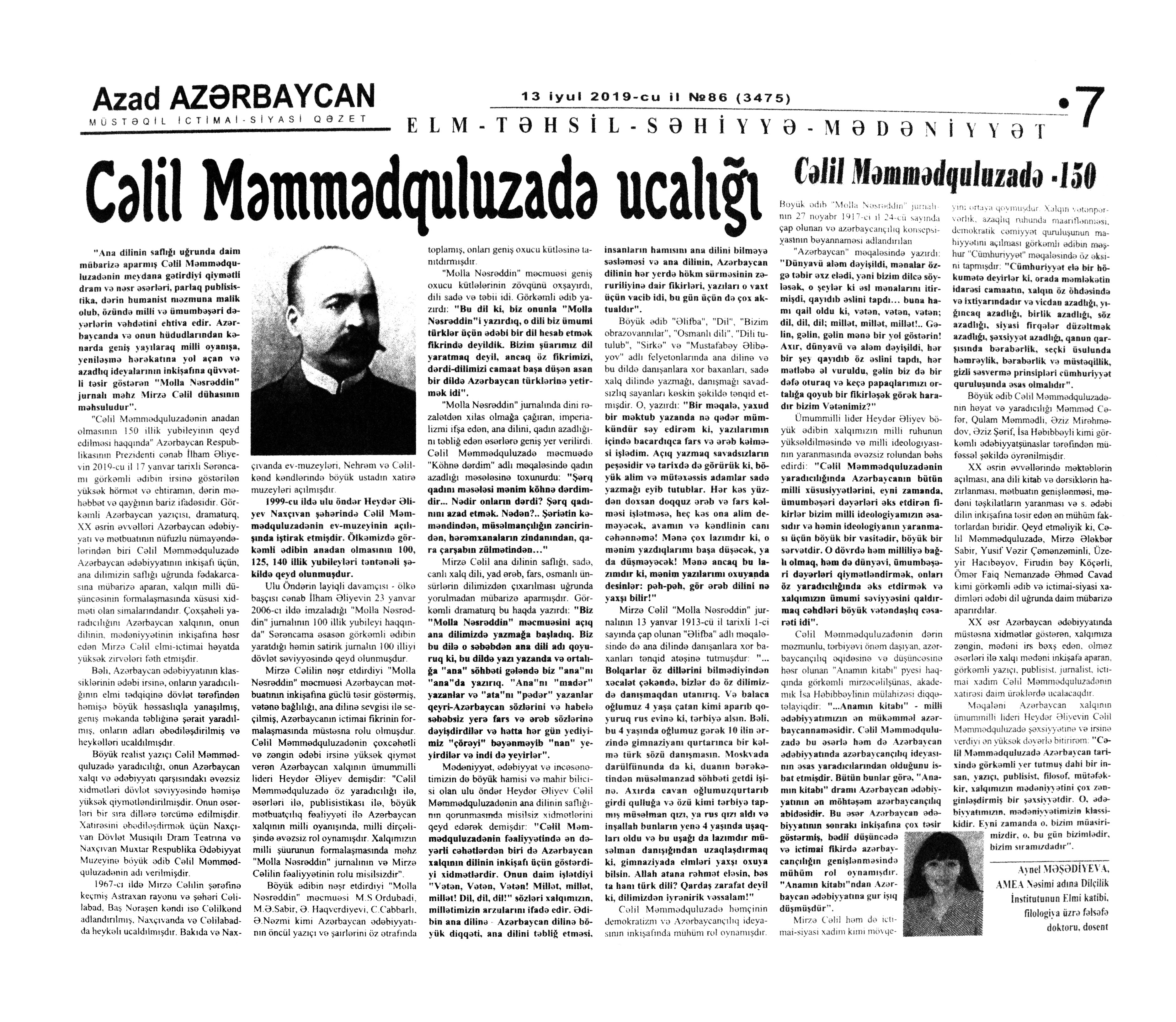 Bax: 745 Cəlil Məmmədquluzadə – 150 1169. Babayeva, G. Mollanəsrəddinçi publisistikada elm və təhsil problemləri //Kredo. -2019.- 18 iyul.- S.5,7. 1170. “Dəli yığıncağı”: səhnədən-səhnəyə: [Cəlil Məmmədquluzadənin eyniadlı əsəri 41 illik fasilədən sonra yenidən tamaşaya qoyuldu] //Mədəniyyət.-2019.- 12 iyul.- S. 1. 1171. “Dəli yığıncağı” tamaşası: [Cəlil Məmmədquluzadənin eyniadlı pyesi əsasında Bəhram Osmanovun hazırladığı tamaşa haqqında] //Olaylar.-2019.- 2-3 iyul.- S.13. 1172. İnanmırsınız, “Dəli yığıncağı”na düşmüşük?: [C.Məmmədquluzadənin əsəri əsasında sonuncu dəfə Mehdi Məmmədovun hazırladığı eyniadlı tamaşa 41 illik fasilədən sonra Bəhram Osmanovun quruluşunda yenidən səhnədə] //Mədəniyyət.-2019.- 12 iyul.- S. 7. 1173. Məmmədova, Y. Maarif fədaisi: Mirzə Cəlil-150 //Ədalət.- 2019.- 30 iyul.- S.4. 1174. Məşədiyeva, A. Cəlil Məmmədquluzadə ucalığı: Cəlil Məmmədquluzadə – 150 //Azad Azərbaycan.- 2019.- 13 iyul.- S.7 1175. Səhnədən-səhnəyə: [C.Məmmədquluzadənin “Dəli yığıncağı” pyesi Cənnət Səlimovanın quruluşunda] //Mədəniyyət.-2019.- 12 iyul.- S. 7.