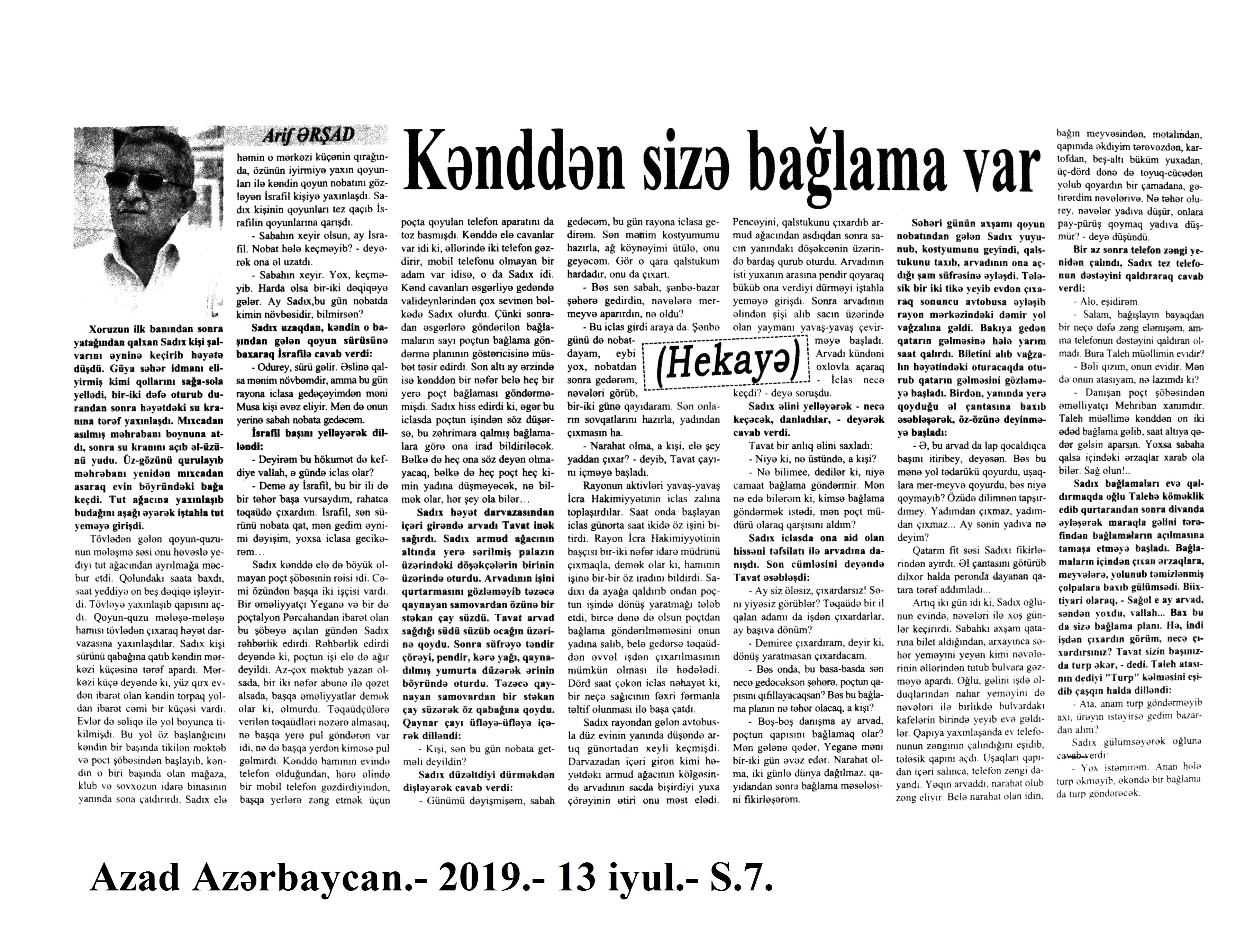 Bax: 950; 1181; 1201; 1204 HEKAYƏLƏR 769. Abdulla, M. Saçlarından asılan qız //Ədəbiyyat qəzeti.- 2019.-27 iyul.- S.7. 770. Barat, E. Zəhra //Ədəbiyyat qəzeti.- 2019.- 13 iyul.- S.25. 771. Bell, Q. Mənim günüm-güzəranım: [Şotlandiya ədəbiyyatı] /ingilis dilindən tərc.etdi Rauf Qaraişıq //Ədəbiyyat qəzeti.- 2019.- 27 iyul.- S.13. 772. Əhməd, R. Sevginin zamanı: Dünya ədəbiyyatından hekayələr: [müəllifin tərcüməsində] //Kaspi.- 2019.- 20 iyul.- S.19. 773. Əlioğlu, Ə. Kərənti Meydanalı; İkinci adın intiharı; Qəza: Hekayələr //Ədalət.- 2019.- 26-27 iyul.- S.10. 774. Əlioğlu, Ə. Kömür //Kaspi.- 2019.- 27-29 iyul.- S.23. 775. Ərşad, A. Kənddən sizə bağlamalar var //Azad Azərbaycan.- 2019.- 13 iyul.- S.7. 776. Ərşad, A.Lotoreya bileti //Azad Azərbaycan.- 2019.- 6 iyul.- S.7. 777. Əziz, İ.Nübar orucu //Ədəbiyyat qəzeti.- 2019.- 6 iyul.-S.13. 778. İmranoğlu, K. Pole çudes oyunu //525-ci qəzet.- 2019.- 13 iyul.- S.21. 779. İmranoğlu, K. Şeir dərsi //Kaspi.- 2019.- 13-15 iyul.- S.11. 780. İsabəyli, Q. Snayperçi əsir - erməni qızı... //Ədəbiyyat qəzeti.- 2019.- 13 iyul.- S.24. 781. İsaqoğlu, V. Molla Qara //Ədəbiyyat qəzeti.- 2019.-20 iyul.- S.30. 782. Malik, F. Ananın xalçası //525-ci qəzet.- 2019.- 12 iyul.- S.16. 783. Məhəmməd. Gün qızmamış: Nənəm Elmiraya həsr edirəm: //Ədalət.- 2019.- 19-20 iyul.- S.14. 784. Məhərrəmov, V. Hasar //Kaspi.- 2019.- 13-15 iyul.- S.23. 785. Nehrəmli, A. Konsert //Ədalət.- 2019.- 4 iyul.- S.8. 786. Öməroğlu, Y. Kazak, gördüyün əzab /hekayəni təqdim etdi Təranə Vahid //525-ci qəzet.- 2019.- 17 iyul.- S.21. 787. Pərvin. Xəyanət //525-ci qəzet.- 2019.- 6 iyul.- S.15. 788. Pərvin. Kəfənpulu //525-ci qəzet.- 2019.- 20 iyul.- S.18. 789. Pərvin. Piqmalion: [eyniadlı qədim yunan hekayəsi] //525-ci qəzet. - 2019.- 13 iyul.- S.16.