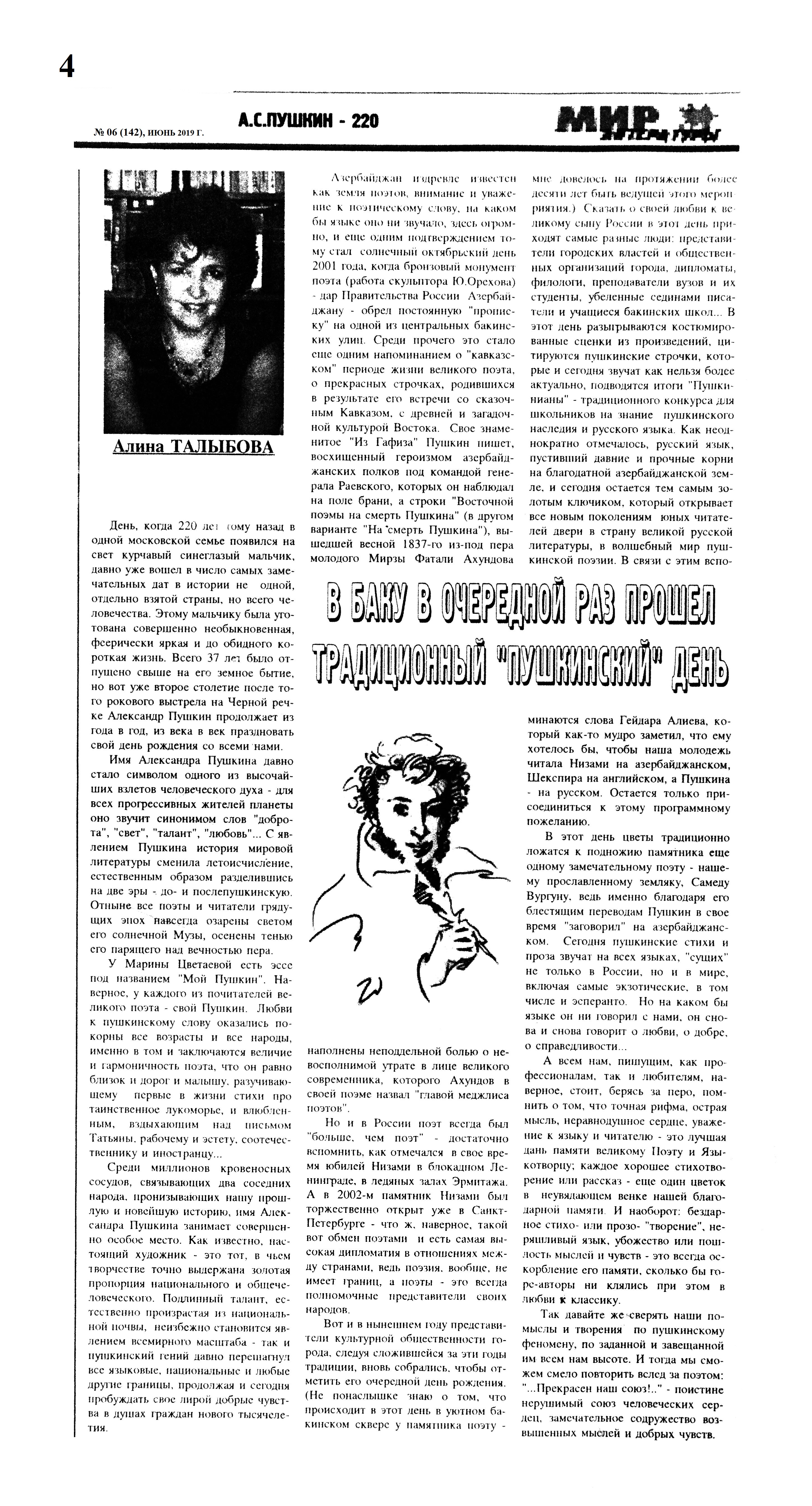 КУЛЬТУРНЫЕ СВЯЗИ 1363. Борисов, М. Михаил Борисов, профессор Театрального института им. Бориса Щукина: «Опыт нашего азербайджанского курса необходимо продолжить»: [интервью] //Азербайджанские известия.- 2019.- 20 июля.- С. 1, 3. 1364. В Центре Гейдара Алиева пройдет уникальная выставка иконописи: [экспонаты Третьяковской Галереи] //Бакинский рабочий. - 2019.- 25 июля.- С. 3. 1365. Мустафаев, Л. «Пушкиниана – 2019»: [одноименный проект в БГУ] //Мир литературы.- 2019.- № 06 (142), июнь. - С.10. 1366. Талыбова, А.В Баку в очередной раз прошел традиционный «пушкинский» день: [в БГУ] //Мир литературы.- 2019.- № 06 (142), июнь. - С.4.