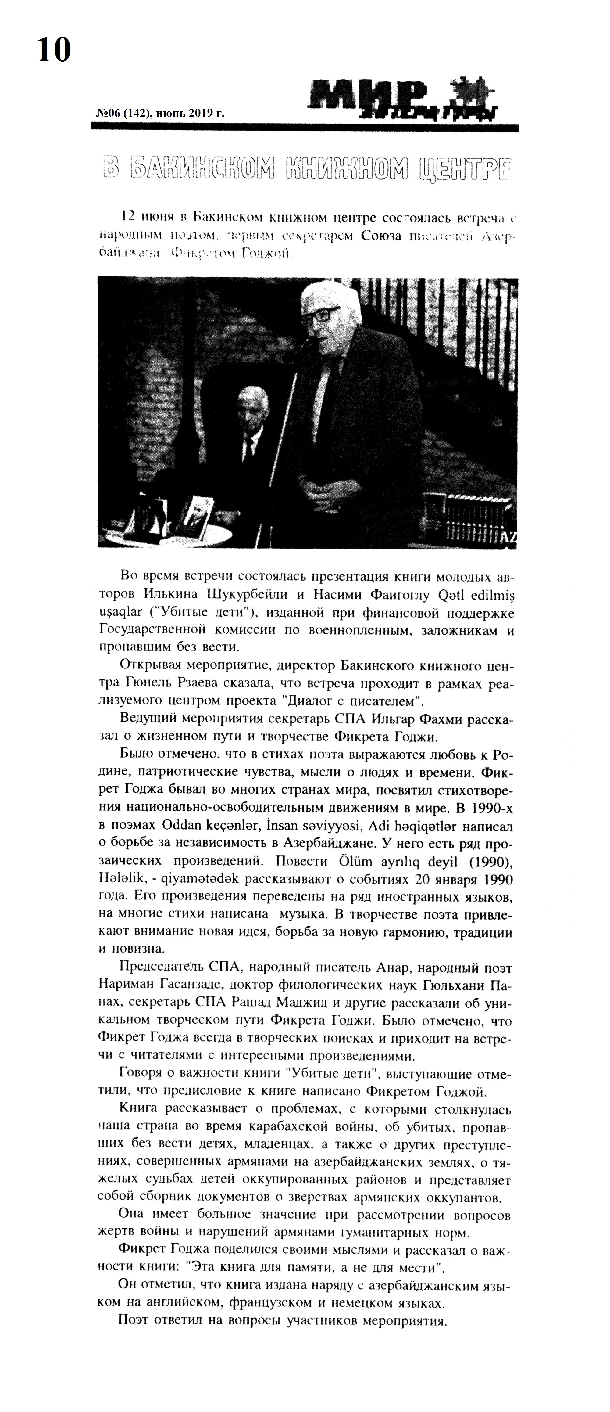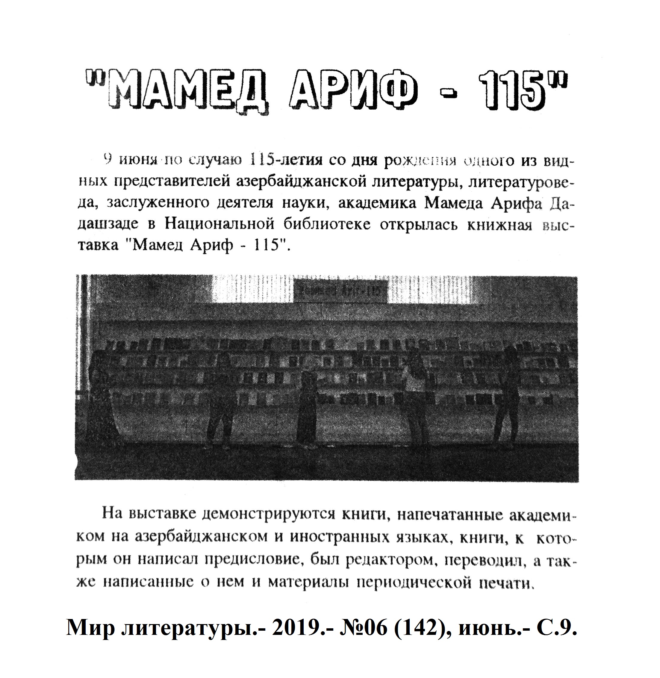 ЛИТЕРАТУРОВЕДЕНИЕ И ЛИТЕРАТУРНАЯ КРИТИКА 1437. Архивы истории: Поэт Гасым бек Закир – защитник слабых и угнетенных //Новое время.- 2019.- 3 июля.- С. 13. 1438. Ахундова, Э.«Я здесь, господи...»: [памяти народного поэта В.Самедоглу] //Мир литературы.- 2019.- № 06 (142), июнь. - С.3. 1439. В Бакинском книжном центре: [встреча с народным поэтом Фикретом Годжой] //Мир литературы.- 2019.- № 06 (142), июнь. - С.10. 1440. Васькив, Н. Азербайджанская литература в украинских книжных изданиях: [начиная с 1930 года] //Мир литературы.- 2019.- № 06 (142), июнь. - С.6-8. 1441. Велиева, С. Остаться бы наполовину: [стихи памяти народного поэта В.Самедоглу] //Мир литературы.- 2019.- № 06 (142), июнь. - С.4. 1442. Издана монография «МамедДжафар. ГусейнДжавид» //Бакинский рабочий.- 2019.- 12 июля.- С.7. 1443. Иманов, В. Дом, в котором горит свет: Новый роман Эльчина Сафарли - это история любви, потерь и обретения долгожданного покоя: [из беседы с писателем] //Азербайджанские известия.- 2019.- 13 июля.- С.3. 1444. Казымлы, Г. Жемчужина древнего искусства: Гюльгусейн Казымлы: Мугам - это моя душа, моя вечная любовь!: [беседа с поэтом, публицистом, доктором философии по филологии] /провела А.Ислам //Каспiй.- 2019.- 13 июля.- С.10-11. 1445. Касумова, Т.Человек, отыскавший воду: Автобиографический роман Тофика Меликли - это рассказ не только о прожитой жизни, но и об эпохе, на фоне которой она разворачивалась //Азербайджанские известия.- 2019.- 18 июля.- С.3. 1446. «Мамед Ариф – 115»:[одноименная выставка в Национальной Библиотеке] //Мир литературы.- 2019.- № 06 (142), июнь. - С.9. 1447. Микаил Мушфиг – 111: [мероприятие в Парке имени Мушфига] //Мир литературы.- 2019.- № 06 (142), июнь.- С.10. 1448. Человек-легенда:[вечер памяти к 100-летию Исмаила Шихлы в Филармонии] //Мир литературы.- 2019.- № 06 (142), июнь.- С.1-2. 1449. Эпоха Джалила Мамедкулизаде:[одноименная сессия в Институте Истории] //Мир литературы.- 2019.- № 06 (142), июнь. - С.9.
