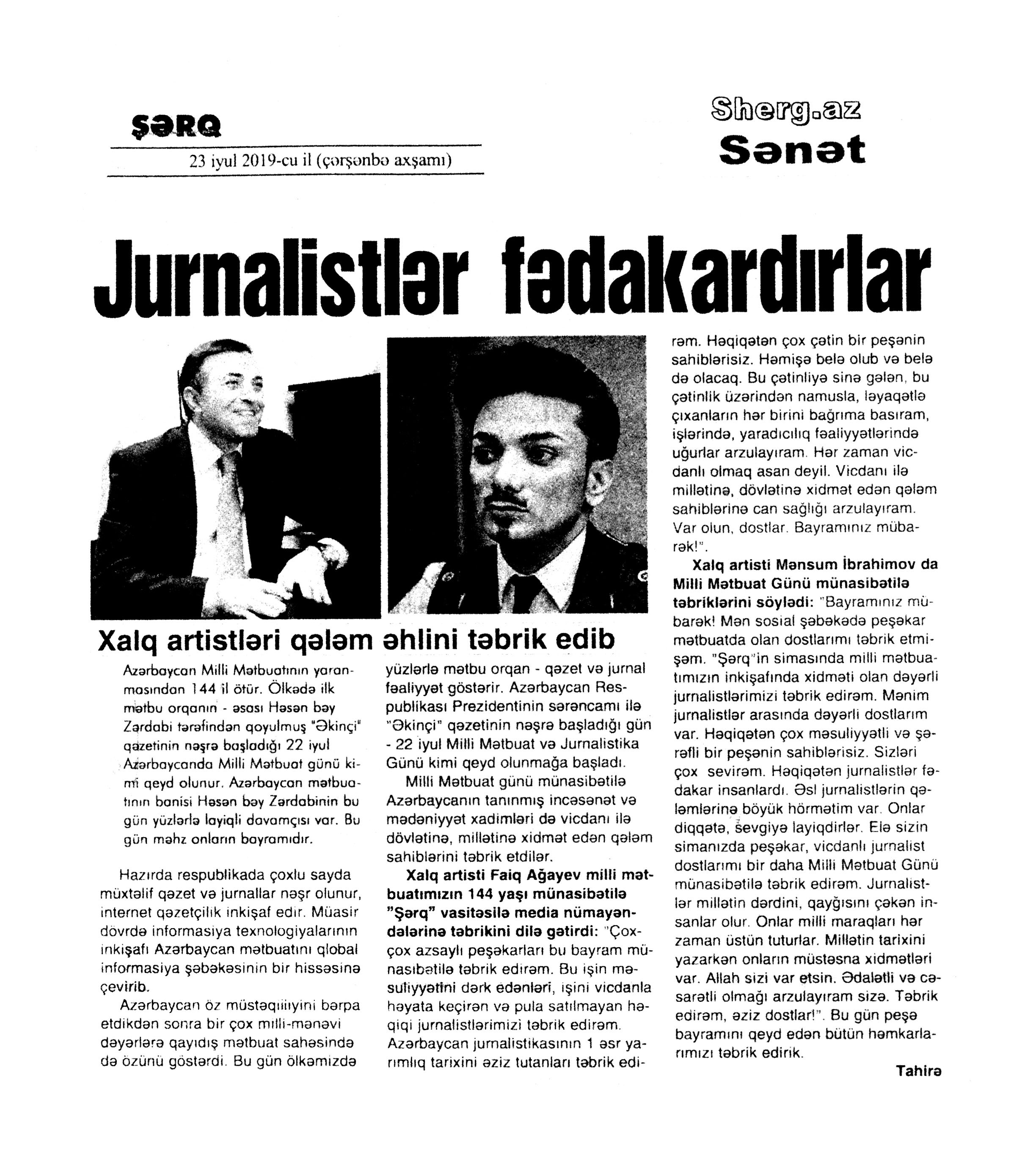 День национальной печати 1346. Гаджиева, Л.Славный путь: От «Экинчи» до журналистики новых технологий //Каспiй. - 2019.-23 июля.- С. 5. 1347. Ислам, А. Истоки и современные тенденции: Национальная печать отмечает день своего рождения //Каспiй. - 2019.-20 июля.- С. 10. 1348. Награждены победители конкурса индивидуальных журналистских статей //Бакинский рабочий.- 2019.- 23 июля.- С. 4-5.