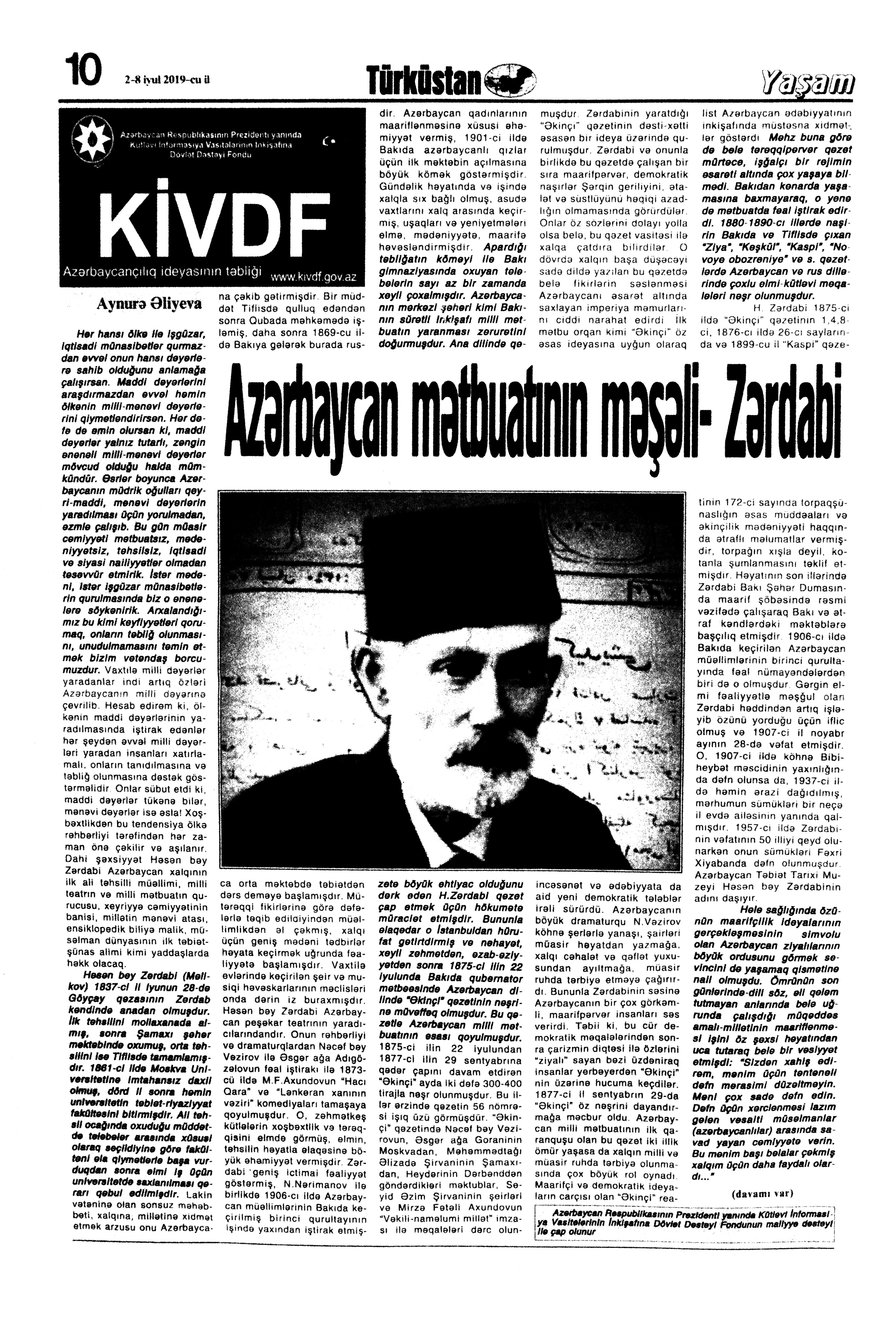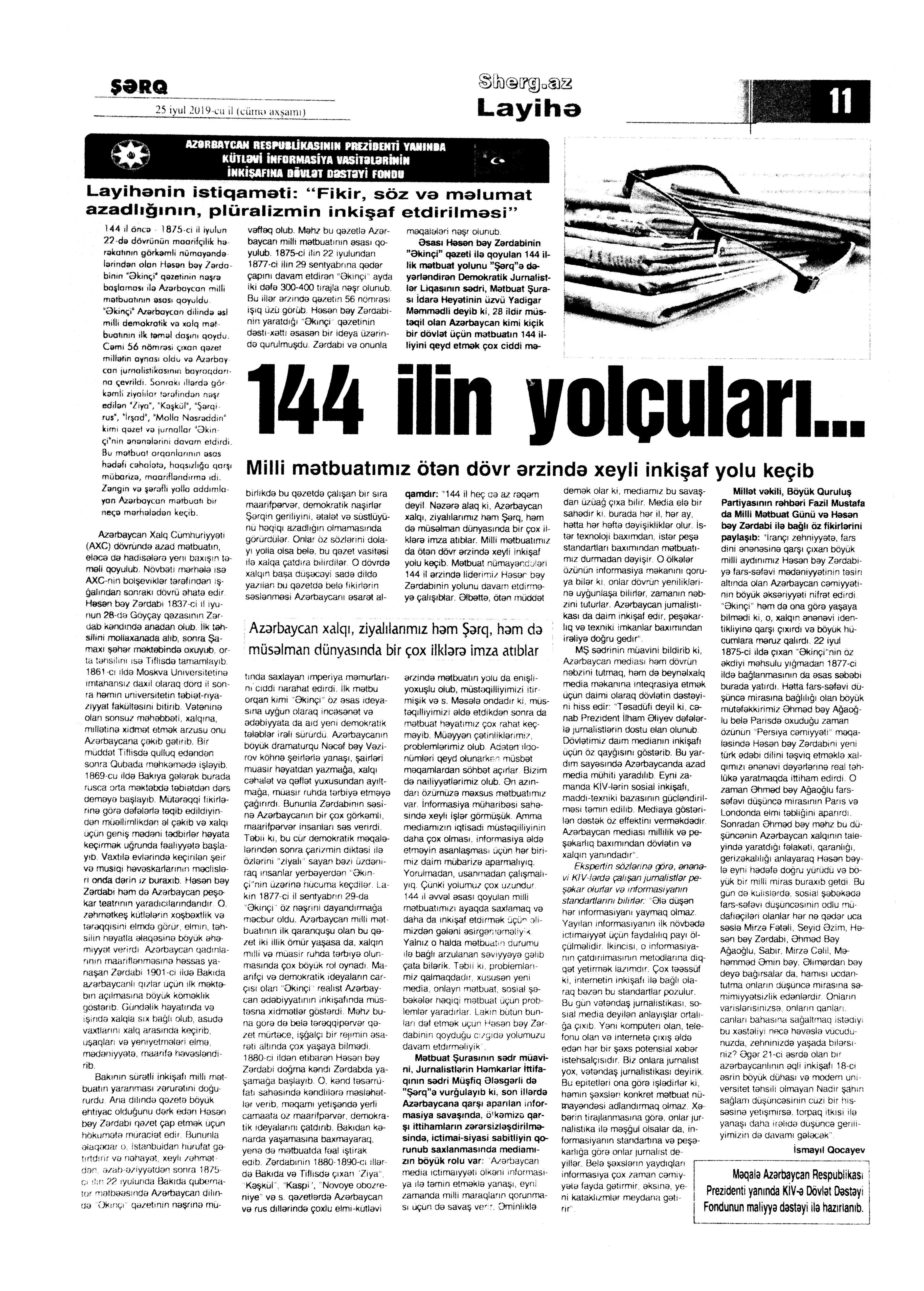 Milli Mətbuat Günü – 144 96. Azərbaycan mətbuatı-144 illik yol //Ədalət.-2019.- 23 iyul.- S.2. 97. Azərbaycan milli mətbuatının 144 yaşı tamam olur //Mədəniyyət.-2019.- 19 iyul.- S.1-2. 98. Baxşəliyev, R. 144 illik şərəfli yol: Azərbaycanda KİV-in inkişafı dövlət siyasətinin əsas xəttini təşkil edir //Azərbaycan.-2019.- 23 iyul.- S.1; 8. 99. Cəfərli, R. Milli mətbuat dövlətin dəstəyi ilə demokratik dəyərlər əsasında inkişaf edir //Azərbaycan.-2019.- 21 iyul.- S.1; 5. 100. Dillər Universitetində Milli Mətbuat günü münasibətilə tədbir keçirilib //Ədəbiyyat qəzeti.-2019.- 20 iyul.- S.12. 101. Əbülfəs Qarayev: Mədəni zənginliyimizin tanınmasında kütləvi informasiya vasitələrinin rolu danılmazdır: [Mədəniyyət naziri Əbülfəs Qarayev Milli Mətbuat Günü münasibətilə ölkəmizin jurnalist ictimaiyyətini təbrik edib] //Xalq qəzeti.-2019.- 23 iyul.- S.10. 102. Əbülfəs Qarayev Milli Mətbuat Günü münasibətilə jurnalistləri təbrik edib //Mədəniyyət.-2019.- 24 iyul.- S.3. 103. Ələddinqızı, N. 144 il böyük tarixi inkişaf yolu keçən milli mətbuatımız //Səs.-2019.- 19 iyul.- S.8. 104. Əliyeva, A. Azərbaycan mətbuatının məşəli-Zərdabi //Türküstan.-2019.- 9-15 iyul.- S.12. 105. Əliyeva, A. Mətbuat tariximiz bütün dünya azərbaycanlılarının fəxr yeridir //Türküstan.-2019.- 23 iyul- 5 avqust.- S.10. 106. Fərdi jurnalist yazıları müsabiqəsinin qalibləri mükafatlandırılıb //Azərbaycan.-2019.- 23 iyul.- S.5. 107. Fərəcov, S.Zərdabinin maarifçilik yolunun davamçısı: [Həsən Bəy Zərdabinin qızı Qəribsoltan haqqında] //Mədəniyyət.-2019.- 24 iyul.- S.6. 108. Fondun Mədəniyyət Nazirliyi ilə keçirdiyi birgə müsabiqənin qalibləri mükafatlandırılıb: Birinci yerə “Xalq Cəbhəsi” qəzetinin müxbiri Elçin Qaliboğlu layiq görülüb: [Mədəniyyət naziri Əbülfəs Qarayev tədbirdə çıxıç edib] //Xalq cəbhəsi.-2019.- 13-15 iyul.- S.3. 109. Kamalqızı, R. Azərbaycan milli mətbuatının yaramasından 114 il ötür: İlham Əliyev:Bütövlükdə, Azərbaycan jurnalistikası öz dövlətinə, xalqına dövlətçiliyinə bağlıdır //Səs.-2019.- 18 iyul.- S.8. 110. Kərimli, T. H. Rəsmi dövlət qəzeti nümunəsi: ənənə və müasirlik: Bir də özümüzə qoyduğumuz ad: [101 yaşlı “Azərbaycan” qəzeti haqqında] //Azərbaycan.-2019.- 21 iyul.- S.1; 4. 111. Kərimov, P. Real fakta və sənədə əsaslanaq: Bir daha Həsən bəy Zərdabinin doğum tarixi barədə //Azərbaycan.-2019.- 21 iyul.- S.5. 112. KİVDF qalib jurnalistləri mükafatlandırdı: [“Altun Saray” istirahət mərkəzində keçirilən tədbir haqqında] //Ədalət.-2019.- 25 iyul.- S.3. 113. Qocayev, İ. 144 ilin yolçuları...: Milli Mətbuatımız ötən dövr ərzində xeyli inkişaf yolunu keçib //Şərq.-2019.- 25 iyul.- S.11. 114. Mətbuat mədəniyyətin əsas sahələrindən biridir: Dövlət özünün milli-mənəvi varlığını nümayiş etdirən ədəbiyyatına, incəsənətinə dəstək göstərdiyi kimi, mediaya da yardım göstərir: [Kütləvi İnformasiya Vasitələrinin İnkişafına Dövlət Dəstəyi Fondunun milli mətbuatının yaranmasının 144-cü ildönümü münasibətilə keçirdiyi fərdi jurnalist yazıları müsabiqəsinin qalibləri mükafatlandırılıb] //Mədəniyyət.-2019.- 24 iyul.- S.1;4. 115. Milli Kitabxanada Mətbuat Günü sərgisi: [kitabxanada “22 İyul - Milli Mətbuat və Jurnalistika Günü” adlı geniş kitab sərgisi açılıb] //525-ci qəzet.-2019.- 24 iyul.- S.8. 116. Milli Mətbuat Günü münasibətilə “Açıq kitabxana”: [Zərdab Rayon Mərkəzi Kitabxanası şəhər 38 saylı kitabxana filialı ilə birgə] //Mədəniyyət.-2019.- 19 iyul.- S.2. 117. Milli Mətbuat Günü münasibətilə keçirilmiş müsabiqənin nəticələri elan edilib: [Kütləvi İnformasiya Vasitələrinin İnkişafına Dövlət Dəstəyi Fondunun Müşahidə Şurasının dəstəyi ilə] //Palitra.-2019.- 23 iyul.- S.3. 118. “Milli mətbuat – milli düşüncə”: [Bakıda Mənəvi Dəyərlərin Təbliği Fondunun təşkilatçılığı ilə eyniadlı mövzuda keçirilən konfrans haqqında] //Mədəniyyət.-2019.- 26 iyul.- S.3. 119. “Milli Mətbuatımız böyük inkişaf yolu keçib”: [“Kaspi” qəzetinin baş redaktoru İlham Quliyevin söylədikləri] //Səs.-2019.- 19 iyul.- S.10. 120. Milli mətbuatın 144 illiyi qeyd olundu: Əli Həsənov: “Mediamızın inkişafı azərbaycan dövlətinin inkişafına tam adekvatdır”: [tədbirdə bu münasibətlə keçirilən fərdi jurnalist yazıları müsabiqəsinin qalibləri mükafatlandırılıb] //525-ci qəzet.-2019.- 24 iyul.- S.5. 121. Novruz, N. KİVDF-nin Milli Mətbuat Günü münasibətilə təşkil etdiyi bayram tədbirində yazı müsabiqəsinin qalibləri mükafatlandırılıb: [“Altun Saray” istirahət mərkəzində keçirilən tədbir bədii hissə ilə davam edib] //Mövqe.-2019.- 24 iyul.- S.4-5. 122. Pərvanə. Milli mətbuatımızın 144 ildə keçdiyi keşməkeşli və şərəfli yol: [“Altun Saray” istirahət mərkəzində keçirilən tədbirdə Əli Həsənov çıxış edib və fərdi jurnalist yazıları müsabiqəsinin qalibləri mükafatlandırılıb] //525-ci qəzet.-2019.- 24 iyul.- S.7. 123. Rüstəmov, İ. Ə. Həsən bəy Zərdabi və milli mətbuatımızın vətəndaşlıq mücadiləsi: Azərbaycan milli mətbuatı – 144 //Xalq qəzeti.-2019.- 31 iyul.- S.6. 124. Tahirə. Juranlistlər fədakardırlar: Xalq artistləri qələm əhlini təbrik edib: [Milli Mətbuat Günü münasibətilə F.Ağayev və M.İbrahimovun təbrikləri] //Şərq.-2019.- 23 iyul.- S.13. Bax: 905