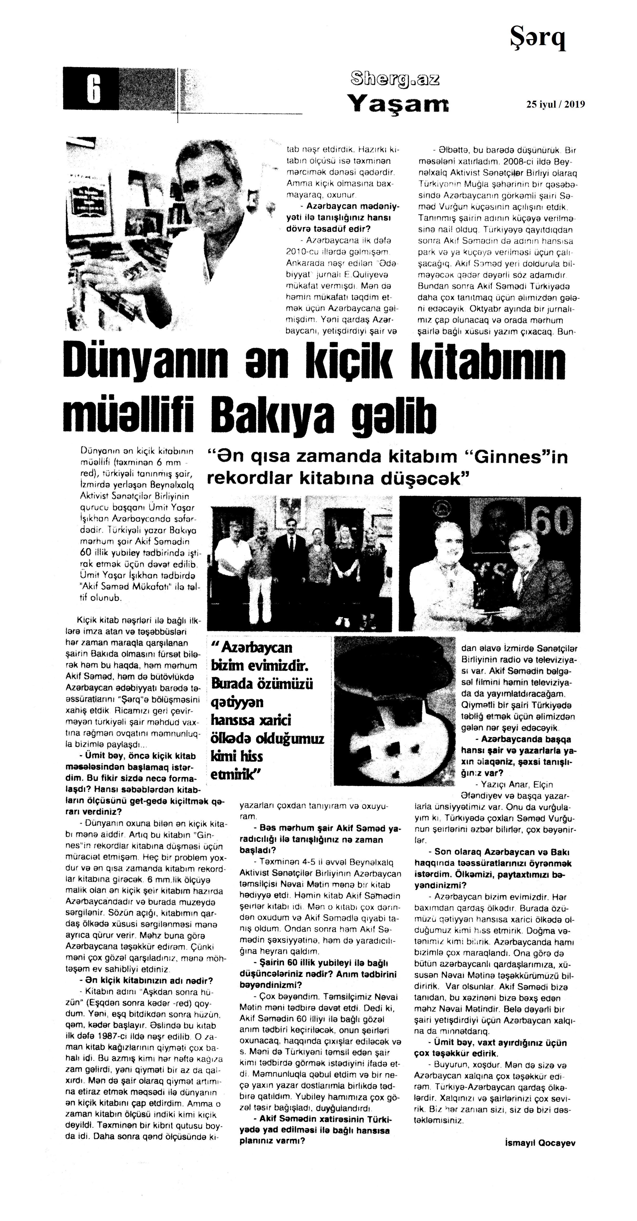 Akif Səməd – 60 1213. Akif Səməd – 60: Zər ilə qoşa atıldım...; Türkü; Atilaya; Durnalara; 45 yaşın şeiri; Elə yolları var can saxlamağın...; Sazın Yunus Əmrə kökündə //Kaspi.- 2019.- 13-15 iyul.- S.14. 1214. Aytel, İ. Arzularını söyləyəcək birisi varsa, yaşayırsan!: [şair Akif Səmədin 60 illiyi ilə bağlı] //Ədəbiyyat qəzeti.- 2019.-22 iyul.- S.22-23.; Kaspi.- 2019.- 20 iyul.- S.23. 1215. Eminquey. Akif Səməd bu yolu təkcə keçmədi, təkcə ölmədi: [şairin yaradıcılığı haqqında] //Ədəbiyyat qəzeti.- 2019.- 27 iyul.- S.11. 1216. Qoşqar, A. Akifdən qabaqkı Ulucay Akif: [Ulucay Akif və Akif Səmədin yaradıcılığı haqqında] //Ədəbiyyat qəzeti.- 2019.- 27 iyul.- S.10-11. 1217. Məlikzadə, S. Qarışqa yuvasına dən daşıyan adam: O, ömür payını ürəklə yaşayırdı: [şair Akif Səməd haqqında] //Kaspi.- 2019.- 19 iyul.- S.7. 1218. Umudova, K. Akif Səməd nəyimdi ki? //Kaspi.- 2019.- 27-29 iyul.- S.14.