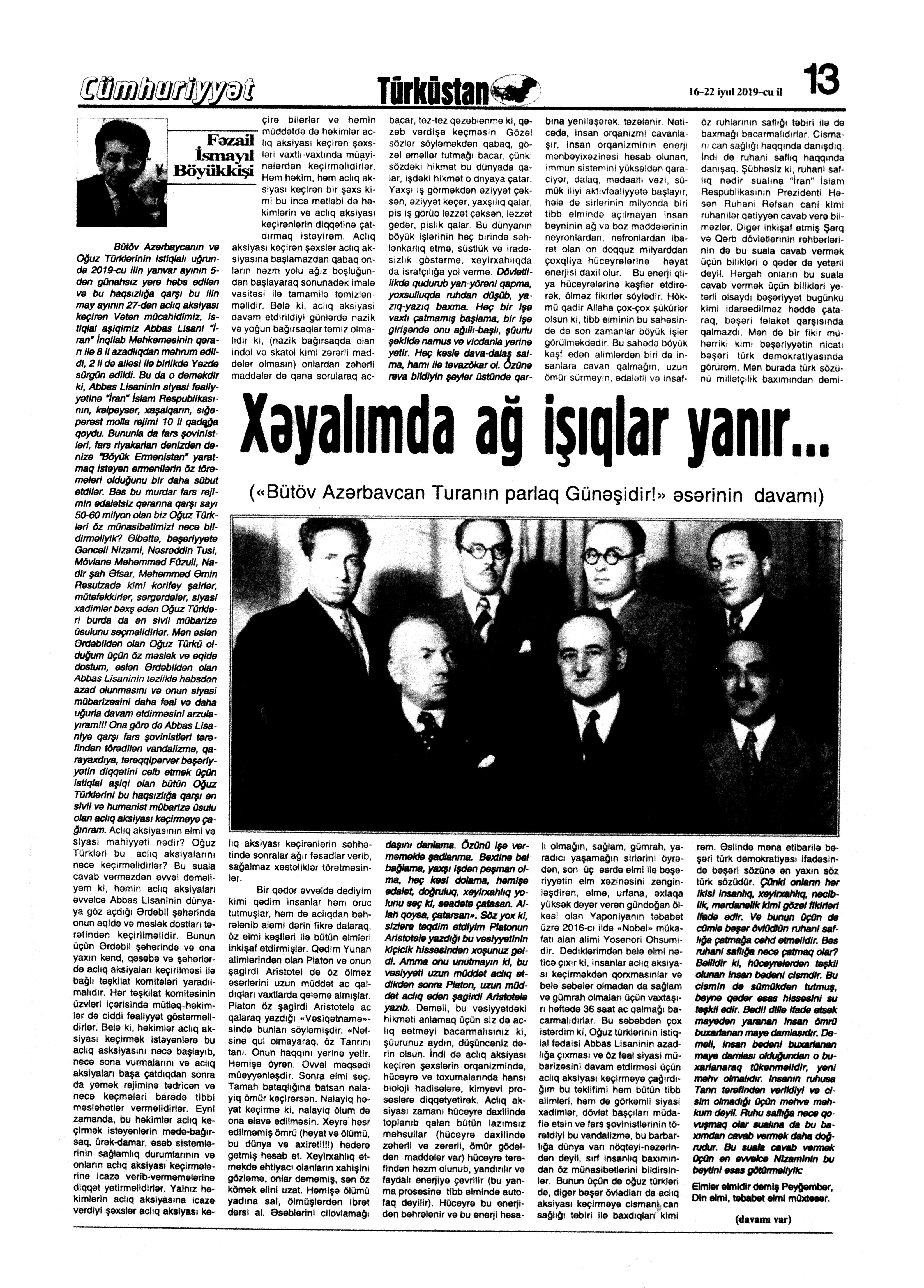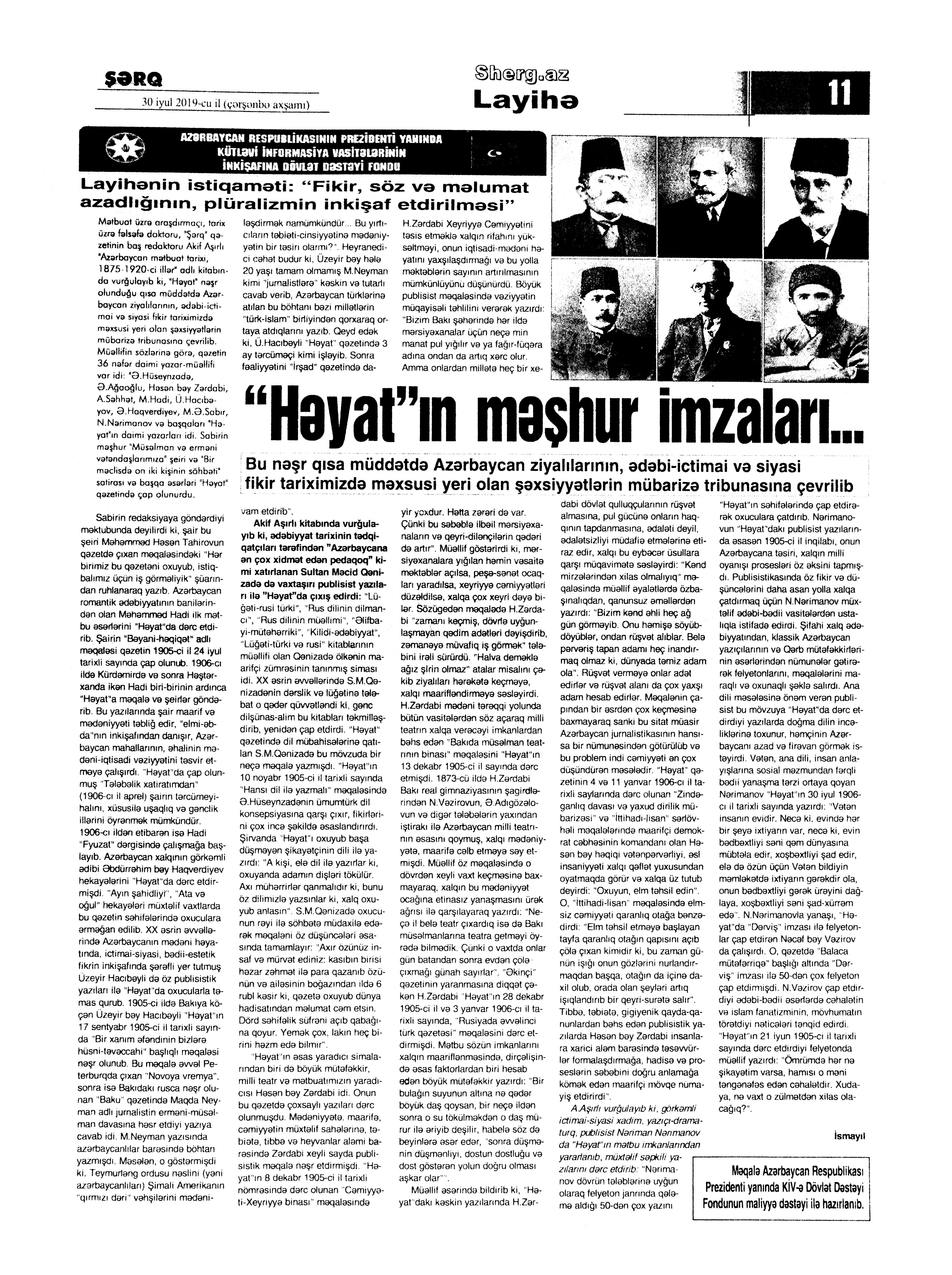 Əhməd bəy Ağaoğlu – 150 1176. Ağaoğlu, Ə. Konfutsi və Nitsşe: Çin işləri haqda: [Çin filosofu ilə alman ideoloqunun dialoqu] /rus dilindən tərc.etdi Vilayət Quliyev //525-ci qəzet.- 2019.- 27 iyul.- S.6. 1177. İsmayıl. Əhməd bəy Ağaoğlundan qısa film çəkilir: [Qarabağ Azadlıq Təşkilatının sədri Akif Nağının mövzu ətrafında fikirləri] //Şərq.- 2019.- 30 iyul.- S.6. 1178. Quliyev, V. Güclü insan sorağında //525-ci qəzet.- 2019.- 27 iyul.- S.6. 1179. Səma, G. “Atatürk və Əhməd Ağaoğlu”: Vilayət Quliyevin kitabı //Azad Azərbaycan.- 2019.- 4 iyul.- S.7. 1180. Vəliyeva, T. “Rus ədəbiyyatının ümumi səciyyələri”nə xüsusi nəzər: [ictimai xadim, pedaqoq və yazıçı, türkoloq Əhməd bəy Ağaoğlu haqqında] //Kredo.-2019.- 18 iyul.- S.11. Cəfər Cabbarlı – 120 1181. Cabbarlı, C. Ana; Azərbaycan bayrağına: şeirlər //Azərbaycan.- 2019.-28 iyul.- S.7. 1182. Quliyeva, S. Dramaturqun poetik irsi: Cəfər Cabbarlı – 120 //Azərbaycan.- 2019.-28 iyul.- S.7. 1183. Mükərrəmoğlu, M. O, həm də milli kinomuzun yaradıcılarından idi: Cəfər Cabbarlı – 120 //Xalq qəzeti.- 2019.-21 iyul.- S.7. 1184. “Orada bir ev var, Xızıda”: Cəfər Cabbarlının yubileyi ilə bağlı tədbir //Mədəniyyət.- 2019.- 5 iyul.- S. 5. 1185. Tağısoy, N. C.Cabbarlının yaradıcılığı digər xalqların səhnəsində //Kredo.-2019.- 18 iyul.- S.6-7.