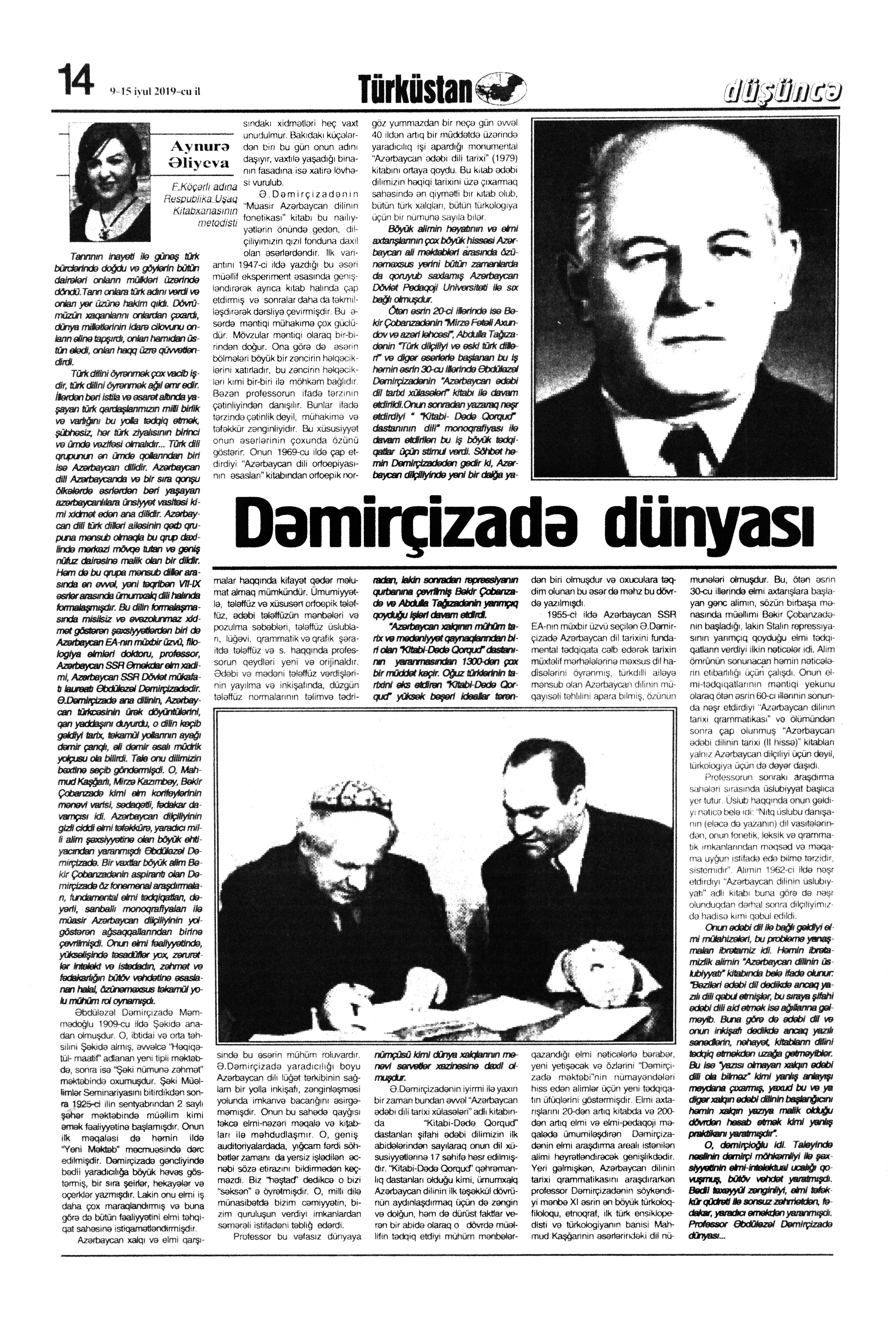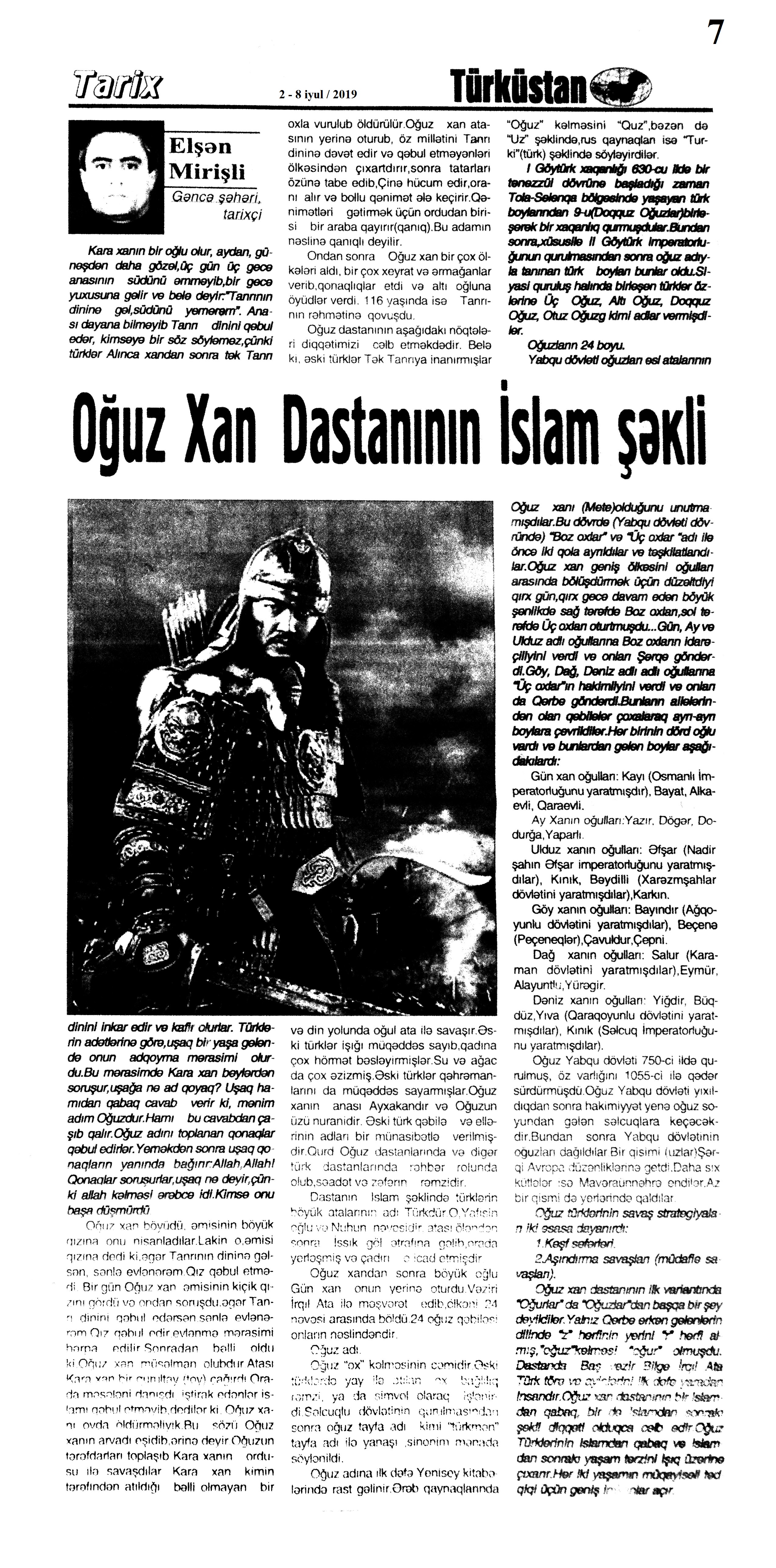 Türkiyənin Bayburt şəhərində keçirilən Beynəlxalq Dədə Qorqud Festivalı 1108. Bayburtda Dədə Qorqud festivalı //Mədəniyyət.- 2019.- 26 iyul.- S.8. 1109. Çakır, T. Türkiyənin Bamsı Beyrəyi olacaq aktyor: Turan Çakır: Biz tariximizi eşqlə oxuyan millətik: [türk aktyoru ilə müsahibə] /müsahibəni apardı Xəyalə Rəis //Kaspi.- 2019.- 31 iyul.- S.8. 1110. Müşfiq, Ş. Bayburta aparan Dədə Qorqud izi...: I yazı //525-ci qəzet.- 2019.- 27 iyul.- S.11. 1111. Müşfiq, Ş. Bayburta aparan Dədə Qorqud izi...:: II yazı //525-ci qəzet.- 2019.- 31 iyul.- S.11. 1112. Müşfiq, Ş. Türk dünyası üçün yeni mühüm tapıntı: [“Kitabi-Dədə Qorqud”un “Salur Qazanın yeddi başlı əjdahanı öldürməsi” adlı 13-cü boyunun elmi ictimaiyyətə təqdim edilməsi haqqında] //525-ci qəzet.- 2019.- 20 iyul.- S.17. 1113. Rəis, X. Türk dünyasının ortaq dəyəri: Və ya Dədə Qorqudun Bayburtdakı izi: I yazı: [Türkiyədə növbəti dəfə keçirilən Beynəlxalq Dədə Qorqud Festivalı haqqında] //Kaspi.- 2019.- 27-29 iyul.- S.5.