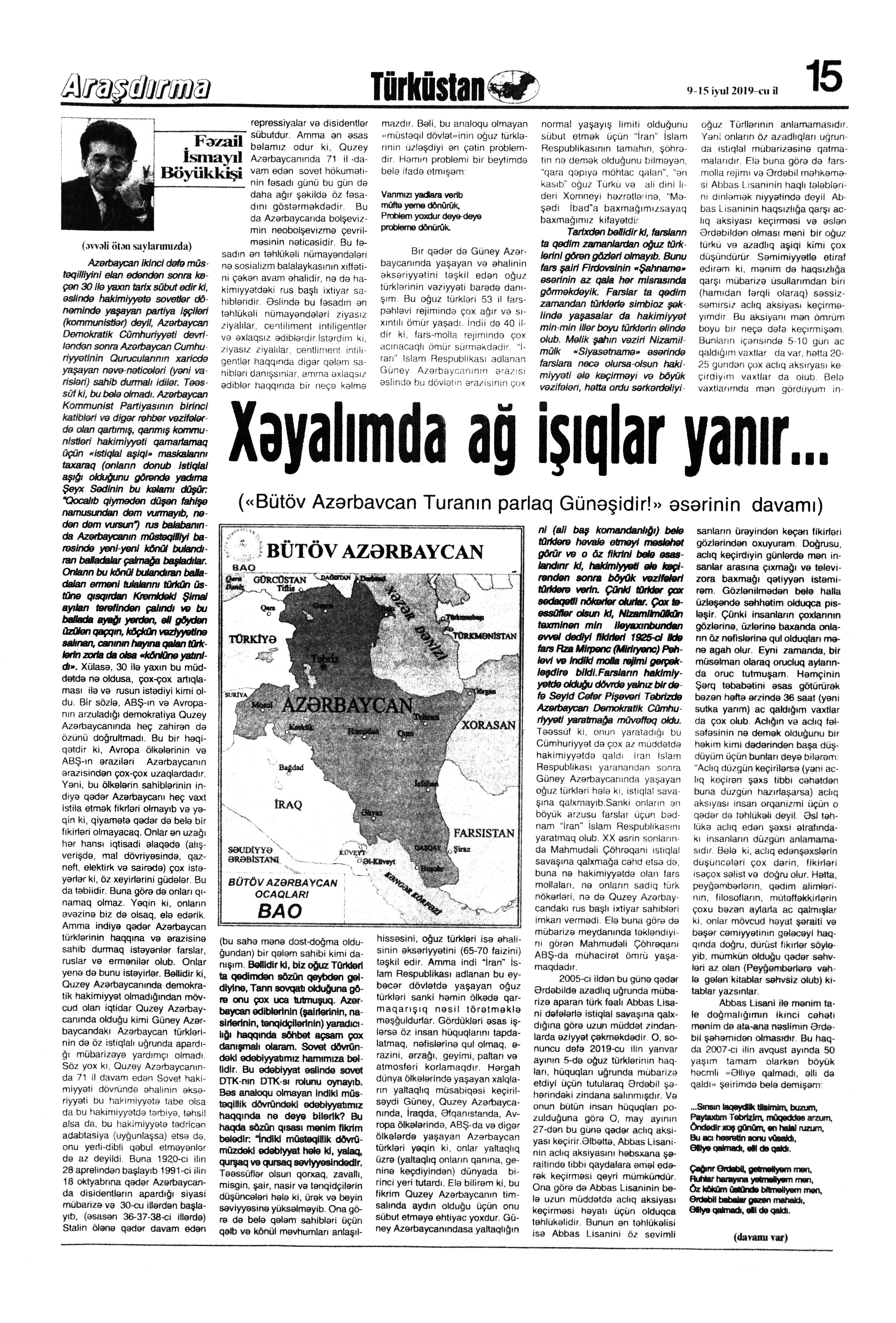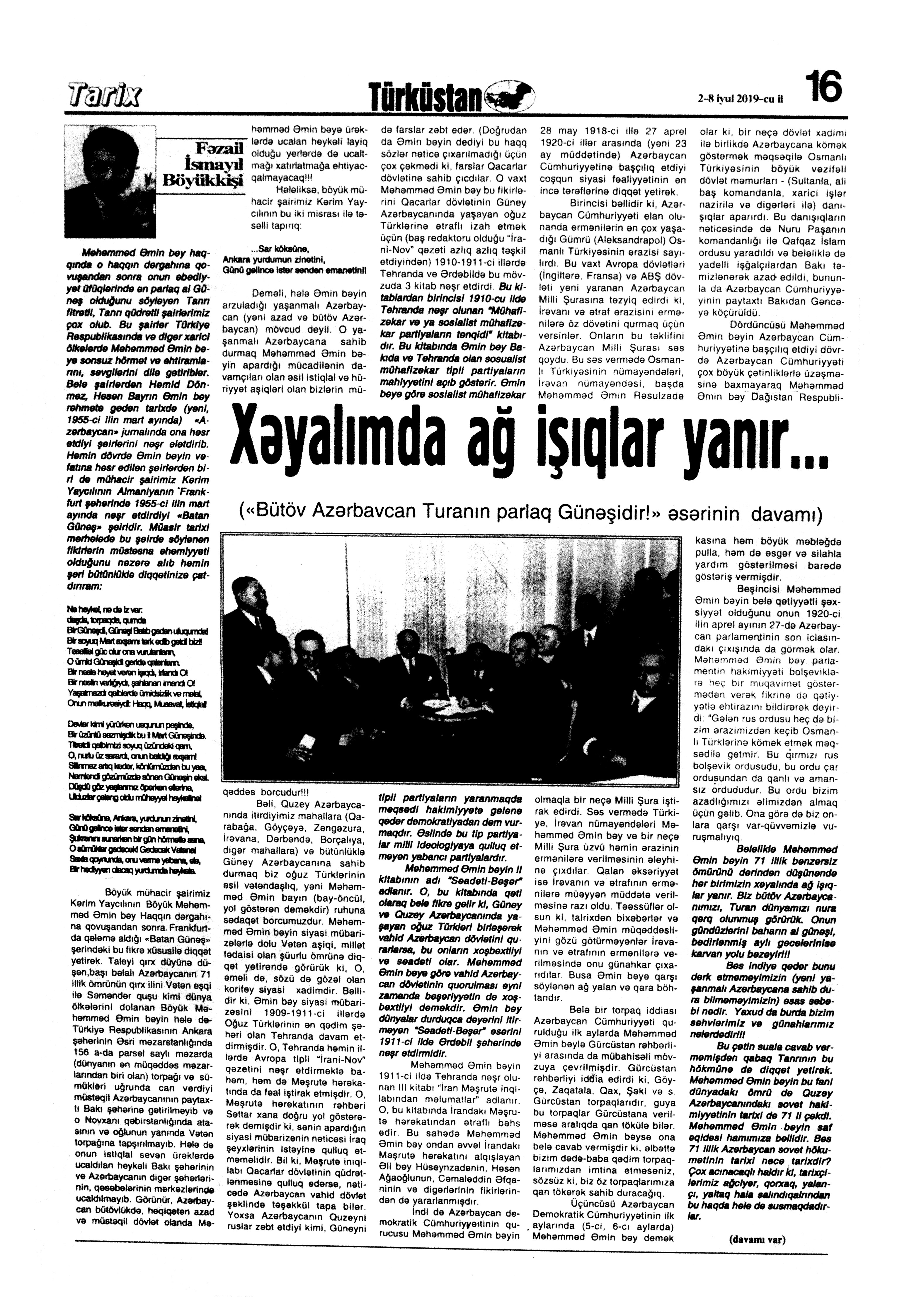 Azərbaycan Xalq Cümhuriyyəti – 101 125. Böyükkişi, F. İ.Xəyalımda ağ işıqlar yanır...: (“Bütöv Azərbaycan Turanın parlaq Günəşidir!” əsərinin davamı): [Məhəmməd Əmin Rəsulzadə haqqında] //Türküstan.-2019.- 2-8 iyul.- S.16. 126. Böyükkişi, F. İ.Xəyalımda ağ işıqlar yanır...: (“Bütöv Azərbaycan Turanın parlaq Günəşidir!” əsərinin davamı) //Türküstan.-2019.- 9-15 iyul.- S.15. 127. Böyükkişi, F. İ.Xəyalımda ağ işıqlar yanır...: (“Bütöv Azərbaycan Turanın parlaq Günəşidir!” əsərinin davamı) //Türküstan.-2019.- 16-22 iyul.- S.13. 128. Böyükkişi, F. İ.Xəyalımda ağ işıqlar yanır...: (“Bütöv Azərbaycan Turanın parlaq Günəşidir!” əsərinin davamı) //Türküstan.-2019.- 23 iyul- 5 avqust.- S.13. 129. Xalq Cümhuriyyətinin 100 illiyi medalı təqdim olundu: [Prezident İlham Əliyevin Sərəncamı ilə yubileylə əlaqədar təsis edilmiş “Azərbaycan Xalq Cümhuriyyətinin 100 illiyi” medalına bir qrup media nümayəndələri və ictimai xadimlər layiq görülüblər] //Ədəbiyyat qəzeti.-2019.- 13 iyul.- S.22. 130. Xələfli, Ə. R. “1918-ci il Şamaxı soyqırımı”: Bu kitab “Cümhuriyyət ili” layihəsinin ideyaları əsasında vətəndaşlıq borcu olaraq yazılıb: [Doktor Seyfəddin Qəni və filologiya üzrə fəlsəfə doktoru Tariyel Qəninin “1918-ci il Şamaxı soyqırımı” kitabı haqqında] //Kredo.-2019.- 18 iyul.- S.16. 131. Sabirqızı, İ. İstiqlal Bəyannaməsinin qəbulu...: Və Azərbaycanı müstəqilliyə qovuşduran şəxsiyyətlər: [Tiflisdə Həsən bəy Ağayevin sədrliyi ilə Azərbaycan Milli Şurasının tarixi iclasında Azərbaycanın dövlət müstəqilliyi haqqında İstiqlal Bəyannaməsi qəbul olundu] //Hürriyyət.-2019.- 18-19 iyul.- S.13. 132. Timuçin Əfəndiyev “Cümhuriyyətin 100 illiyi” medalına layiq görülüb //Mədəniyyət.-2019.- 12 iyul.- S.2
