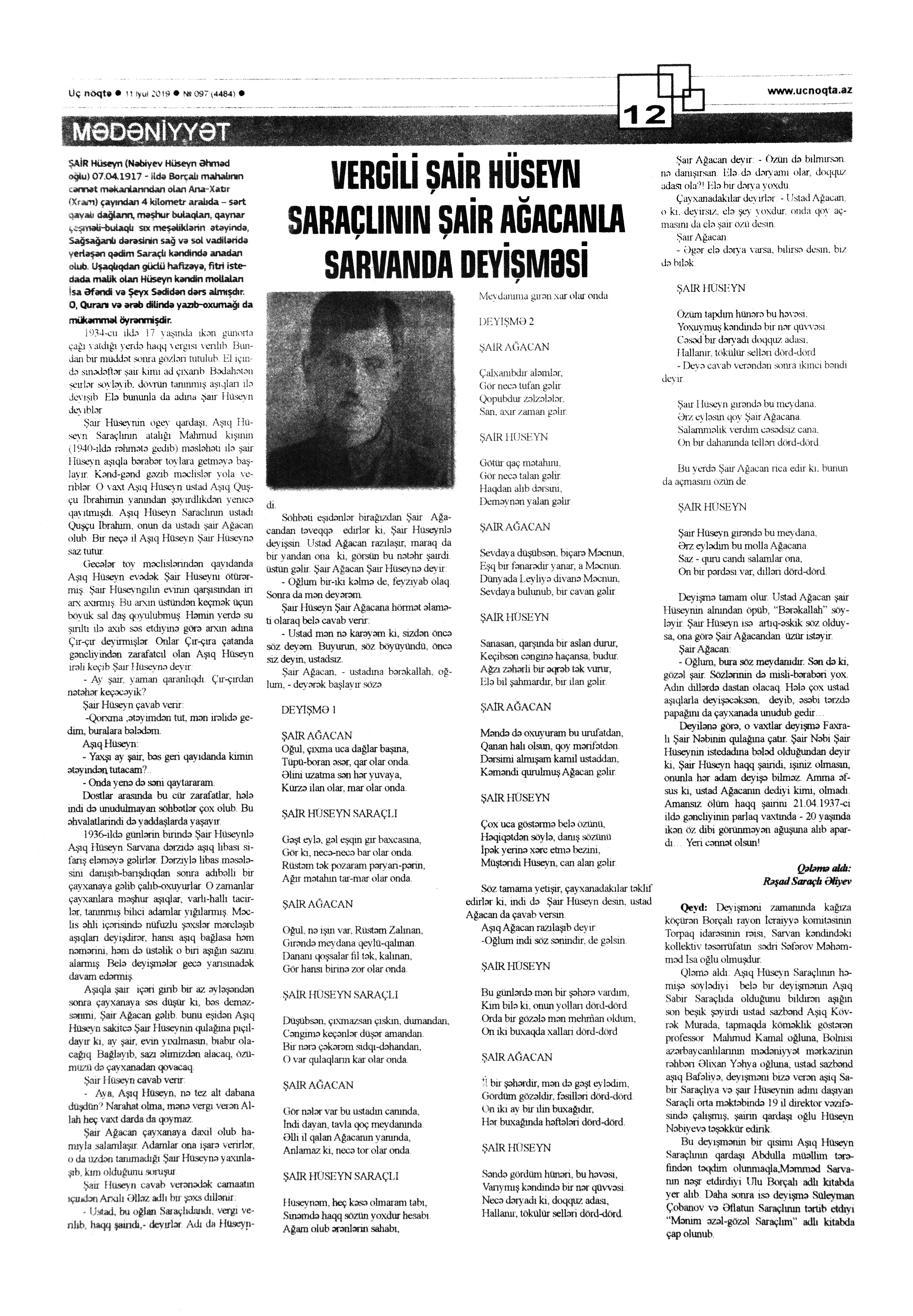 XALQ YARADICILIĞI 591. Fərəcov, S. Saza könül verəndə...: [Əməkdar mədəniyyət işçisi, ustad aşıq İsfəndiyar Rüstəmov haqqında] //Mədəniyyət.-2019.- 3 iyul.- S.6. 592. Qəhrəman, İ. Könül işi: İxtisarla: [Aşıq Alının yaradıcılığı haqqında] //Ədəbiyyat qəzeti.-2019.- 6 iyul.- S.26-27. 593. Qismətoğlu, F. Sazın-sözün işığı: [Əməkdar elm xadimi, Dövlət mükafatı laureatı, Azərbaycan Aşıqlar Birliyinin sədri, professor Məhərrəm Qasımlının “Azərbaycan aşıq ədəbiyyatı” kitabı haqqında] //Ədalət.-2019.- 25 iyul.- S.6. 594. “Sazlı-sözlü diyarımmənim”: [Heydər Əliyev Sarayında eyniadlı aşıq konserti keçirilib] //Mədəniyyət.-2019.- 5 iyul.- S. 8.