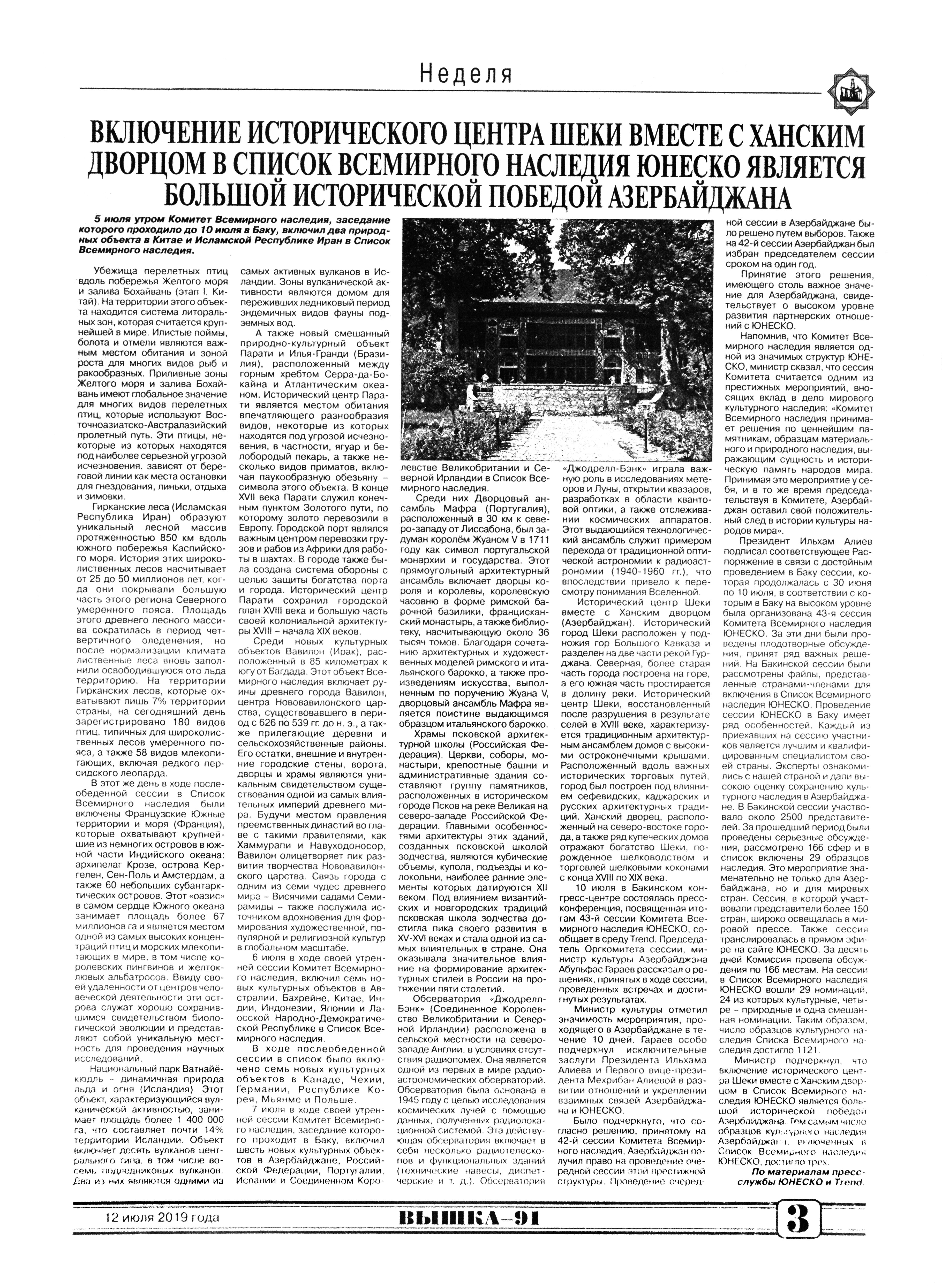 43-я сессия Комитета Всемирного наследия ЮНЕСКО 1287. Абаскулиева, Э. Сохранить для потомков: В Баку продолжает свою работу 43-я сессия Комитета всемирного наследия ЮНЕСКО //Азербайджанские известия.- 2019.- 6 июля.- С.3. 1288. Алиев, И.Поздравление азербайджанскому народу по случаю включения исторического центра Шеки вместе с Ханским дворцом в Список Всемирного наследия ЮНЕСКО //Бакинский рабочий. - 2019.- 9 июля.- С. 1. 1289. Алиева, Г. В списках UNESCO: Стратегическая значимость Шеки подтверждена на мировом уровне //Каспiй.- 2019.-9 июля.- С. 6. 1290. Алиева, Г. На очереди – Гиркан: В рамках сессии UNESCO обсуждали и природоохранные вопросы //Каспiй.- 2019.-12 июля.- С. 7. 1291. Алиева, М.В Баку начала работу 43-я сессия Комитета Всемирного наследия ЮНЕСКО: В церемонии открытия сессии приняла участие Первый вице-президент Азербайджана Мехрибан Алиева //Бакинский рабочий.- 2019.- 2 июля.- С.3-4. 1292. Багирова, Ф. Армяне пытаются «присвоить» азербайджанские ковры из экспозиции Лувра: [о выставке ковров в рамках сессии] //Бакинский рабочий. - 2019.- 9 июля.- С.5. 1293. Бакинская сессия - одно из самых важных мероприятий в деятельности ЮНЕСКО //Бакинский рабочий.- 2019.- 2 июля.- С.5. 1294. В Баку завершилась 43-я сессия Комитета Всемирного наследия ЮНЕСКО: На Бакинской сессии были приняты 45 решений и 29 образцов наследия включены в список //Бакинский рабочий. - 2019.- 11 июля.- С.5. 1295. В Баку открылась выставка «Культурное наследие Азербайджана в музее Лувр» //Бакинский рабочий.- 2019.- 4 июля.- С.5. 1296. В Баку пройдет выставка под названием «Культурное наследие Азербайджана в музее Лувр» //Бакинский рабочий. - 2019.- 2 июля.- С.6. 1297. В Баку пройдет I Республиканский фестиваль ремесел: [в рамках сессии] //Бакинский рабочий. - 2019.- 2 июля.- С.7. 1298. В Баку проходит I Республиканский фестиваль ремесел //Ежедневные новости.- 2019.- 5 июля.- С.10. 1299. В очередной день43-й сессии Комитета Всемирного наследия ЮНЕСКО в Баку были приняты соответствующие решения: Обсужден отчет, посвященный усилению диалога между государствами-членами и консультативными группами //Бакинский рабочий. - 2019.- 3 июля.- С.3. 1300. В рамках 43-й сессии Комитета Всемирного наследия ЮНЕСКО организованы параллельные заседания //Бакинский рабочий. - 2019.- 4 июля.- С.4. 1301. В рамках 43-йсессии Комитета Всемирного наследия ЮНЕСКО прошли очередные панельные заседания //Бакинский рабочий. - 2019.- 6 июля.- С.3. 1302. В рамках 43-й сессии Комитета Всемирного наследия ЮНЕСКО прошли параллельные заседания //Бакинский рабочий. - 2019.- 3 июля.- С.3. 1303. В рамках 43-йсессии Комитета Всемирного наследия ЮНЕСКО прошли 4 параллельных заседания //Бакинский рабочий. - 2019.- 5 июля.- С.3. 1304. В рамках 43-й сессии Комитета Всемирного наследия ЮНЕСКО прошло первое пленарное заседание: В первый день сессии была принята Бакинская декларация //Бакинский рабочий. - 2019.- 2 июля.- С.5. 1305. Велиева, C. «Город мастеров» принимает гостей: На Фестиваль ремесел съехались лучшие художники и умельцы со всего Азербайджана //Азербайджанские известия.- 2019.- 6 июля.- С.3. 1306. Включение Исторического центра Шеки вместе с Ханским дворцом в Список всемирного наследия ЮНЕСКО является большой исторической победой Азербайджана //Вышка.- 2019.- 12 июля.- С.3. 1307. Гаджиева, Л. Достояние всего человечества: Список всемирного наследия ЮНЕСКО пополнили 29 новых объектов //Азербайджанские известия. - 2019.- 13 июля.- С.3. 1308. Джонни Мутахи Мухиндо: «Опыт Азербайджана в области сохранения ми