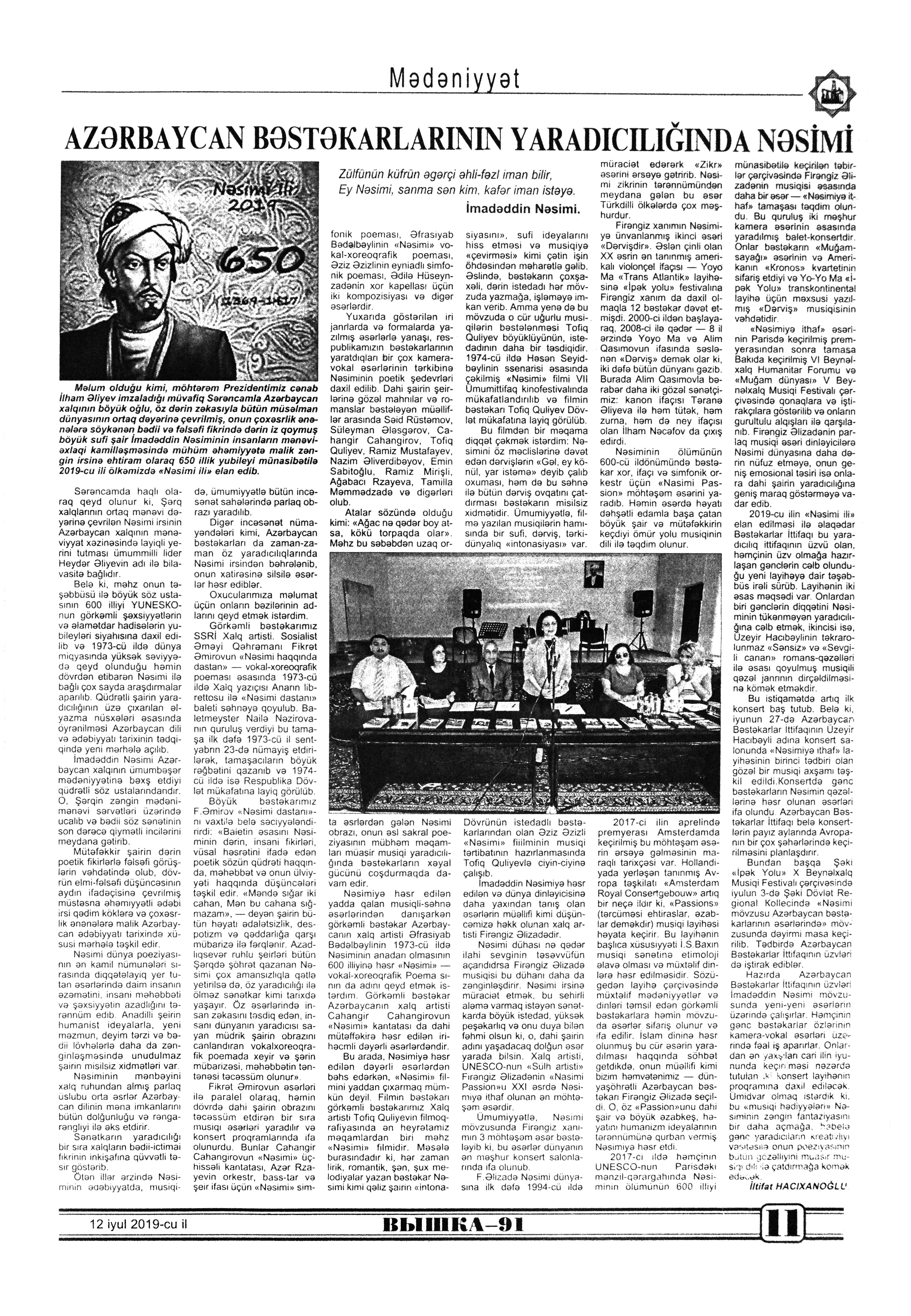 Nəsiminin ənəlhəqqi – ənəlhəqqin Nəsimisi... 1166. Yazıçı Kamran Nəzirlinin yaradıcılıq gecəsi keçirilib: [Belarusun Qrodno vilayətinin Poreçye istirahət mərkəzində keçirilən gecədə “Nəsimi-650” adlı təqdimat da keçirilib] //Türküstan.- 2019.- 9-15 iyul.- S.16. 1167. Zal, E. Hünər və cəsarət icazə istəmir: Vətənpərvər və dövlətçi şair Səlim Babullaoğlunun portreti üçün ştrixlər: [Serbiyada dahi Azərbaycan şairinin yubileyi ilə bağlı elmi simpozium keçirilib] //525-ci qəzet.- 2019.- 6 iyul.- S.16. 1168. Zümrüd. İmadəddin Nəsimi: Sənət və təriqət bütövlüyünün fəlsəfi poeziya zirvəsi //Səs.-2019.- 2 iyul.- S.10.