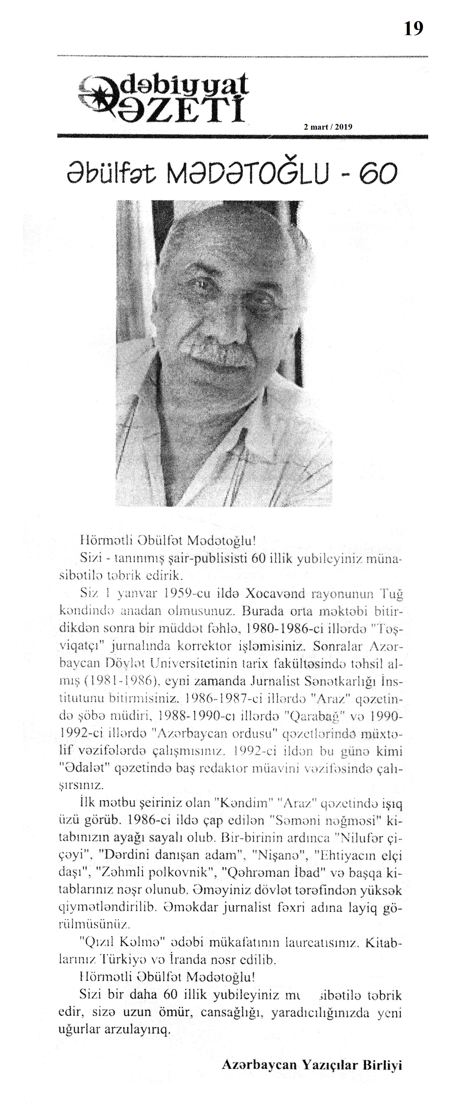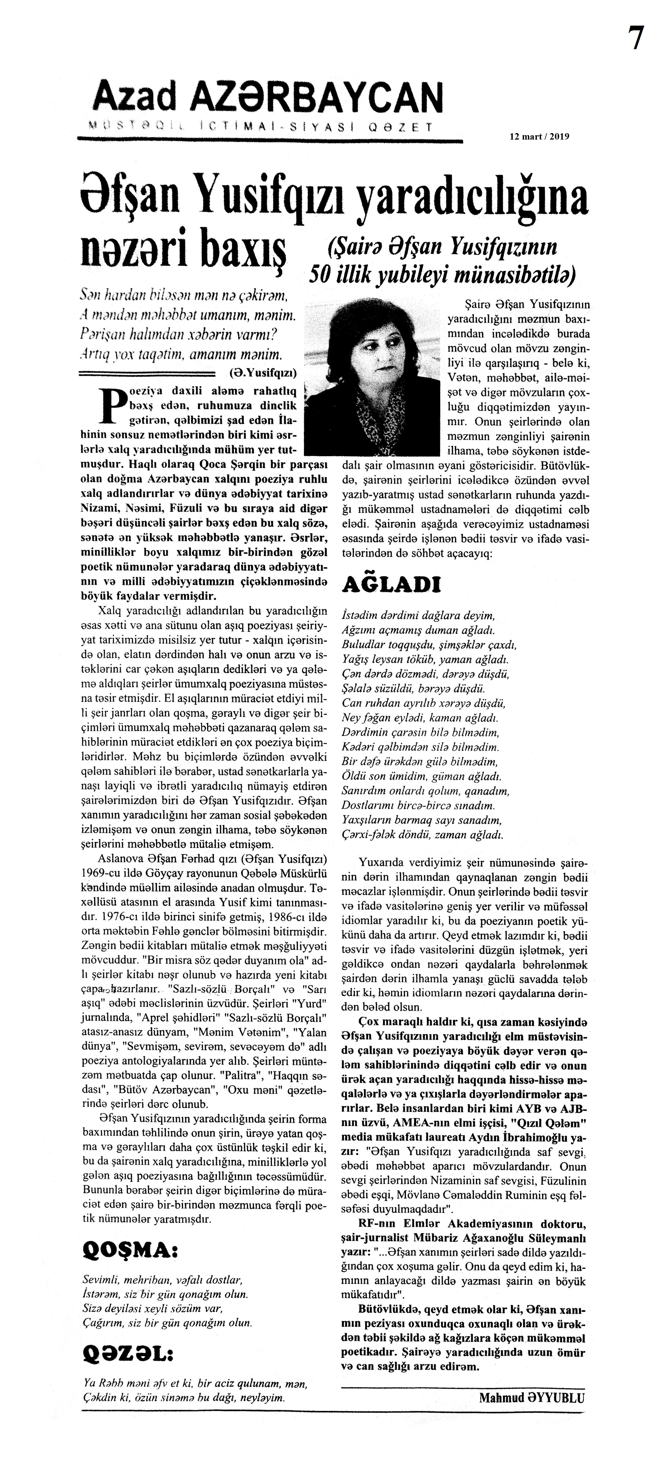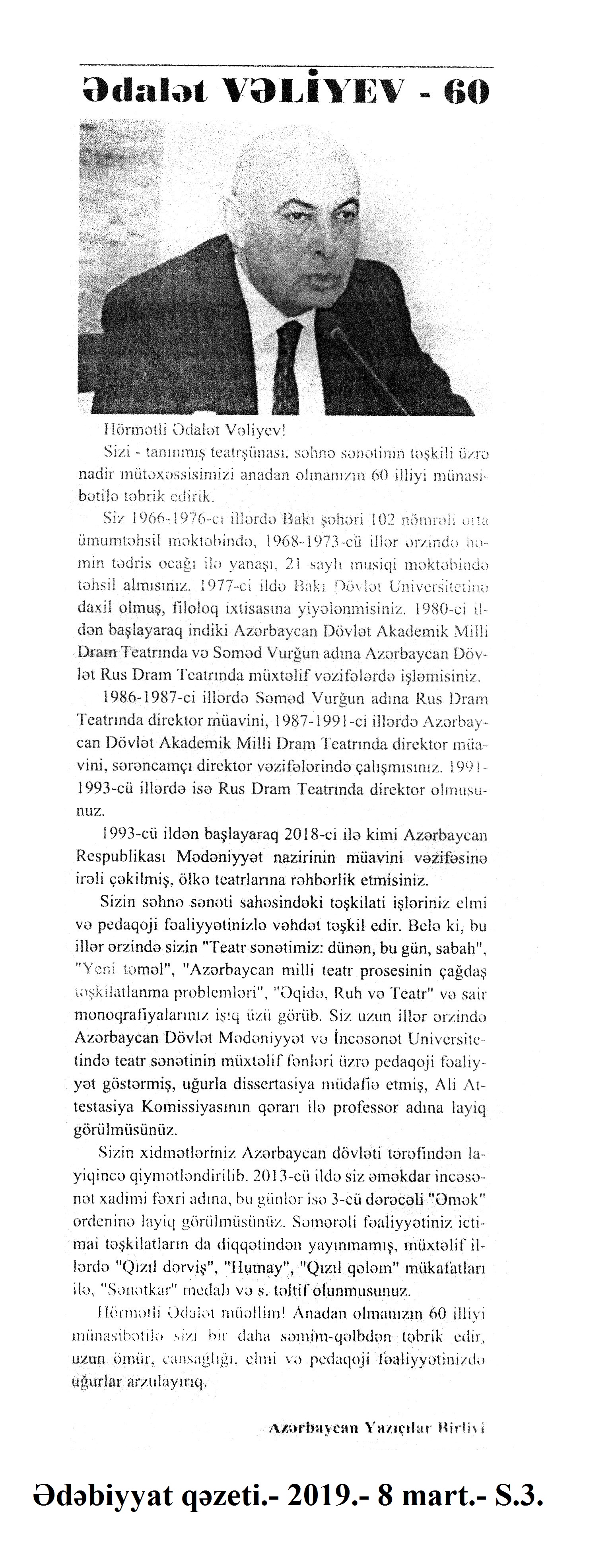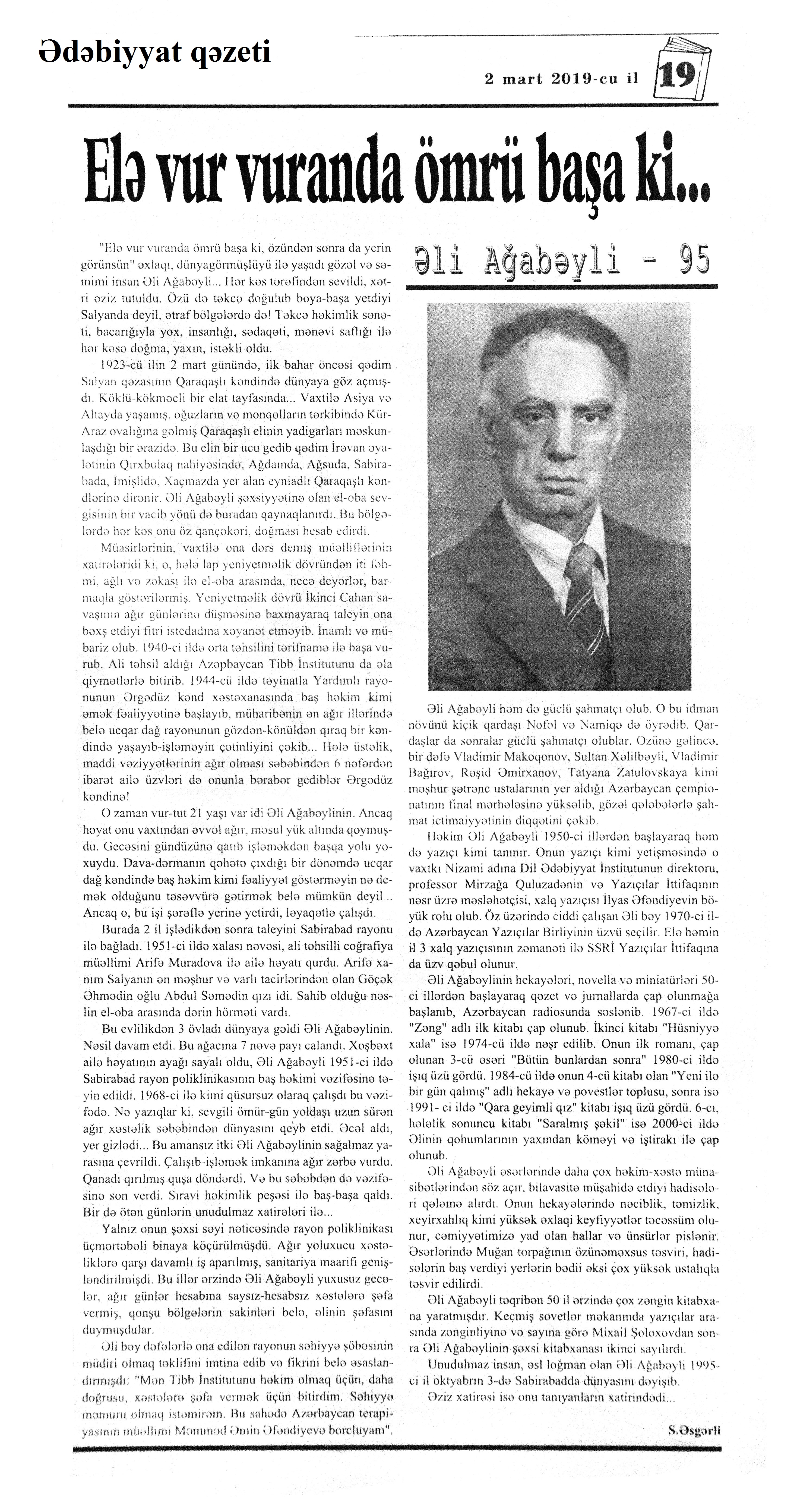 ƏDƏBİYYATŞÜNASLIQ VƏ ƏDƏBİ TƏNQİD 532. Abbas, O. A. A.Həsənlinin özü və sözü haqqında düşünəndə: Şair-publisistin 65 yaşına //Ədalət.- 2019.- 1 mart.- S.6. 533. Abbaslı, T. Fərman Kərimzadə – : Öz istedadı ilə tariximizi nəsrləşdirmiş, kinolaşdırmış, rəsmləşdirmiş, xarakterik keyfiyyətlərilə ədəbi-ictimai mədəniyyətimizə parlaq rənglər qatmış sənətkar //Mədəniyyət.- 2019.- 13 mart.- S. 6. 534. Abbaslı, T. Ulu şair, ulu baba – Vidadi: Bəli, Molla Vəli “ulu babalar” dediyimiz ümumluqda adıbəlli, şan-şöhrətli sələflərdən... //Mədəniyyət.- 2019.- 29 mart.- S.6. 535. Abdullayev, M. Pedaqoqun həyat kredosu: [sənətşünaslıq üzrə fəlsəfə doktoru, professor Minaxanım Əsədli haqqında] //Xalq qəzeti.- 2019.- 8 mart.- S.8. 536. Abid qızı, G. “Şərqin müasir Hafizi”: (Mirzə Şəfi-225): [şair haqqında] //Ədalət.-2019.- 29 mart.- S.6. 537. Adışirin, T. Mirzə Fətəli Axundzadə maarifçi-realizmin banisi kimi //Kaspi.- 2019.- 16-18 mart.- S.22. 538. Ağdaşda Əjdər Olun yaradıcılığına həsr olunmuş tədbir keçirildi: [Rayon Mərkəzi Kitabxanasında] //Ədəbiyyat qəzeti.- 2019.- 8 mart.- S.32. 539. Ağsəs, Q. Ətəyində namaz qılınan Savalan...: Zahir Məliklinin “O və yerdə qalanlar” kitabı haqqında //Ədəbiyyat qəzeti.- 2019.- 2 mart.- S.17.