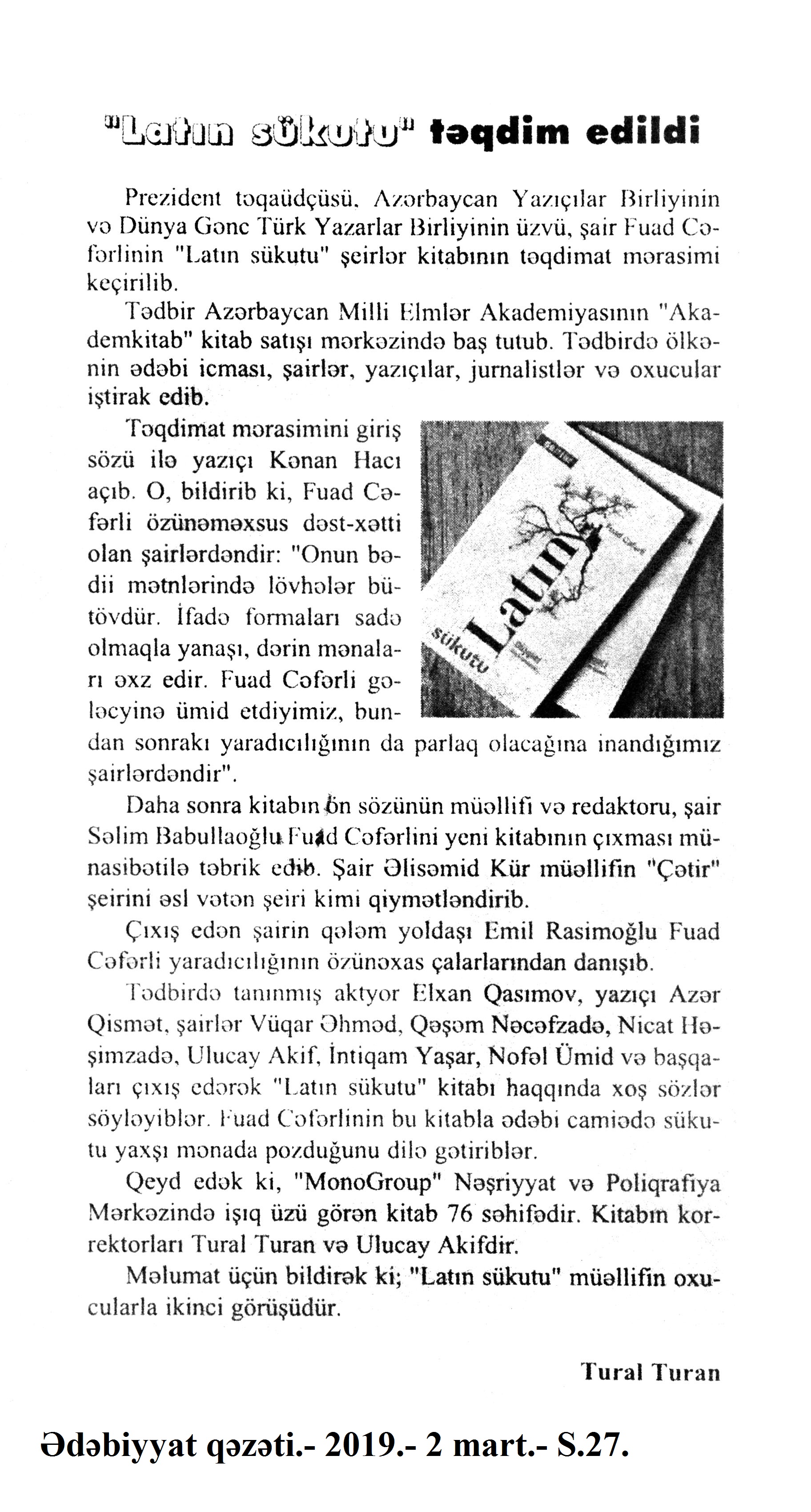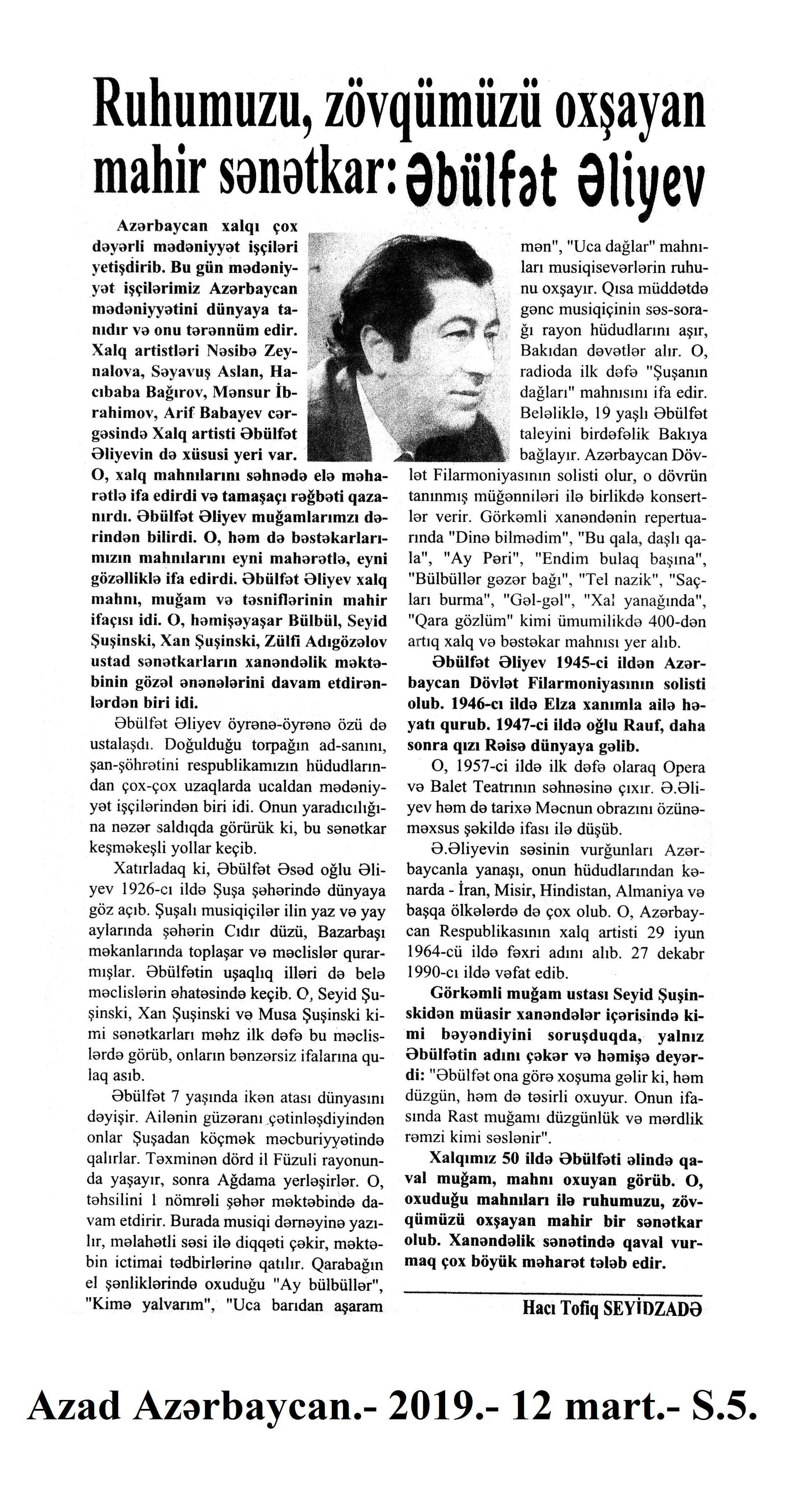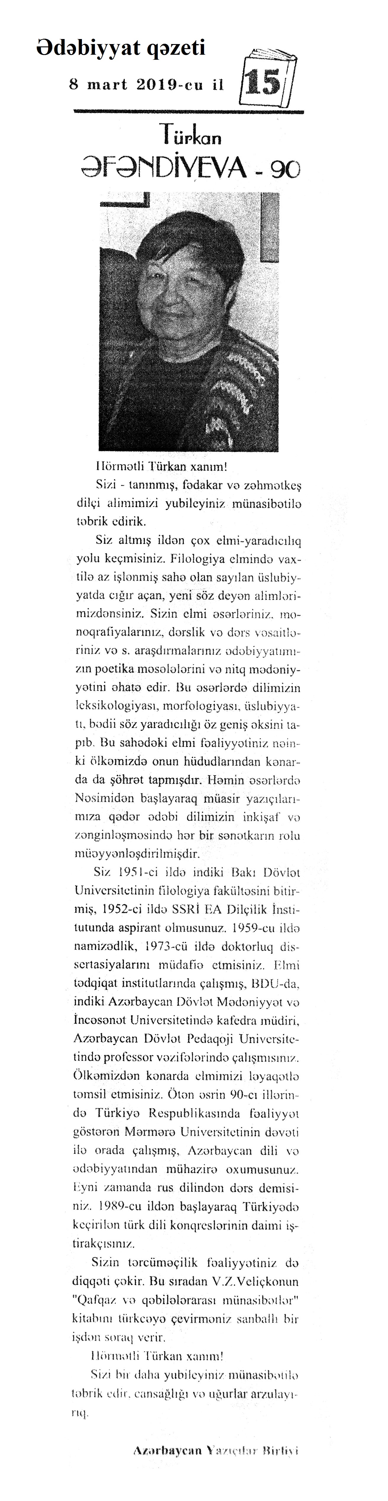 ƏDƏBİYYATŞÜNASLIQ VƏ ƏDƏBİ TƏNQİD 532. Abbas, O. A. A.Həsənlinin özü və sözü haqqında düşünəndə: Şair-publisistin 65 yaşına //Ədalət.- 2019.- 1 mart.- S.6. 533. Abbaslı, T. Fərman Kərimzadə – : Öz istedadı ilə tariximizi nəsrləşdirmiş, kinolaşdırmış, rəsmləşdirmiş, xarakterik keyfiyyətlərilə ədəbi-ictimai mədəniyyətimizə parlaq rənglər qatmış sənətkar //Mədəniyyət.- 2019.- 13 mart.- S. 6. 534. Abbaslı, T. Ulu şair, ulu baba – Vidadi: Bəli, Molla Vəli “ulu babalar” dediyimiz ümumluqda adıbəlli, şan-şöhrətli sələflərdən... //Mədəniyyət.- 2019.- 29 mart.- S.6. 535. Abdullayev, M. Pedaqoqun həyat kredosu: [sənətşünaslıq üzrə fəlsəfə doktoru, professor Minaxanım Əsədli haqqında] //Xalq qəzeti.- 2019.- 8 mart.- S.8. 536. Abid qızı, G. “Şərqin müasir Hafizi”: (Mirzə Şəfi-225): [şair haqqında] //Ədalət.-2019.- 29 mart.- S.6. 537. Adışirin, T. Mirzə Fətəli Axundzadə maarifçi-realizmin banisi kimi //Kaspi.- 2019.- 16-18 mart.- S.22. 538. Ağdaşda Əjdər Olun yaradıcılığına həsr olunmuş tədbir keçirildi: [Rayon Mərkəzi Kitabxanasında] //Ədəbiyyat qəzeti.- 2019.- 8 mart.- S.32. 539. Ağsəs, Q. Ətəyində namaz qılınan Savalan...: Zahir Məliklinin “O və yerdə qalanlar” kitabı haqqında //Ədəbiyyat qəzeti.- 2019.- 2 mart.- S.17.