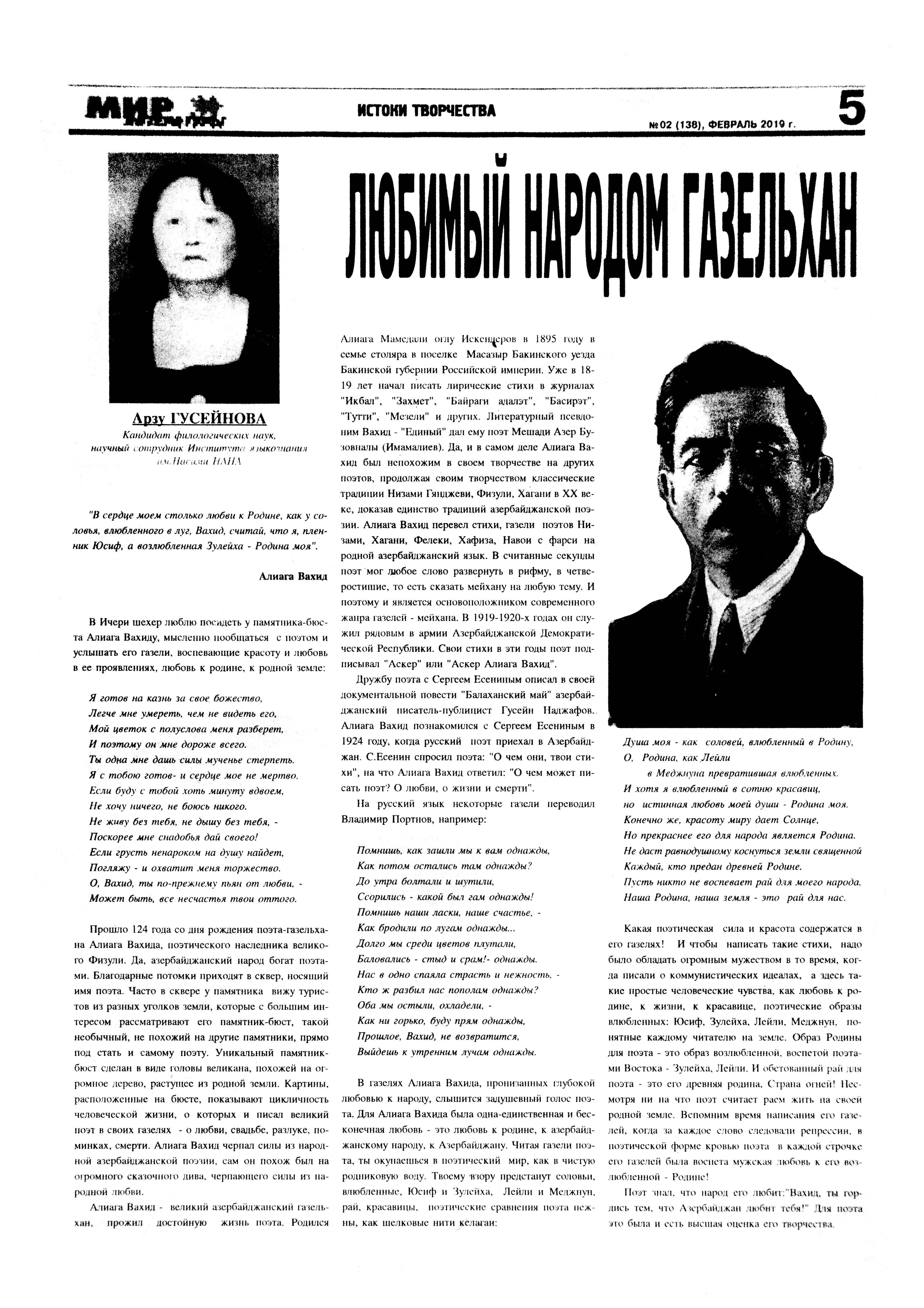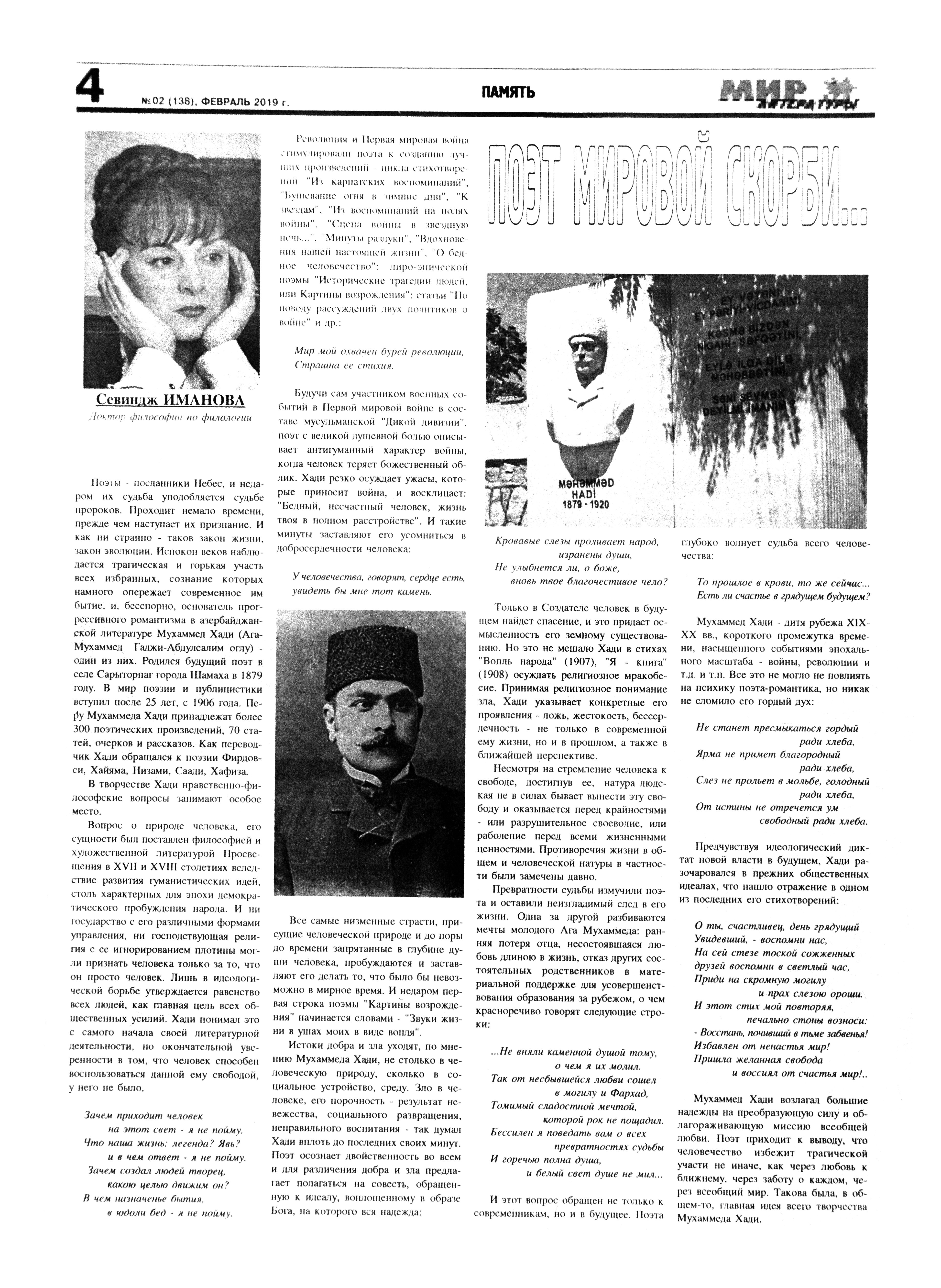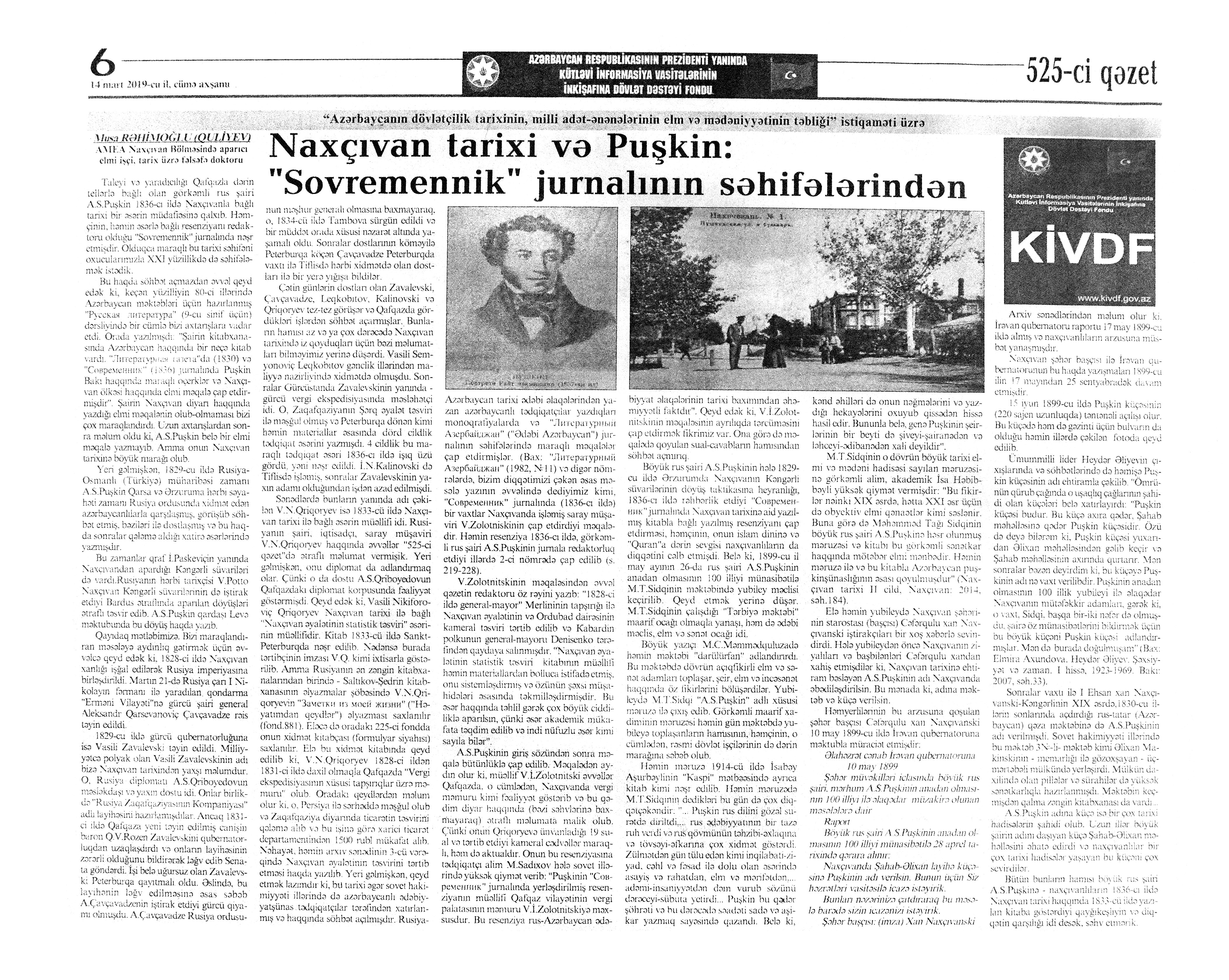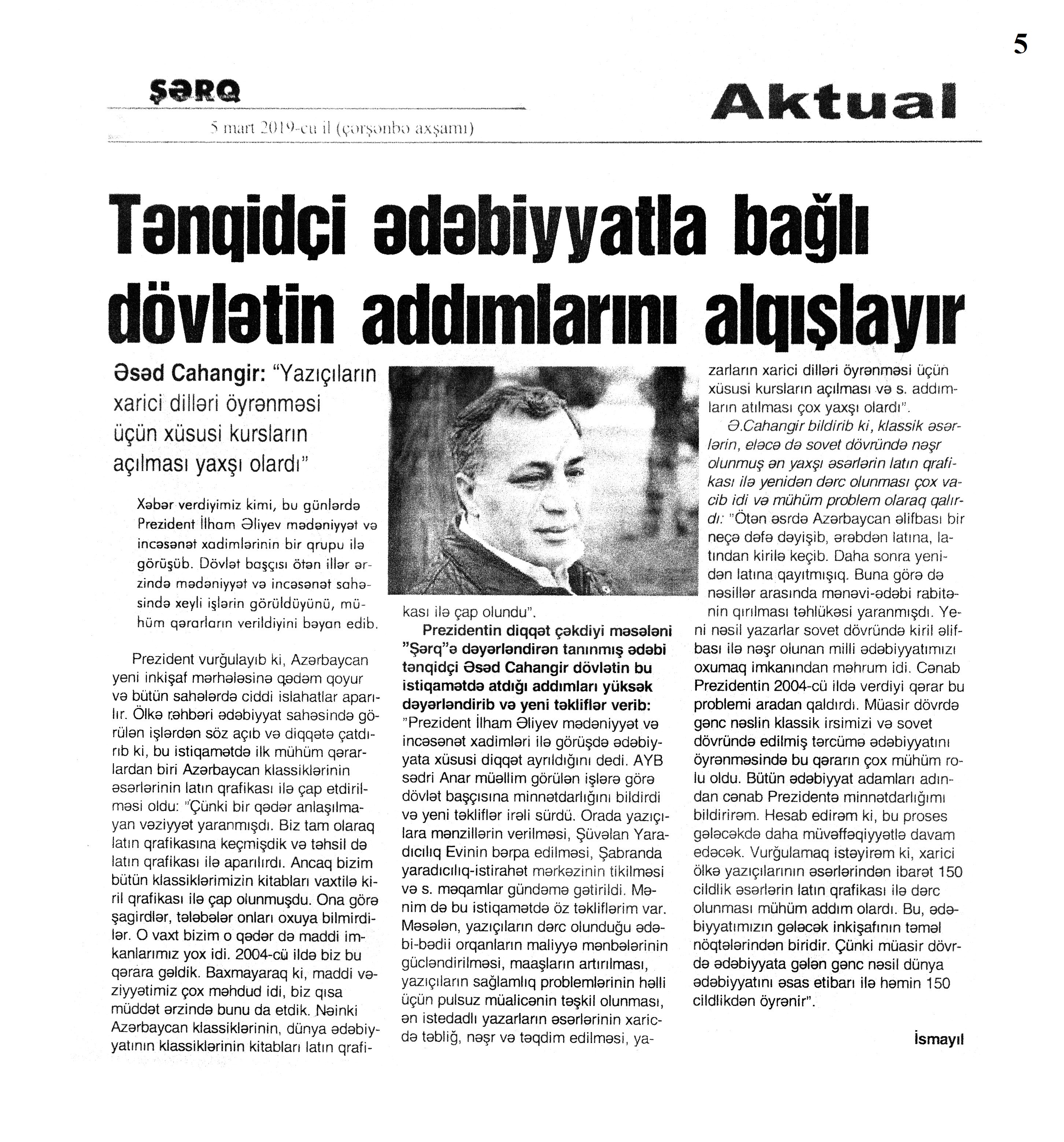 ƏDƏBİYYATŞÜNASLIQ VƏ ƏDƏBİ TƏNQİD 532. Abbas, O. A. A.Həsənlinin özü və sözü haqqında düşünəndə: Şair-publisistin 65 yaşına //Ədalət.- 2019.- 1 mart.- S.6. 533. Abbaslı, T. Fərman Kərimzadə – : Öz istedadı ilə tariximizi nəsrləşdirmiş, kinolaşdırmış, rəsmləşdirmiş, xarakterik keyfiyyətlərilə ədəbi-ictimai mədəniyyətimizə parlaq rənglər qatmış sənətkar //Mədəniyyət.- 2019.- 13 mart.- S. 6. 534. Abbaslı, T. Ulu şair, ulu baba – Vidadi: Bəli, Molla Vəli “ulu babalar” dediyimiz ümumluqda adıbəlli, şan-şöhrətli sələflərdən... //Mədəniyyət.- 2019.- 29 mart.- S.6. 535. Abdullayev, M. Pedaqoqun həyat kredosu: [sənətşünaslıq üzrə fəlsəfə doktoru, professor Minaxanım Əsədli haqqında] //Xalq qəzeti.- 2019.- 8 mart.- S.8. 536. Abid qızı, G. “Şərqin müasir Hafizi”: (Mirzə Şəfi-225): [şair haqqında] //Ədalət.-2019.- 29 mart.- S.6. 537. Adışirin, T. Mirzə Fətəli Axundzadə maarifçi-realizmin banisi kimi //Kaspi.- 2019.- 16-18 mart.- S.22. 538. Ağdaşda Əjdər Olun yaradıcılığına həsr olunmuş tədbir keçirildi: [Rayon Mərkəzi Kitabxanasında] //Ədəbiyyat qəzeti.- 2019.- 8 mart.- S.32. 539. Ağsəs, Q. Ətəyində namaz qılınan Savalan...: Zahir Məliklinin “O və yerdə qalanlar” kitabı haqqında //Ədəbiyyat qəzeti.- 2019.- 2 mart.- S.17.